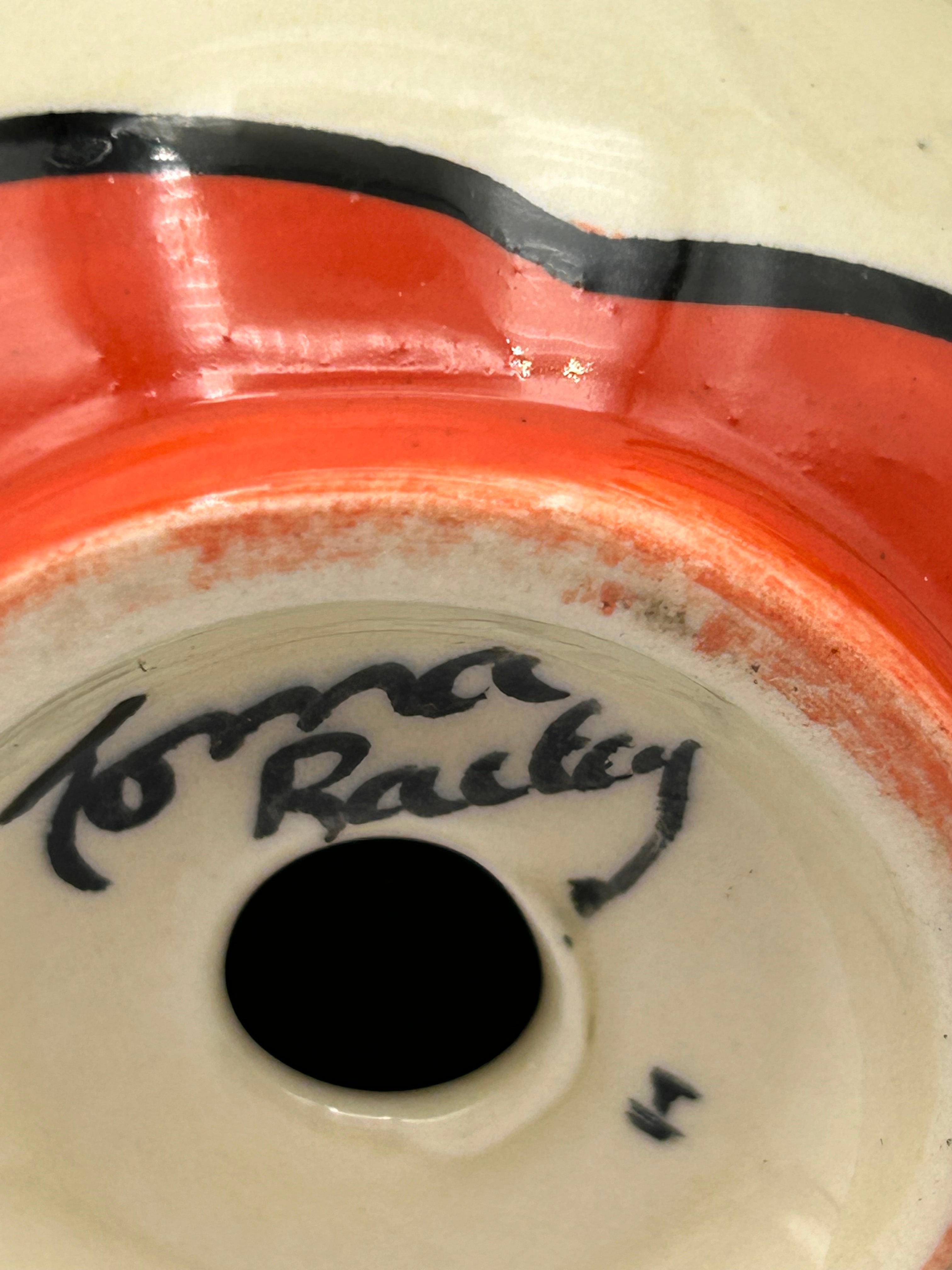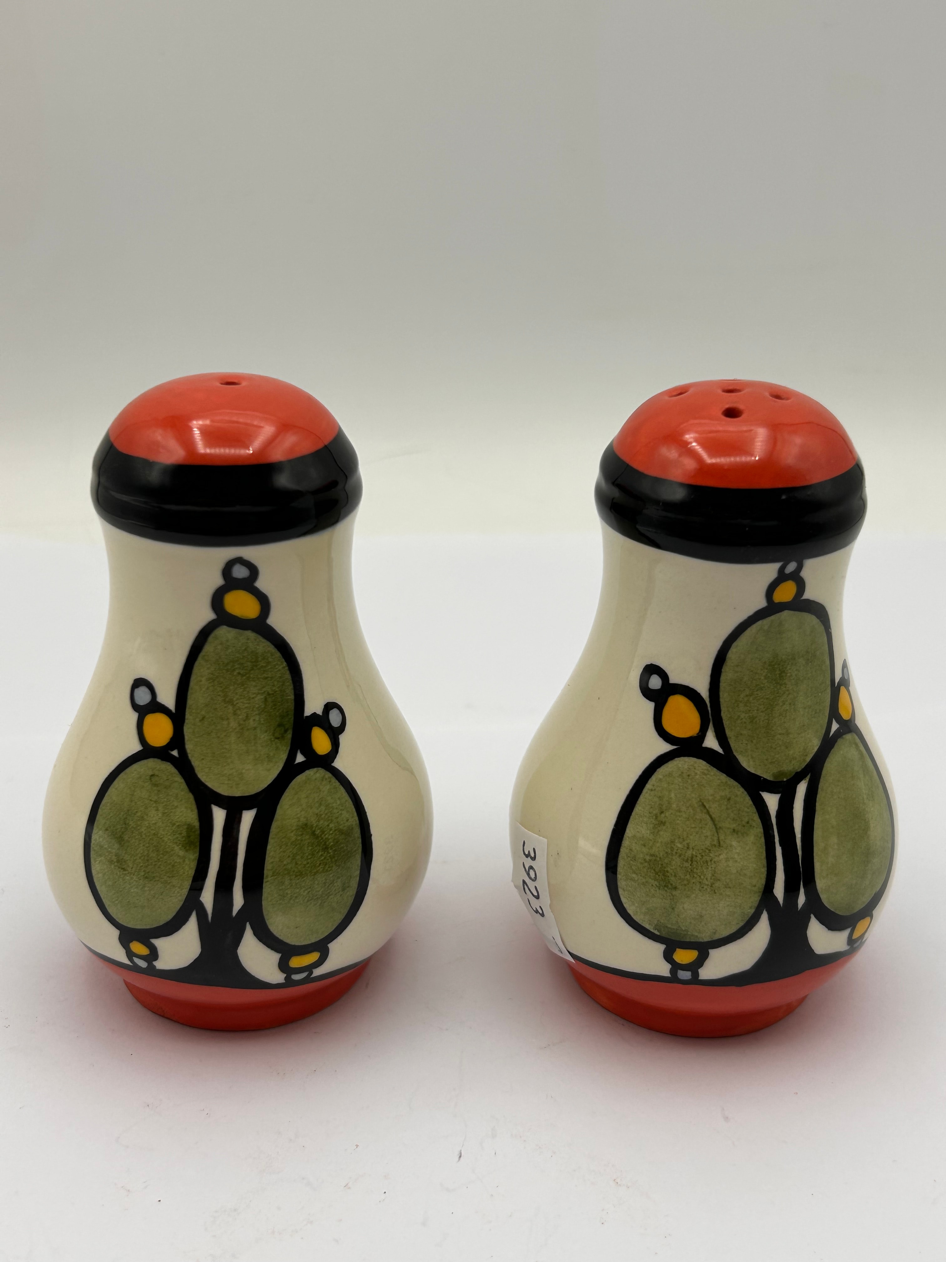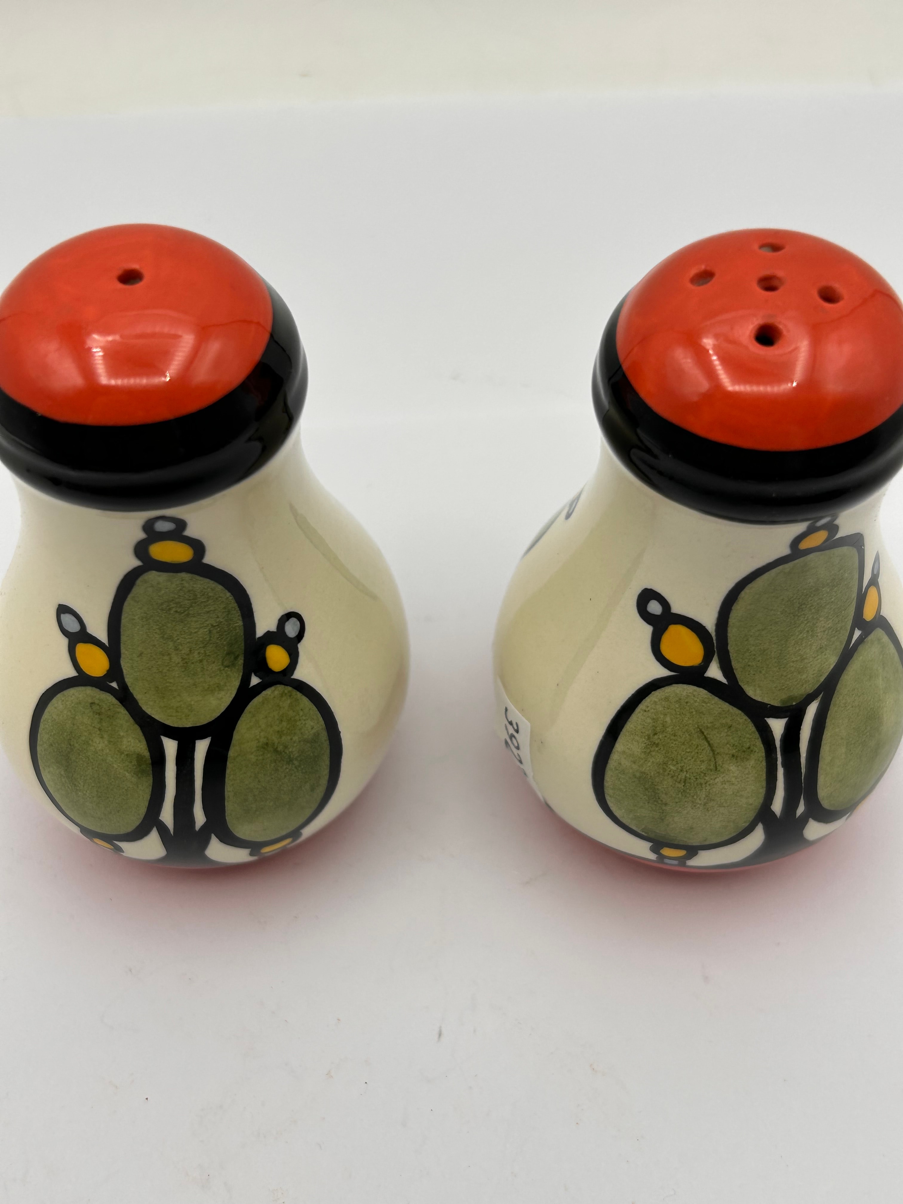 A pair of bell-shaped, hand-painted ceramic salt and pepper shakers, signed ‘Lorna Bailey’. Each shaker features an orange-red domed top with three pour holes and a matching orange-red base, connected by a black band to a cream-colored body. The body is decorated with a stylized motif of interconnected green ovals with small yellow accents, outlined in black, reminiscent of cacti or succulent plants. The underside of one shaker is signed in black script, accompanied by a small ‘I’ mark.
