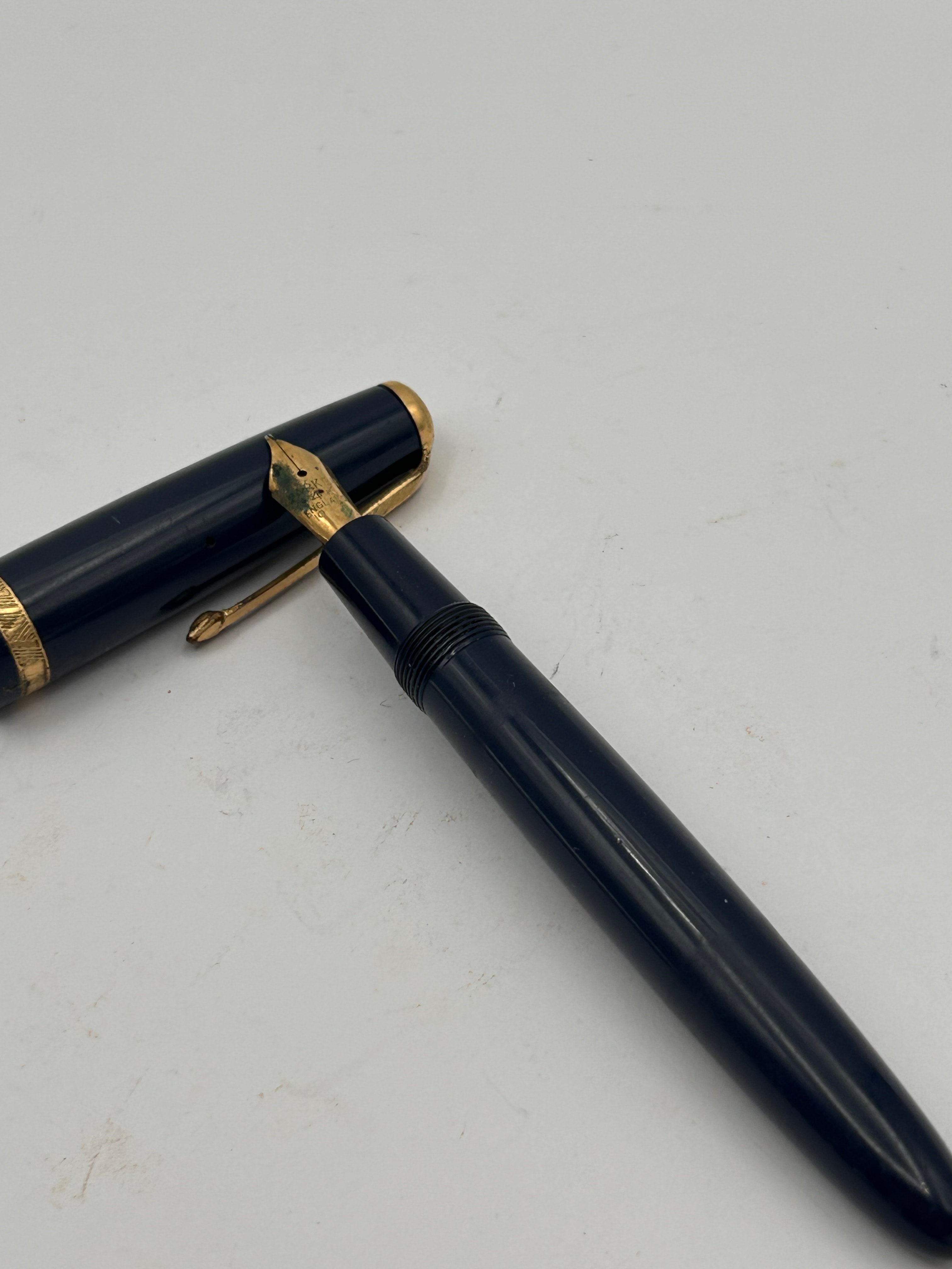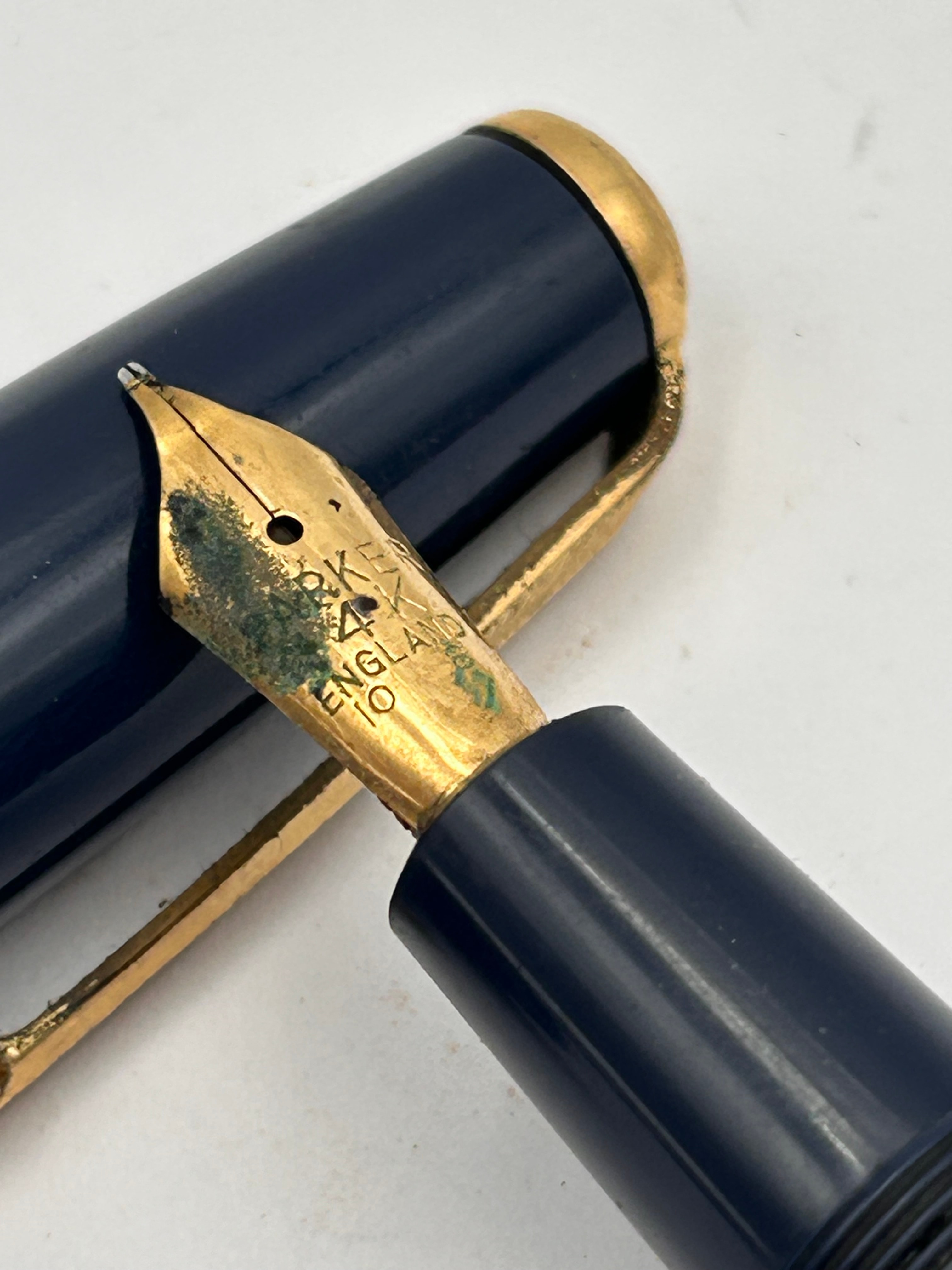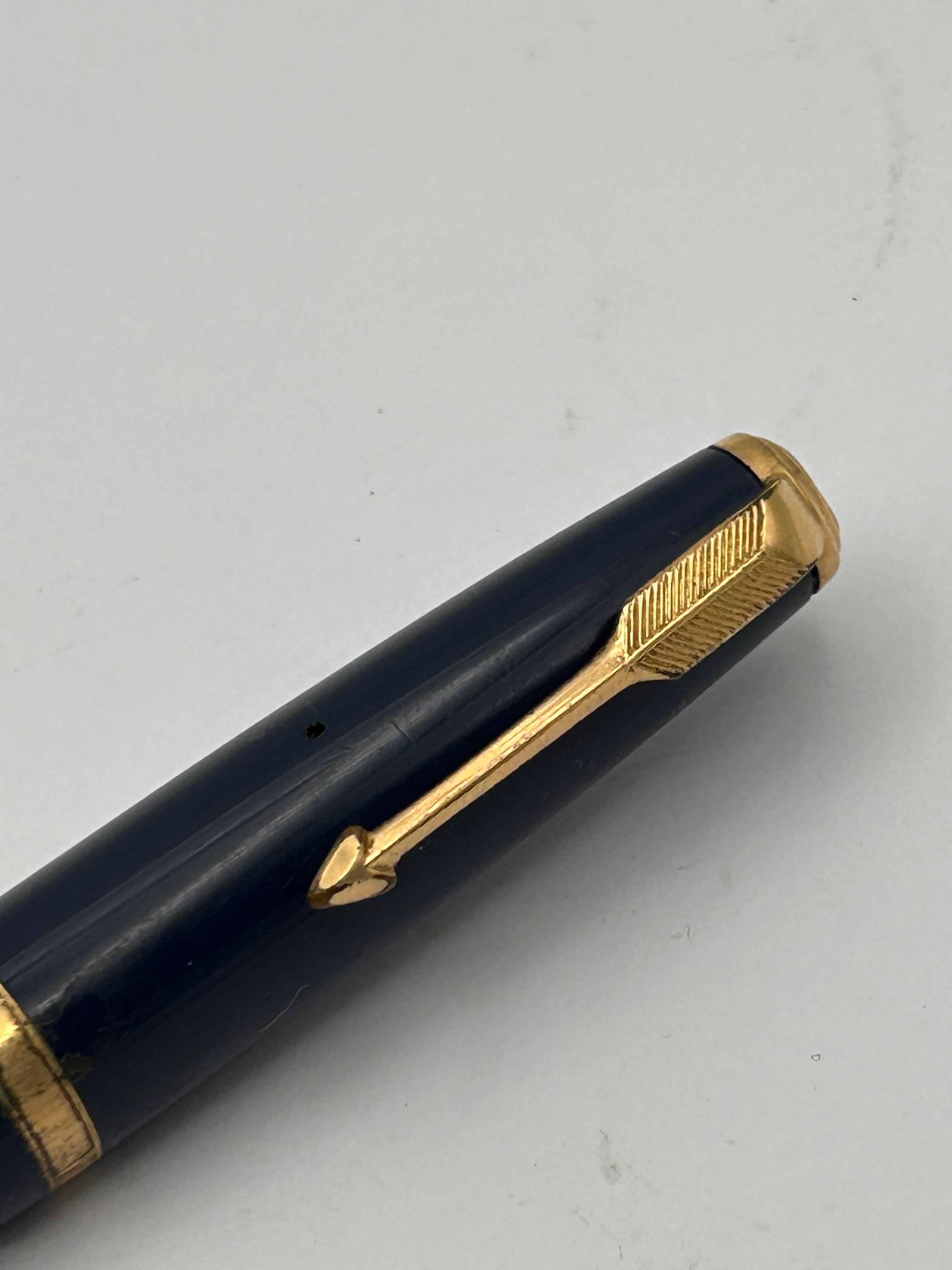 A vintage Parker Duofold Maxima fountain pen, featuring a dark blue plastic or resin barrel and cap, accented with gold-toned metal components. The cap is distinguished by an arrow-shaped clip and a gold-toned band. The exposed nib is a two-tone gold and silver color, marked with the text ‘PARKER,’ ’14K,’ ‘ENGLAND,’ and ’10.’