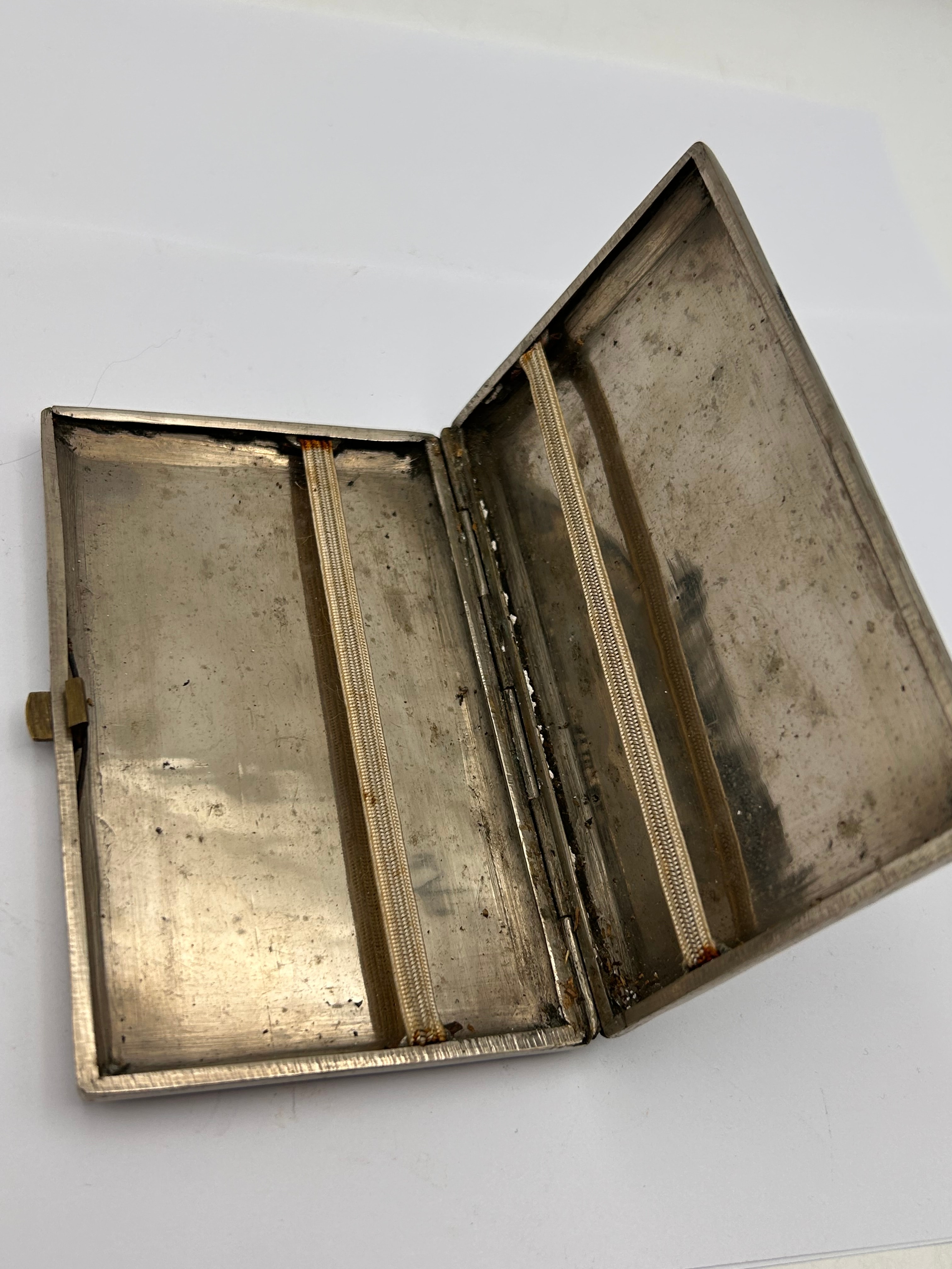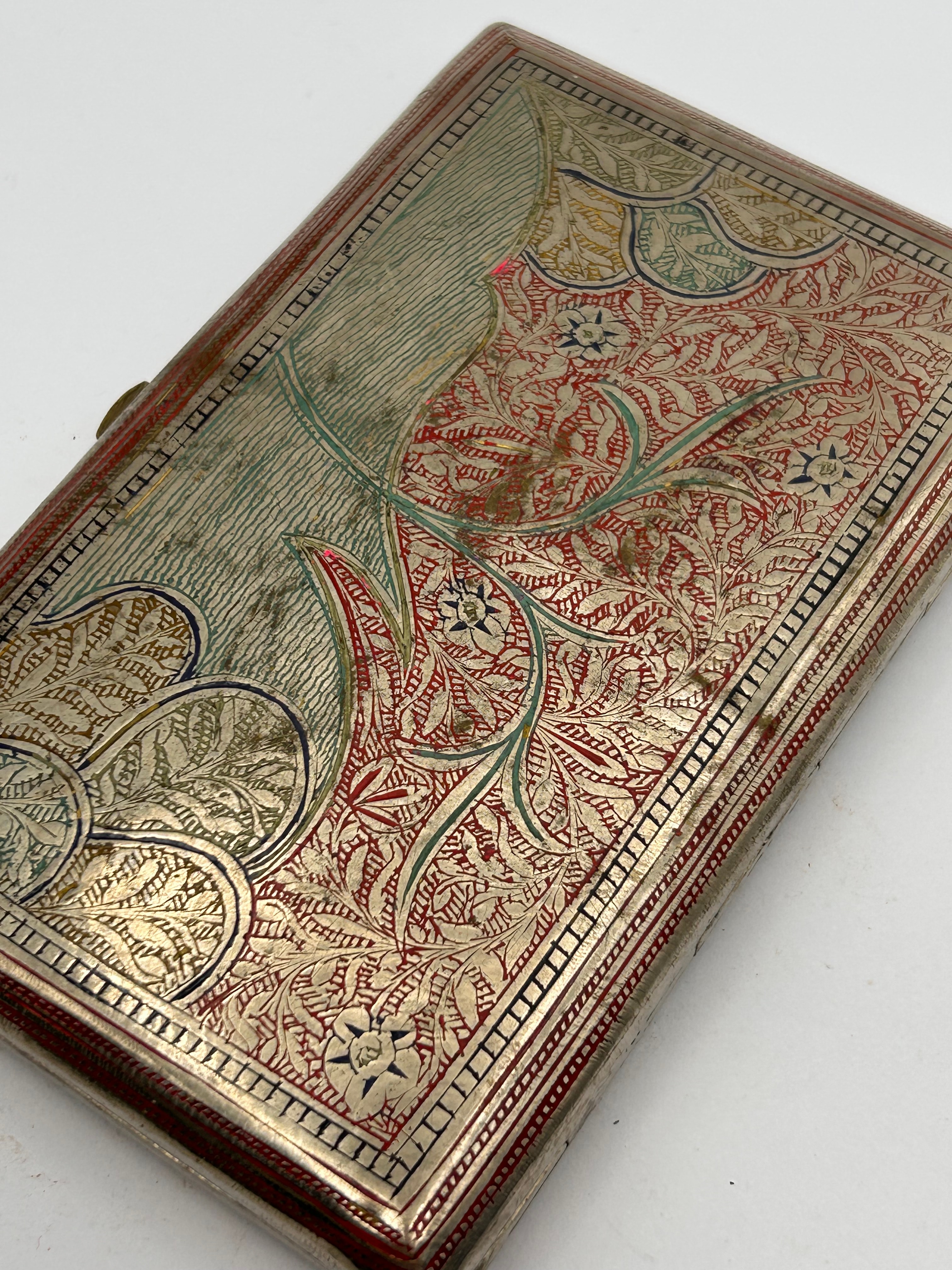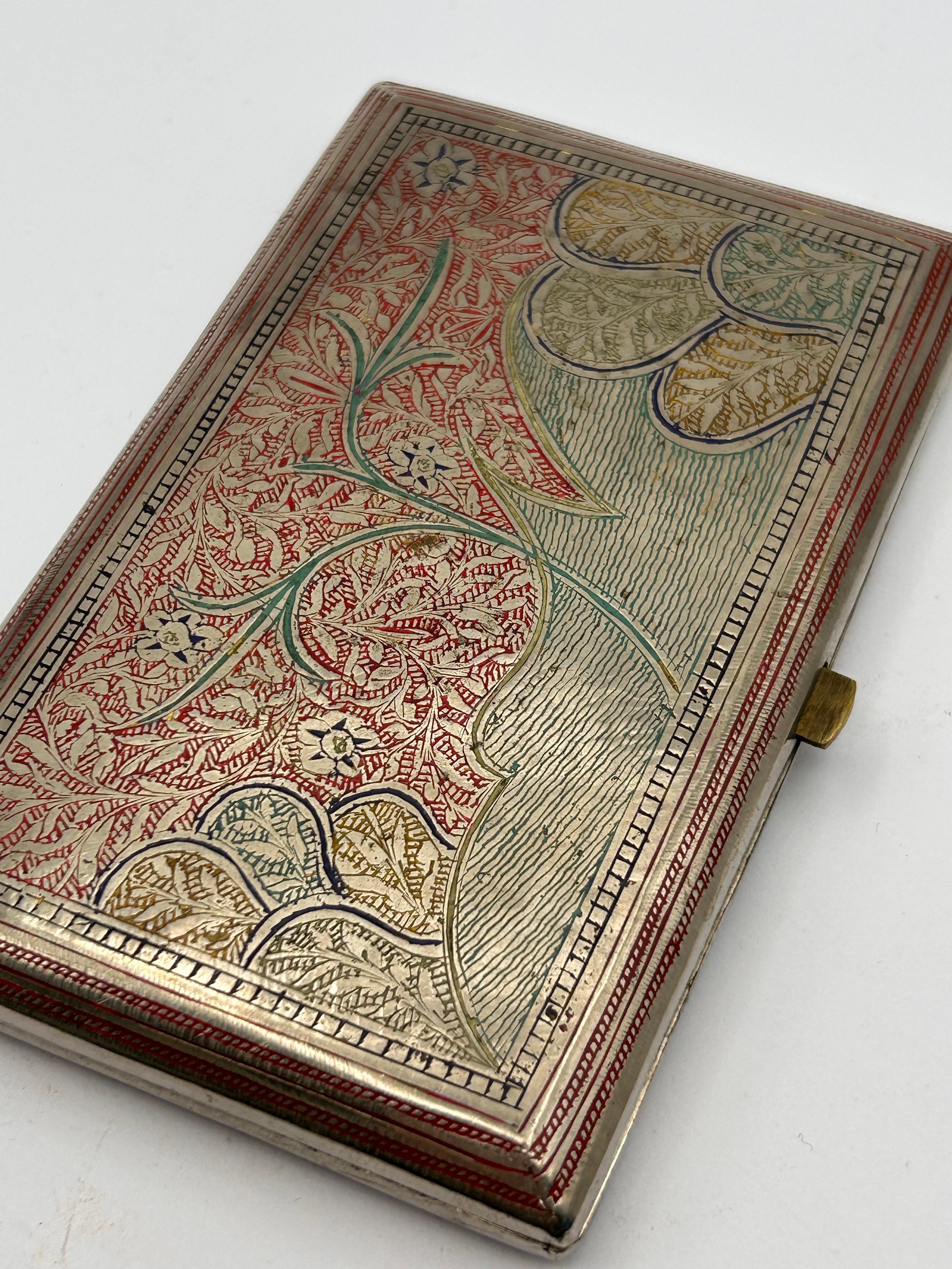 A vintage Indian silver-washed brass cigarette case, circa 1920s, featuring elaborate enameling and engraving. This rectangular, hinged metal case is crafted from a silver-toned metal, likely silver-washed brass, and is extensively decorated with intricate floral and foliate scrollwork. The design incorporates red, green, blue, and gold-tone enameling or inlay, set against a textured, possibly engraved background, and framed by geometric borders. The interior is fitted with two woven retention bands. The decorative style is consistent with Middle Eastern or Indian artistic traditions.
