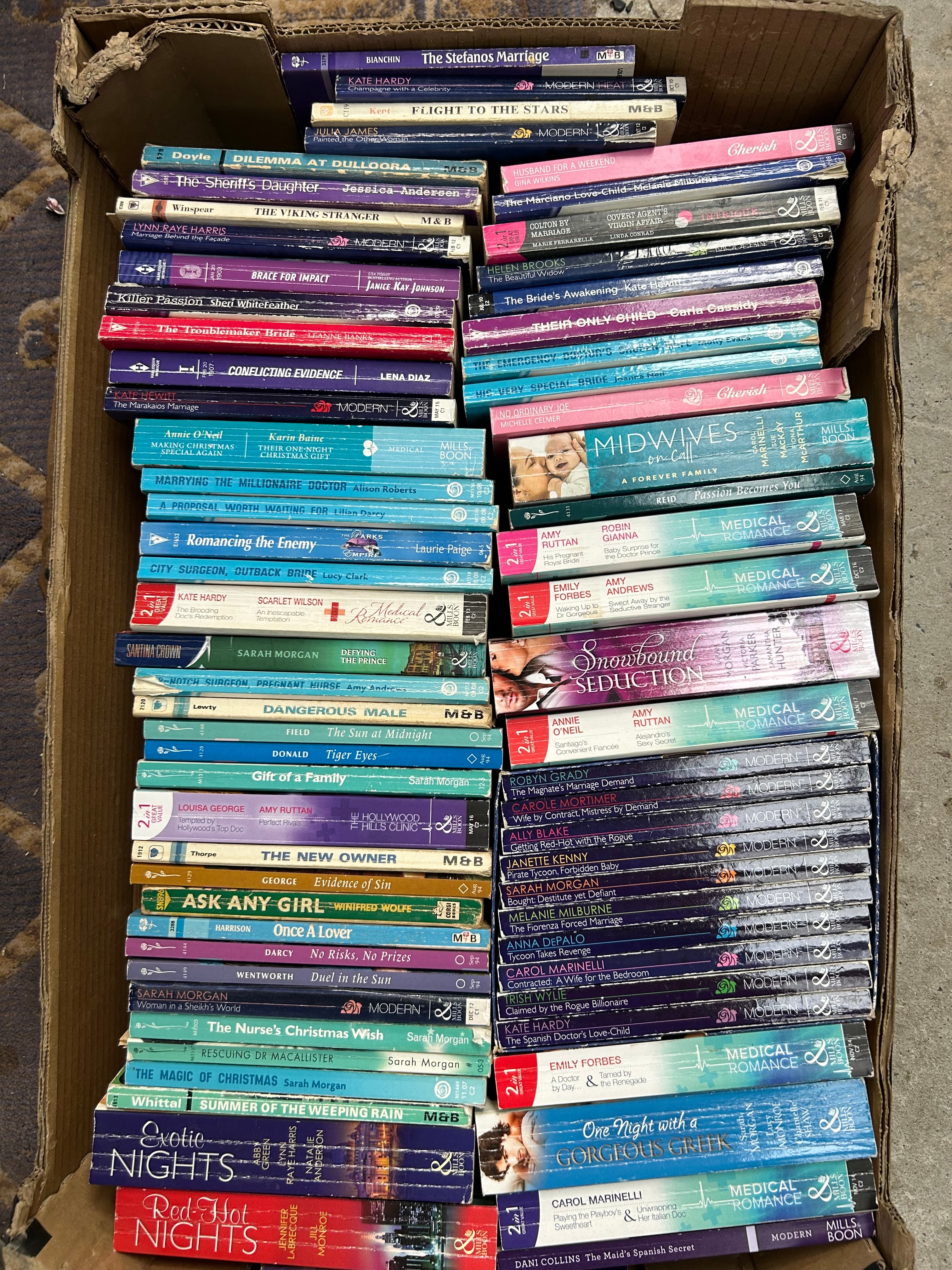 A large collection of mass-market paperback romance novels, primarily published by Mills & Boon and Harlequin, along with imprints such as Modern, Medical Romance, Cherish, and Intrigue, and a few by Corgi Books. Visible publication dates on the spines indicate a period ranging from the early 1990s through the late 2010s. Many books are presented as “2 in 1 Great Value” editions. The spines display a variety of titles, including “The Stefanos Marriage,” “Dilemma A,” “Snowbound Seduction,” and “Midwives on Call,” with authors like Sarah Morgan, Kate Hardy, and Jessica Andersen prominently featured. The books are housed in a worn and somewhat torn corrugated cardboard box.