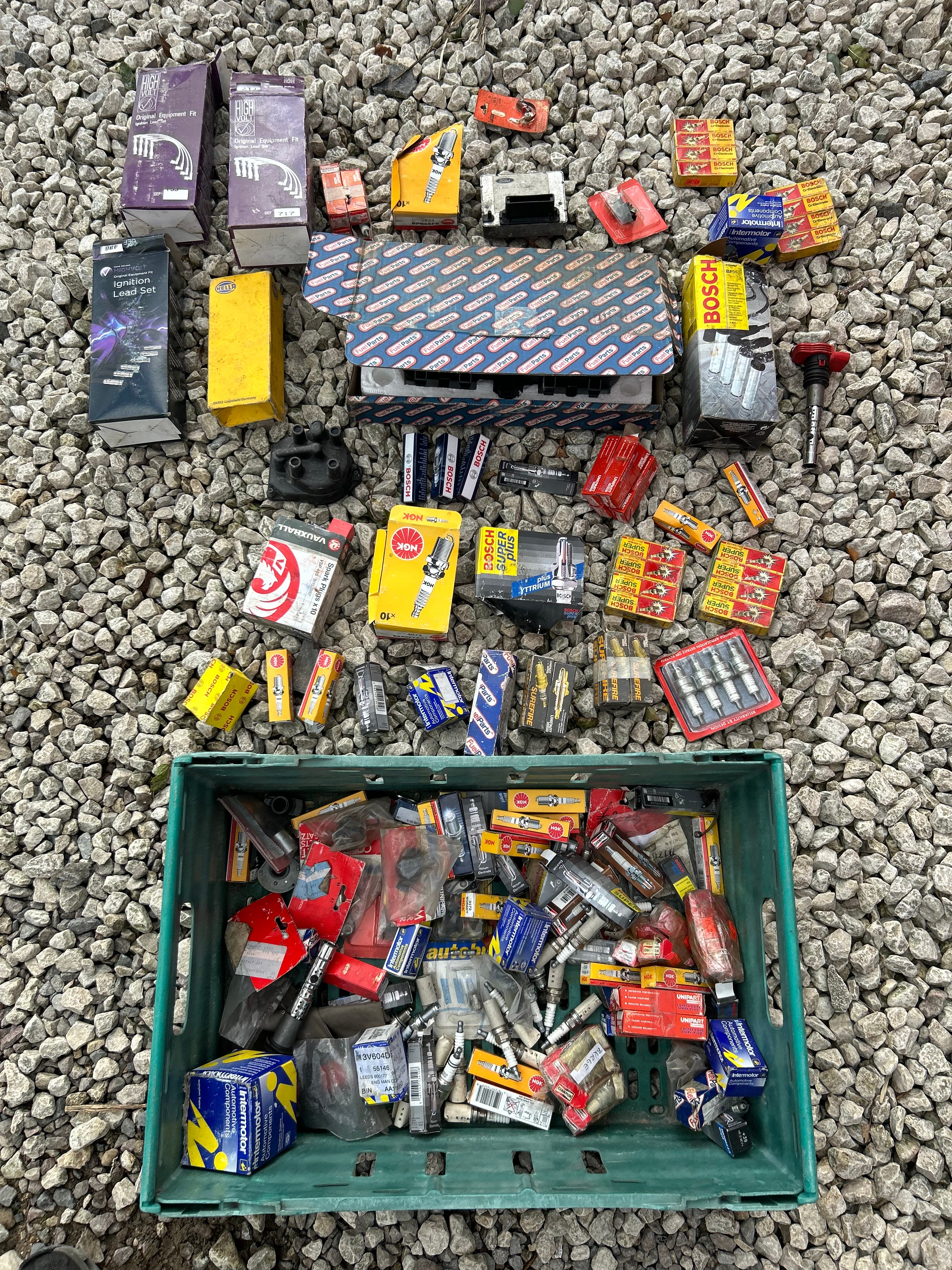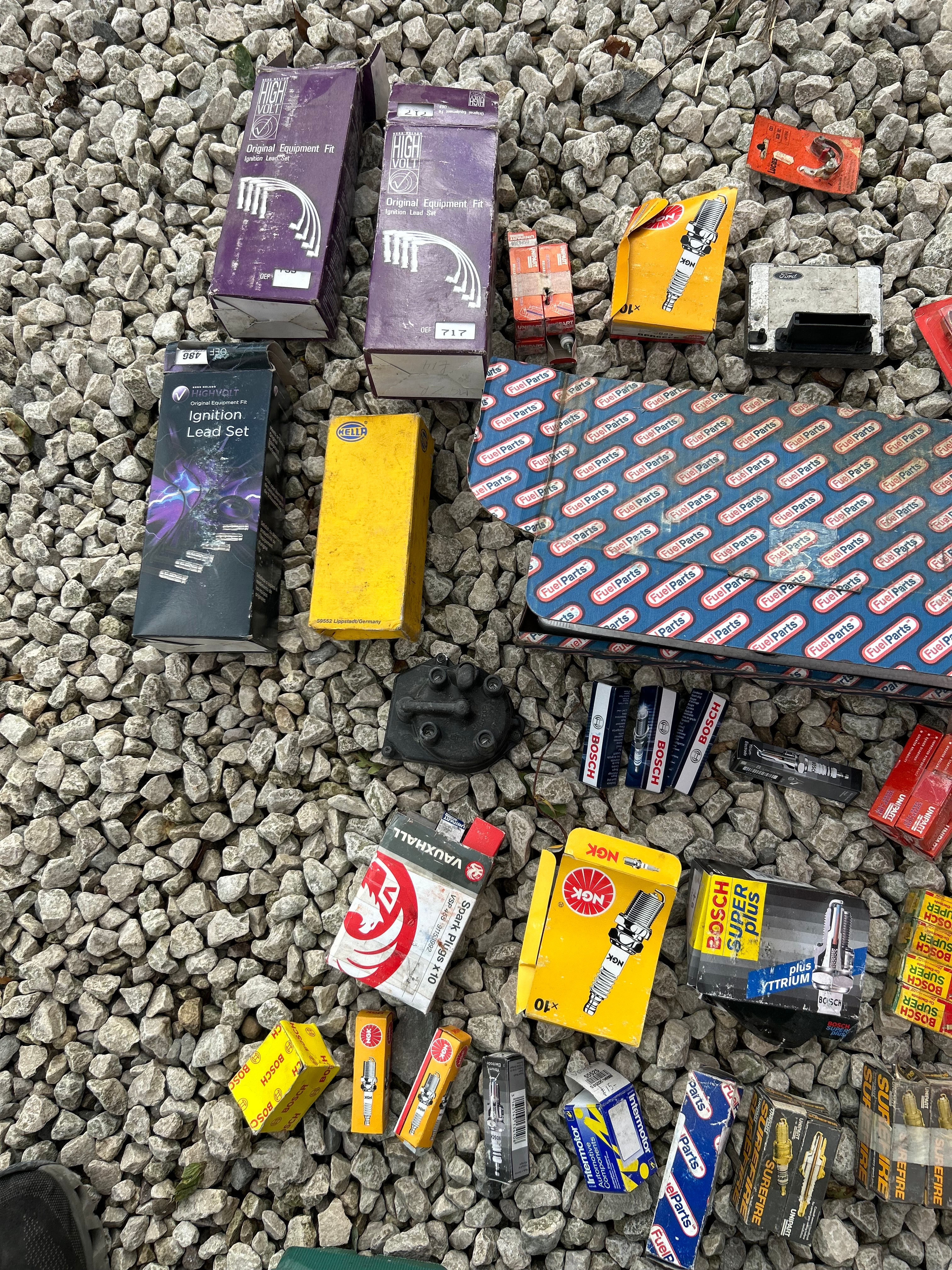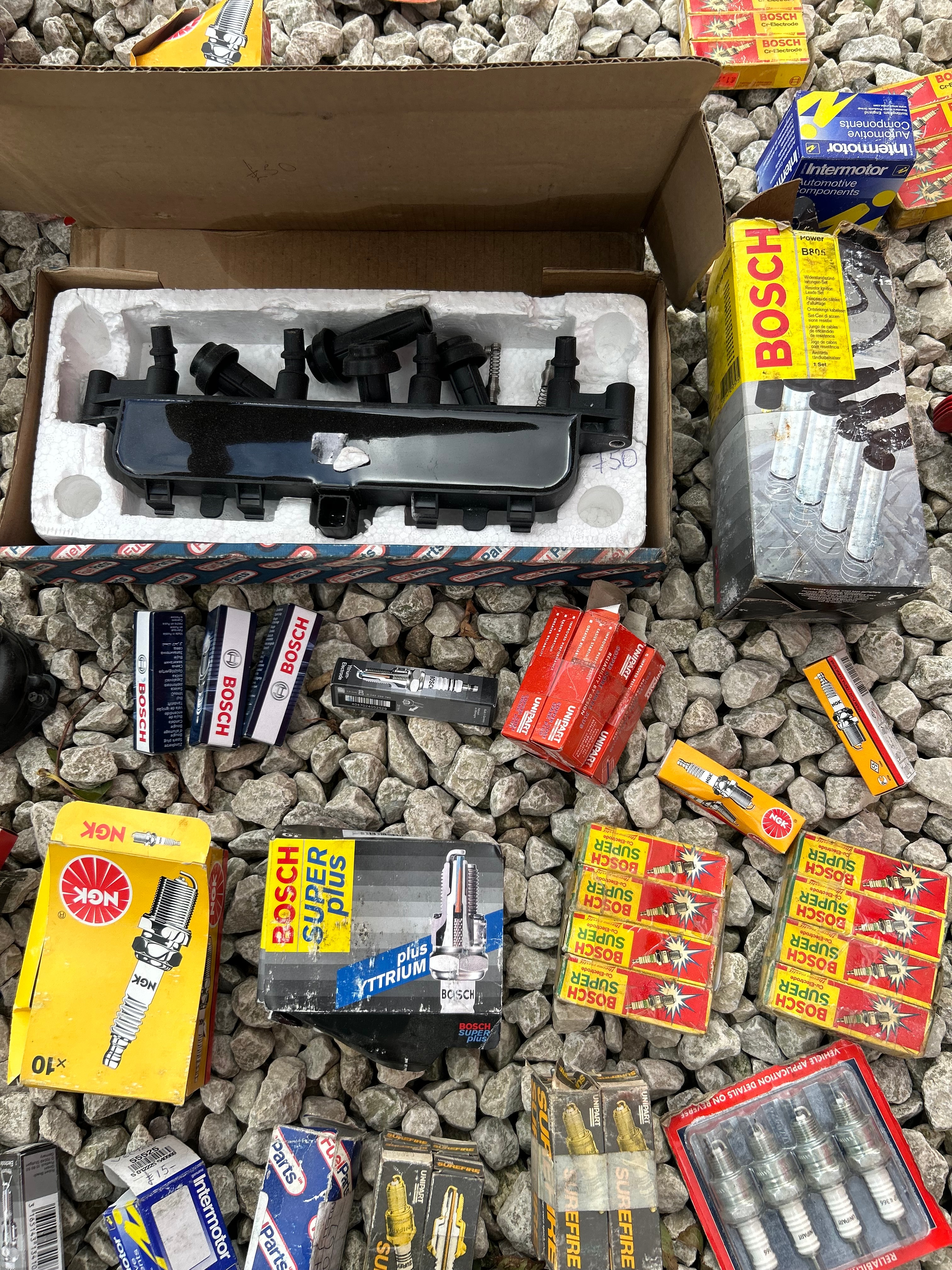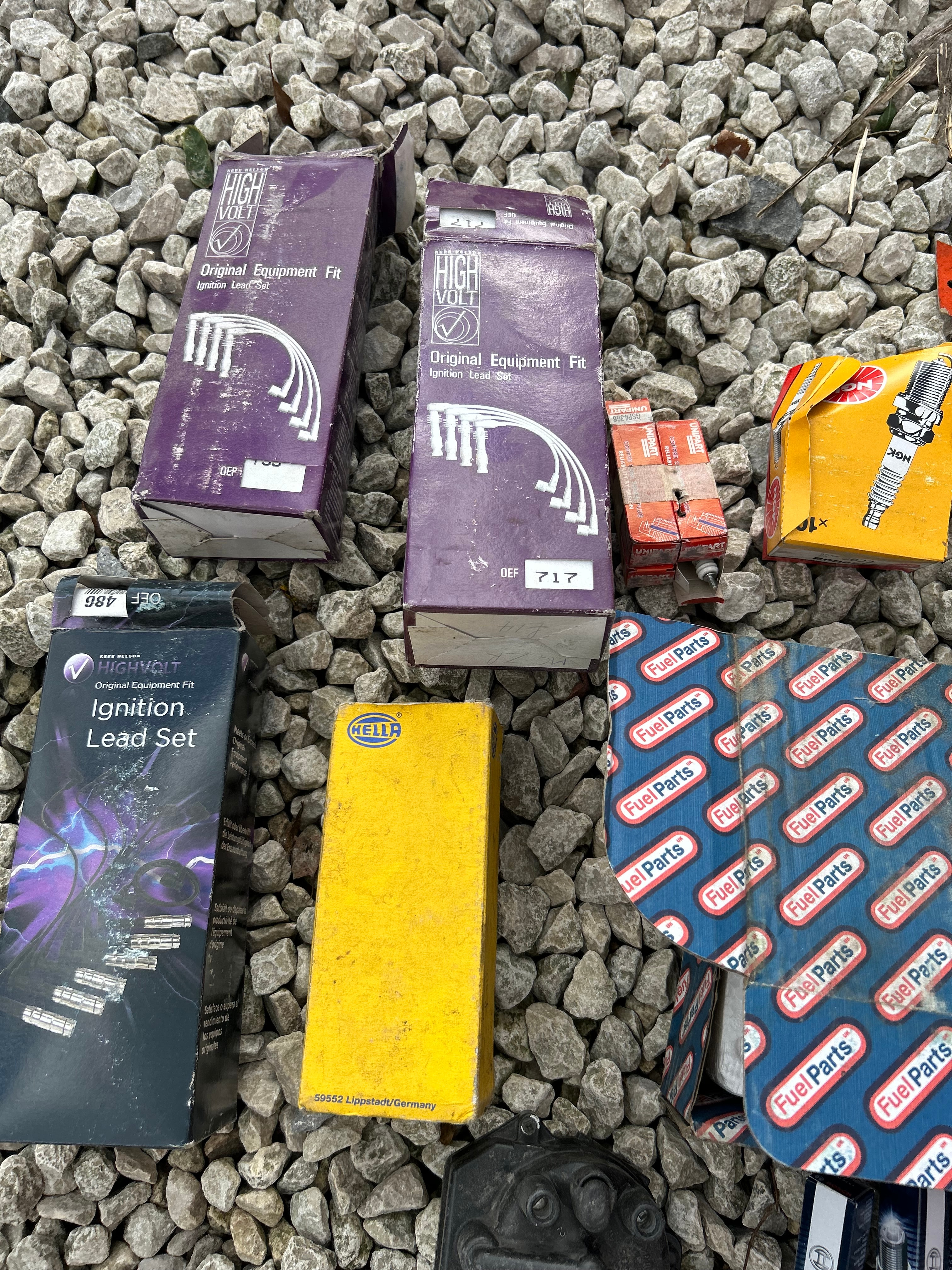 This lot comprises a diverse collection of new old stock or unused automotive spare parts, dating from the late 20th to early 21st century. The collection includes numerous spark plugs from prominent manufacturers such as Bosch (including “Super Plus YTTRIUM” examples), NGK, Champion, and VAUXHALL. Also present are multiple “HIGH VOLT” ignition lead sets and various “Fuel Parts” supplied in branded blue and white boxes. Further components include a Hella-branded item in a yellow box (marked “09562 Lippstadt/Germany”), a black distributor cap or similar electrical component, and various smaller “Intermotor Automotive components” and Unipart items. Many items remain in their original packaging or blister packs, while some are loose.