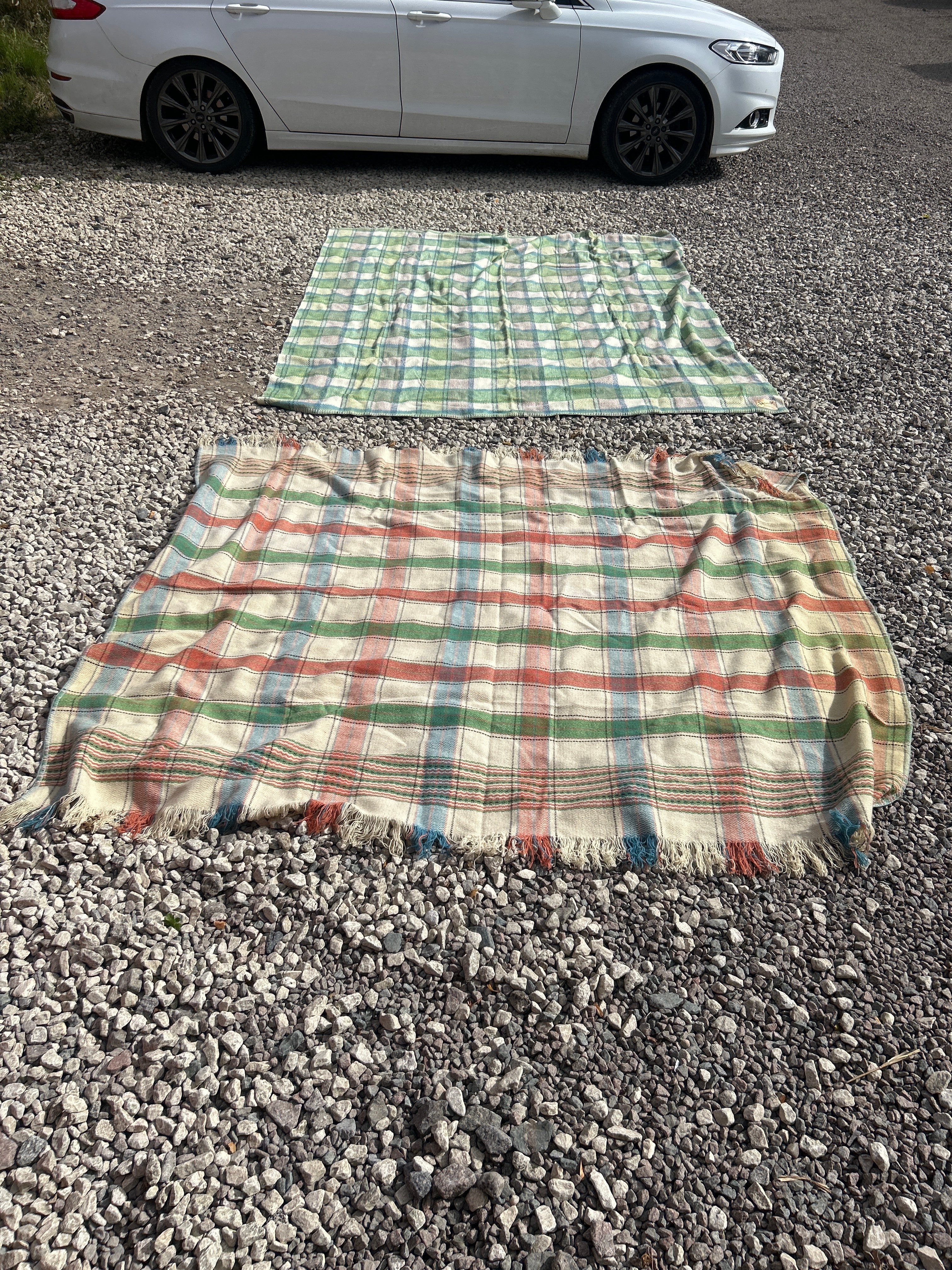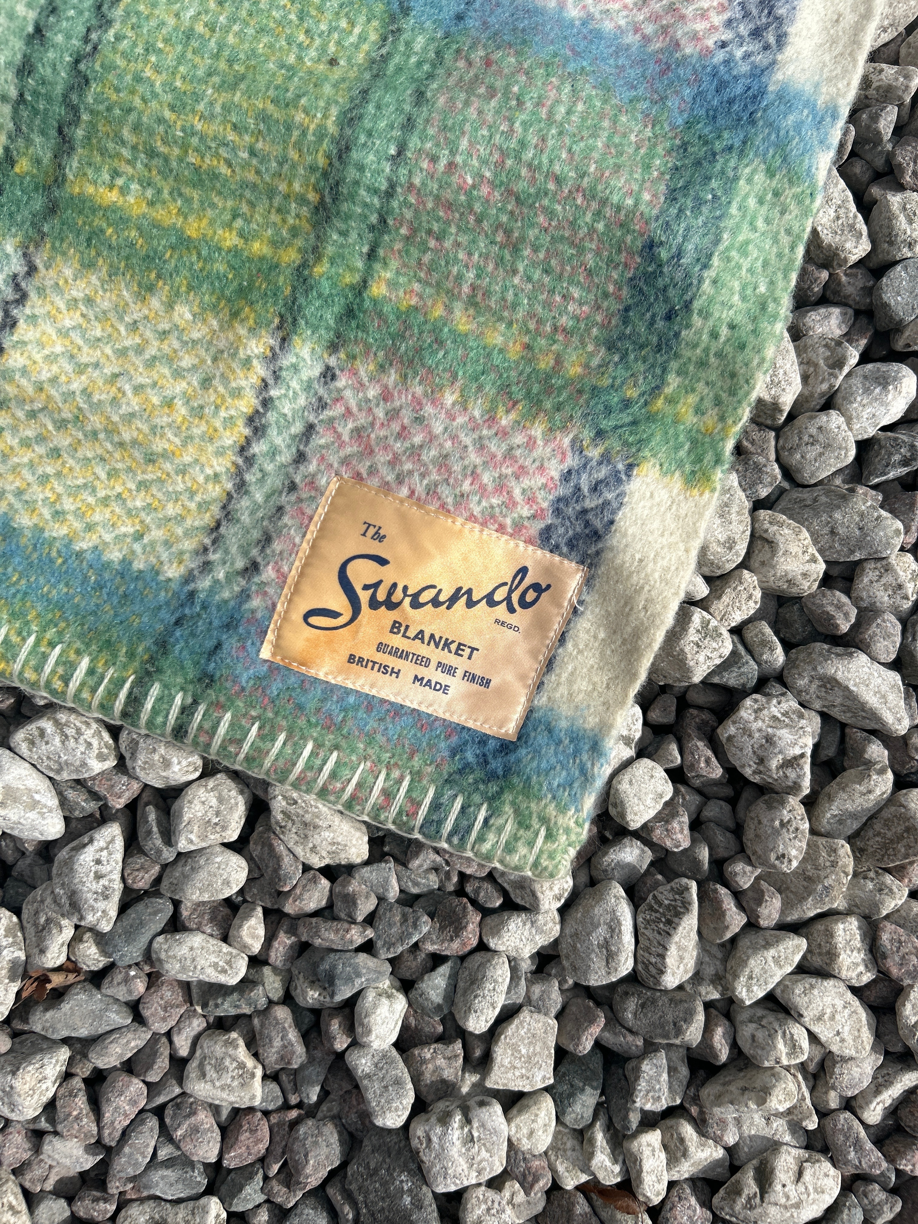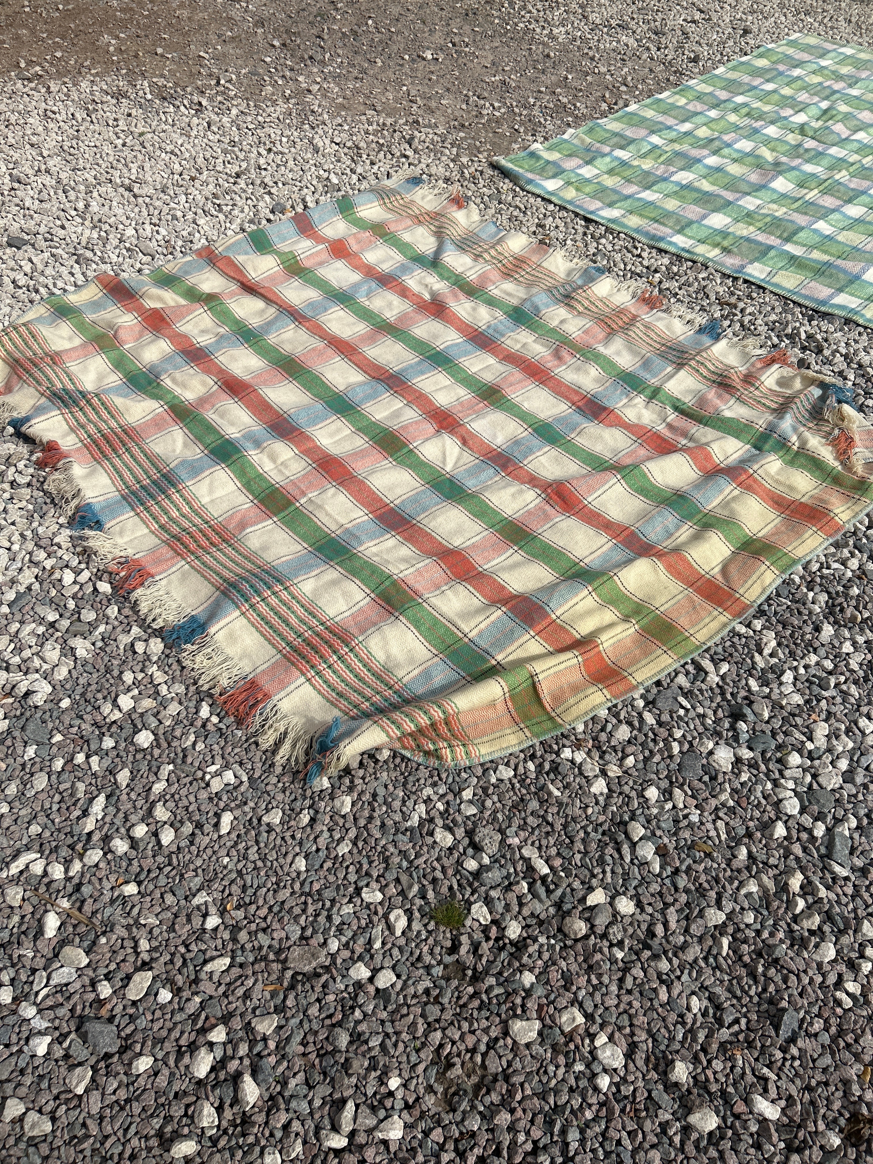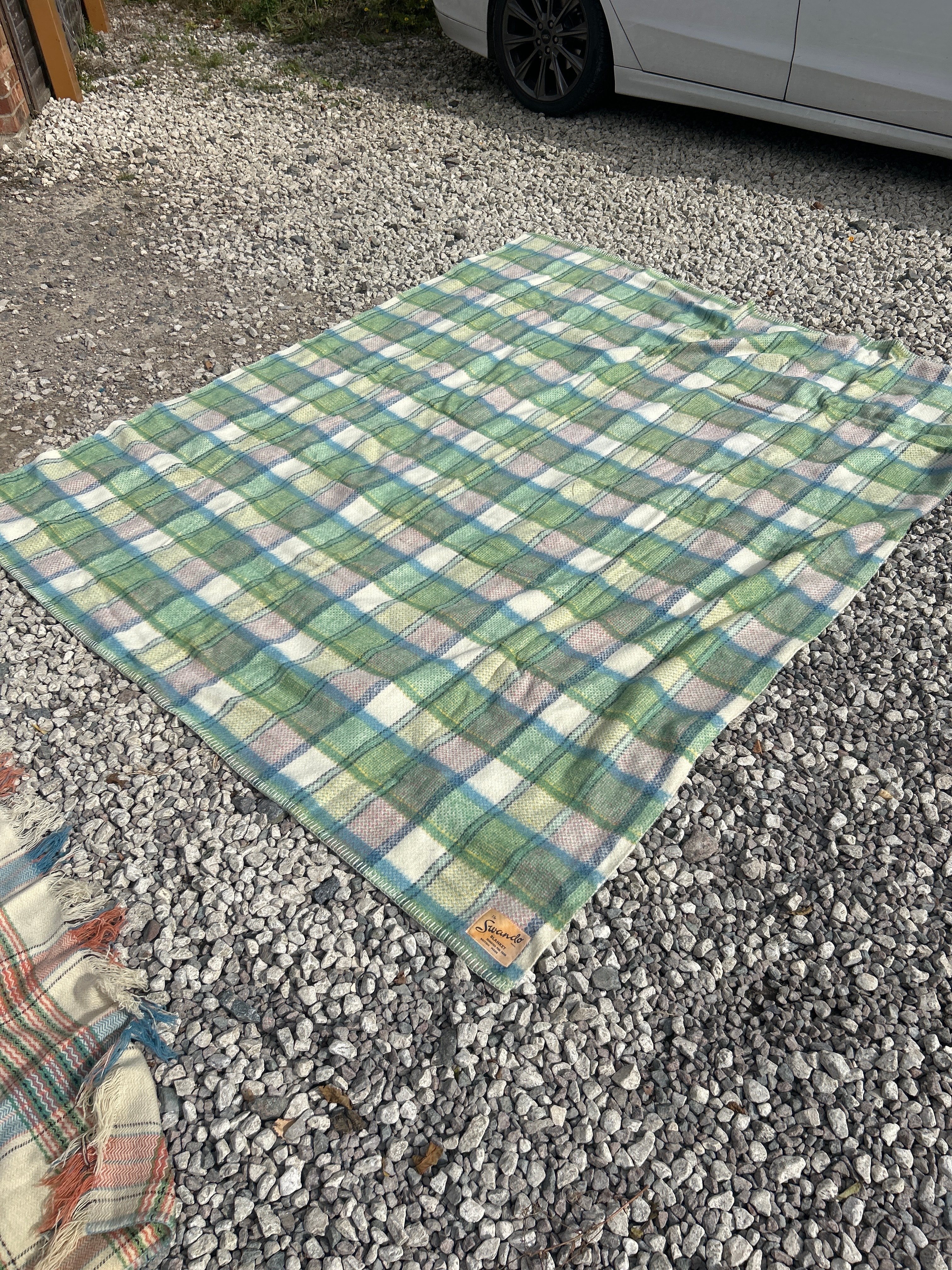 A pair of blankets, comprising a multi-colored plaid blanket and a ‘The Swando’ blanket. The first blanket features a multi-colored check pattern in cream, red, green, and blue hues, with visible fringed edges. The second blanket, identified by its woven label as ‘The Swando BLANKET REGD. GUARANTEED PURE FINISH BRITISH MADE’, displays a tighter plaid pattern in varying shades of green, blue, and muted purple. Both are likely wool or a wool blend.