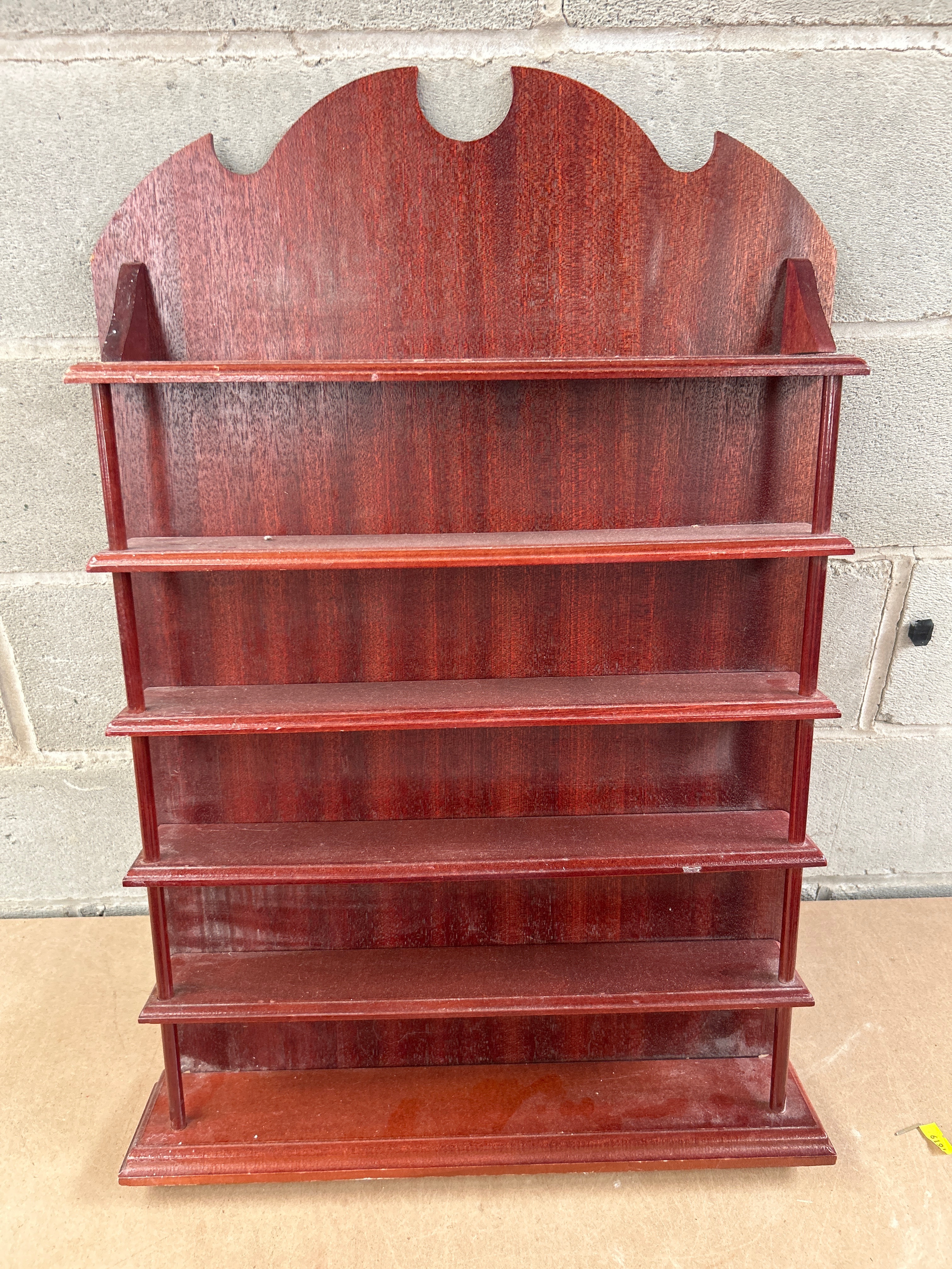 A decorative wall-mounted display shelf unit, constructed from wood with a reddish-brown stain or finish. It features a shaped, scalloped top crest and five narrow, tiered shelves, each with a front retaining rail. The design suggests a traditional or country-style aesthetic, without definitive period-specific characteristics, appearing to be of modern or contemporary manufacture. The material displays a visible wood grain, indicating solid wood or veneer construction. A yellow tag bearing the number “6191” is visible in the foreground. No other discernible text or manufacturer’s markings are present on the unit itself.