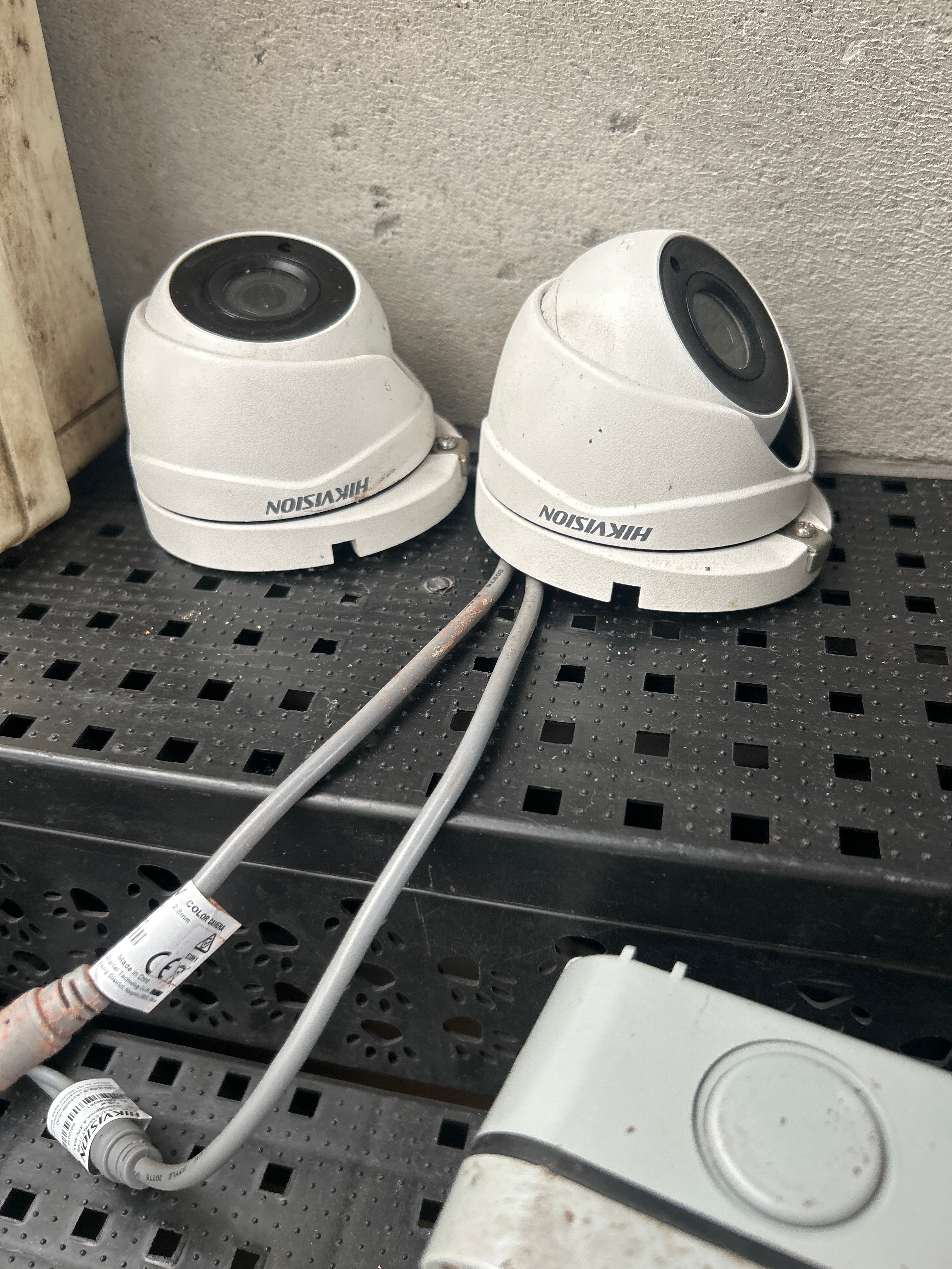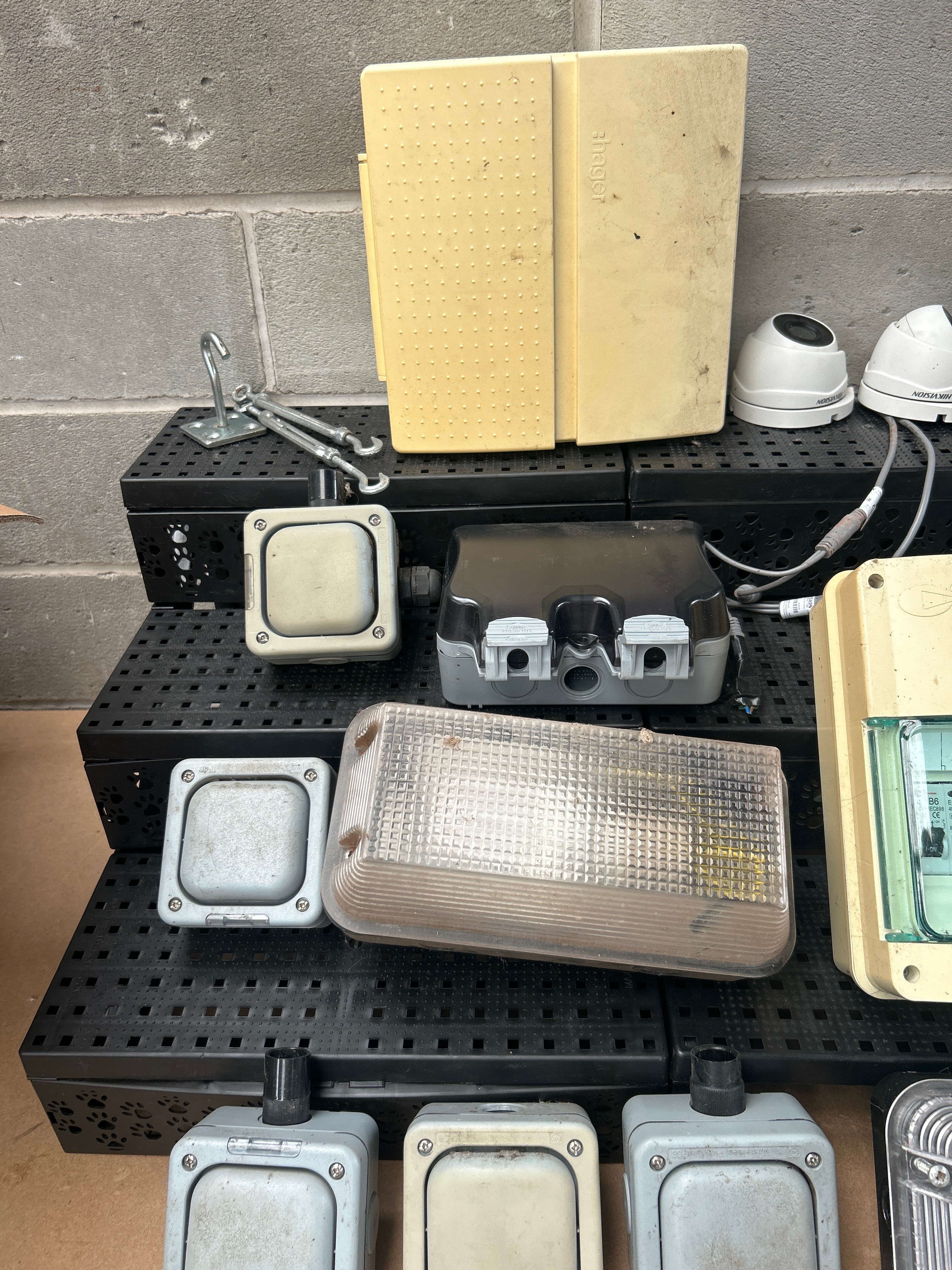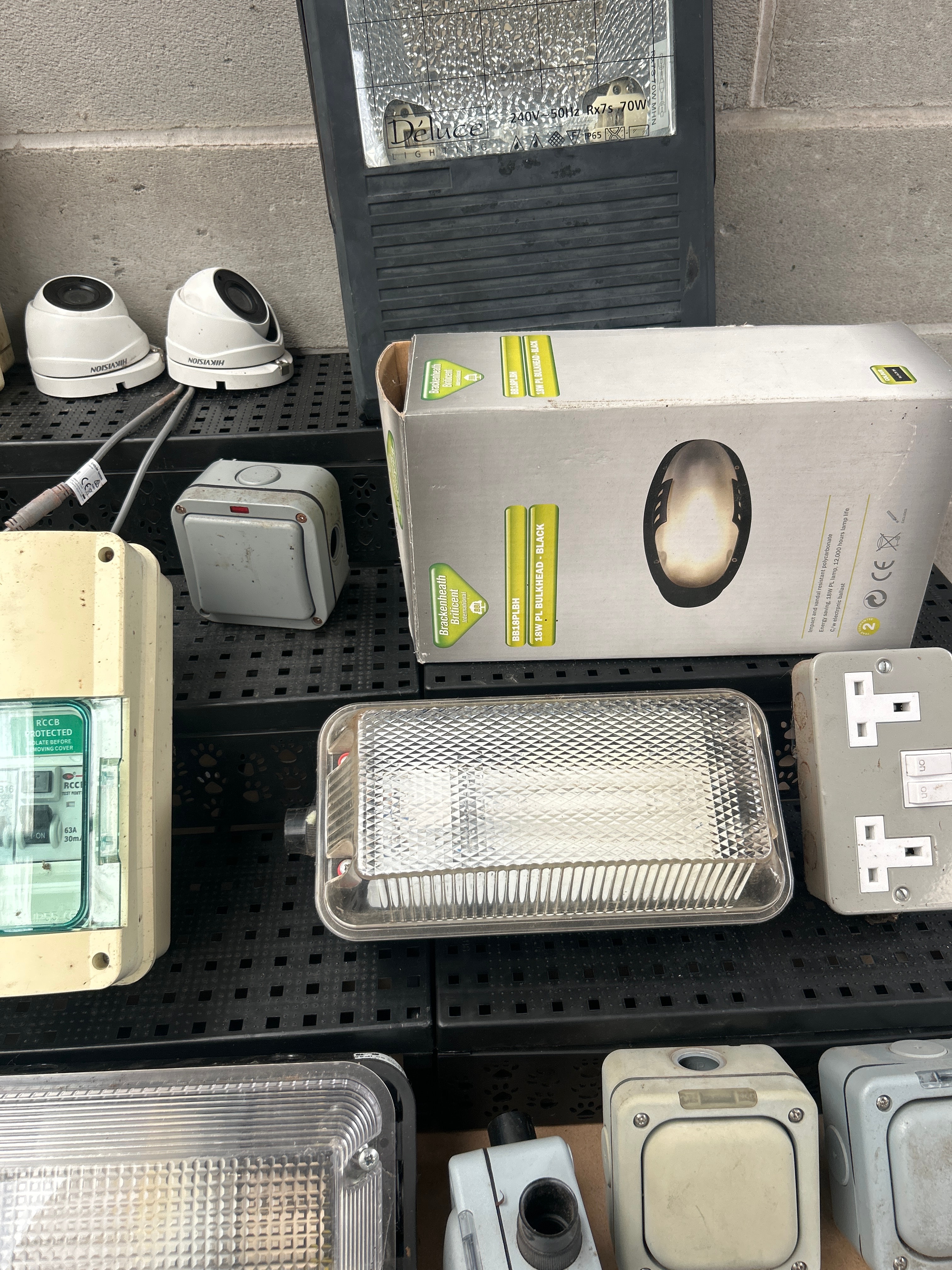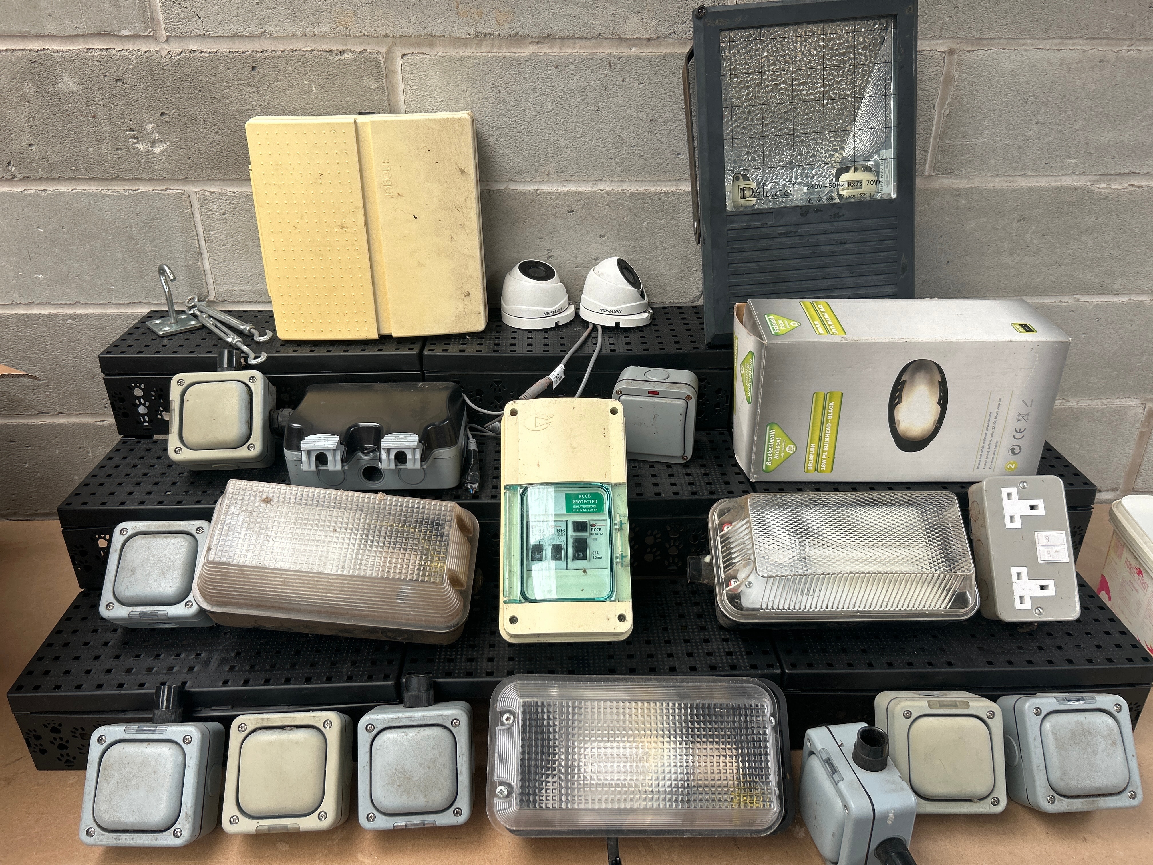 This lot comprises a diverse collection of contemporary electrical and security equipment, primarily suited for outdoor or industrial applications. The collection includes numerous grey and cream-colored plastic-bodied lighting fixtures or bulkheads, some with clear and others with ribbed plastic diffusers. Also present is a large dark grey industrial floodlight, visibly marked “YUNAN PRO,” and two white “HIKVISION” dome-style CCTV cameras with attached cabling. The lot further contains various grey and black plastic electrical enclosures or junction boxes, a beige electrical distribution board marked “RCCS” and “EN 60439,” a double UK-style electrical socket outlet, and a cardboard box for an “18W PLAFONNIER BLANC” (18W White Ceiling Light) LED fixture. The items are predominantly constructed from plastic and metal, exhibiting a utilitarian style.