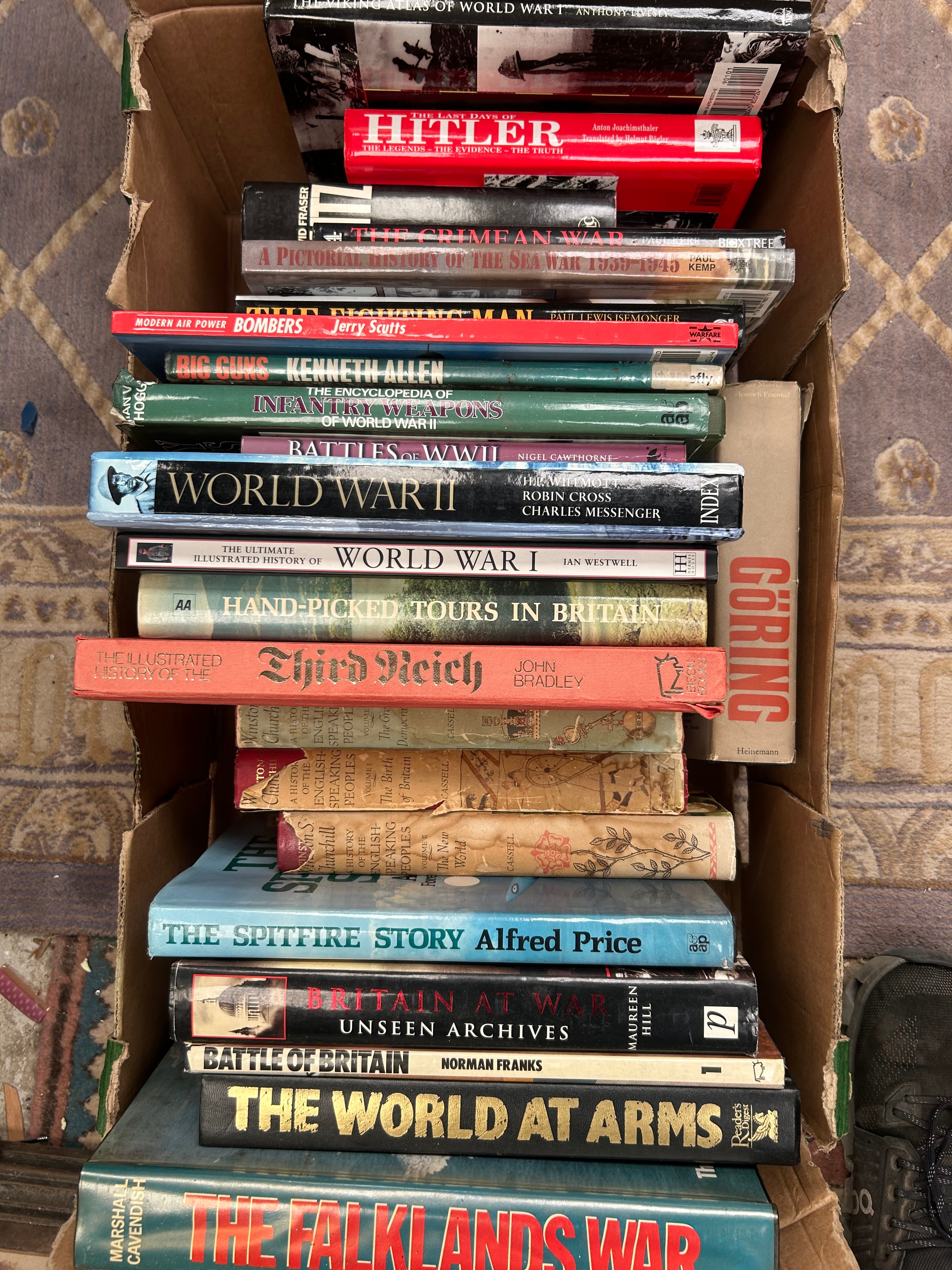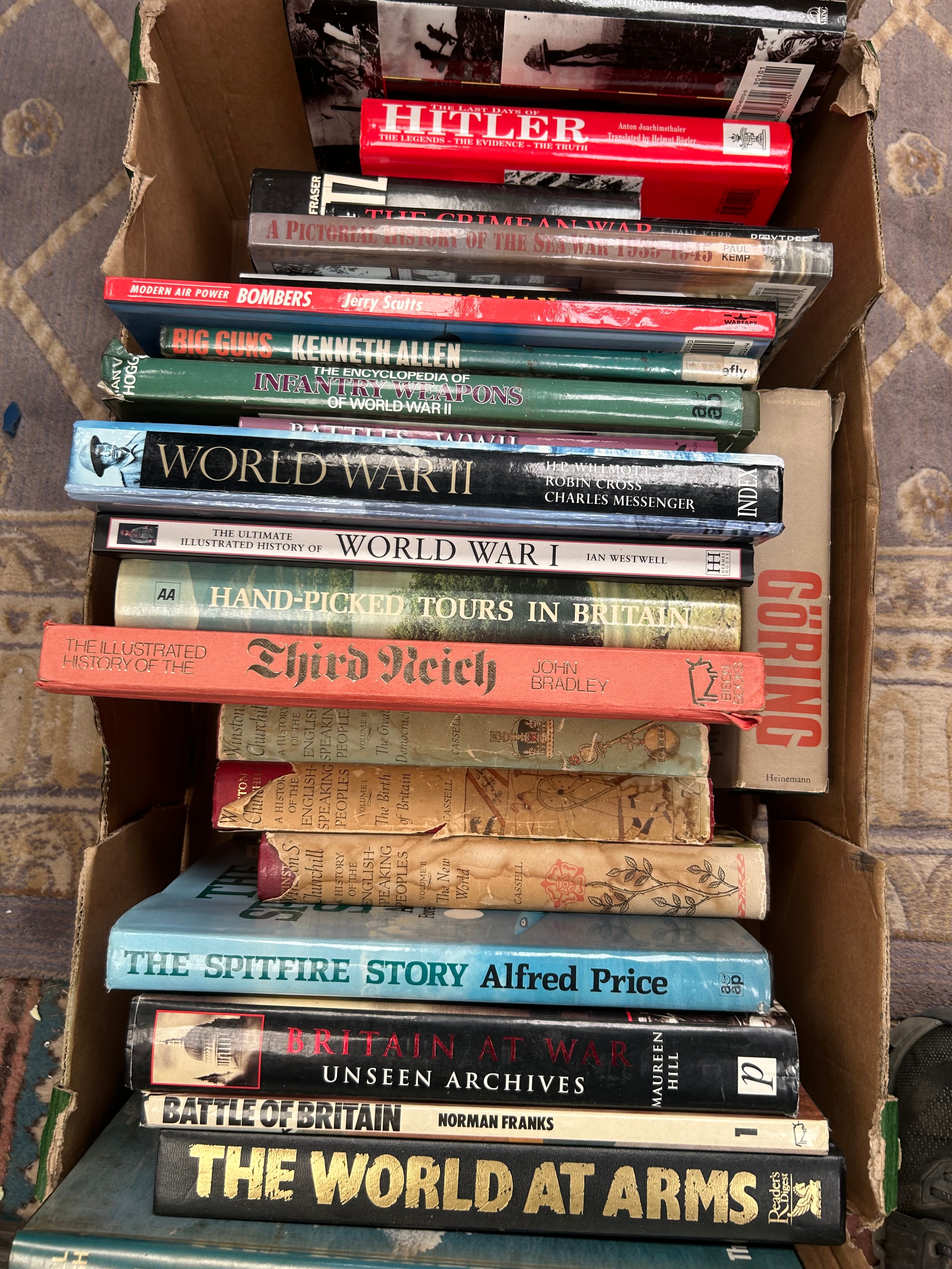 A collection of approximately 25-30 assorted books, predominantly hardbacks, contained within an open cardboard box. Thematically, the collection heavily focuses on military history, especially World War II. Visible titles include “HITLER,” “WORLD WAR II,” “THE THIRD REICH,” “GÖRING,” “THE SPITFIRE STORY,” “BATTLE OF BRITAIN,” “THE FALKLANDS WAR,” “THE CRIMEAN WAR,” and “HAND-PICKED TOURS IN BRITAIN.” Authors such as Jerry Scotts, Kenneth Allen, Ian Westwell, John Bradley, Alfred Price, Maureen Hill, and Norman Franks are present. The books are primarily made of paper and cardboard.