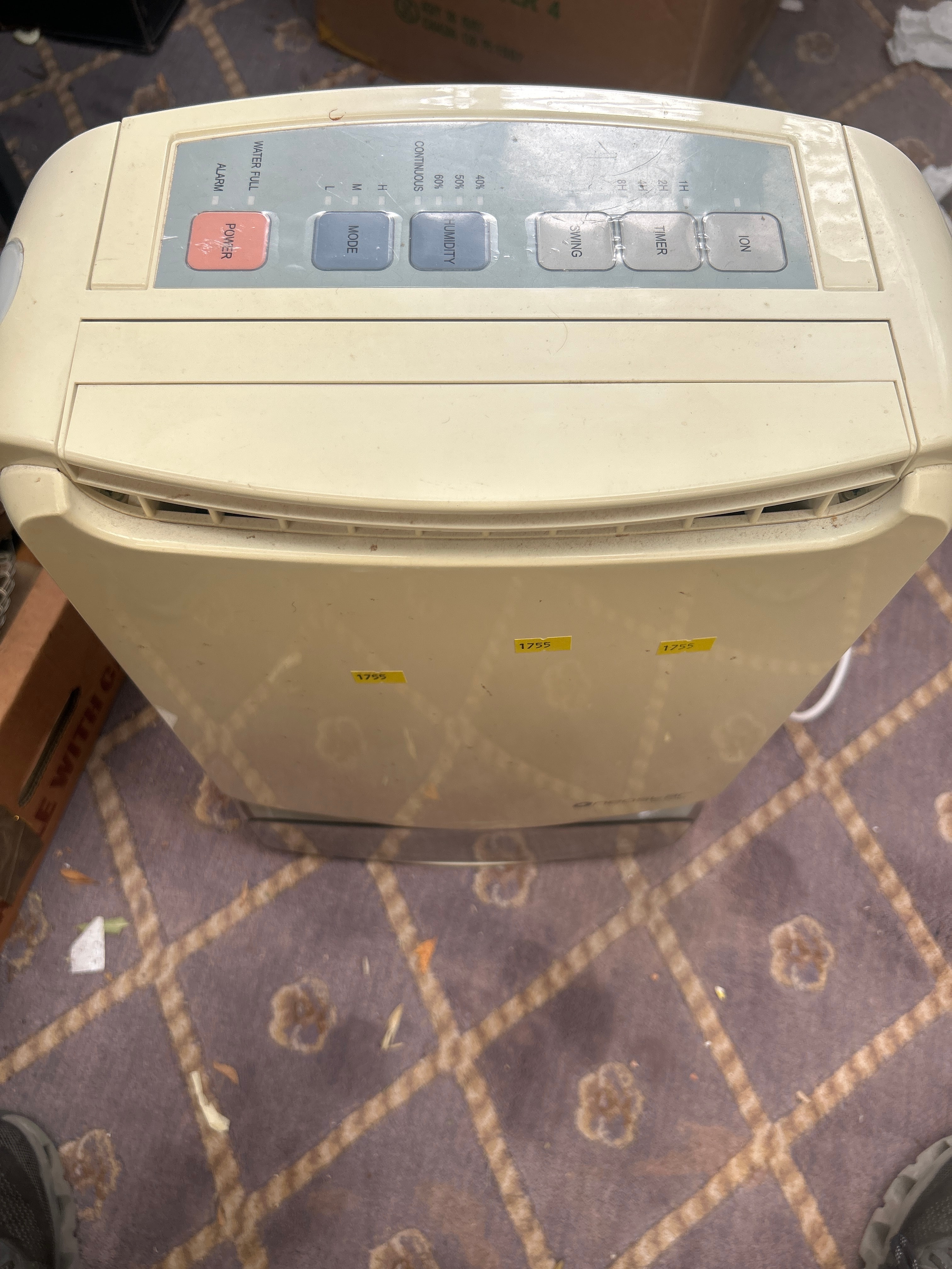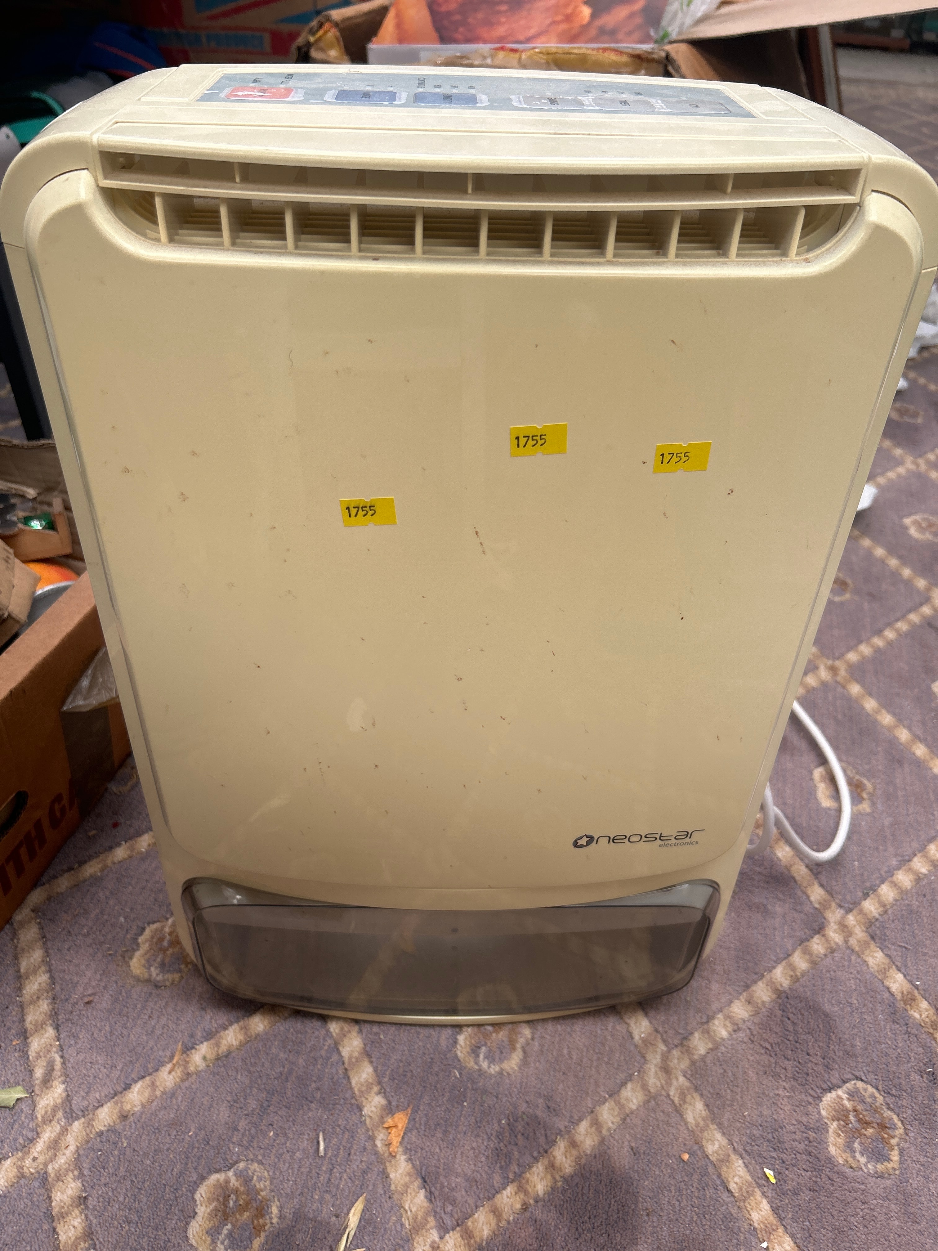 A Neostar Dehumidifier, cream-colored plastic electronic appliance, featuring a modern, utilitarian design. The top control panel includes push buttons and a display area with English labels such as “POWER,” “MODE,” “WATER FULL,” “WARM,” “HUMIDITY” (with settings for 40%, 50%, 60%, and CONTINUOUS), “TIMER” (1H, 2H, 4H, 8H), “SWING,” “DRYING,” and “ION.” The front lower section is marked “©neostar air solutions.” Three yellow stickers bearing the number “1755” are affixed to the front.