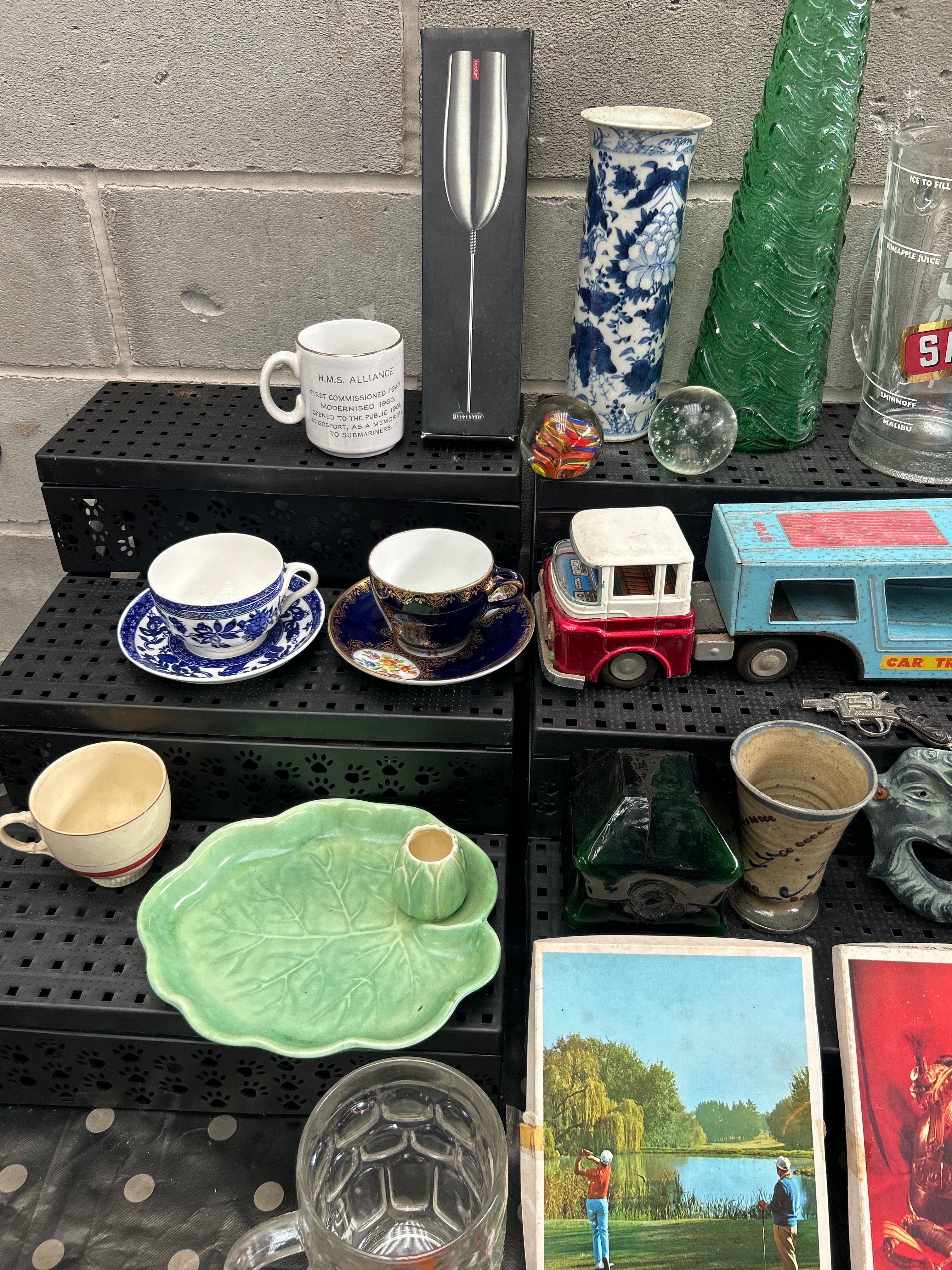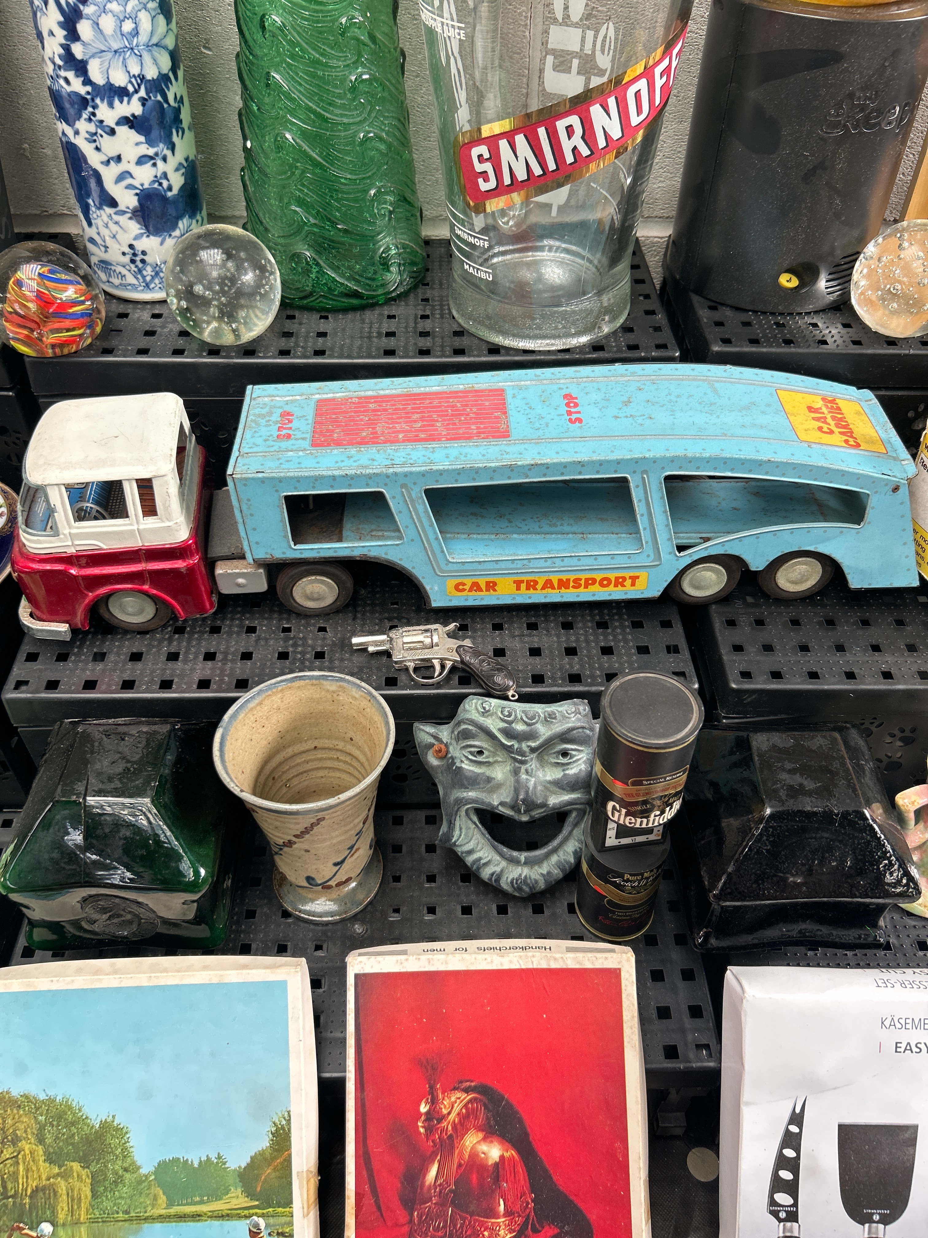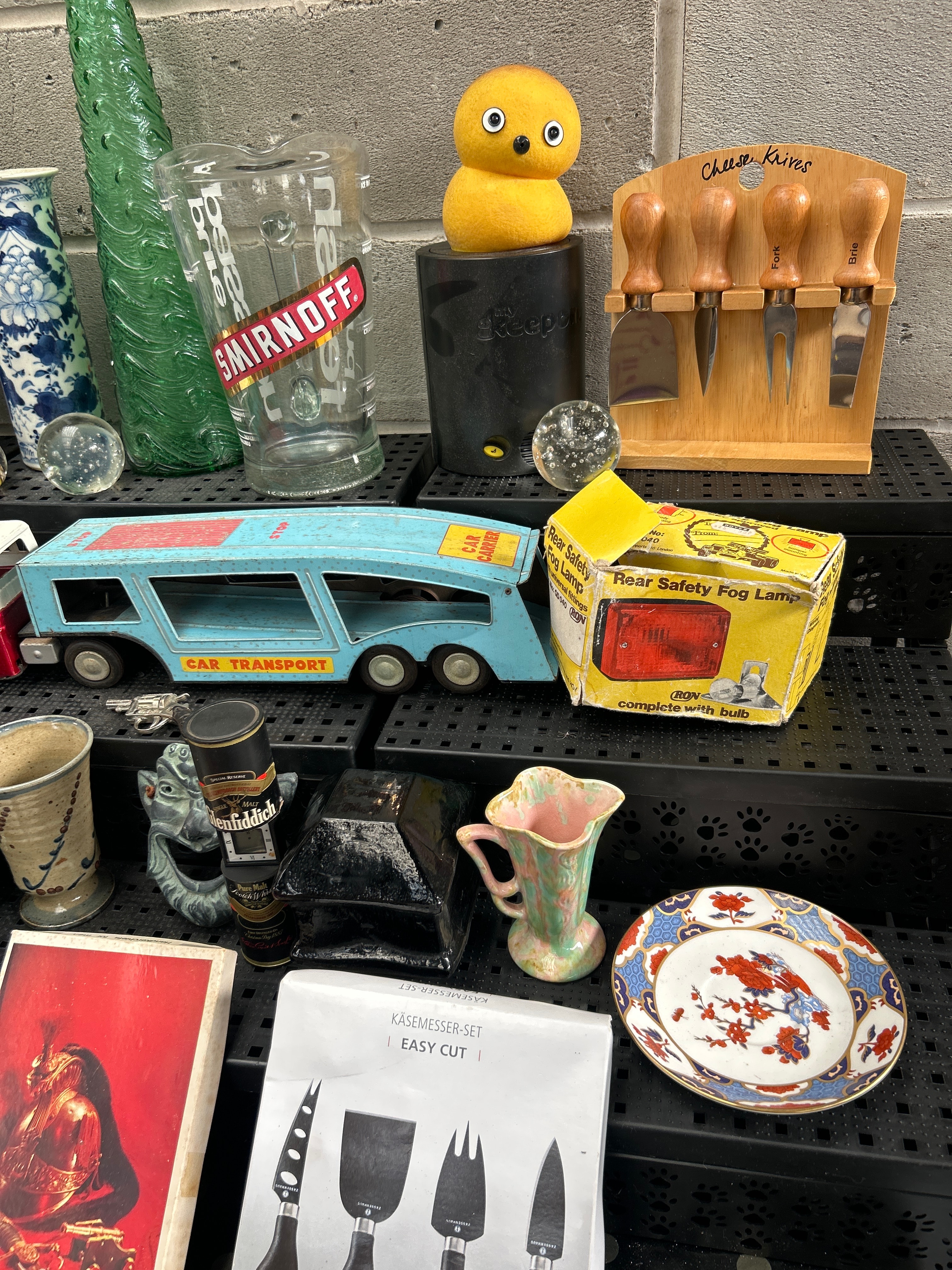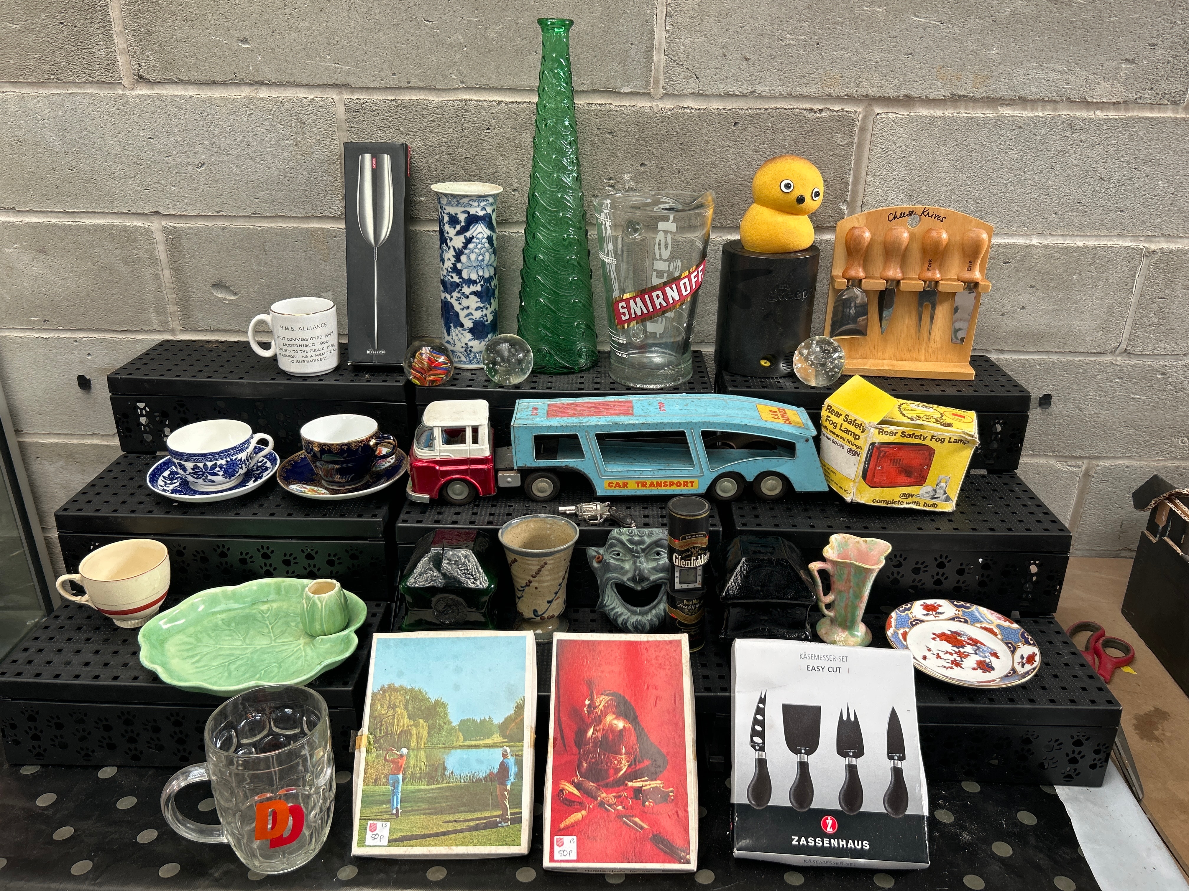 A varied collection comprising approximately thirty disparate items, predominantly household and decorative objects, ranging from ceramics and glassware to metal toys and packaged goods. Materials include various ceramics such as a blue and white Chinoiserie-style vase, tea sets, a cream cup, a green leaf dish, and a plate with oriental motifs. Glassware includes a green textured bottle, a Smirnoff branded pint glass, clear glass paperweights, a silver-toned slender flute in a black box, and a clear mug with a ‘D’ logo, possibly for Dr. Pepper. Metal items feature a vintage blue and red tin ‘CAR TRANSPORT’ toy truck and a small toy revolver. A wooden cheese knife stand is present, along with various paper and cardboard items, including ‘Homemakers for Men’ brochures and other packaged goods. Visible markings include ‘H.M.S. ALLIANCE’ on a white mug, ‘SMIRNOFF’ on a pint glass, ‘CAR TRANSPORT’ on the toy truck, ‘Glenfiddich’ on a miniature bottle, and ‘KÄSEMESSER-SET | EASY CUT | ZASSENHAUS’ on a boxed knife set. Other notable items include a yellow duck-like figurine on a ‘Reepo’ branded black base, a grotesque face mask, and a yellow box for a ‘Rear Safety Fog Lamp’. The items span various styles and likely periods, from traditional and vintage to more modern packaged goods.