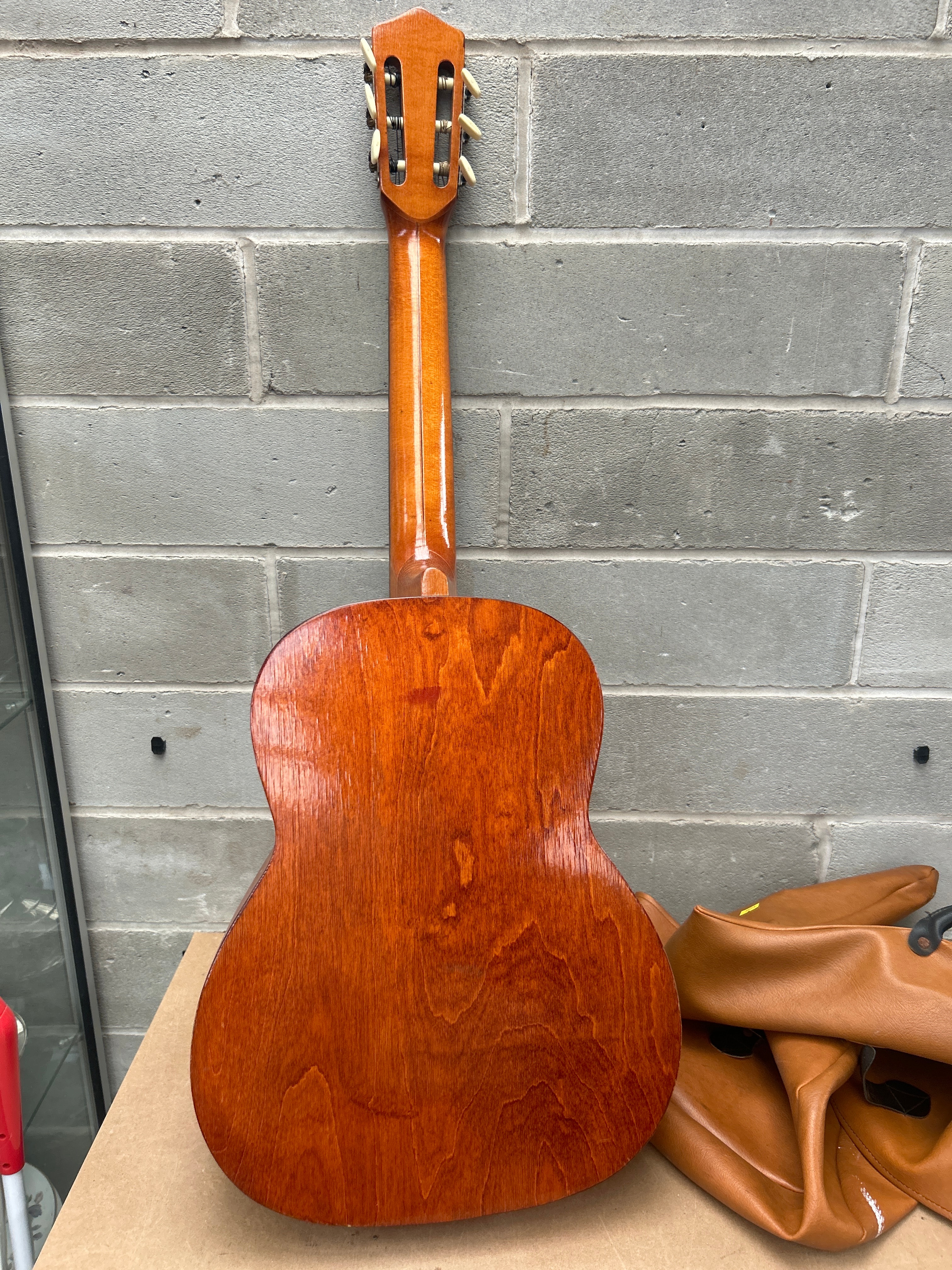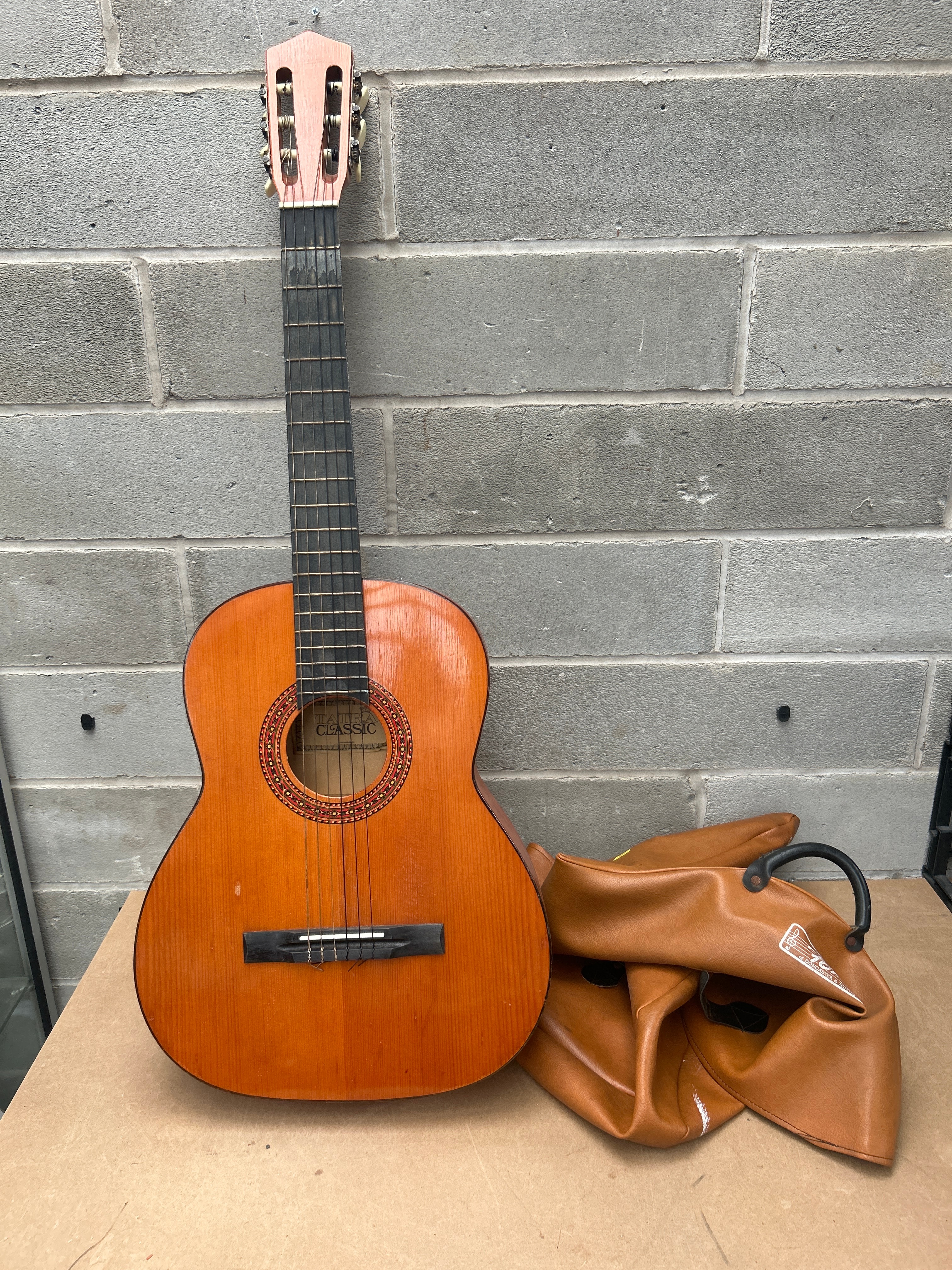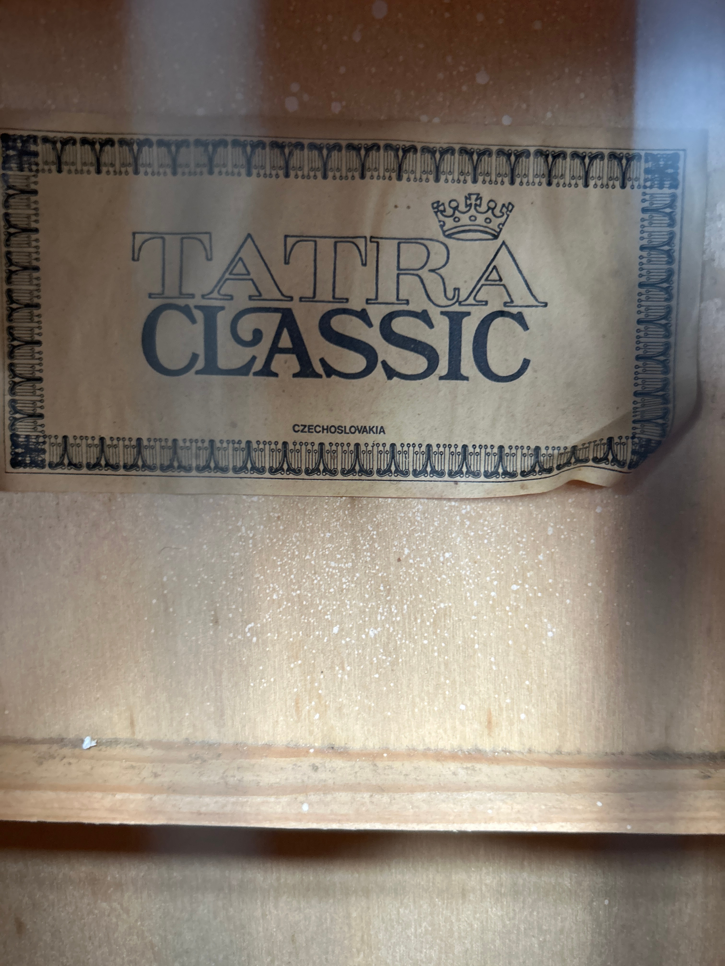 A Tatra Classic classical acoustic guitar, identified by an internal label bearing the ‘TATRA CLASSIC’ name with a crown emblem and marked ‘CZECHOSLOVAKIA,’ indicating manufacture prior to 1993, likely circa 1970s based on market comparables. The instrument is constructed primarily of wood with a natural, possibly varnished finish, featuring a dark wood fretboard, nylon strings, and metal tuning machines with white plastic buttons. It is accompanied by a tan faux leather soft gig bag.
