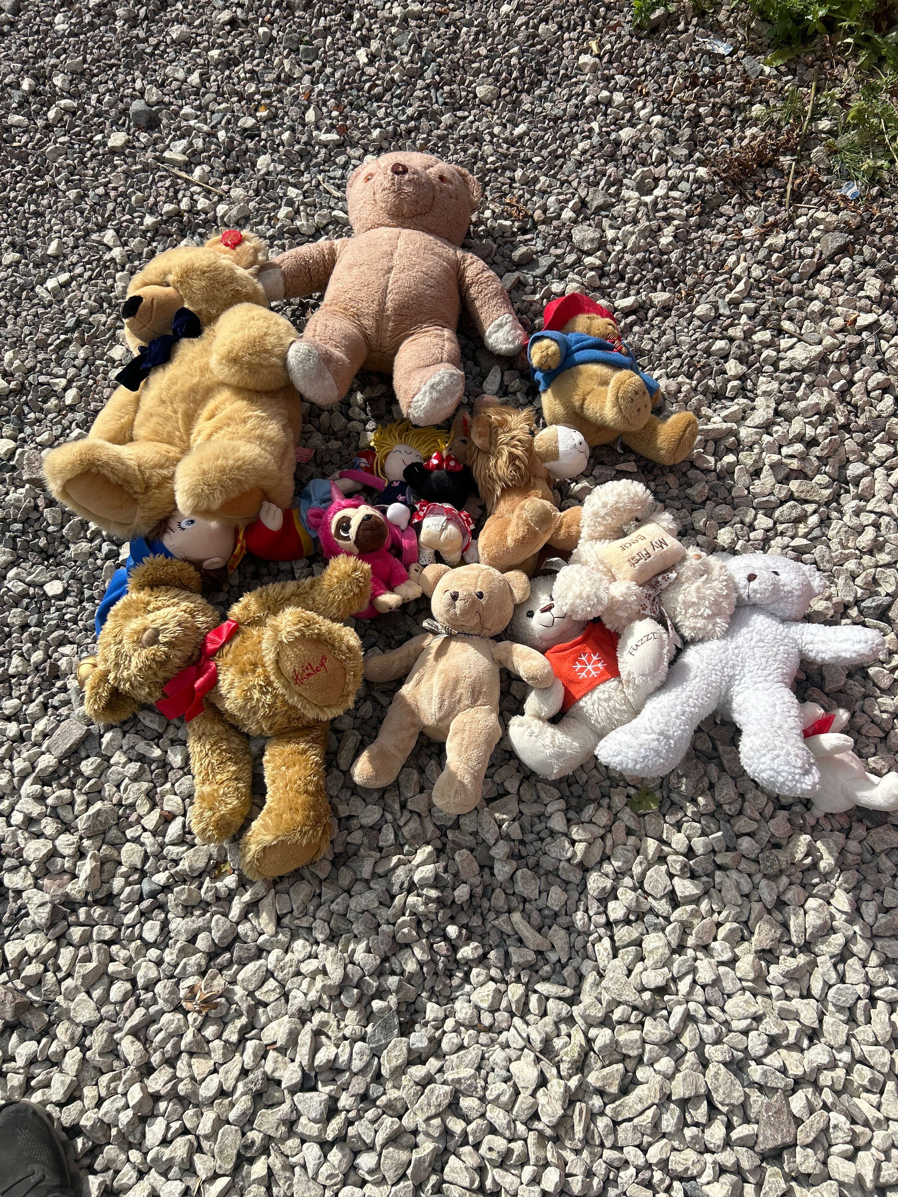 A collection of approximately 15-20 assorted modern plush toys, predominantly teddy bears of varying sizes, colors, and designs, consistent with examples by Russ and other manufacturers. The items are constructed from synthetic plush fabric with soft stuffing, plastic eyes and noses, and feature various fabric accessories including bows, scarves, and miniature clothing. Visible markings include one white bear embroidered with “My First Bear” on its foot, another white bear wearing a red sweater with a white snowflake design, and a light brown bear with “HUGS” embroidered on its foot.