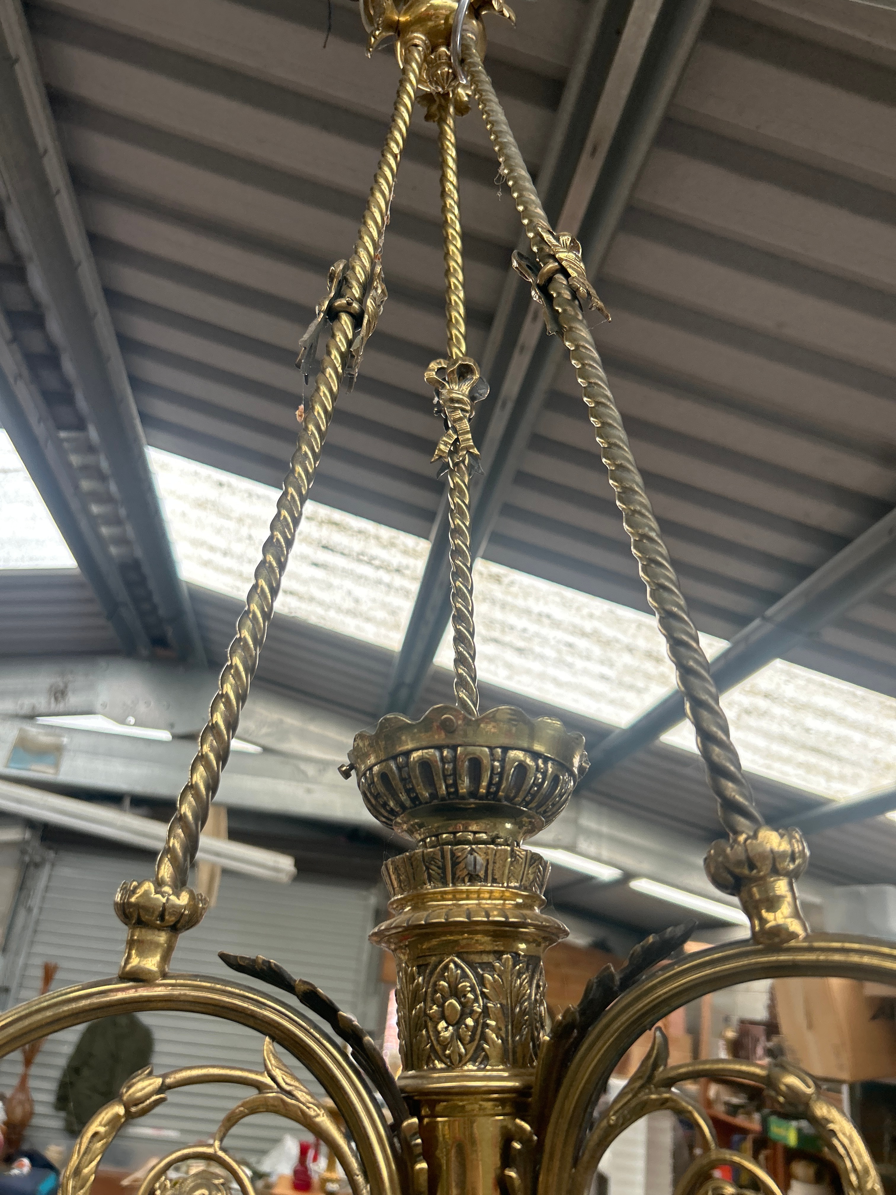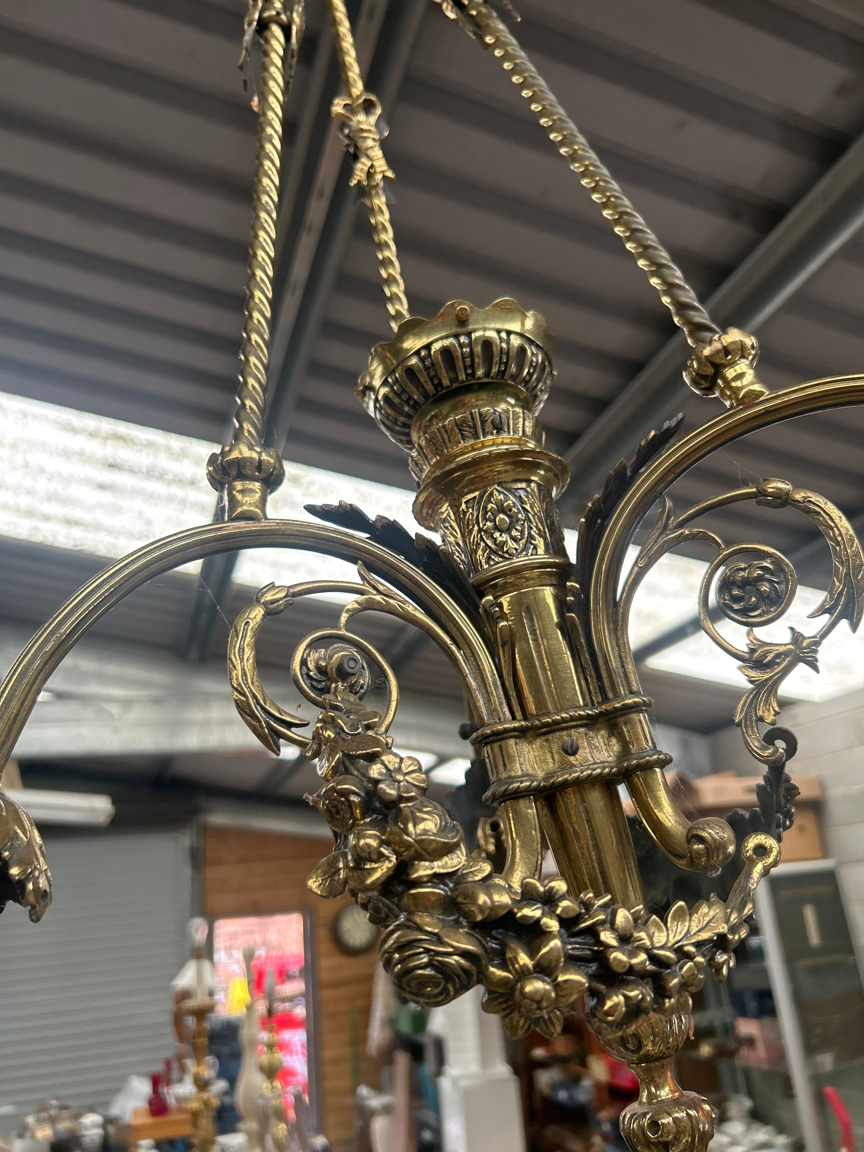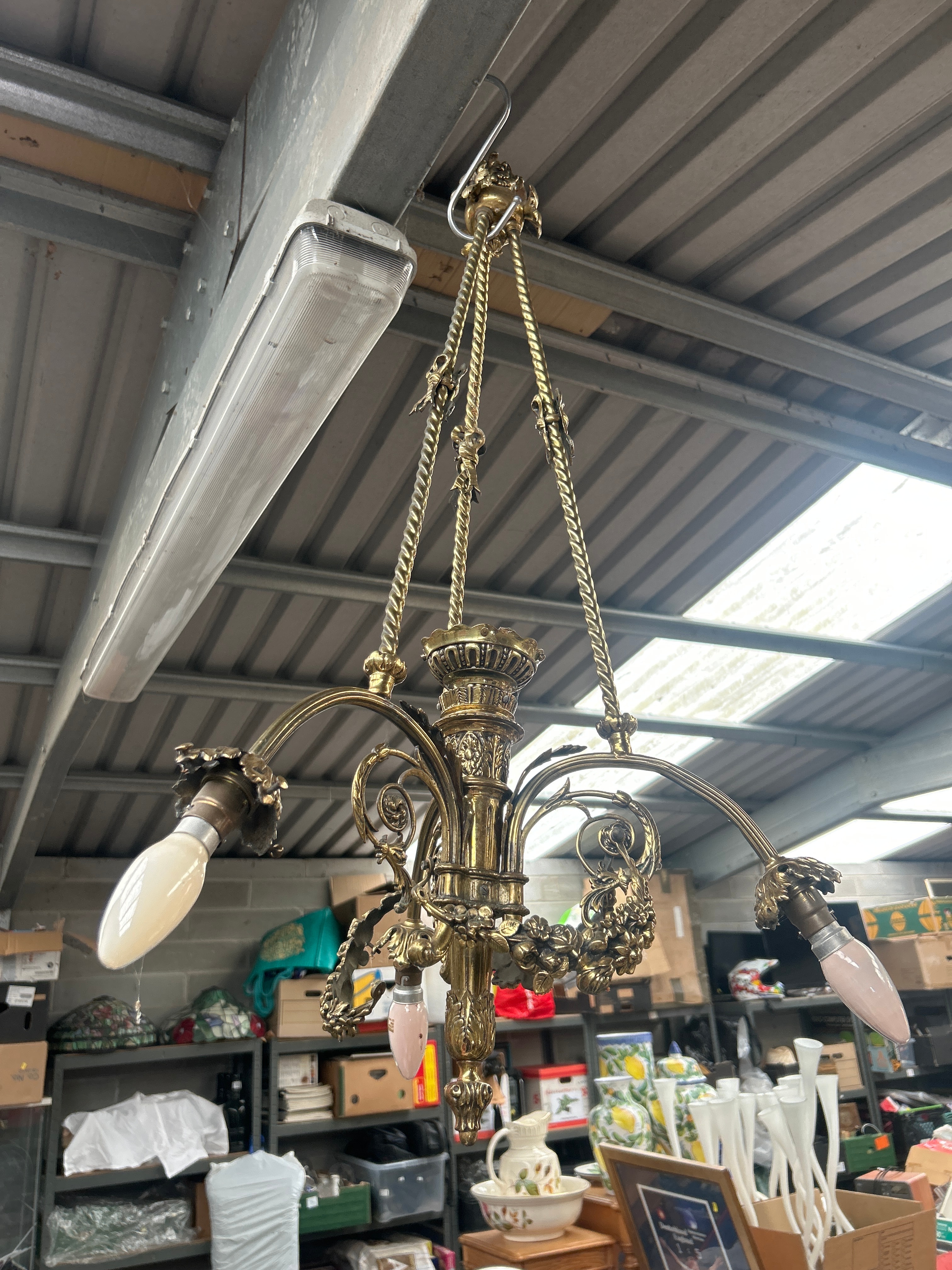 An ornate three arm chandelier crafted from patinated brass or bronze, featuring a design indicative of late 19th or early 20th-century revival styles, consistent with French Napoleon III aesthetics. The central column displays fluted details and classical motifs, supporting four scrolled arms heavily embellished with intricate floral and foliate ornamentation, including rose clusters. It is suspended by three twisted chains connecting to a central stem. The fixture currently holds four modern-style light bulbs (two frosted white, two frosted pink). No visible text or markings are discernible.