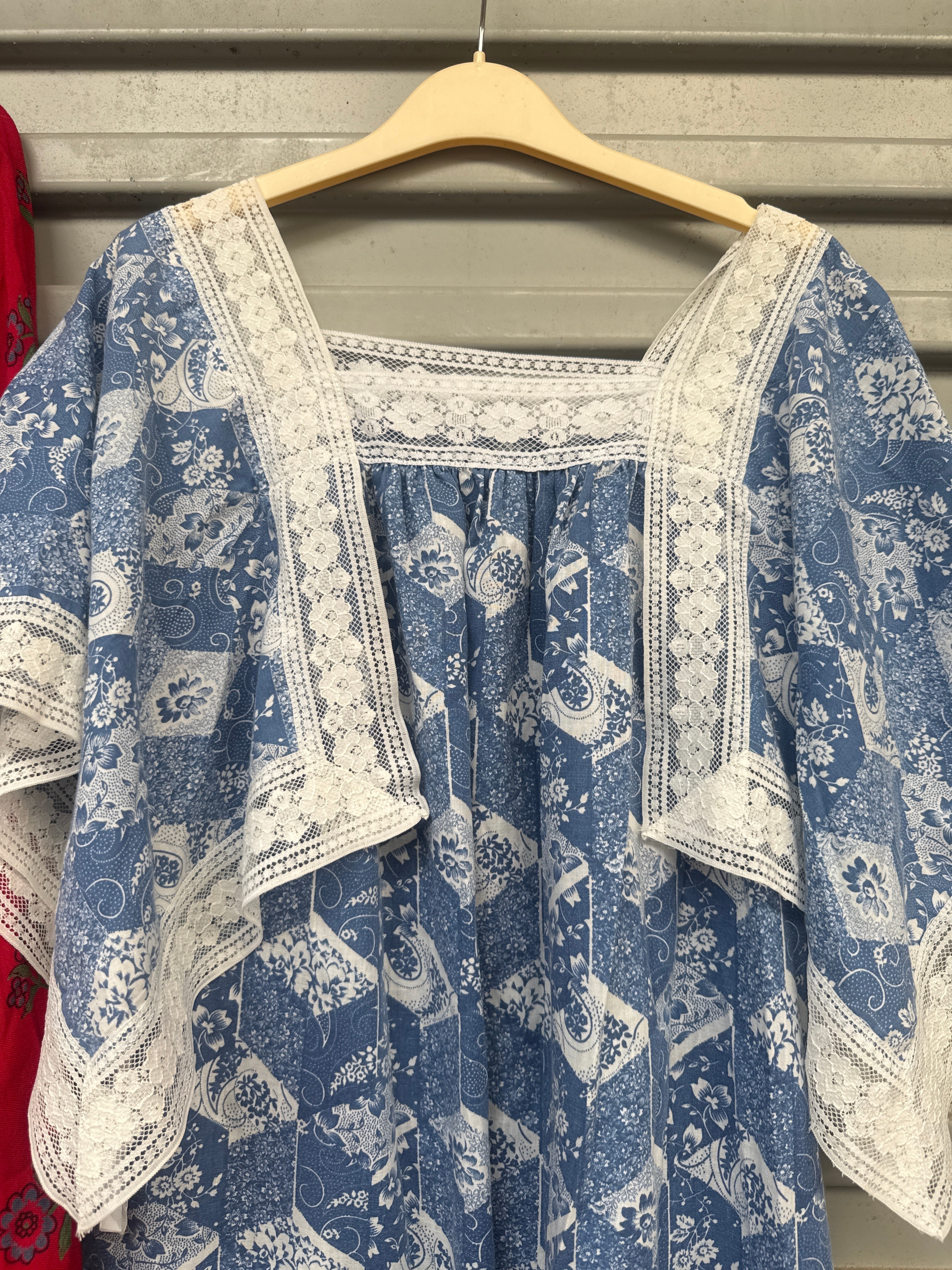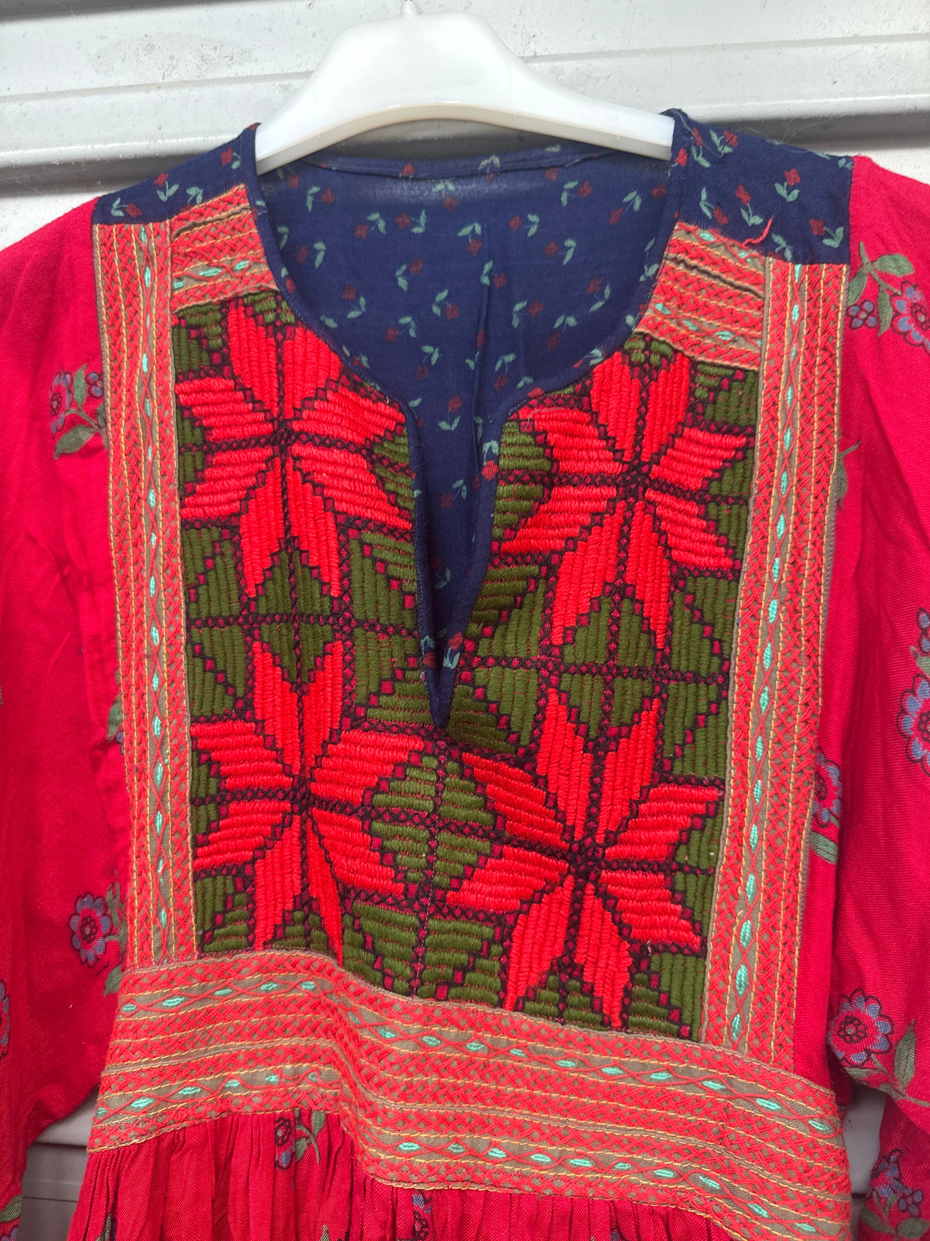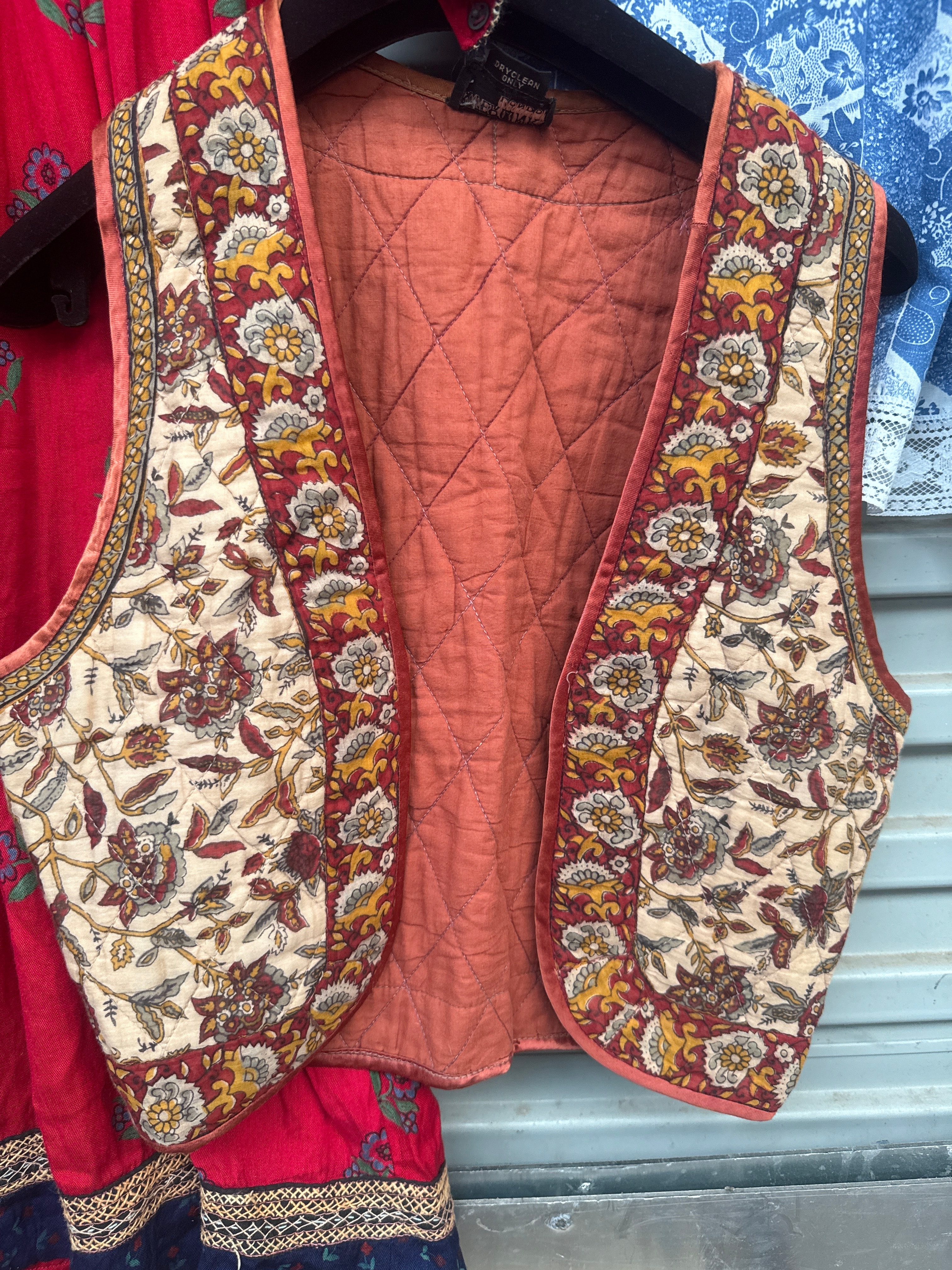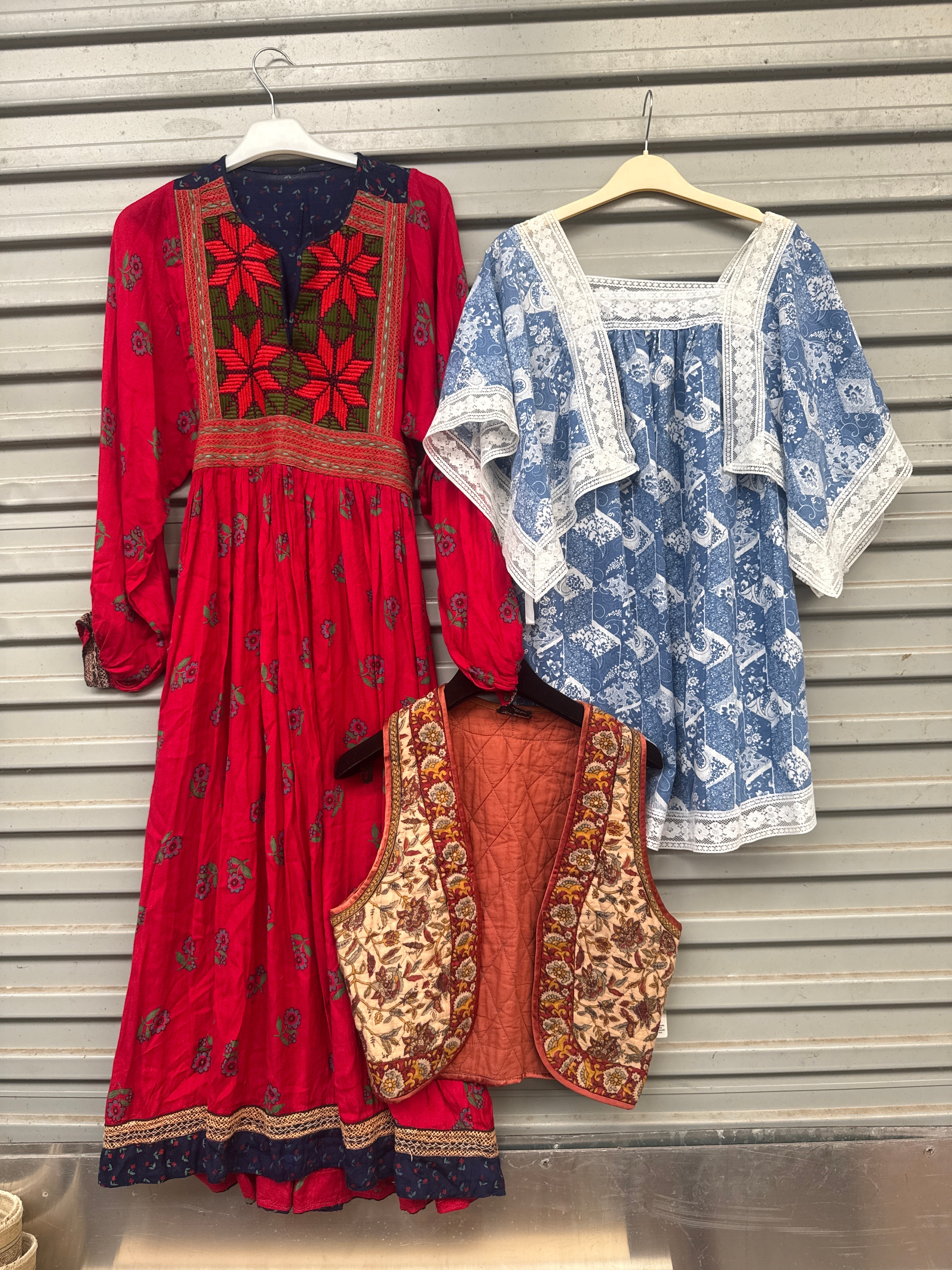 The lot comprises a 1970s Afghan Monsoon folk dress, a blue folk-style top, and a quilted vest. The full-length red dress features a heavily embroidered square-necked bodice with prominent red star-like motifs on a green and navy ground, and a lower skirt section with complementary printed borders. The loose-fitting, short-sleeved blue top has a wide square neckline and sleeves trimmed with white lace, displaying an all-over blue and white block-printed or patterned design. The reversible, quilted sleeveless vest has a cream background adorned with a repeating floral print in warm tones, backed by a plain quilted terracotta lining, and bears a ‘Travel For’ brand tag. All items appear to be crafted from natural fibers, likely cotton.