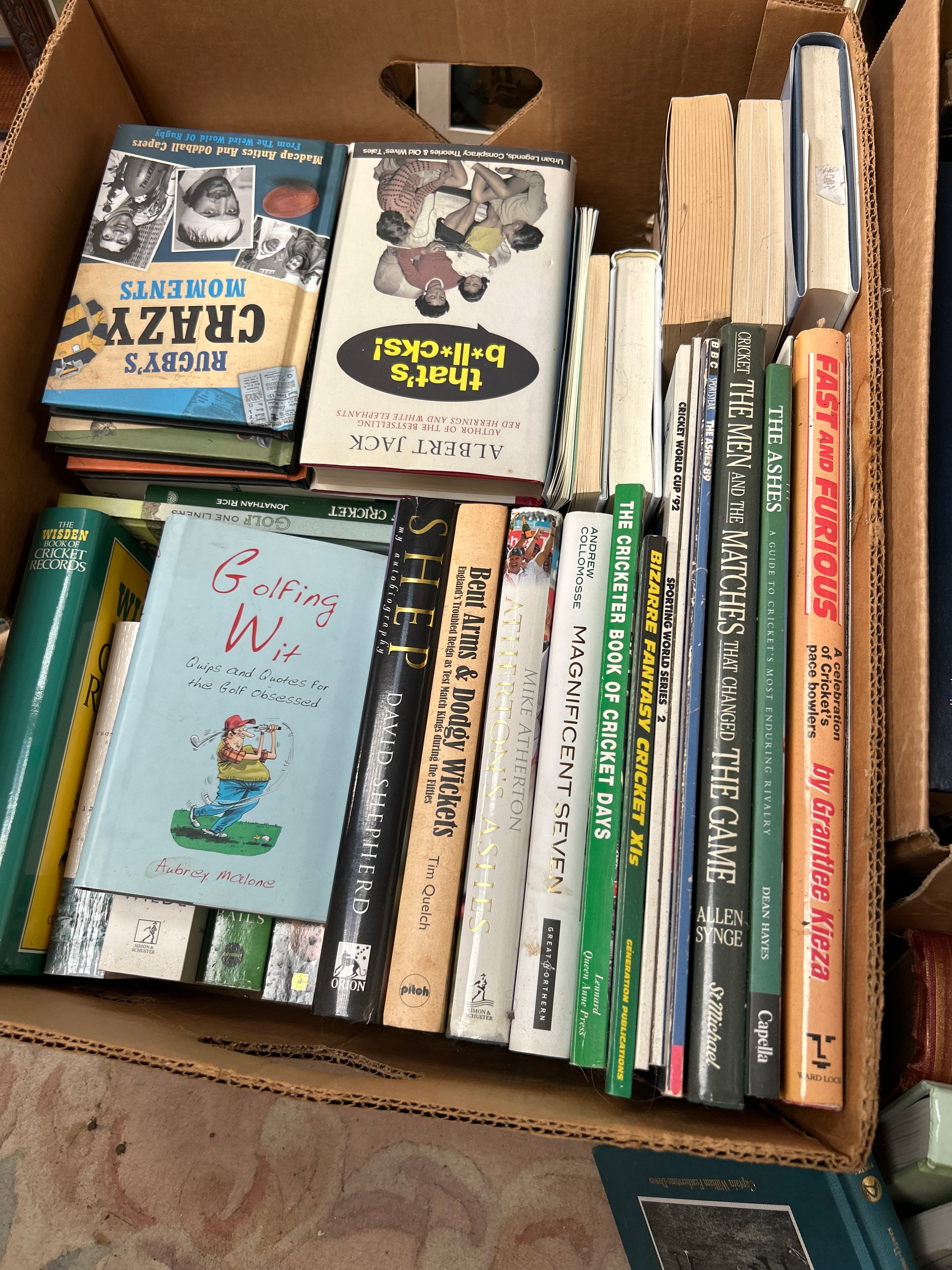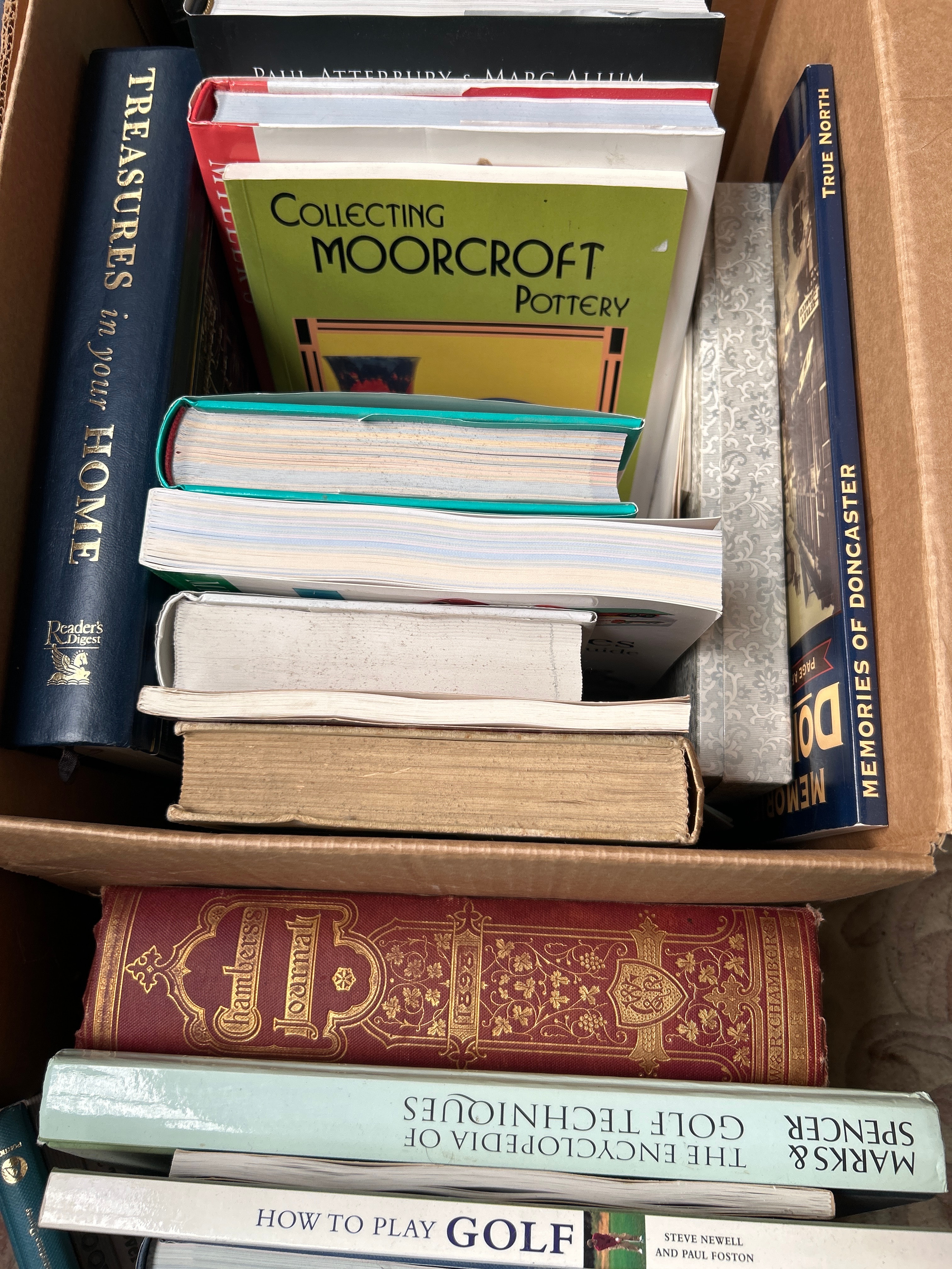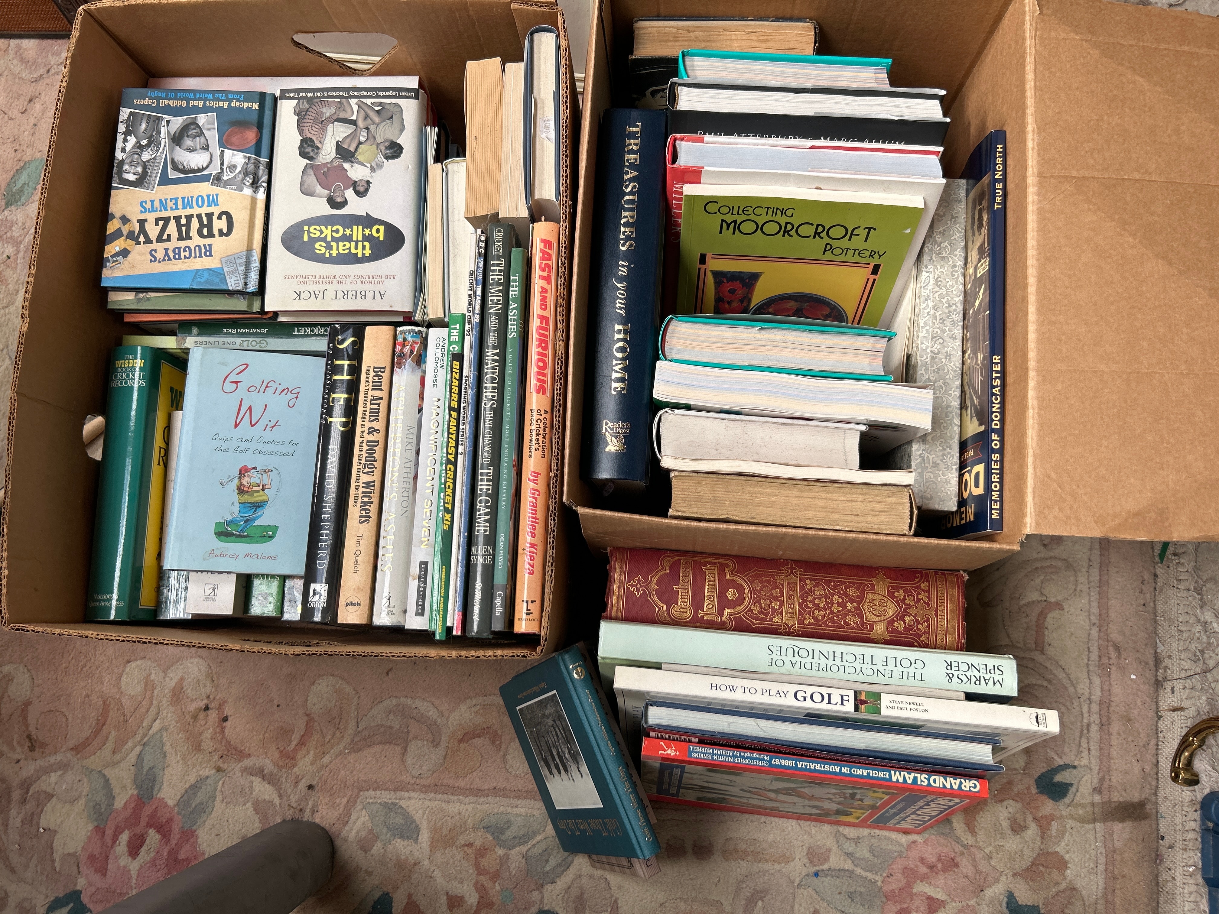 This substantial collection comprises assorted books, primarily modern publications from the late 20th and early 21st centuries. A notable older red-bound volume, clearly marked “Grantham Journal 1908” with an ornate gold design, is also present. The collection spans diverse genres, including sports, with many titles related to cricket, rugby, and golf such as “RUGBY’S CRAZY MOMENTS,” “THE ASHES AND THE MATCHES THAT CHANGED THE GAME,” and “THE ENCYCLOPEDIA OF GOLF TECHNIQUES.” Other genres include local history (“MEMORIES OF DONCASTER”), humor (“Albert Jack that’s b*ll*cks!”), and collecting (“COLLECTING MOORCROFT POTTERY,” “TREASURES in your HOME”). The books are constructed from typical paper and cardboard materials.