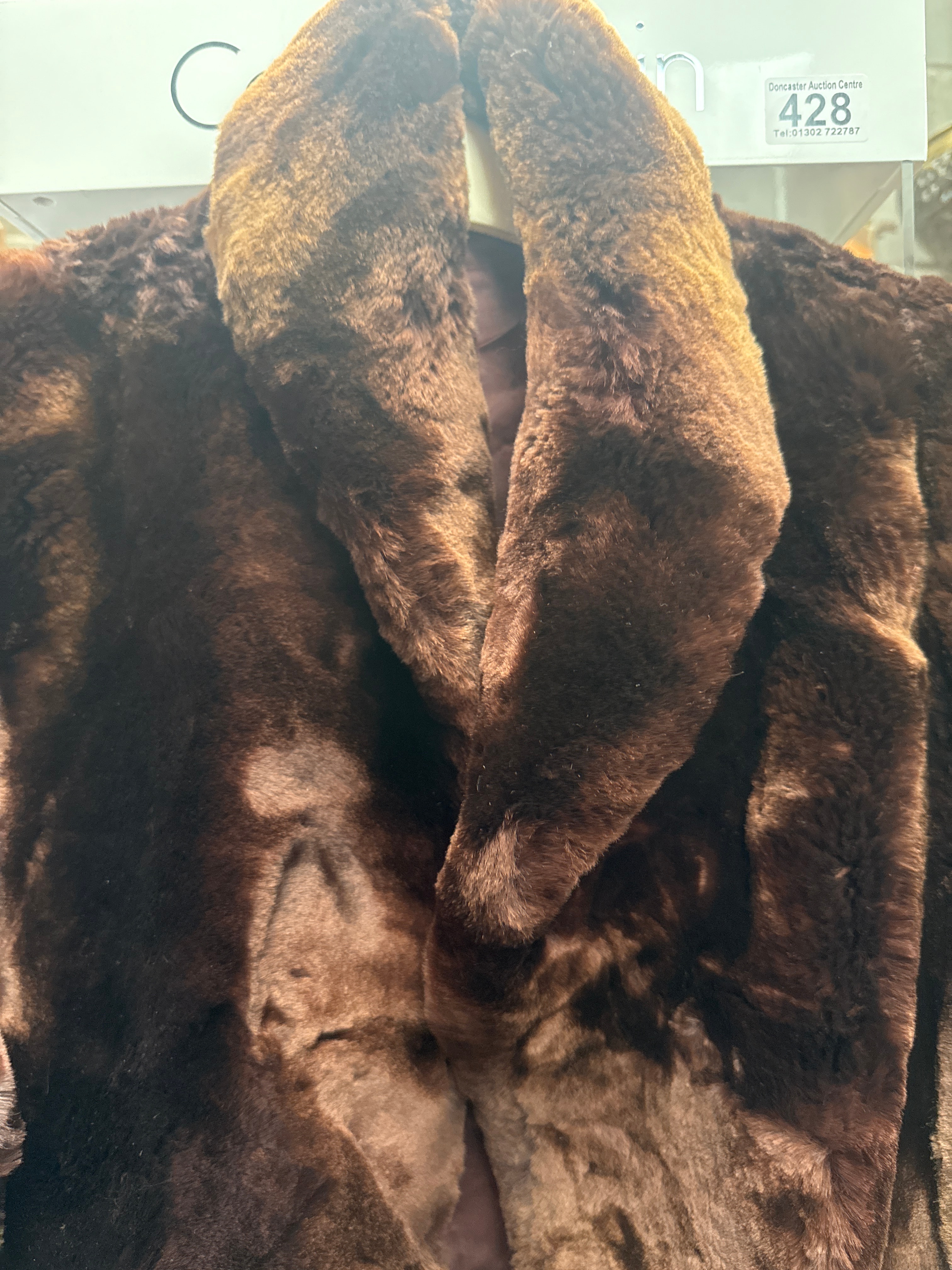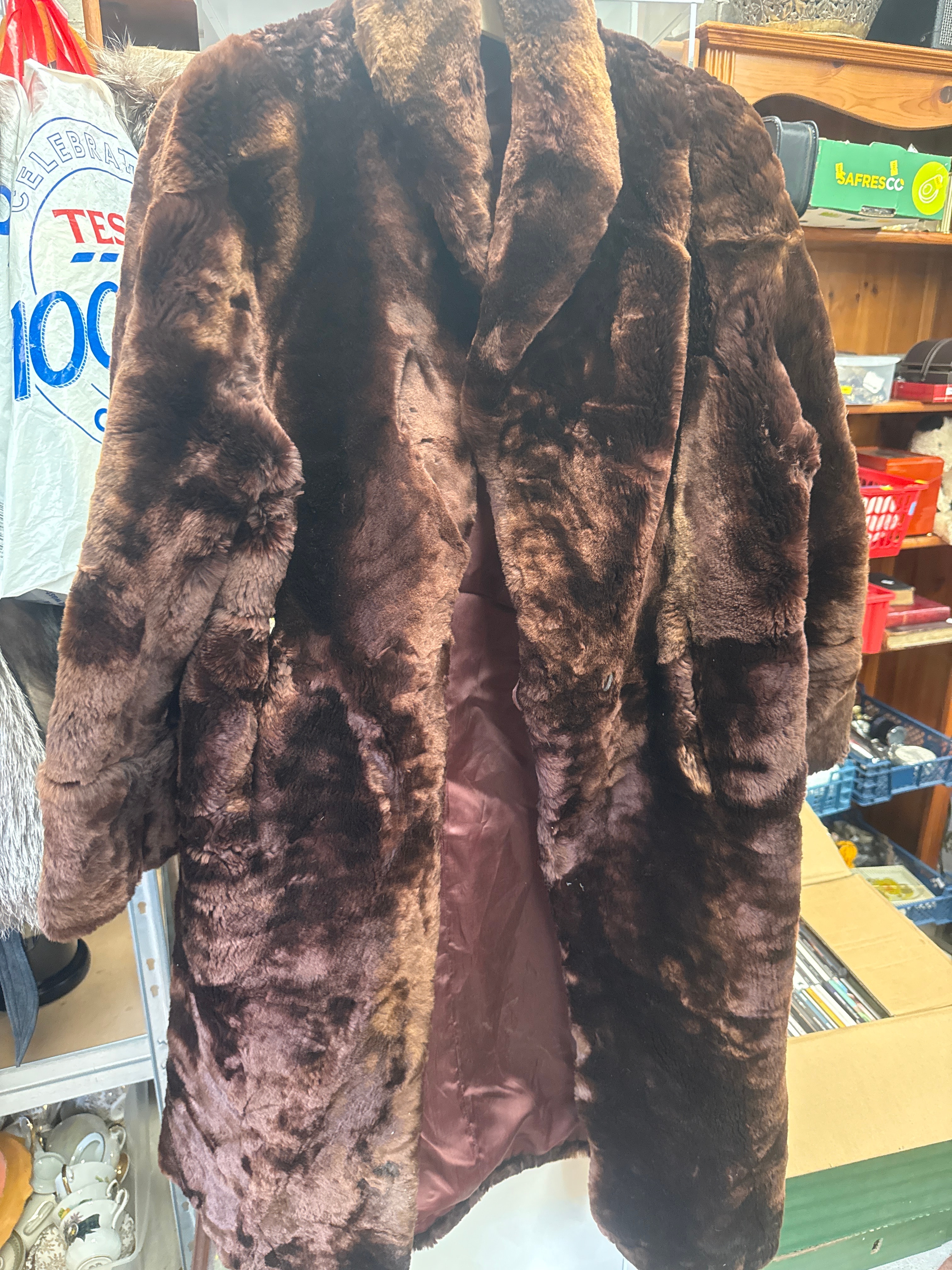 A Vintage Avenue Montaigne Brown Fur Coat, dating to the 1960s/1970s. This full-length coat is crafted from dark brown fur, featuring a broad notched lapel collar, long sleeves, and a straight cut. It is lined with a reddish-brown, possibly satin or synthetic, material and secures with a front closure of three visible fur-covered buttons. The material displays a textured, somewhat lustrous appearance.
