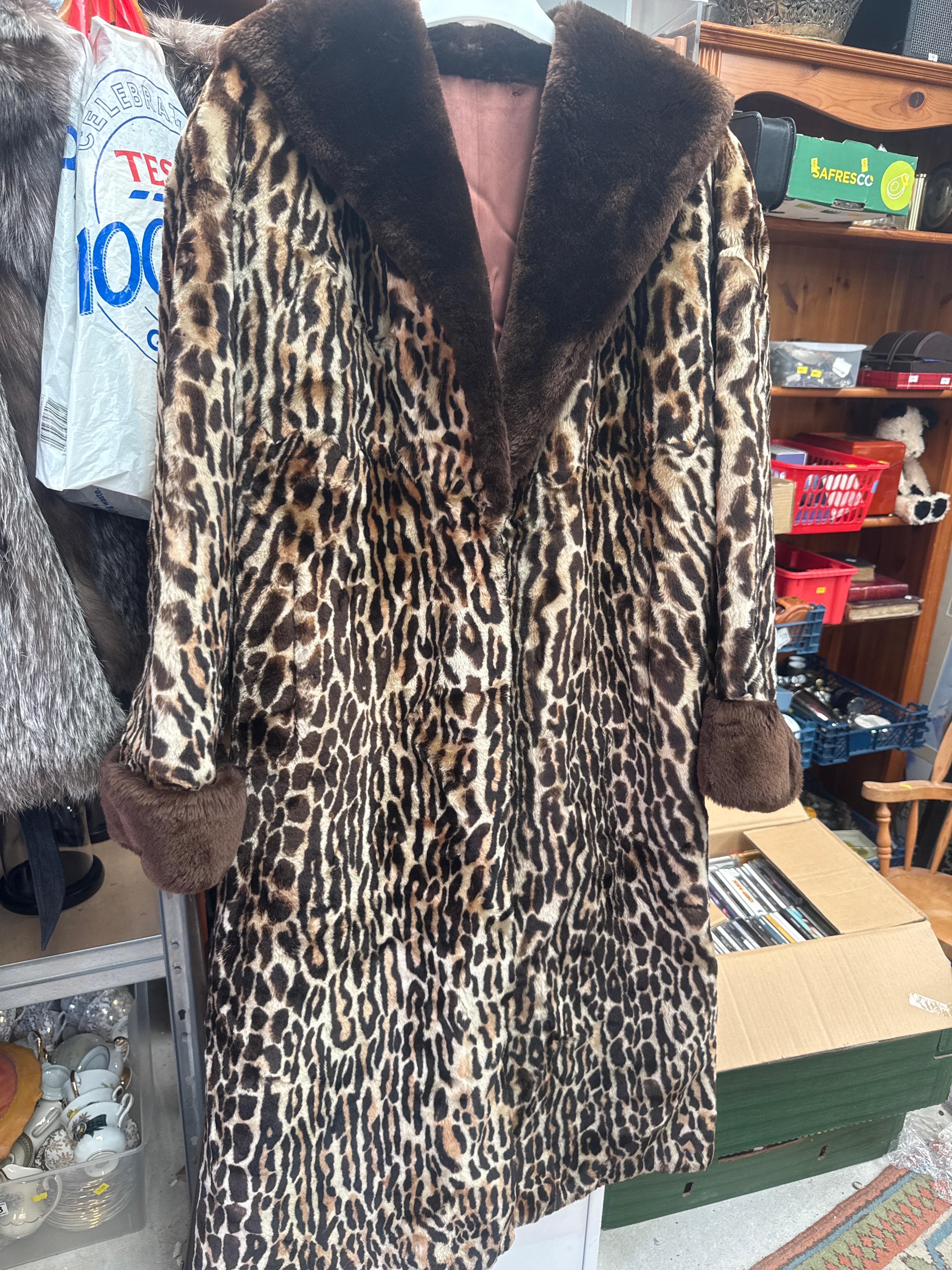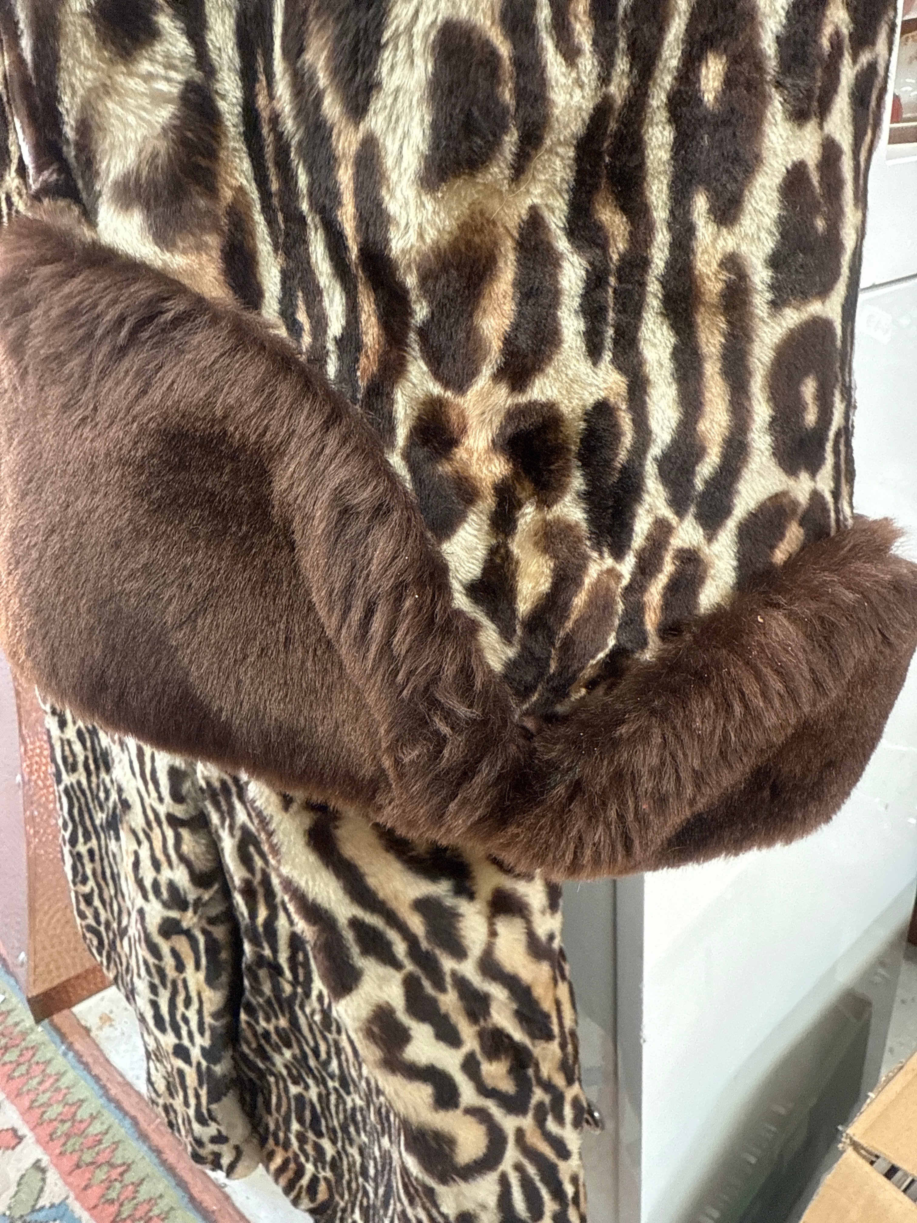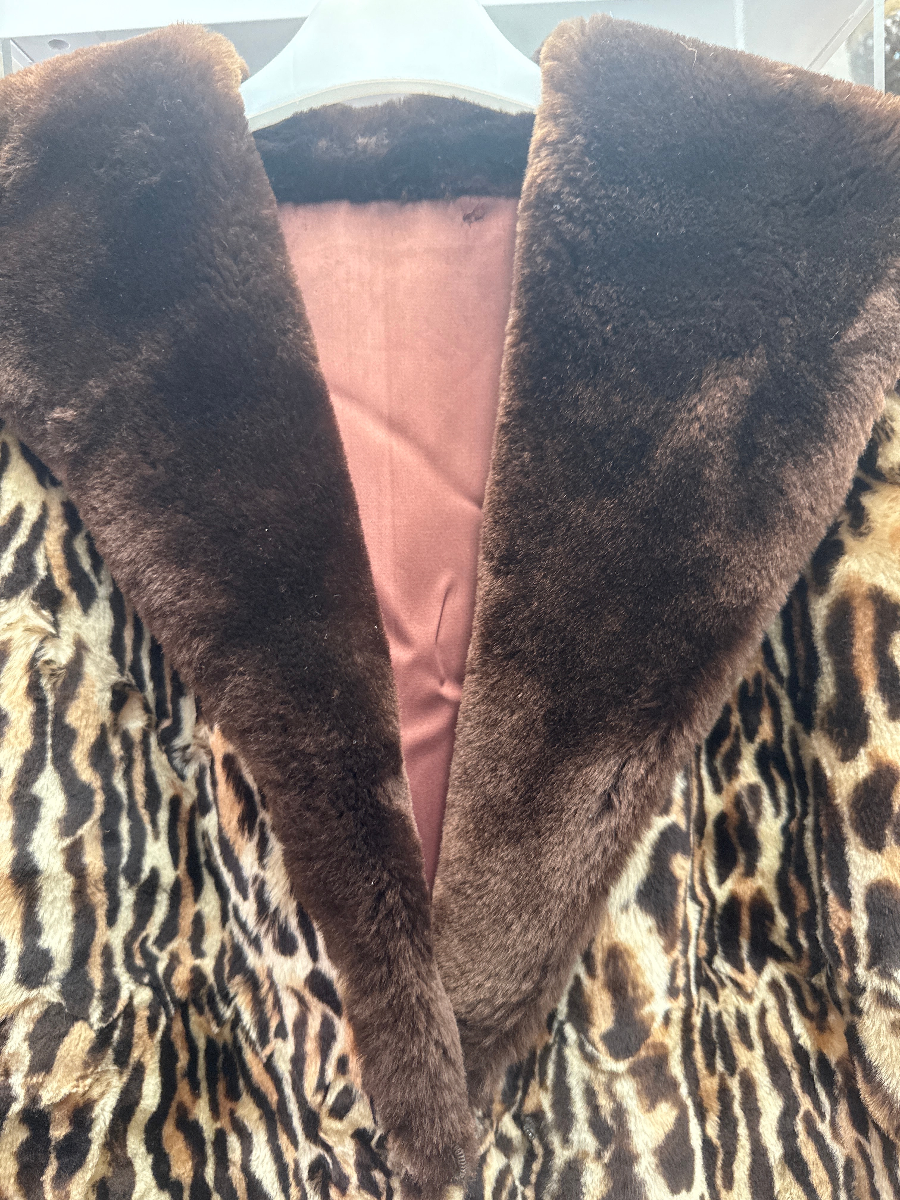 A vintage leopard print real fur coat, featuring a distinctive leopard spot pattern in brown, black, and cream tones. The coat is designed with a wide, dark brown fur-like collar and matching cuffs. The interior is lined with a smooth, reddish-brown fabric, appearing to be a satin or synthetic blend. No visible text, brand tags, or manufacturer markings are apparent on the coat itself.