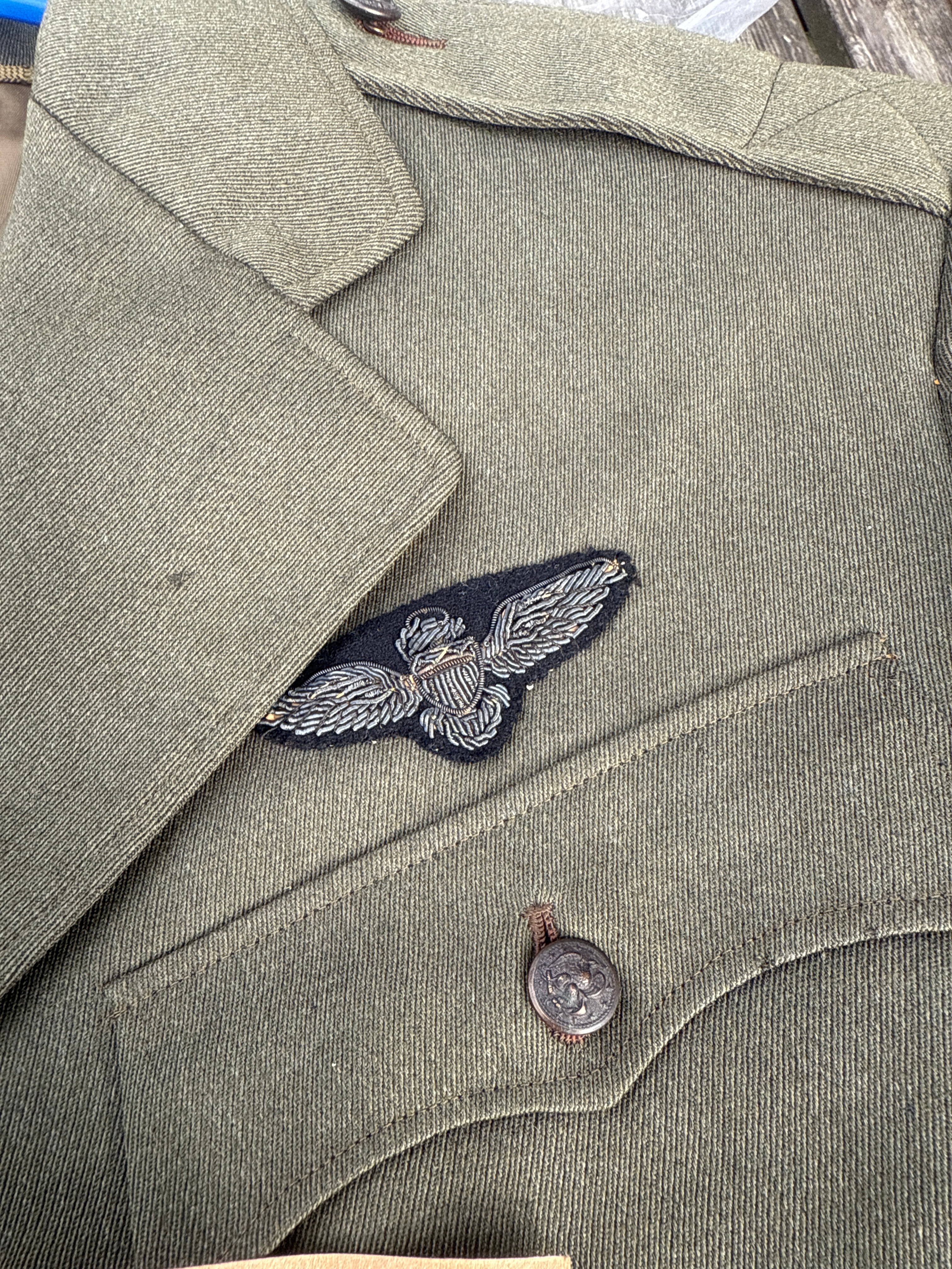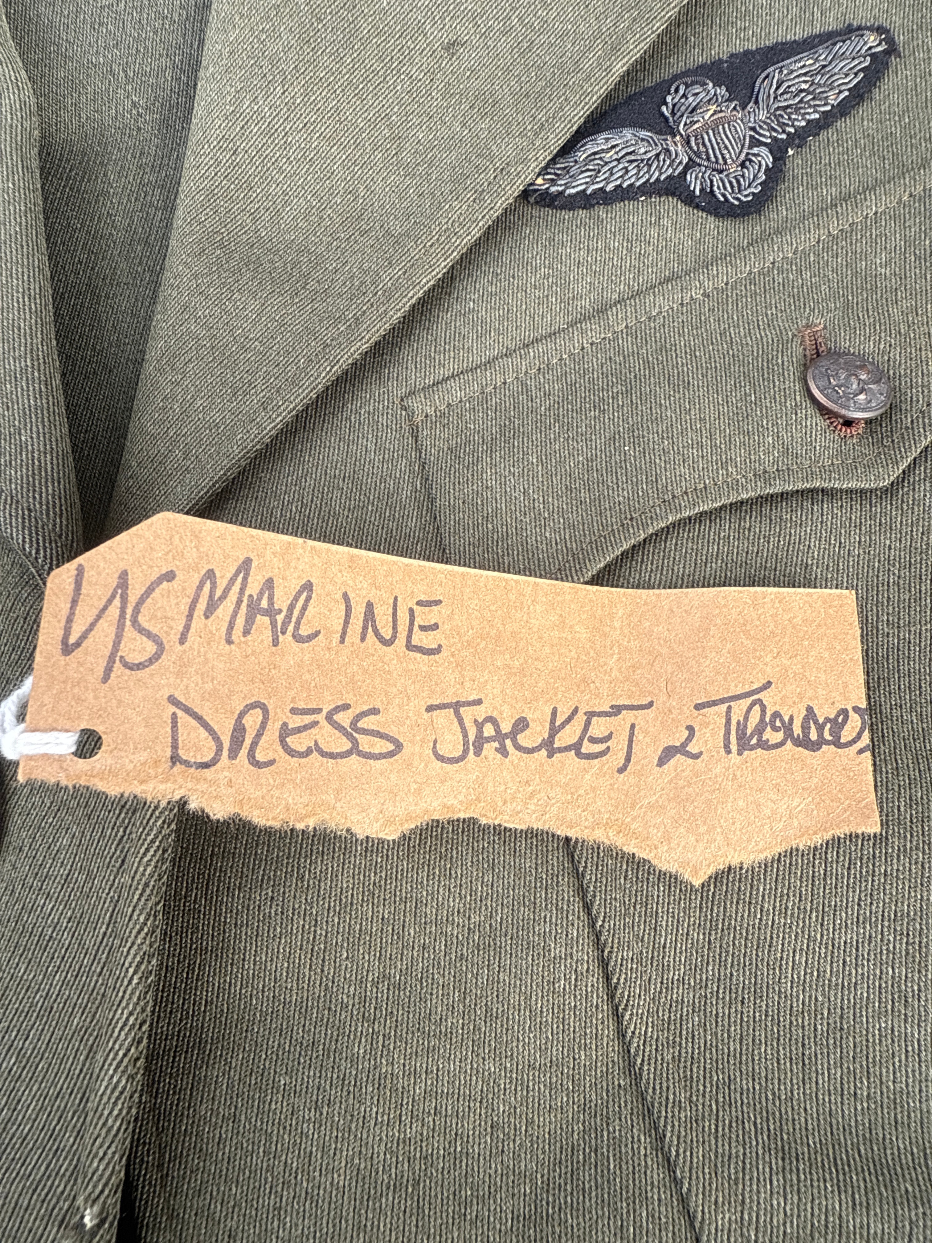 A WWII US Navy Lieutenant Aviation Green Uniform Jacket and Trousers with Bullion Wing. This lot comprises a vintage dress uniform set, consisting of an olive drab woven fabric jacket and matching trousers. The single-breasted jacket features four external flap pockets and epaulets, and is secured with US Marine Corps insignia buttons. Visible insignia includes an embroidered winged badge on the left breast pocket, consistent with a bullion aviation wing. On each cuff, two dark horizontal stripes with a five-pointed star above them typically denote the rank of Lieutenant Junior Grade in the US Navy. A handwritten fabric tag on the front identifies the items as “US MARINE DRESS JACKET & TROUSER.”