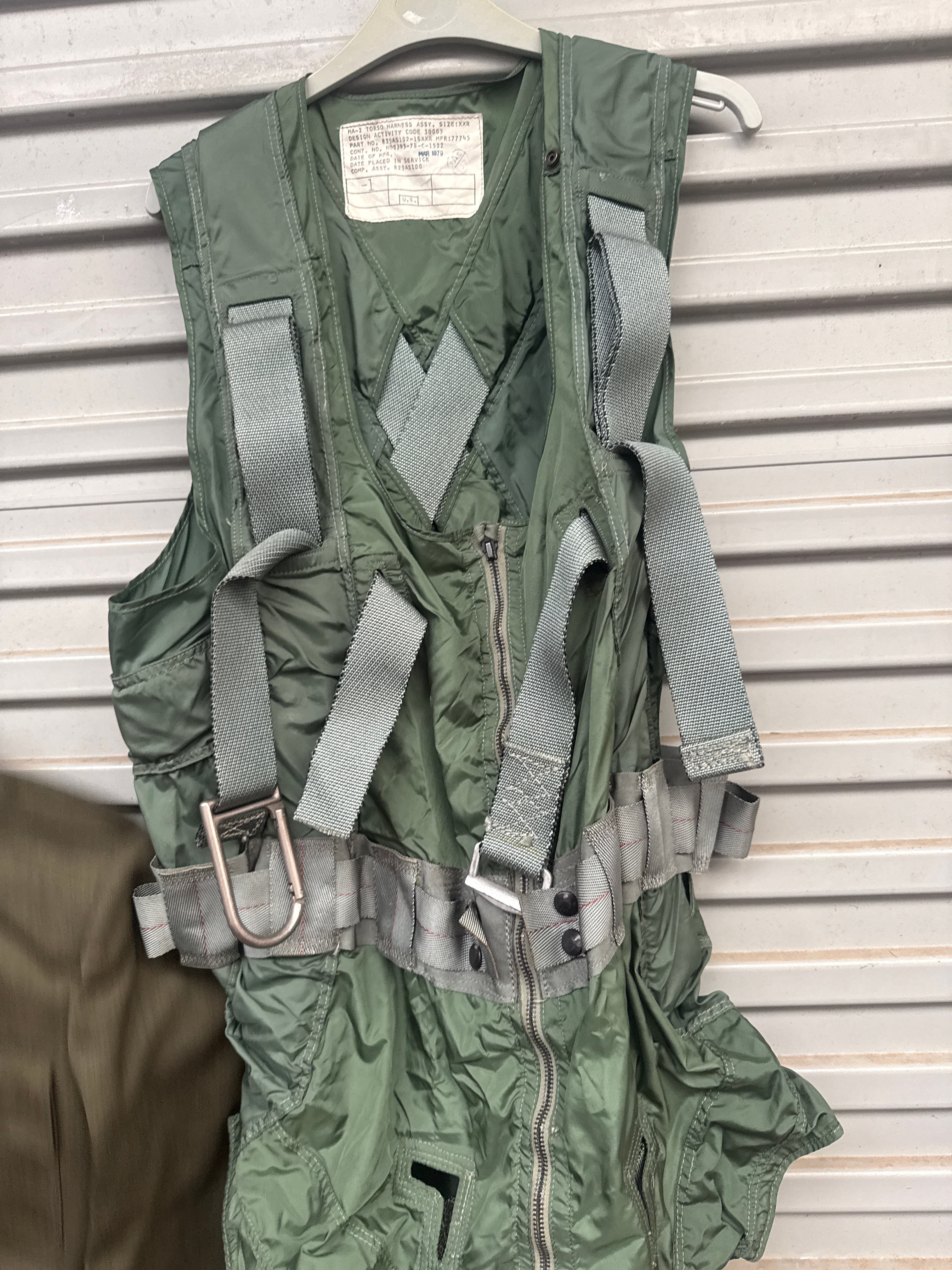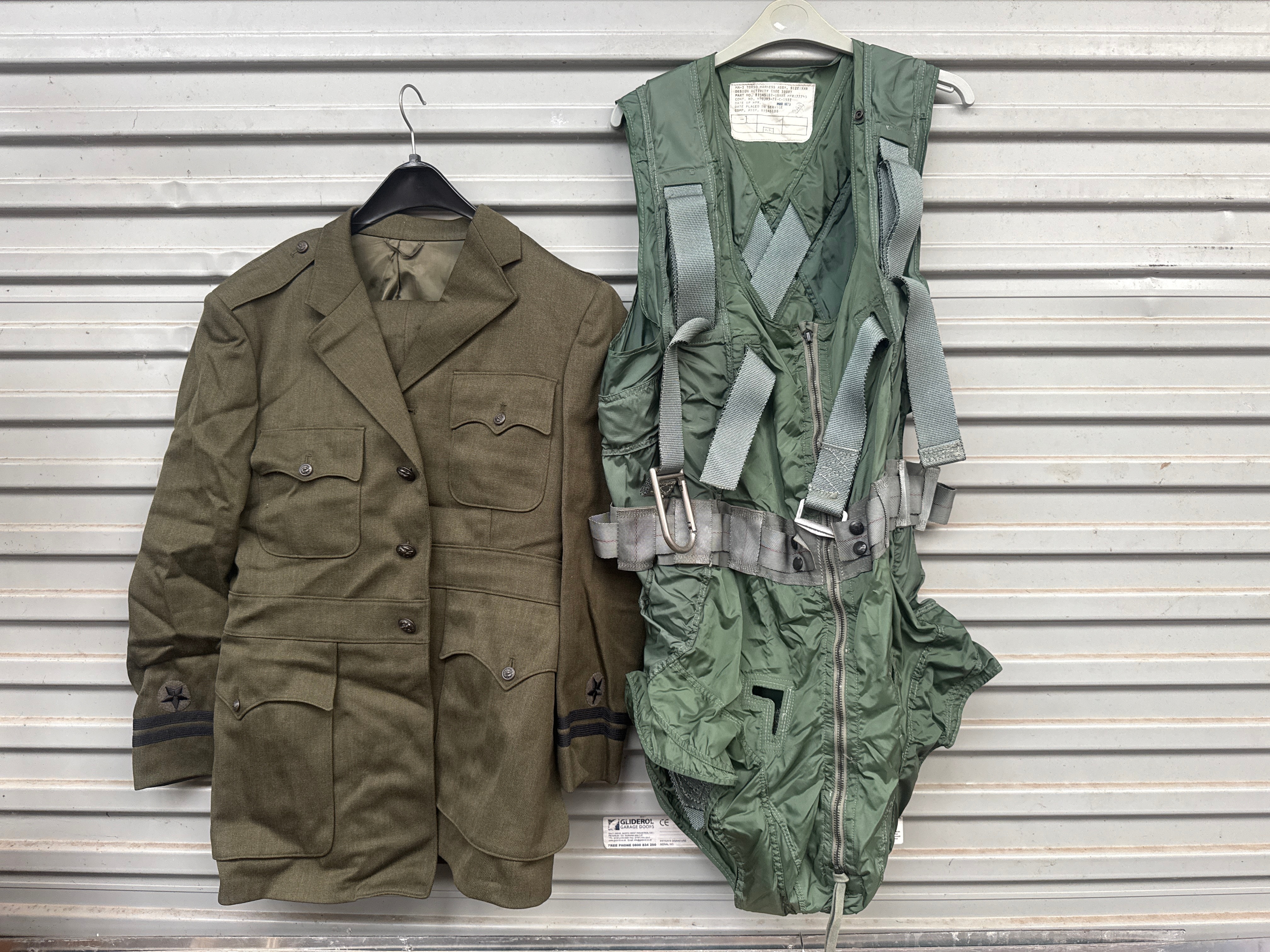 This lot comprises two military-related garments. The first is a vintage US Marine Corps uniform jacket, crafted from an olive drab wool-blend fabric. It features four button-flap pockets, notched lapels, and a button closure. The sleeves display rank insignia consisting of three thick and one thin stripe, along with two stars. The second item is a dark green synthetic aircrew survival vest, identified by a prominent white label as “VEST, SURVIVAL, AIRCREW, TYPE: SV-2B/P,” manufactured by GENTEX CORP. under “CONTRACT NO. DLA100-88-C-0604” (indicating a 1988 contract date), and specified as “SIZE: UNIVERSAL.” The vest is equipped with numerous grey webbing straps, metal buckles, and D-rings, a front zipper, and multiple pockets.