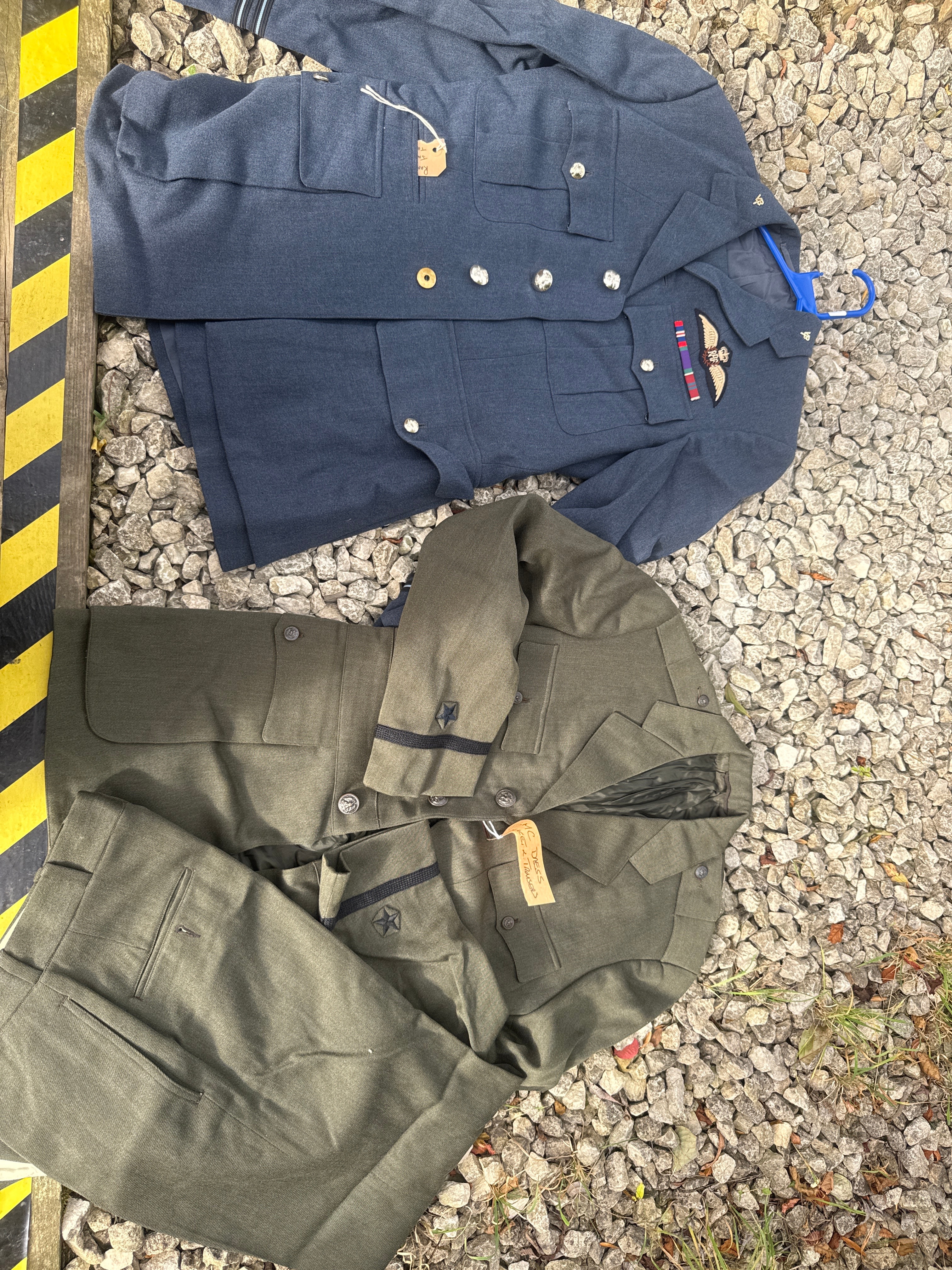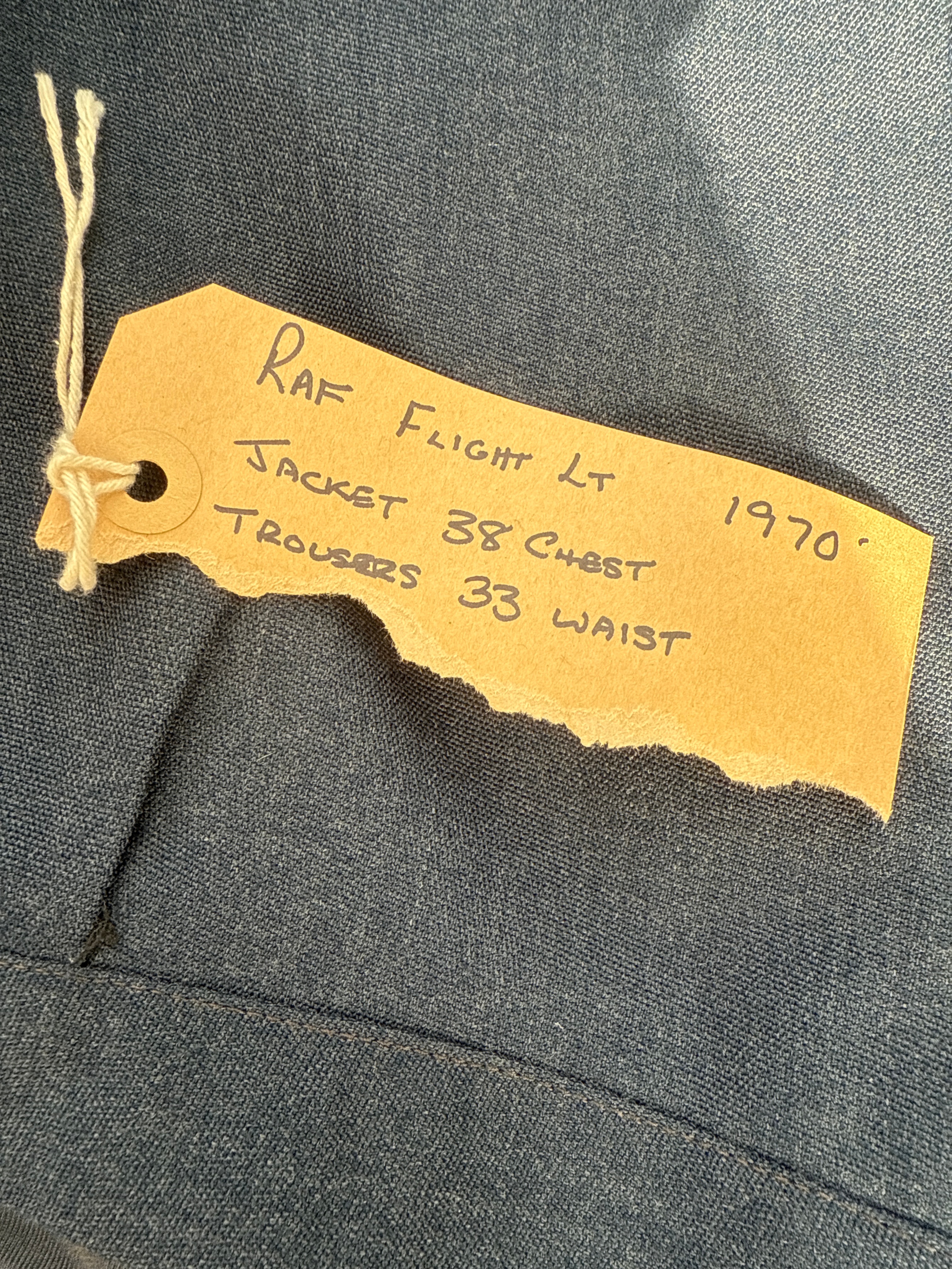 Also included is a Royal Air Force (RAF) Flight Lieutenant’s service dress jacket, circa 1970. This blue jacket features gold-toned buttons, a pilot’s wings badge, a multi-ribbon bar, and three rank stripes on the sleeves. An attached tag specifies ‘RAF FLIGHT LT’, ‘JACKET 38 CHEST’, and ‘TROUSERS 33 WAIST’.