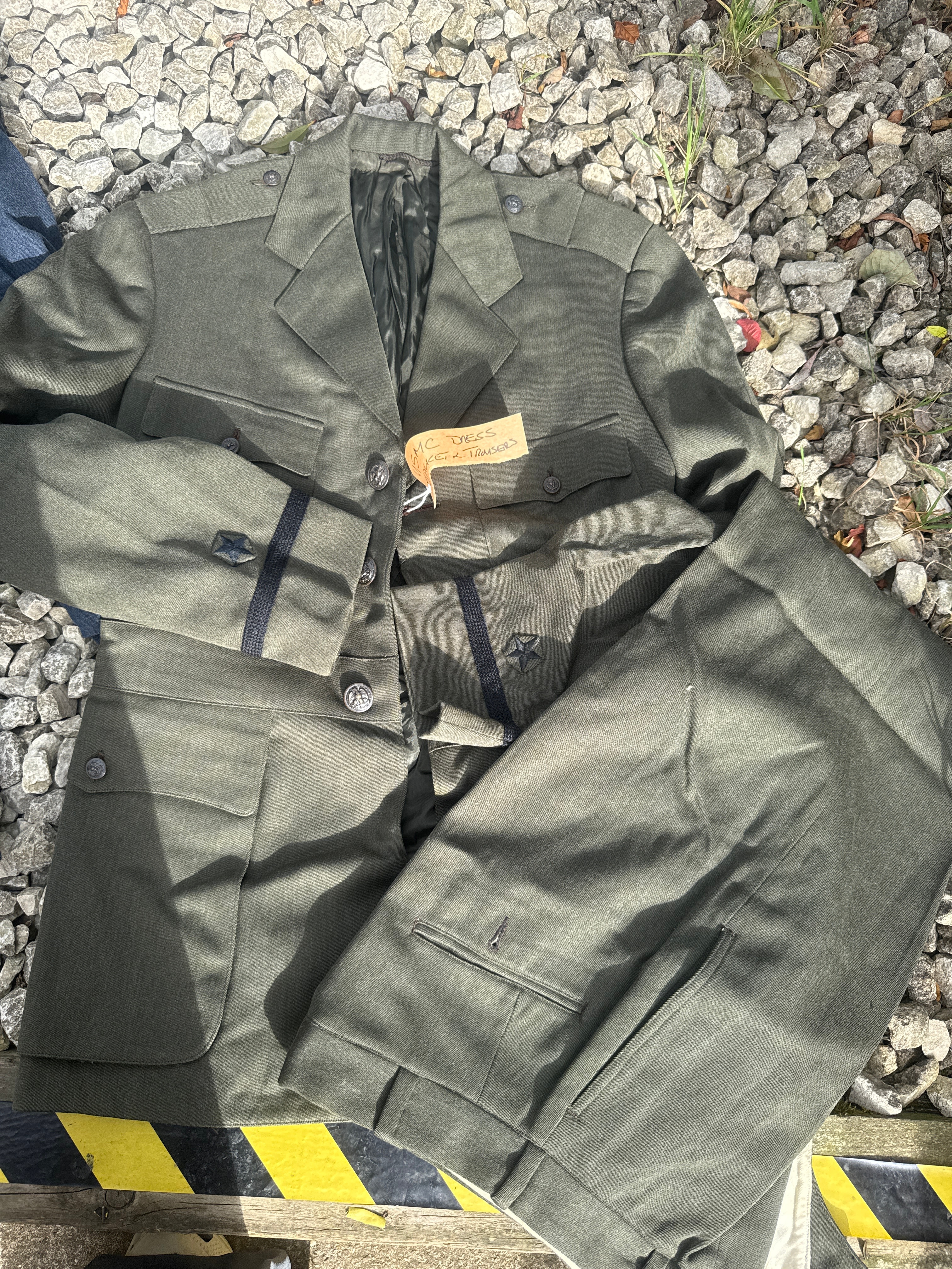 A US Marine Corps Green Dress Uniform, comprising a jacket and matching trousers. The jacket features dark buttons, starburst collar pins, and multiple dark rank stripes on the sleeves. An attached tag identifies this uniform as ‘US MAC Dress Jacket Trousers’.