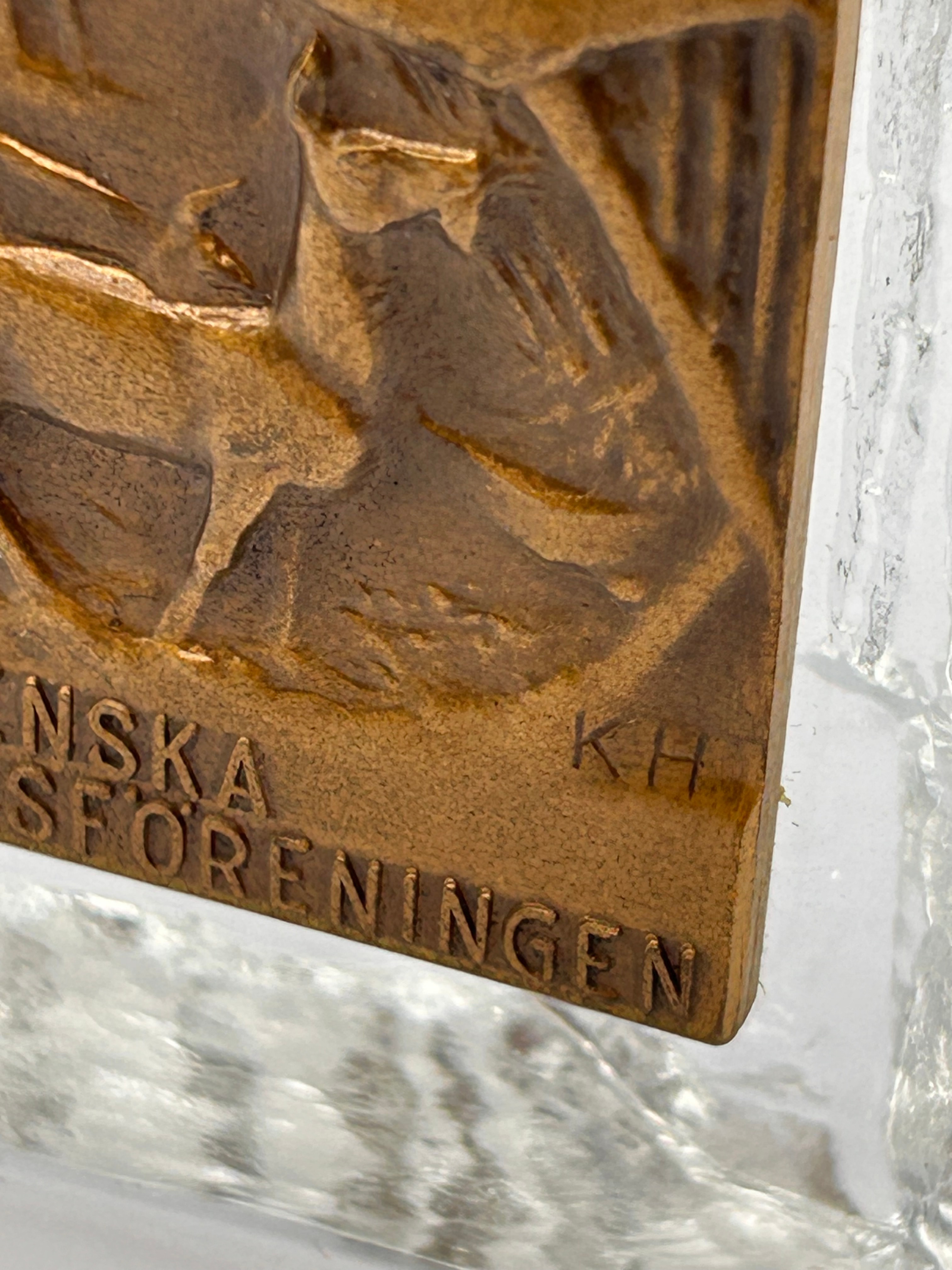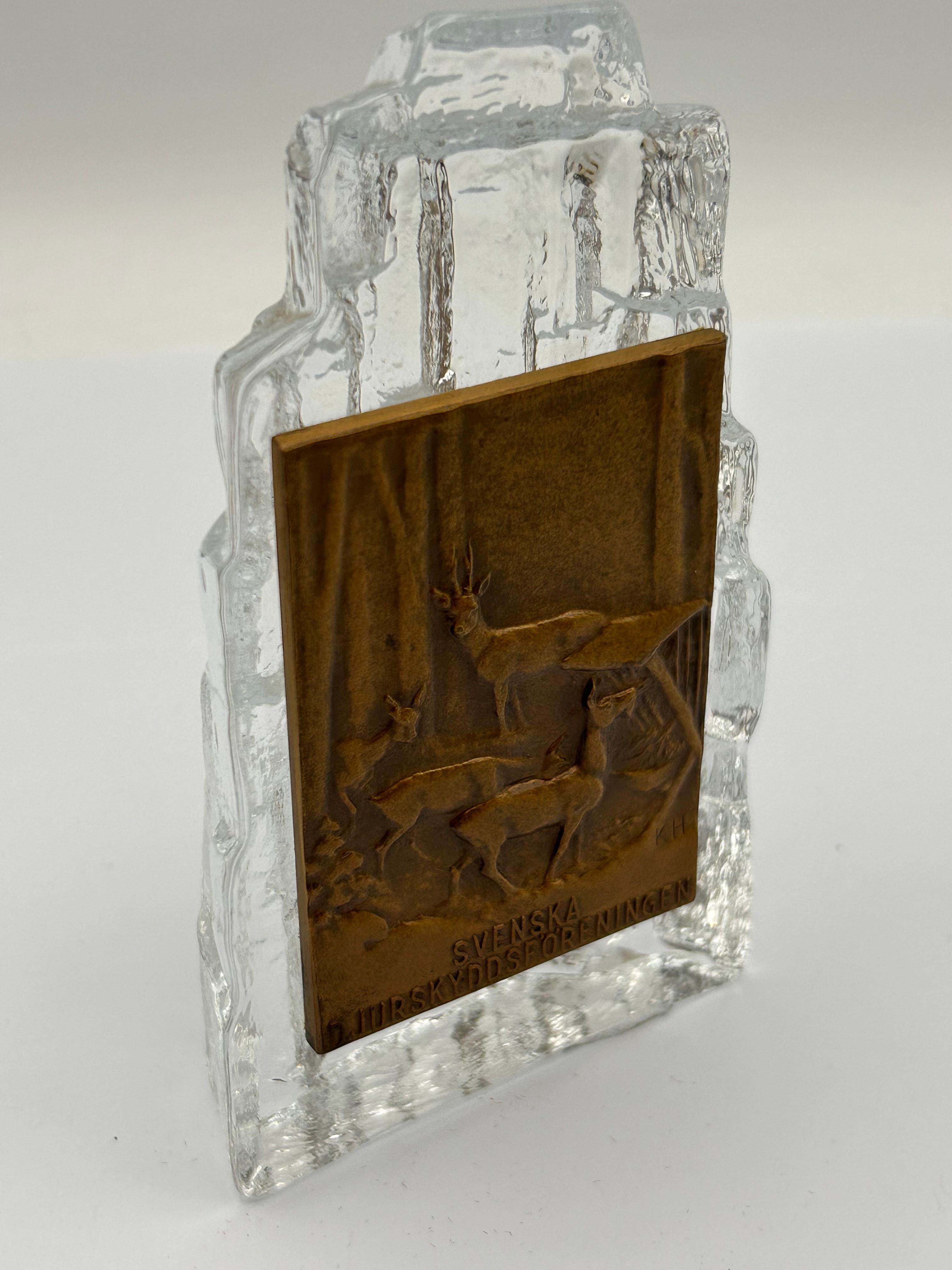 A modern commemorative plaque or award, featuring a textured, clear ‘ice glass’ block serving as a stand for an embedded rectangular bronze-toned metal relief. The metal plaque depicts a group of deer in a forested landscape. Inscribed along the bottom edge of the plaque are the words “SVENSKA DJURSKYDDSFÖRENINGEN” (Swedish Animal Protection Association), alongside the initials “K.H.” This piece exemplifies the Scandinavian art glass tradition, often referred to as ‘ice glass’ or ‘ice block’ designs, popular in Sweden.