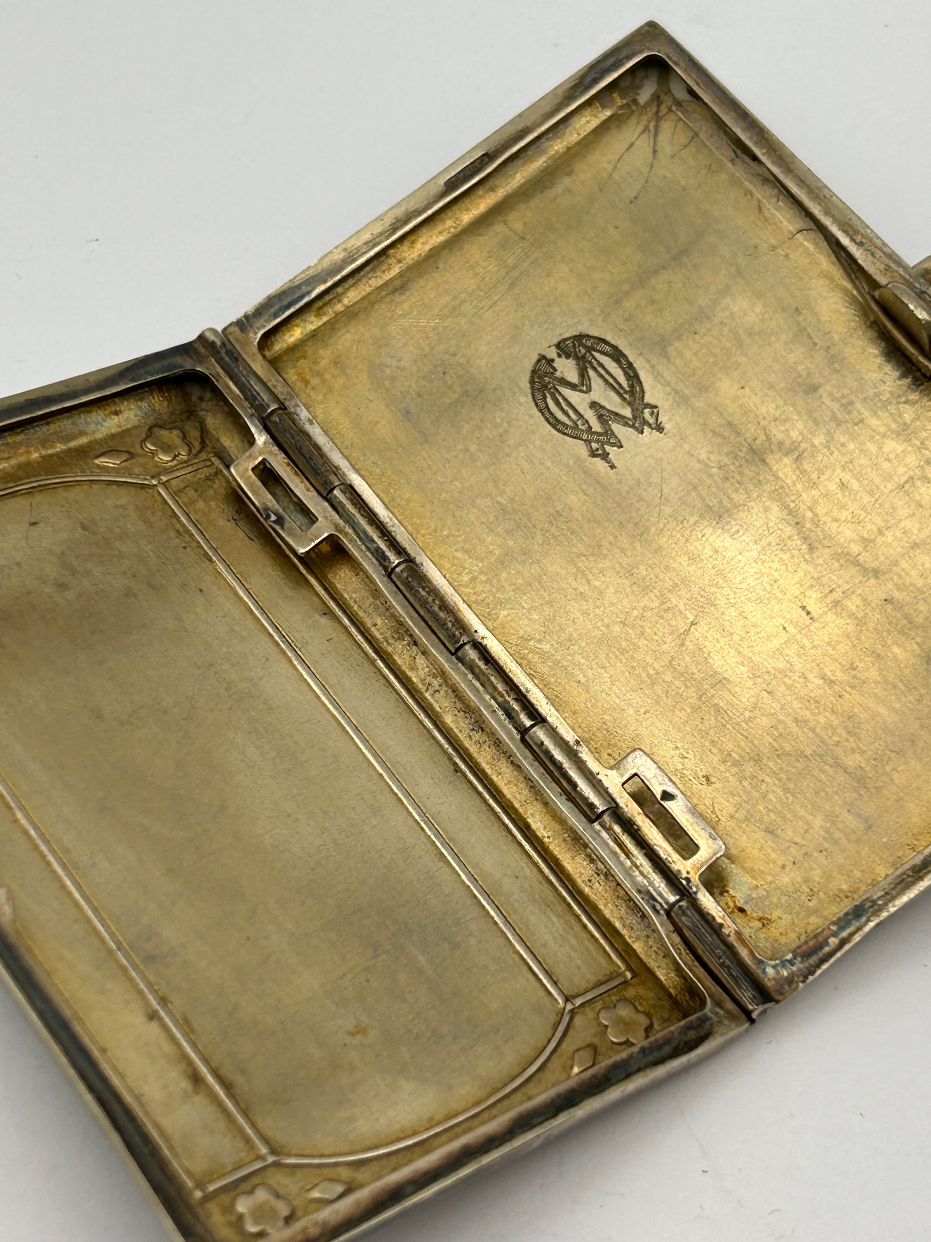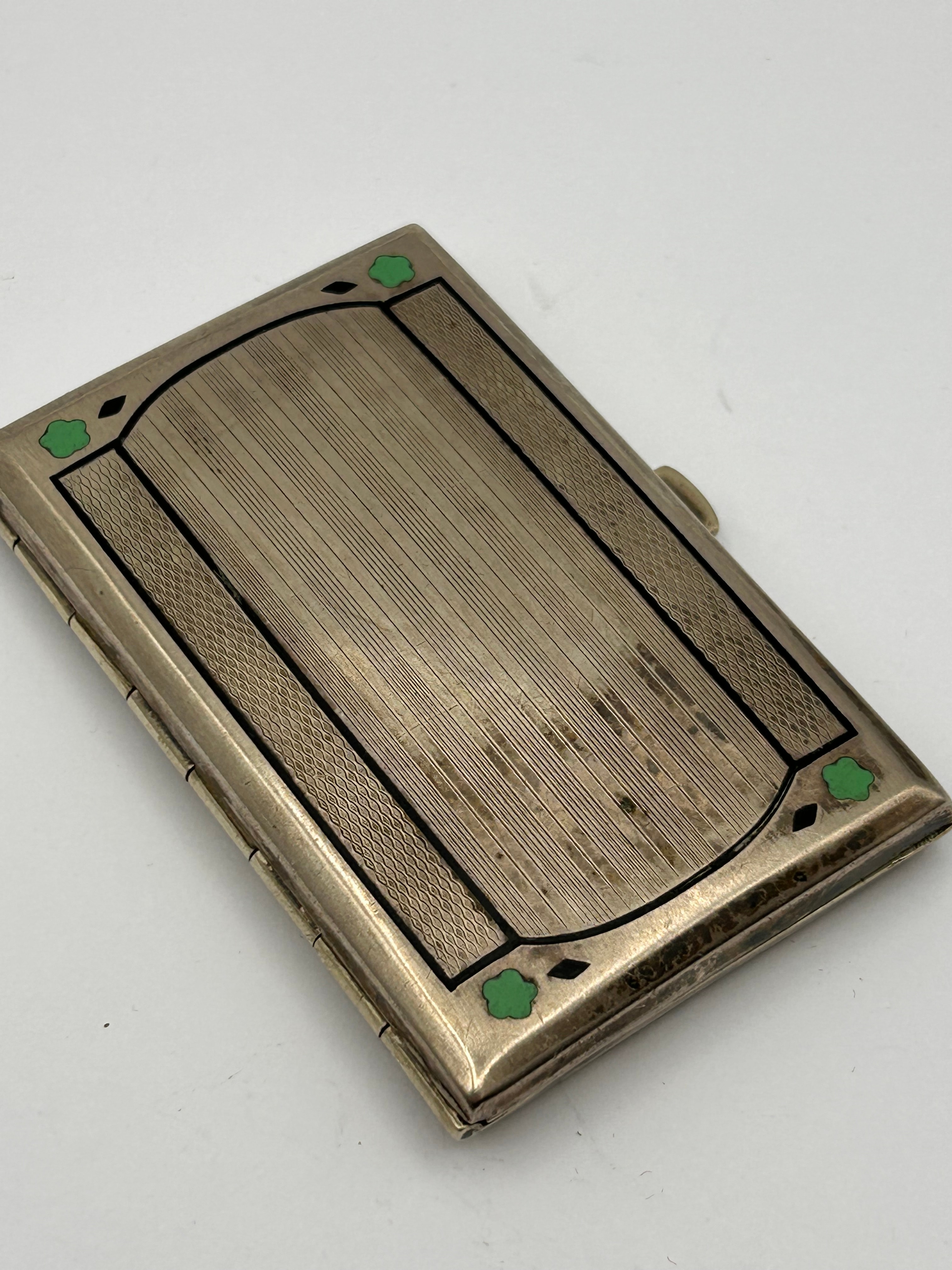 An Art Deco silver-toned metal cigarette case, dating from the early 20th century, circa 1920s-1930s. The rectangular case is adorned with geometric black and green enamel designs. The exterior features a central panel with fine horizontal ridging, framed by black enamel lines and accented with four green enamel trefoil-like corner motifs. The interior appears gilt and contains a stamped stylized monogram, possibly two intertwined ‘M’s, on the right panel.
