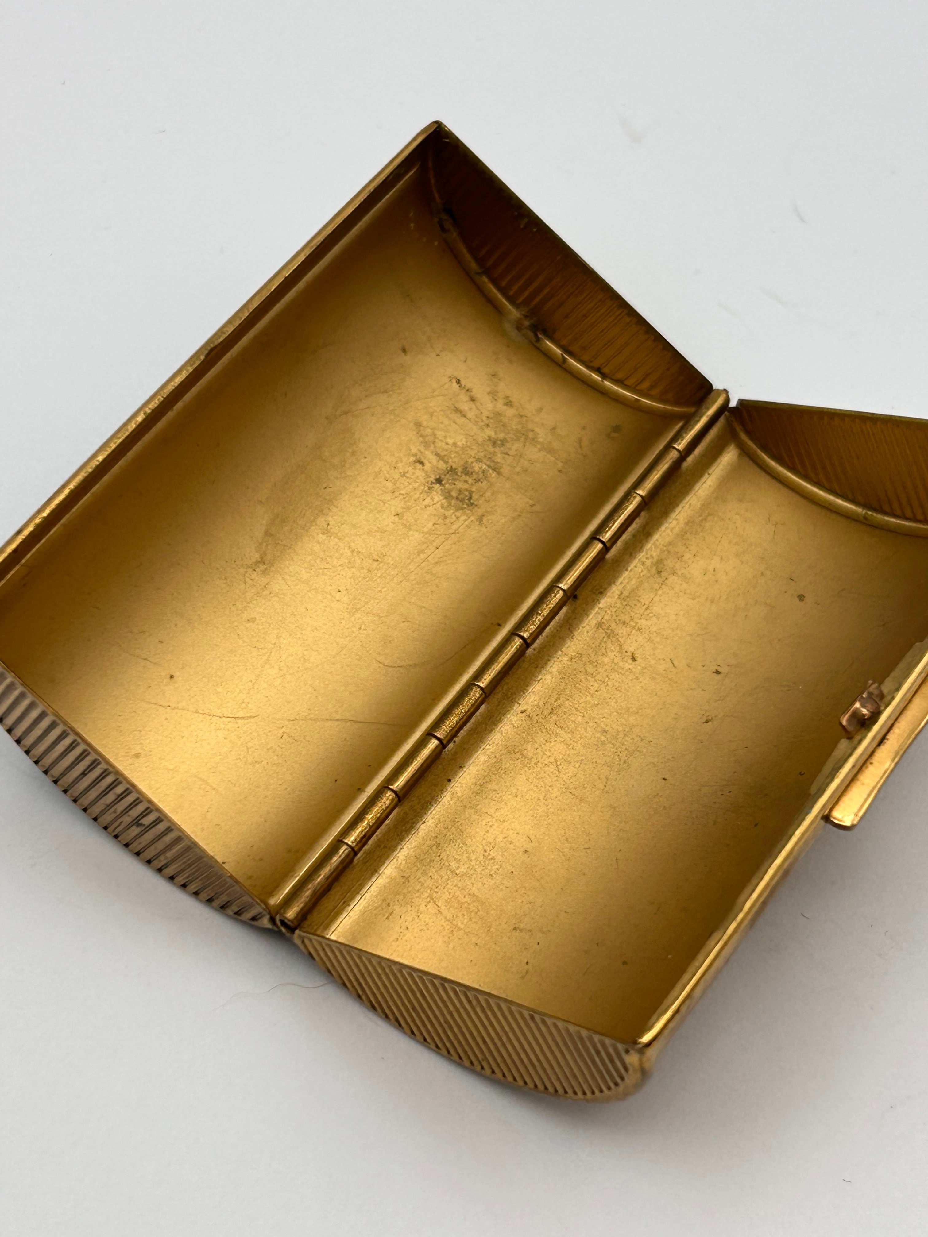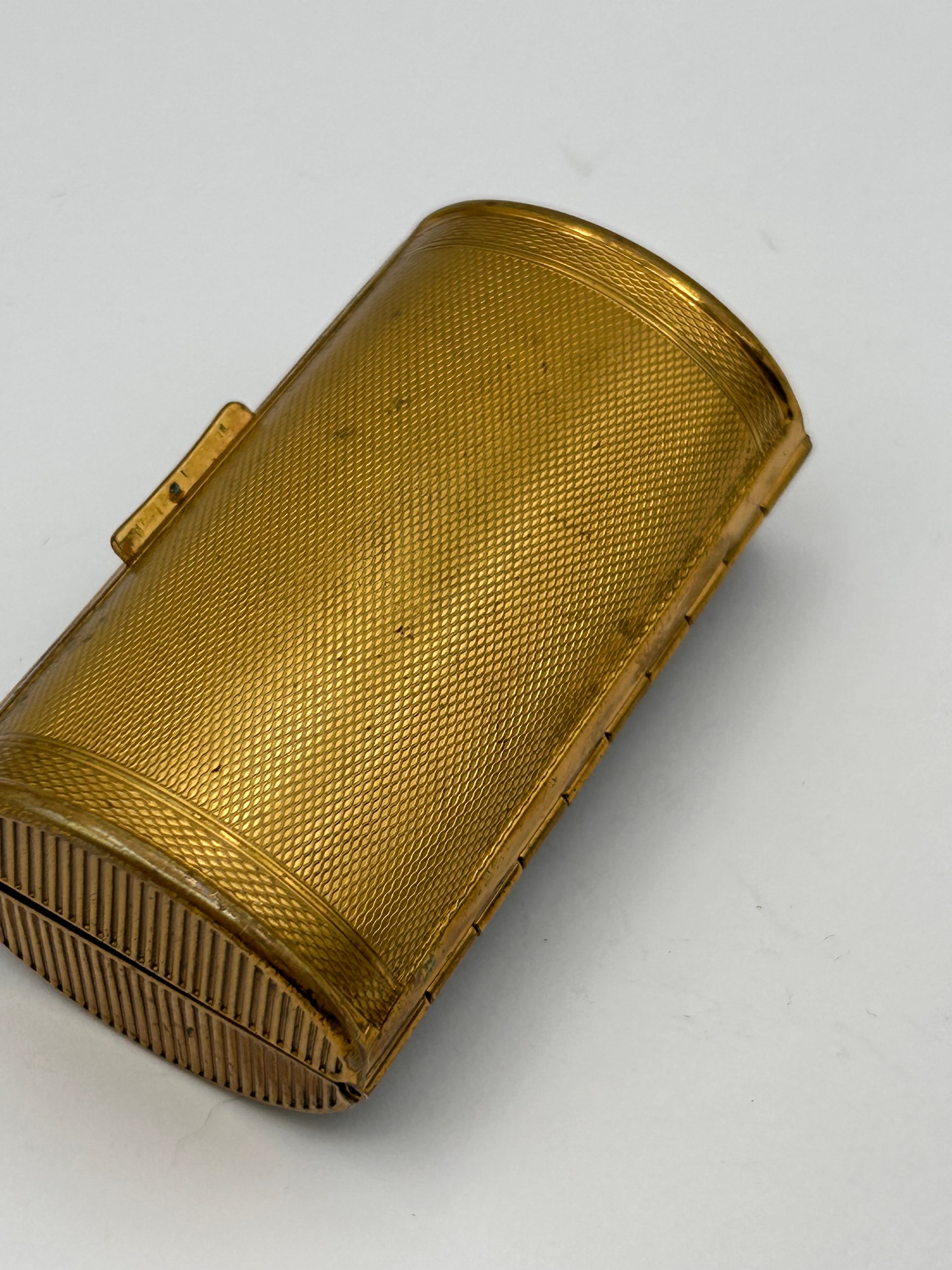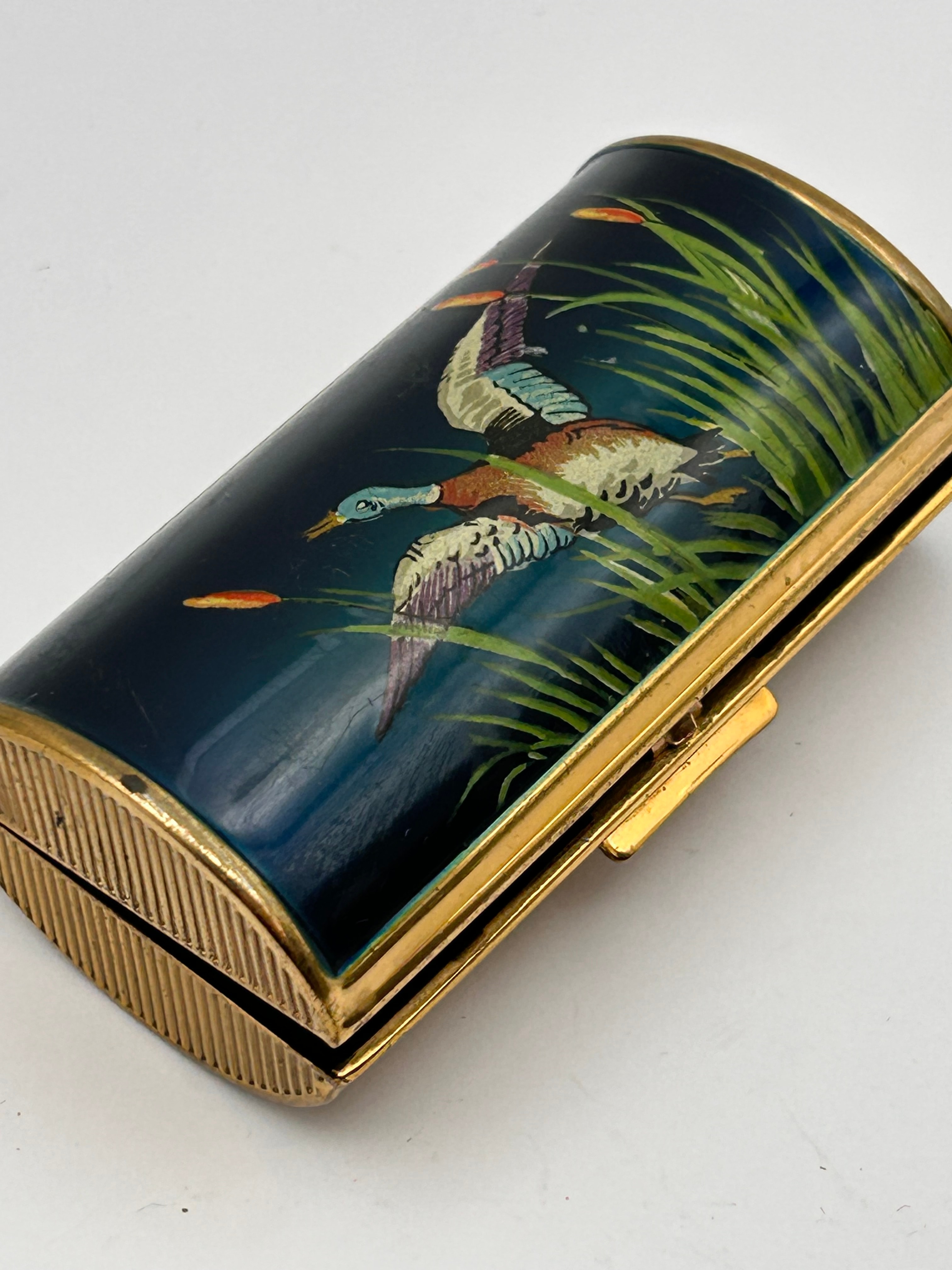 A Kigu vintage barrel-shaped hinged case, likely functioning as a cigarette case or lipstick holder. The top surface features a dark blue enamel or painted panel depicting two flying ducks amidst green reeds with orange tips. The sides and bottom are adorned with a fine engine-turned cross-hatch pattern, complemented by vertically ribbed ends. Constructed from gilt brass or a similar gold-toned metal.