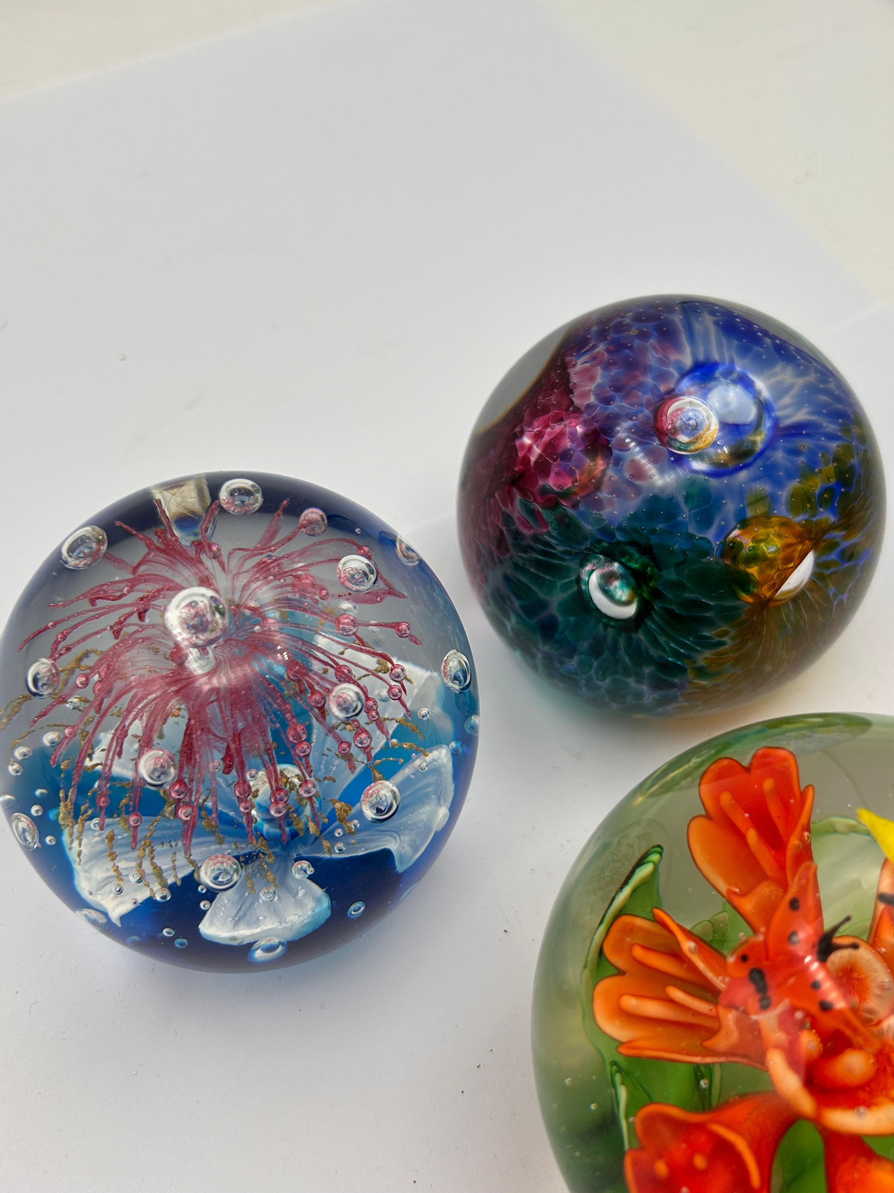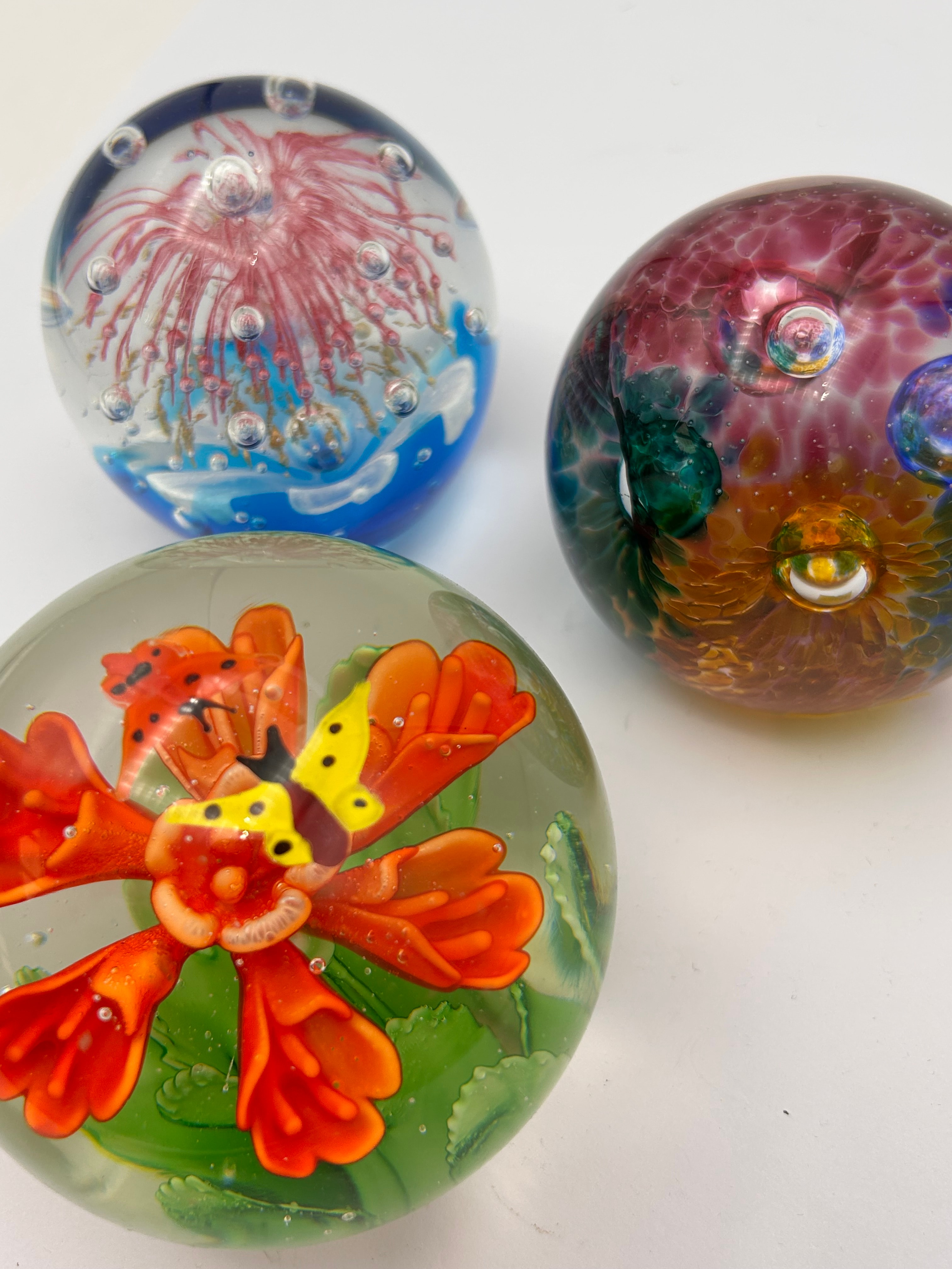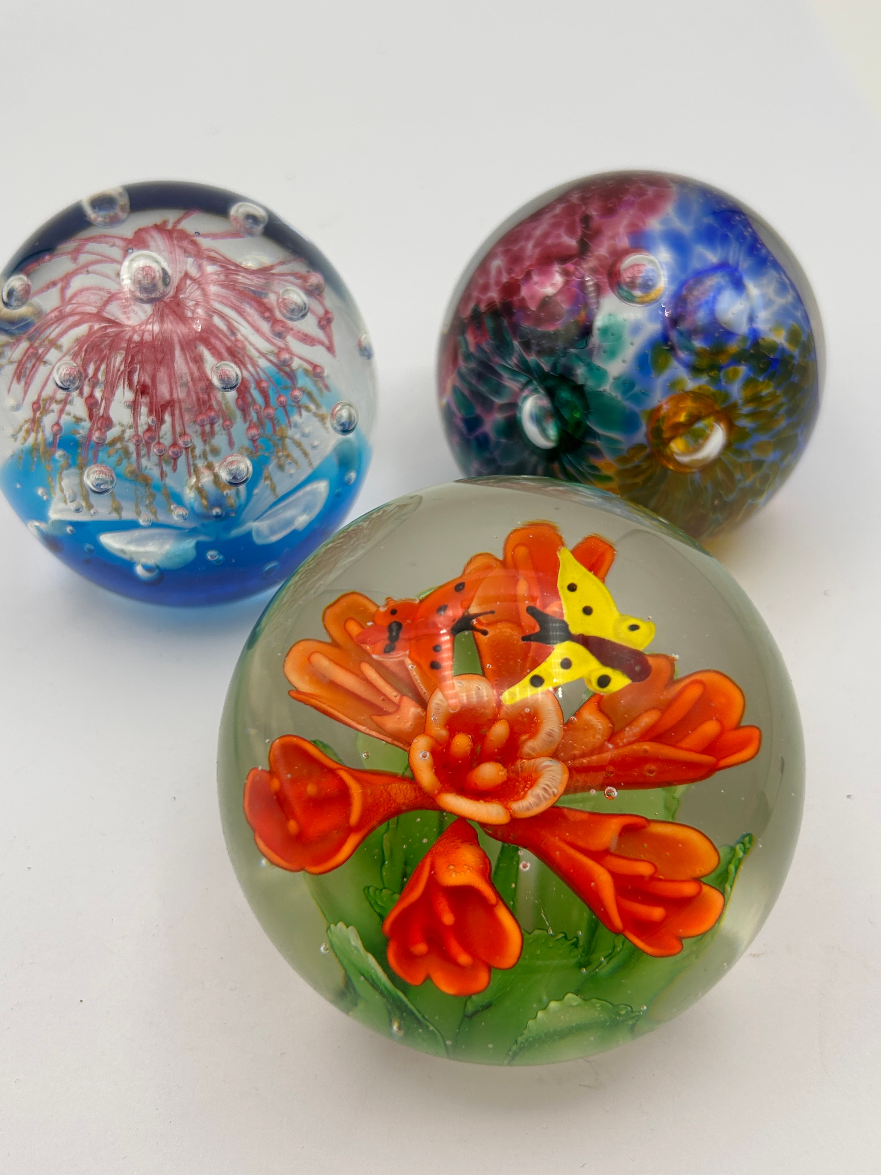A group of three spherical studio art glass paperweights. The foreground item is a clear glass sphere encasing an elaborate lampwork design of an orange-red flower with green leaves and a yellow spotted butterfly, accented with internal controlled bubbles. To the left rear, a clear glass sphere presents an abstract composition with a blue base, white elements, and a vibrant pink/red explosion-like or jellyfish form, also containing numerous internal bubbles. The paperweight on the right rear displays a multi-colored abstract swirl pattern in translucent glass, incorporating shades of blue, purple, green, and orange with several larger internal bubbles.
