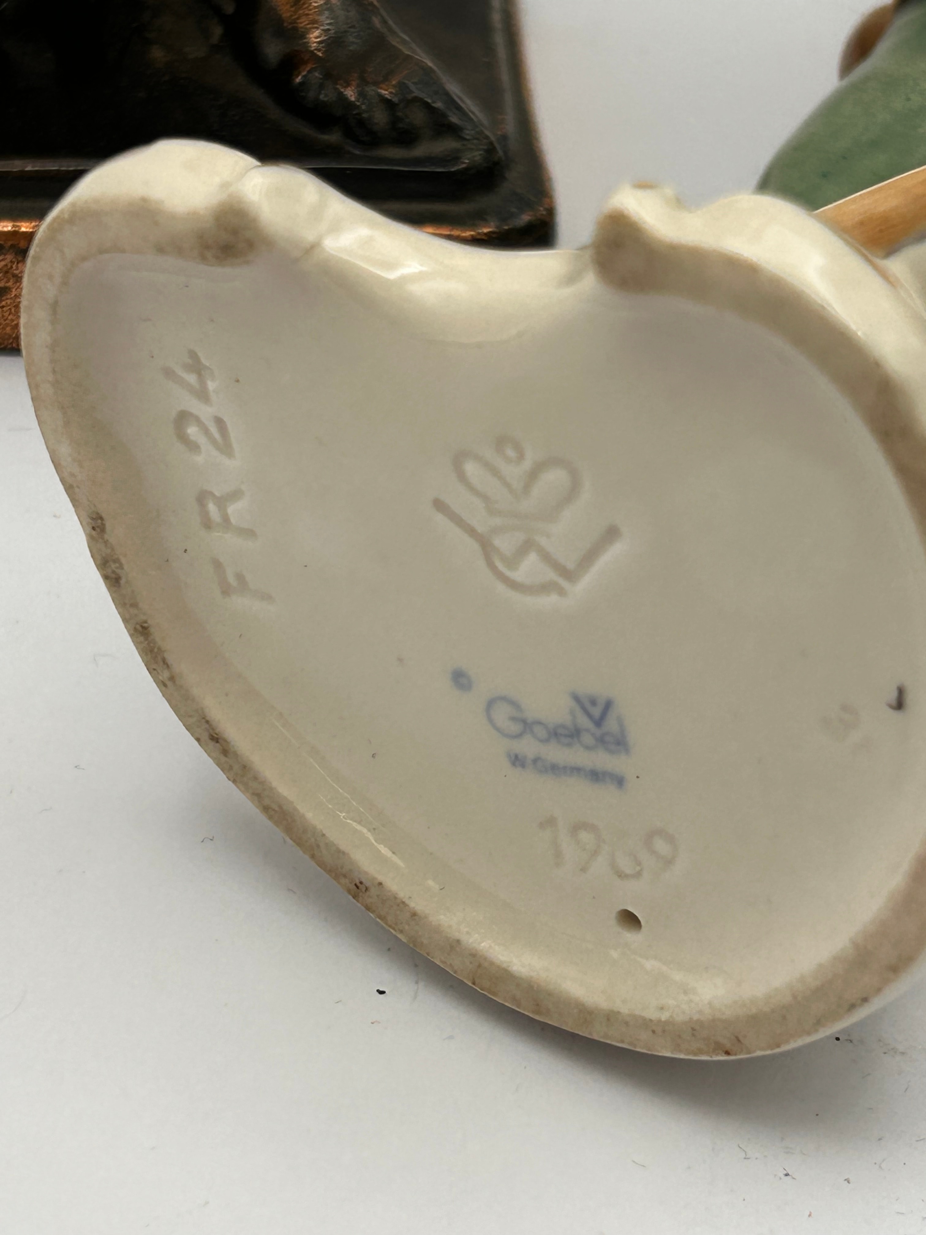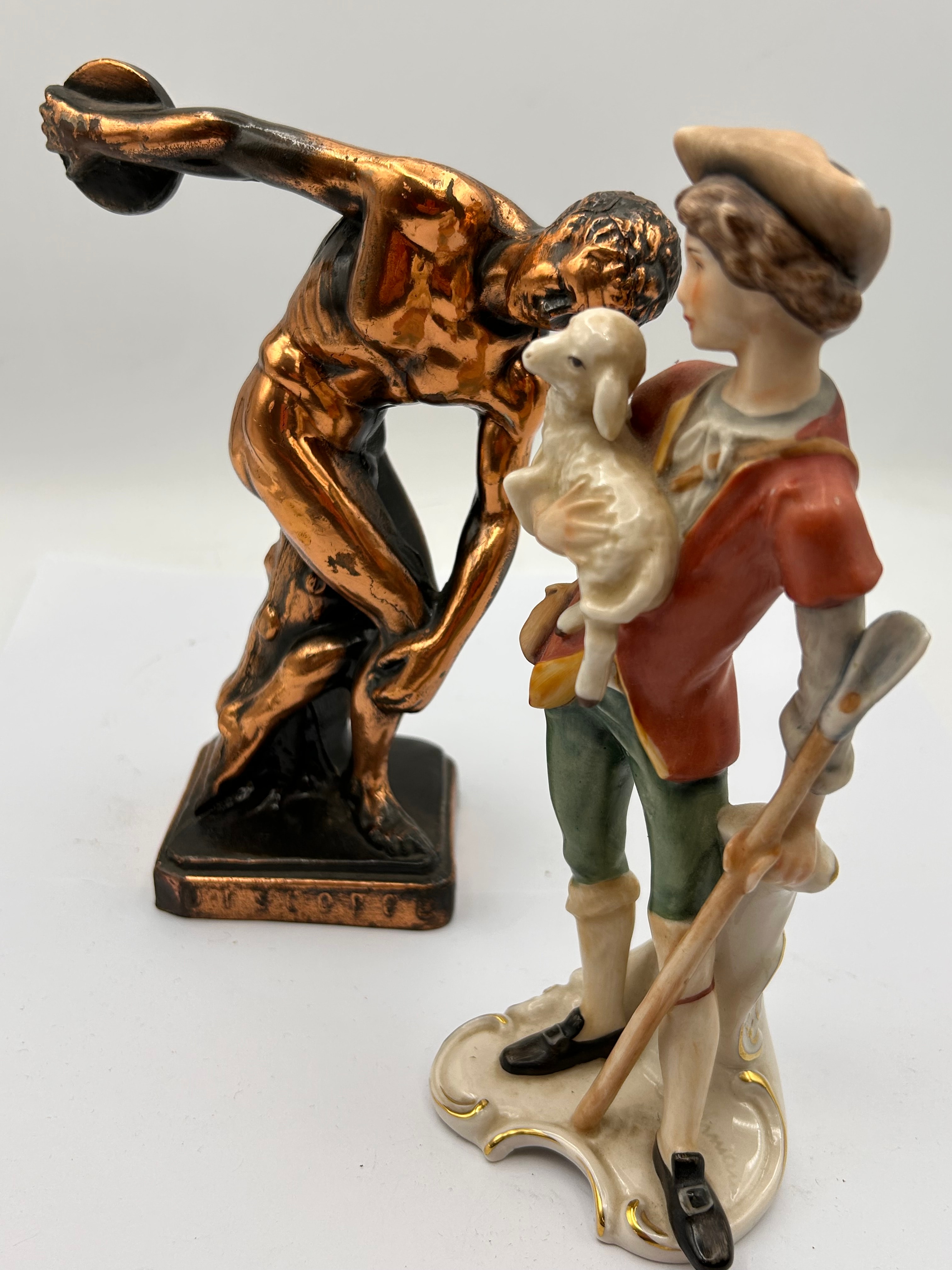 A Goebel porcelain figurine, model FR24, depicting a young male shepherd holding a lamb and a staff. The hand-painted glazed figurine stands on an ornate base with gilded accents. The underside is marked ‘FR 24’, with a blue Goebel mark, ‘W Germany’, a stylized M.I. Hummel bee mark, and dated ‘1969’. Accompanying this is a metallic bronze-toned statue of the Discobolus, depicting a classical athlete in mid-throw. The statue is inscribed ‘DISCOBOLUS’ on its dark rectangular base.