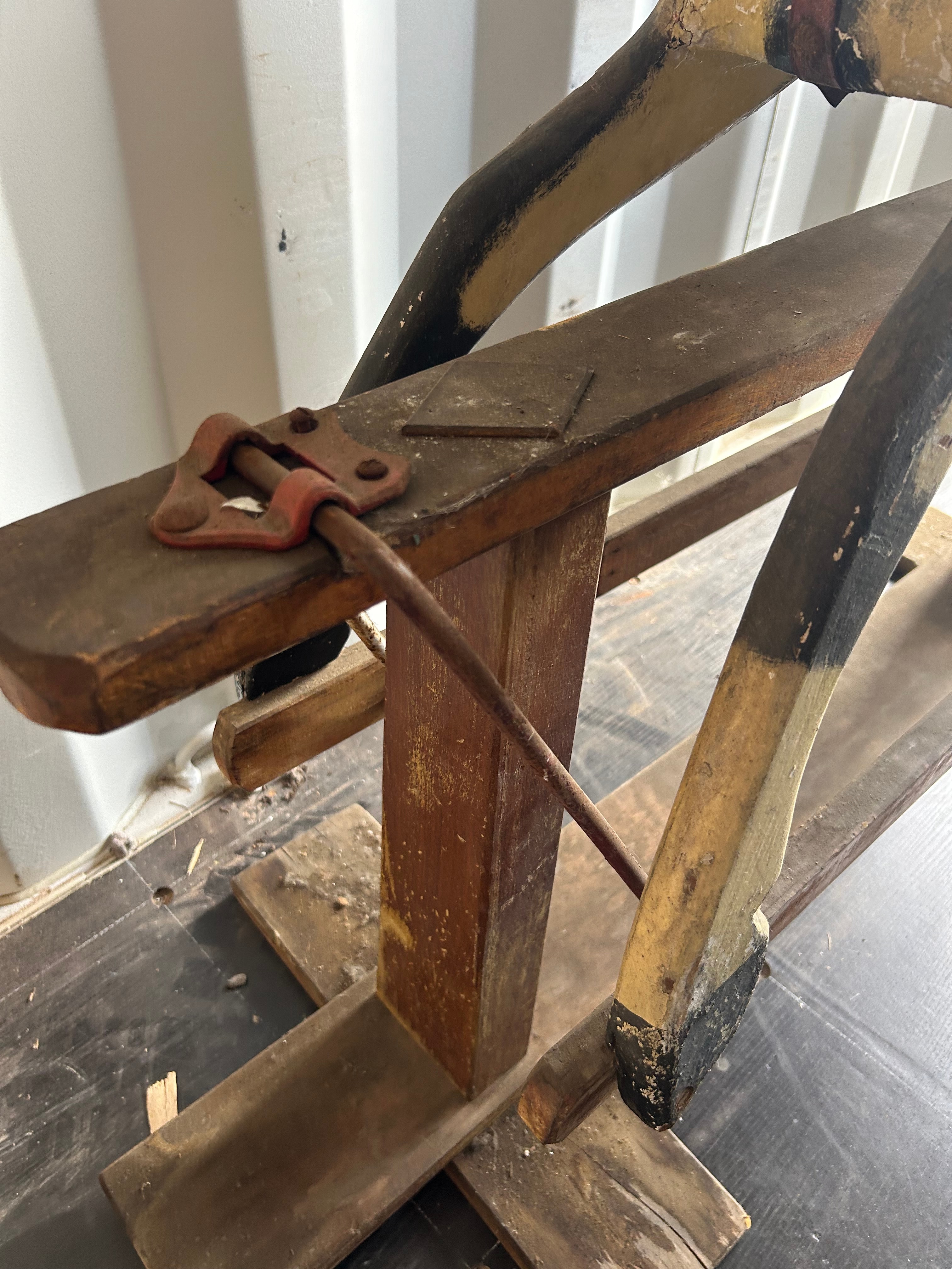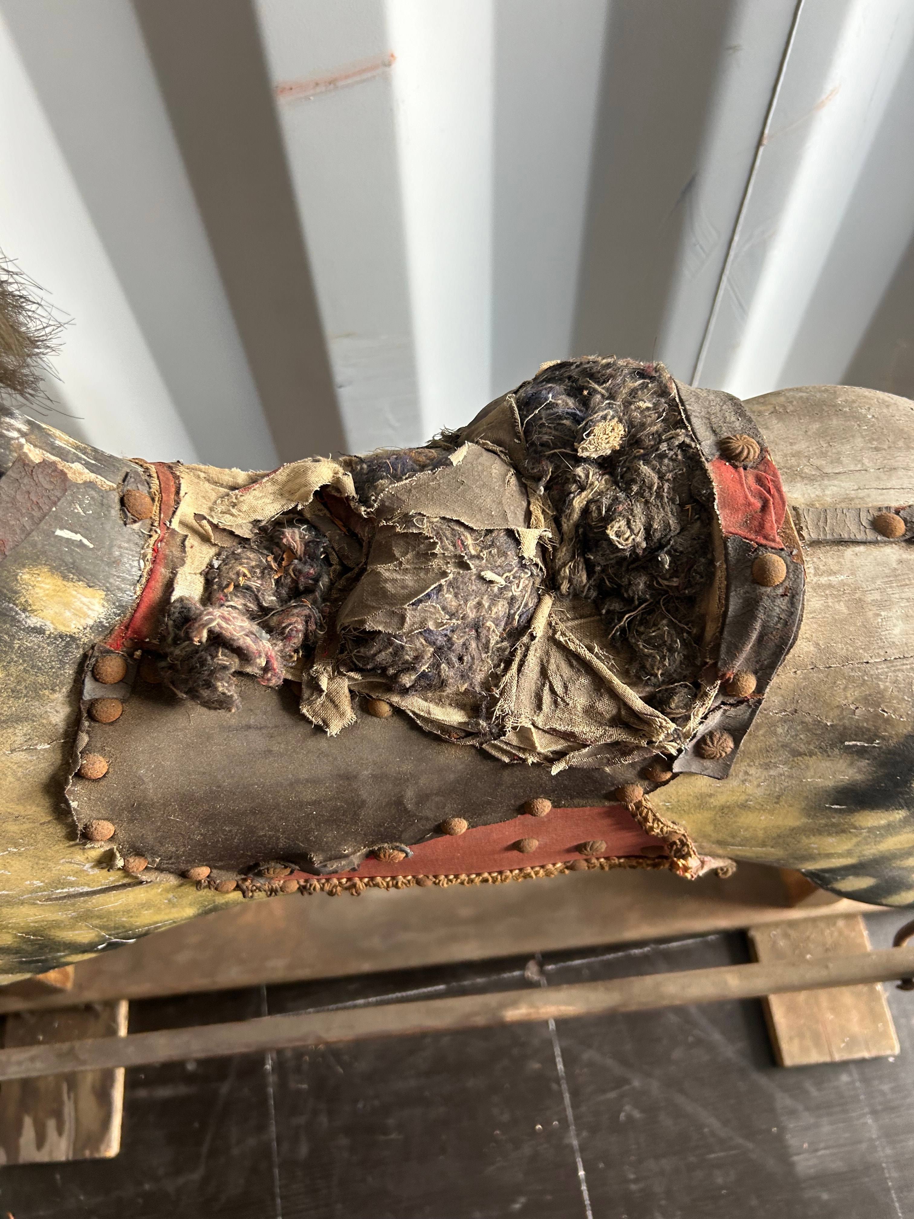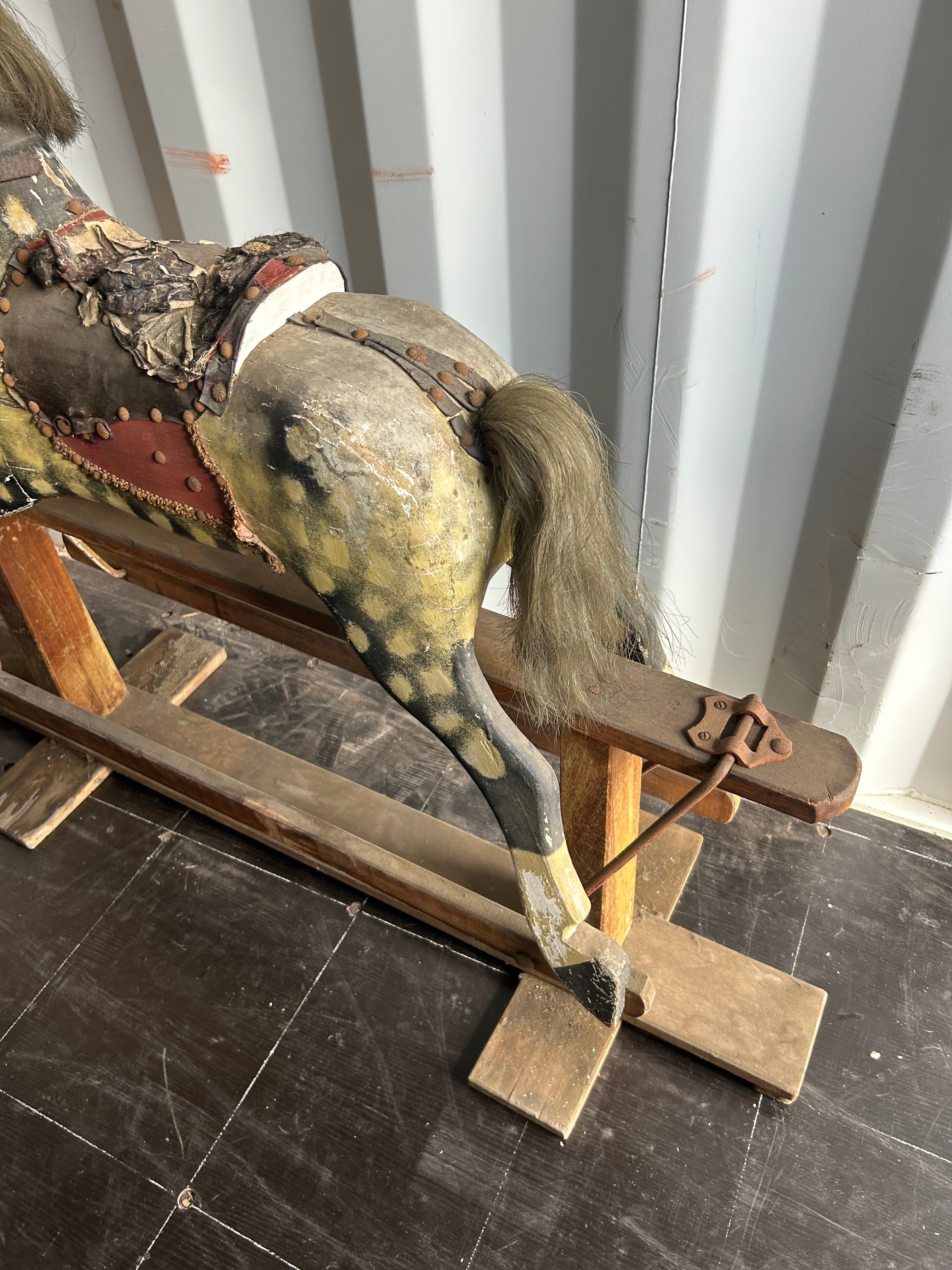 An antique painted wooden rocking horse, likely constructed from wood with a gessoed and painted finish, mounted on a wooden swing stand. The horse features a dapple pattern in yellow, black, and cream, a natural fiber mane and tail, and is outfitted with a studded leather or fabric saddle and bridle. No discernible text or maker’s marks are visible.