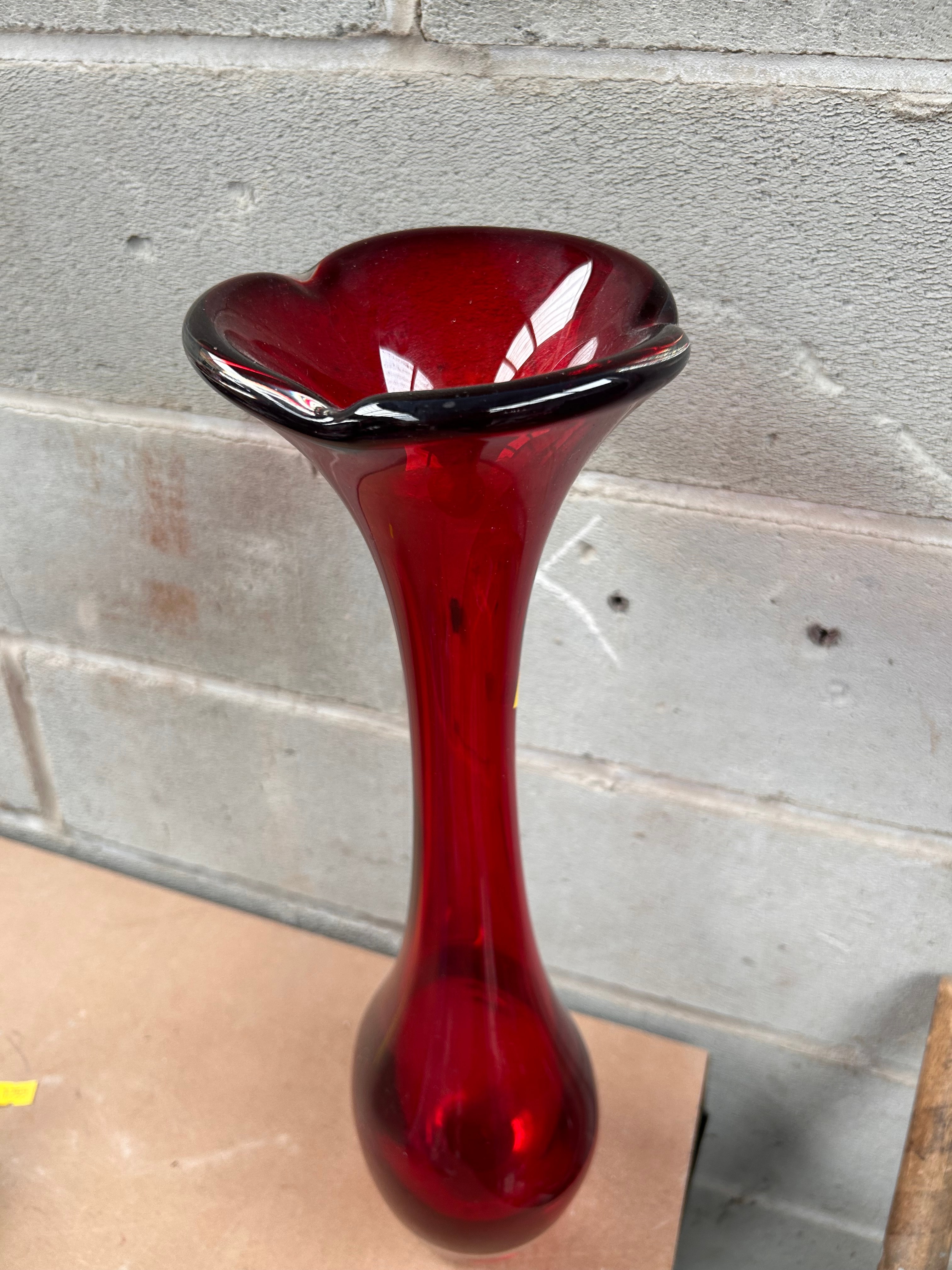 A tall, trumpet-shaped vase crafted from transparent ruby red blown glass. It features a wide, undulating or ruffled rim with a distinct darker, possibly black, applied edge, and a clear glass base. The form is characteristic of mid-20th century design.