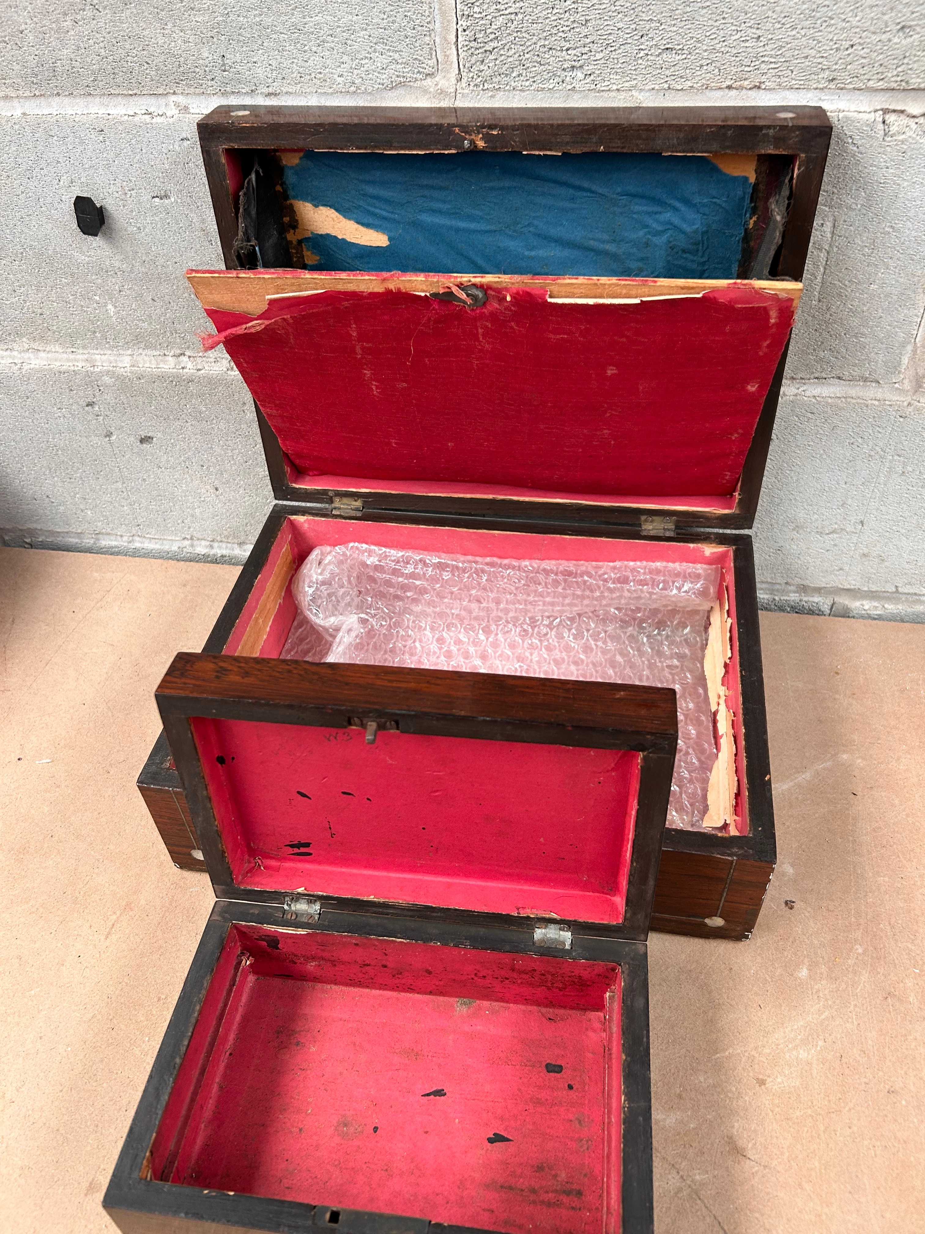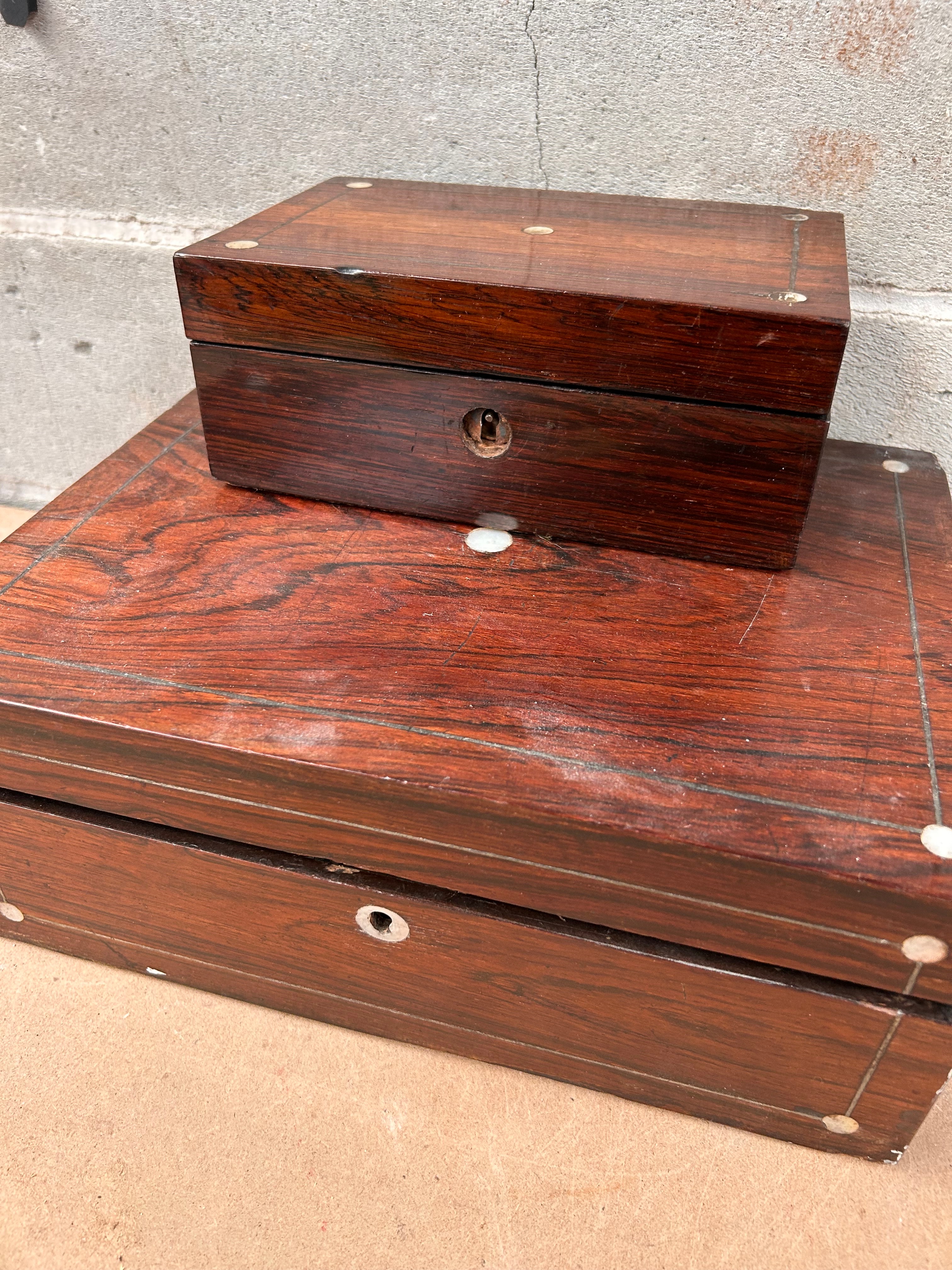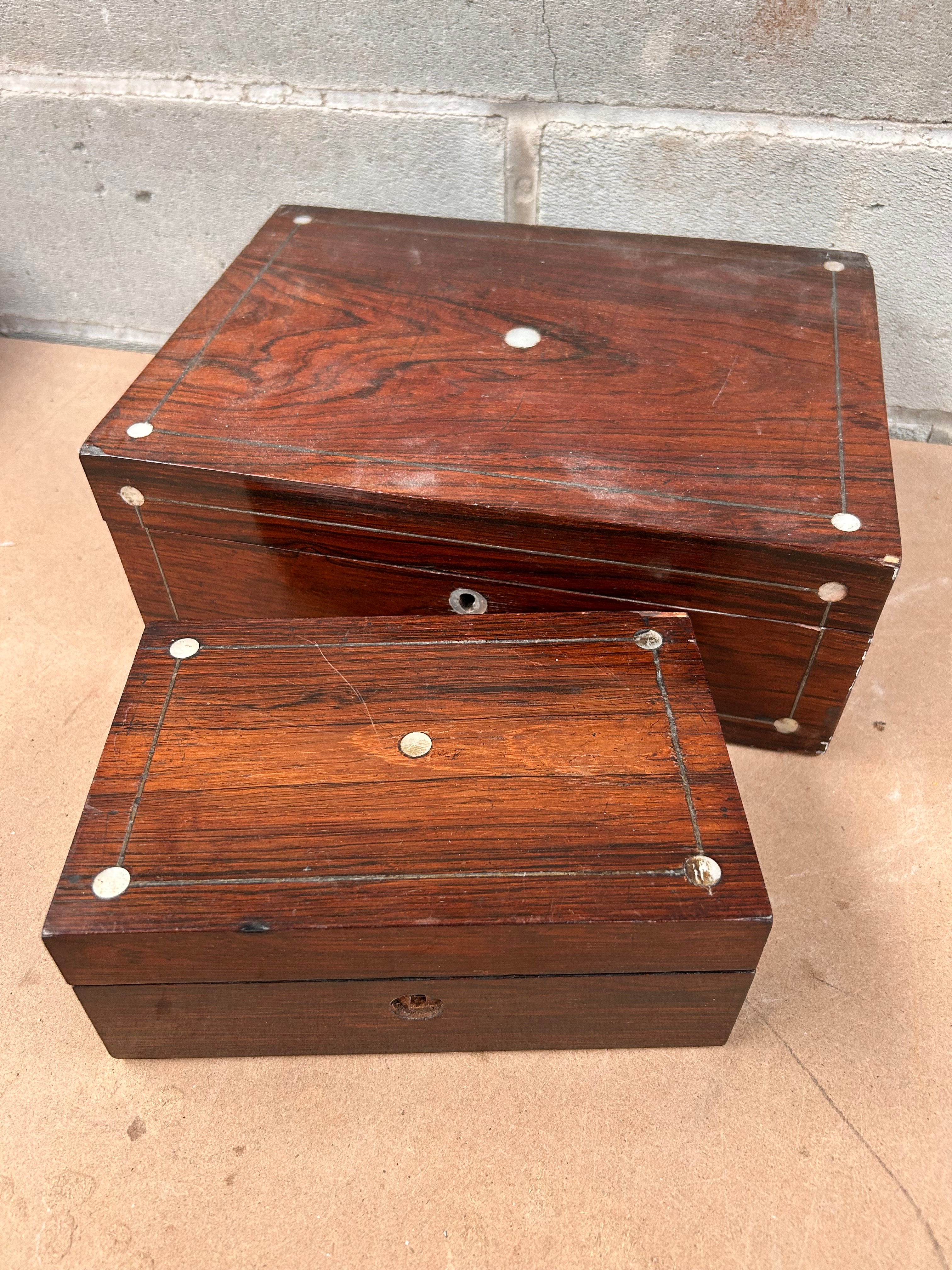 A pair of Victorian rosewood and mother-of-pearl inlaid boxes. Each graduated box features a dark reddish-brown hue with prominent grain, accented by light-colored circular and linear mother-of-pearl inlay to the lids and edges. Both boxes are fitted with a keyhole to the front. The larger box reveals a red fabric-lined interior with an additional, smaller compartment lined in blue. The smaller box is lined with red fabric.