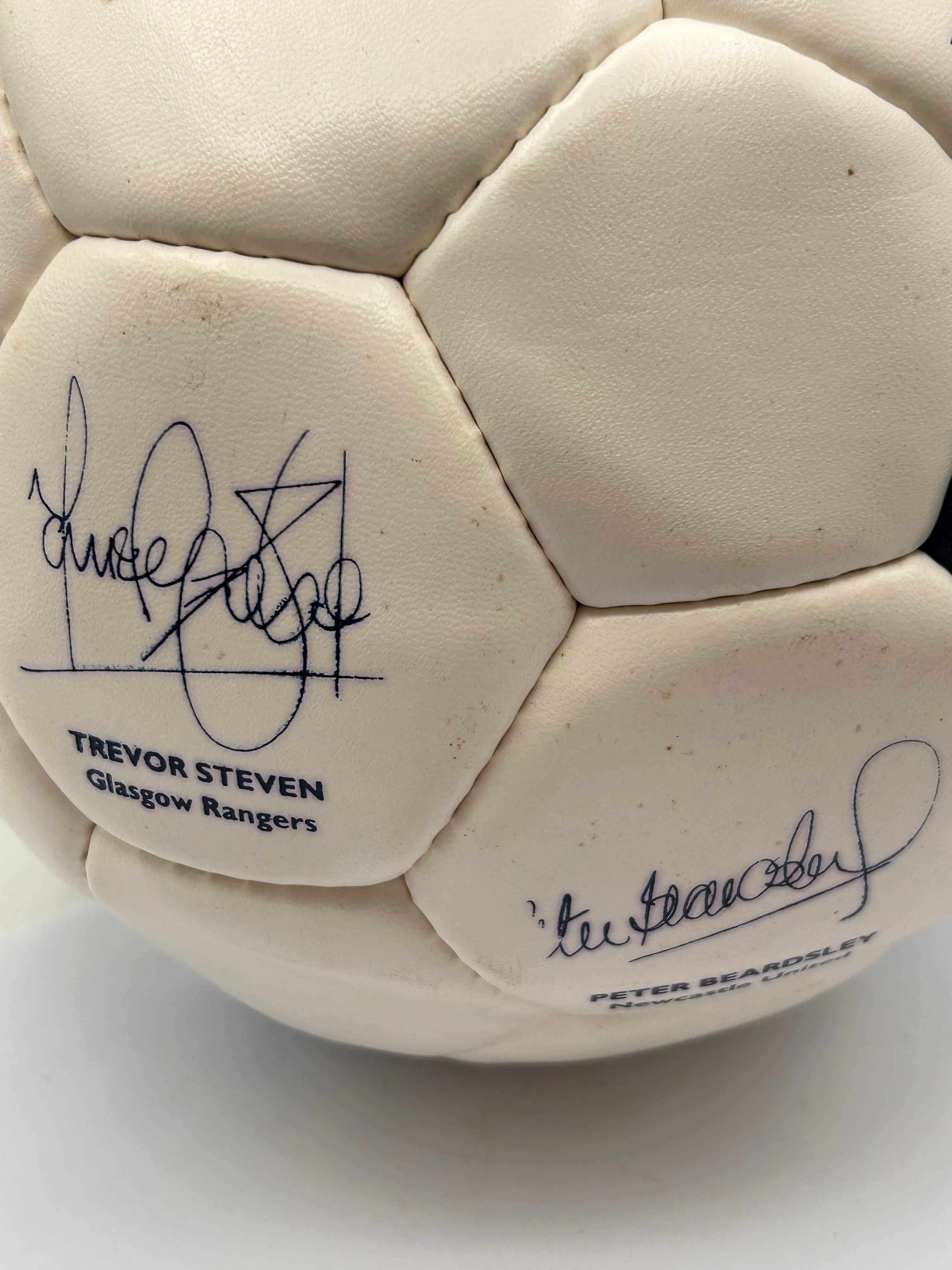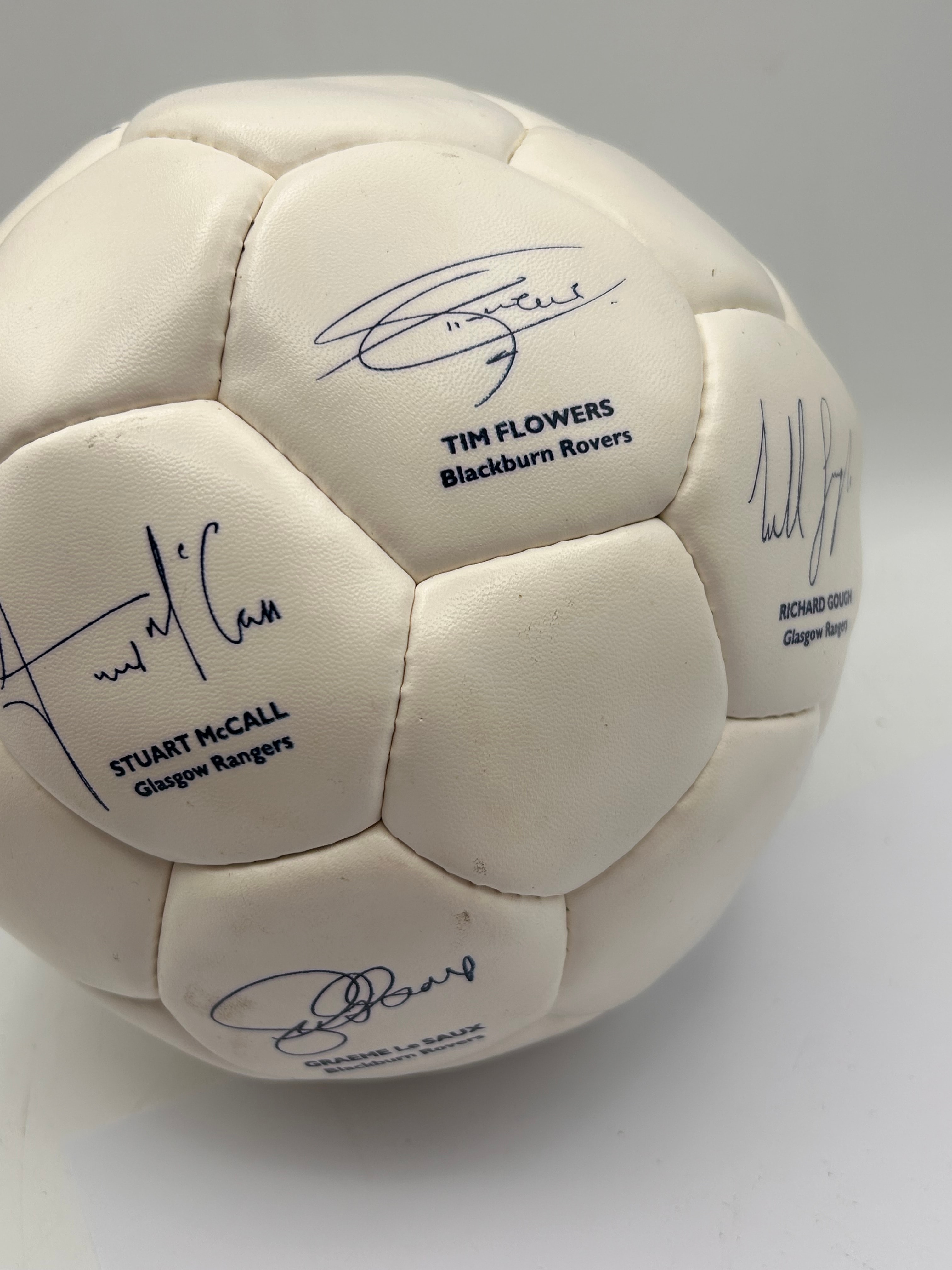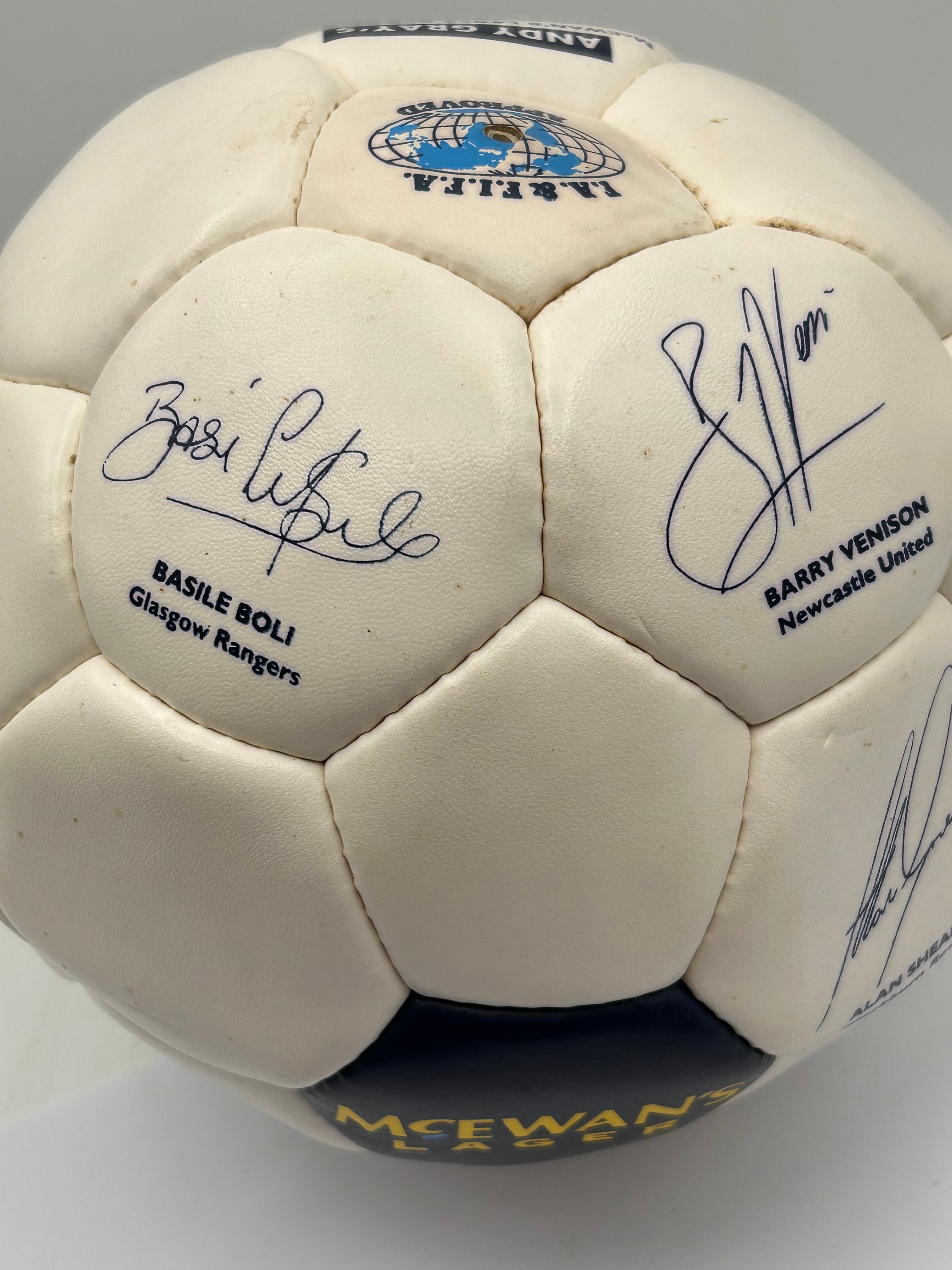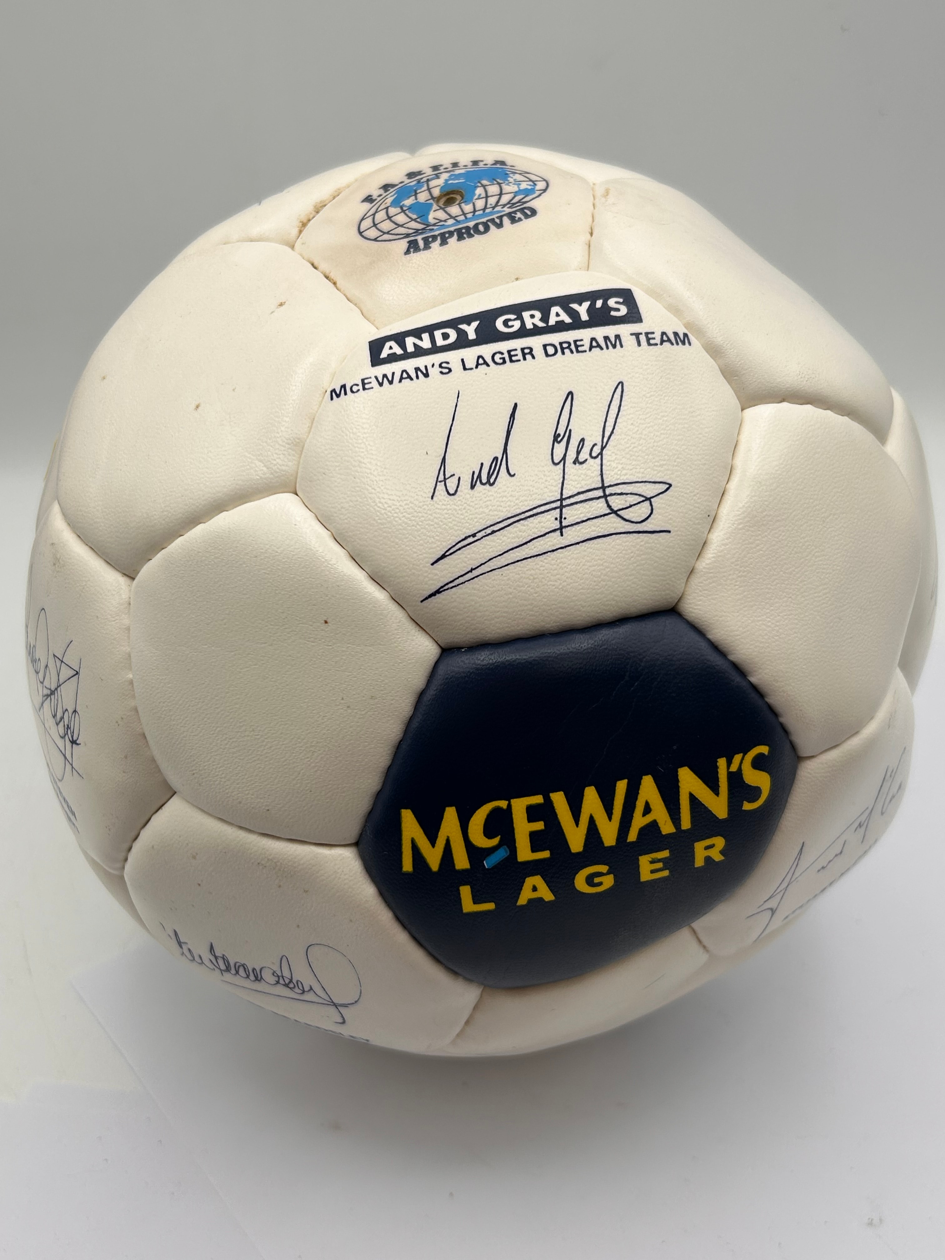 A modern-style, 32-panelled football, primarily off-white with one prominent dark blue panel, constructed from synthetic material. The ball functions as a promotional or commemorative item, prominently featuring the text “ANDY GRAY’S MCEWAN’S LAGER DREAM TEAM” and a “MCEWAN’S LAGER” logo on the dark panel. A partially visible “FIFA APPROVED” mark is also present. The ball is extensively signed in black ink by various professional footballers, with their names and associated clubs printed below the signatures. Signatures include Stuart McCall (Glasgow Rangers), Tim Flowers (Blackburn Rovers), Richard Gough (Glasgow Rangers), Graeme Le Saux, Trevor Steven (Glasgow Rangers), Peter Beardsley (Newcastle United), Basile Boli (Glasgow Rangers), Barry Venison (Newcastle United), and Alan Shearer.