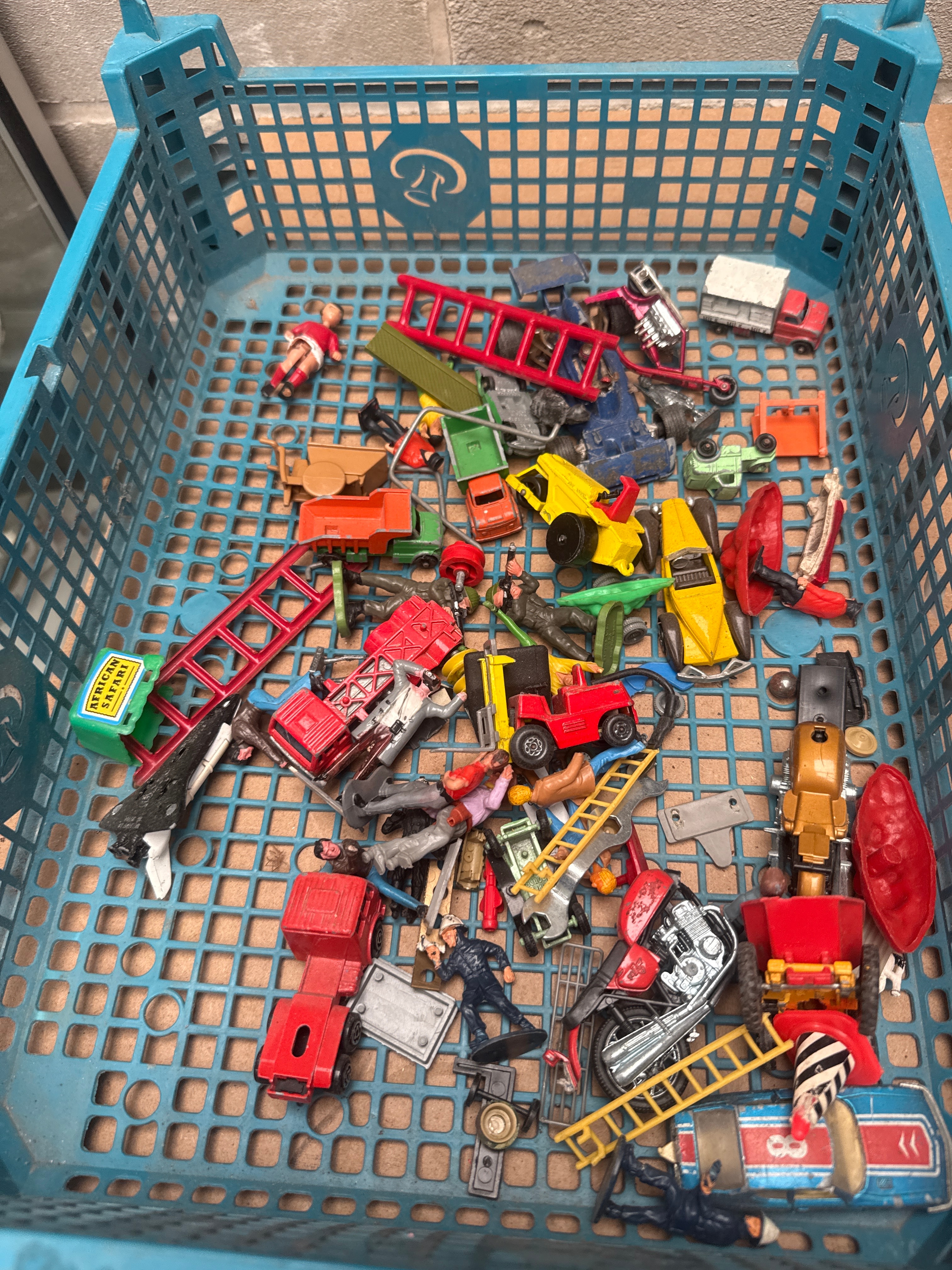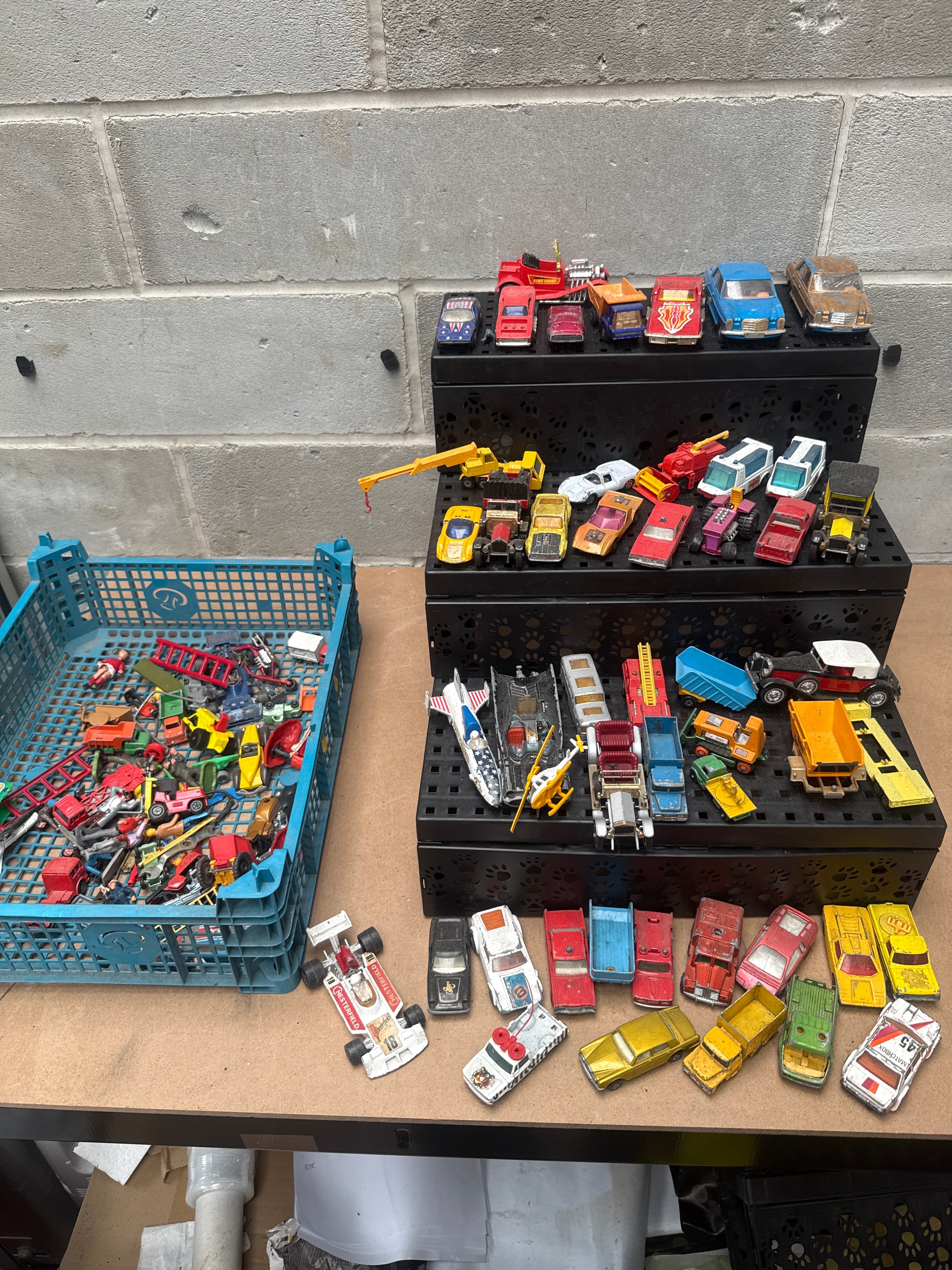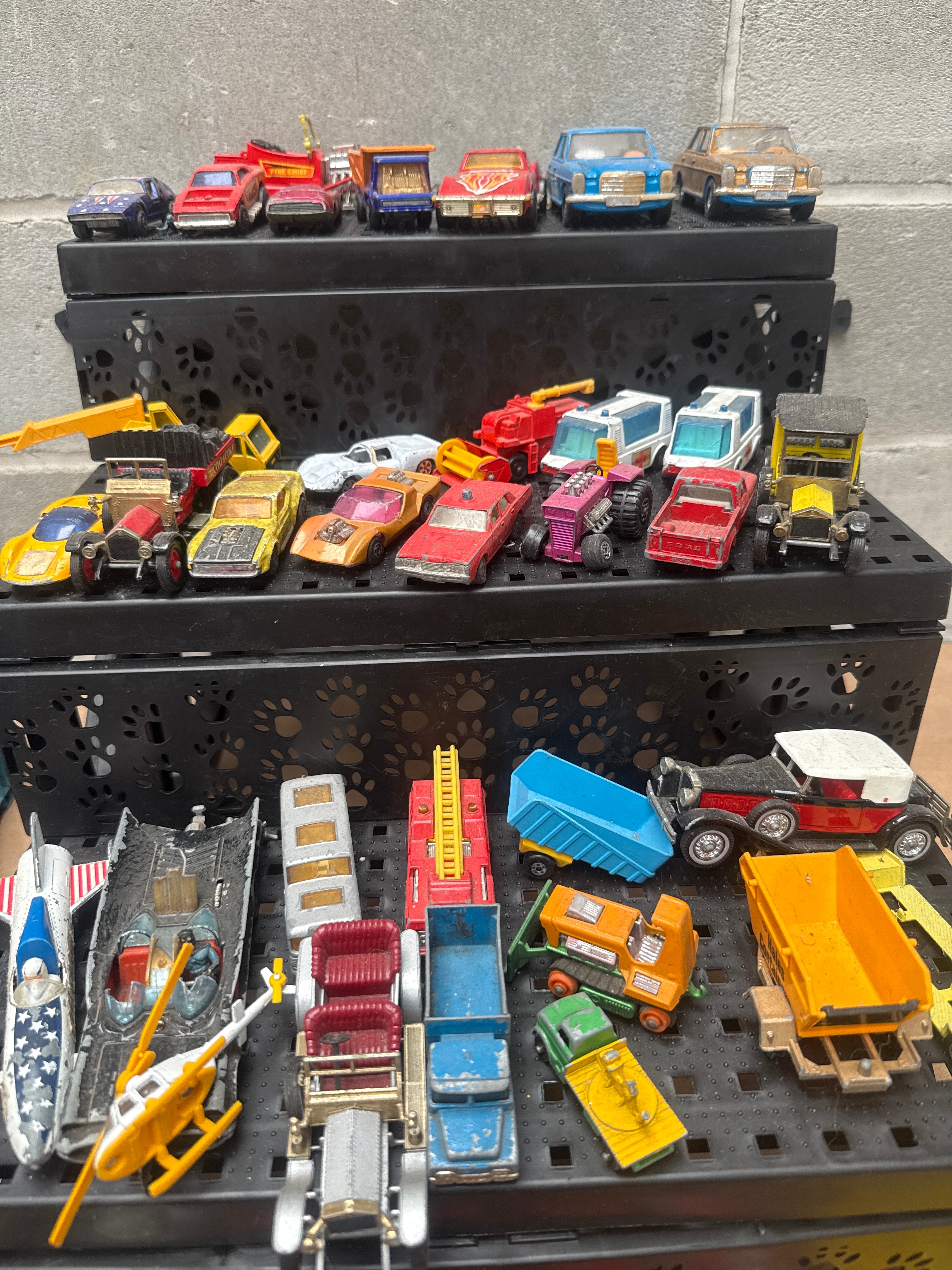 A collection of approximately 70-80 vintage small-scale toy vehicles and accessories, predominantly die-cast metal with plastic components, including examples by Corgi, Matchbox, and Dinky. The collection comprises a variety of cars, trucks, construction vehicles, emergency vehicles, aircraft, boats, and small figurines. Visible markings include “Matchbox” with specific model numbers such as “45,” “20,” “28,” “33,” and “47.” Other notable texts include “Chesterfield” on a white race car, “Police” on a white patrol car, “Fire” on a red engine, “Ambulance” on a white van, and “Mexican Green” on a small green accessory. The style and markings suggest a production period from the mid to late 20th century. The toys are displayed on tiered black plastic stands with paw-print cutouts and loosely contained within a blue plastic crate.