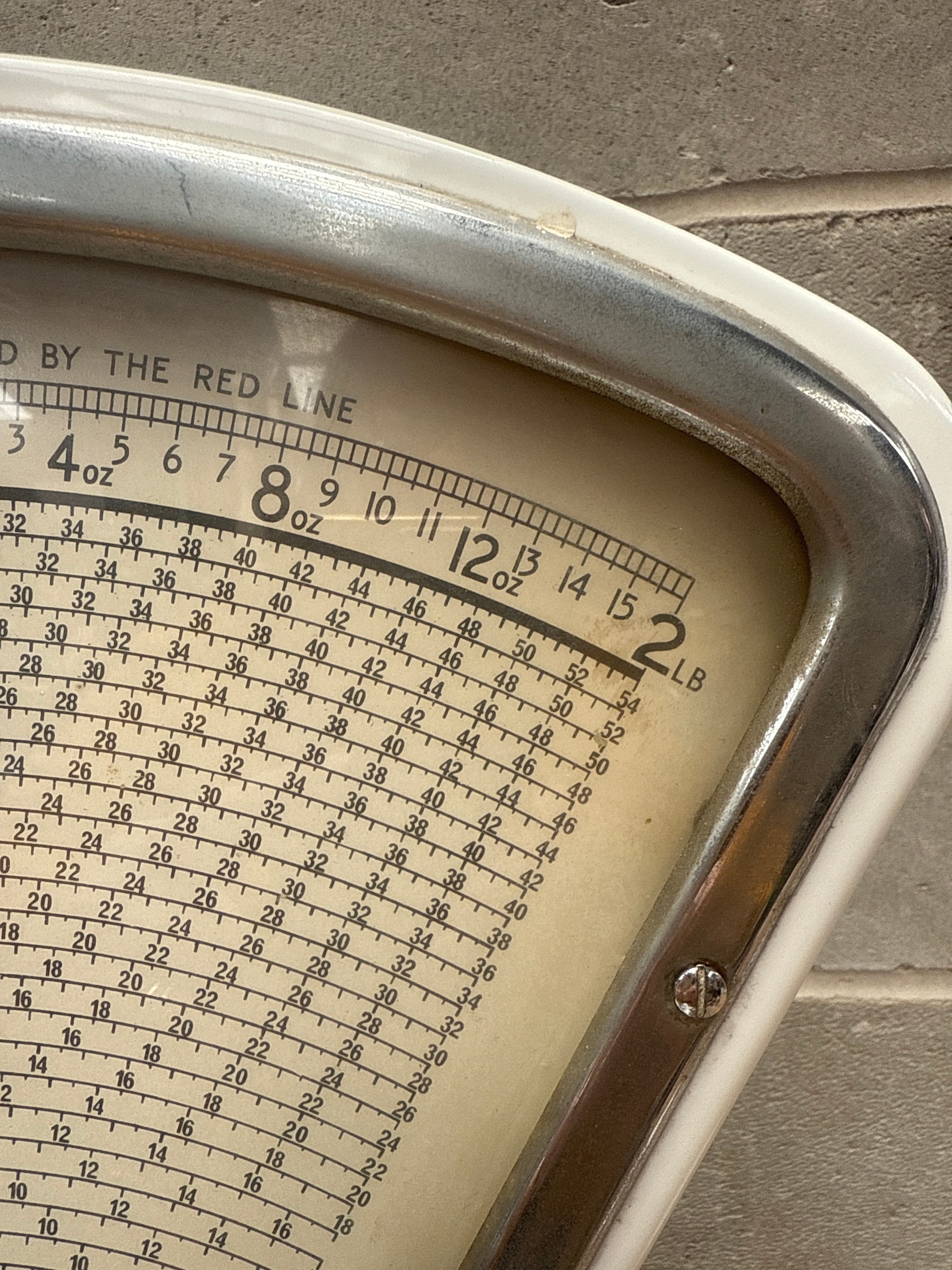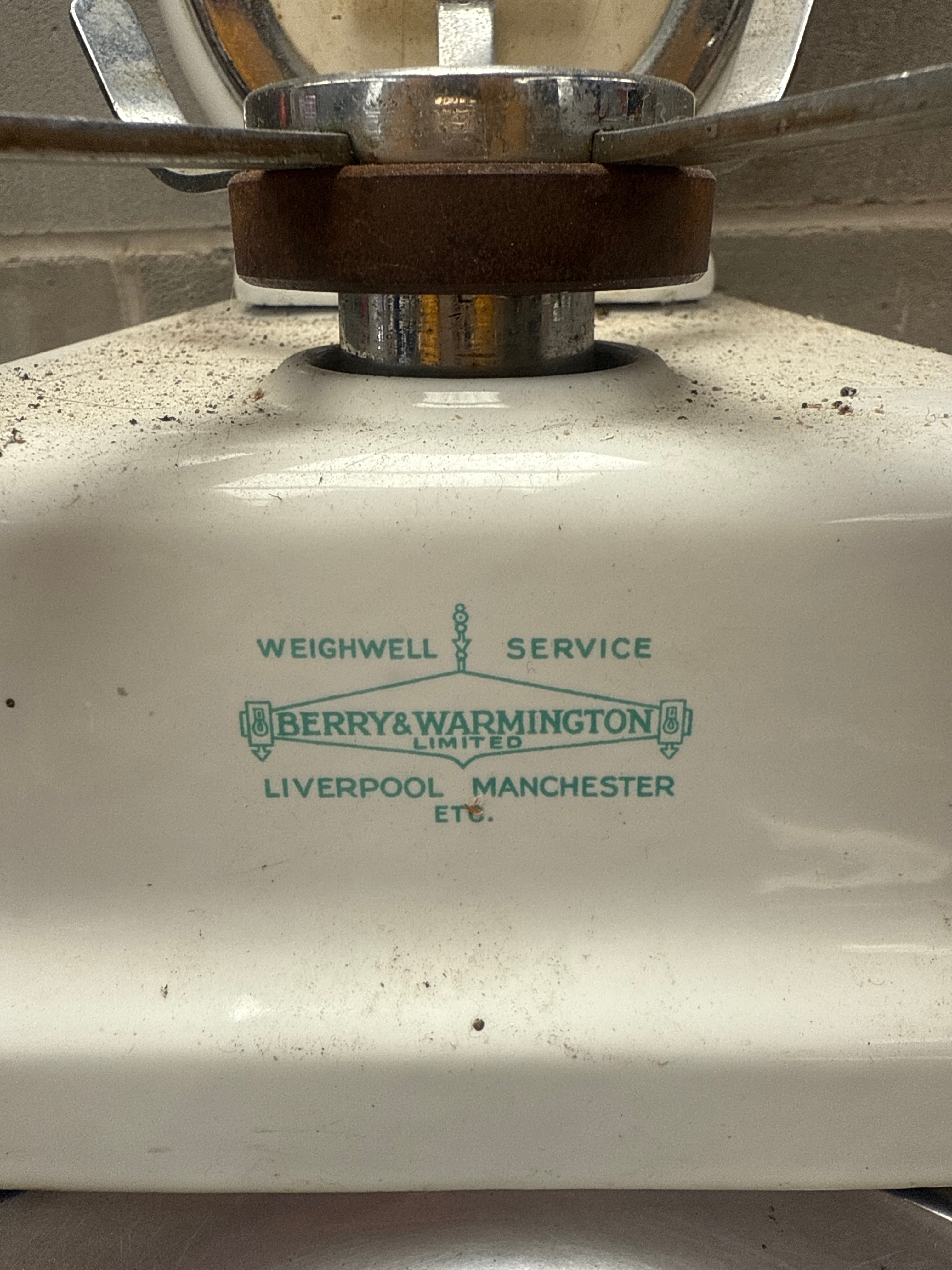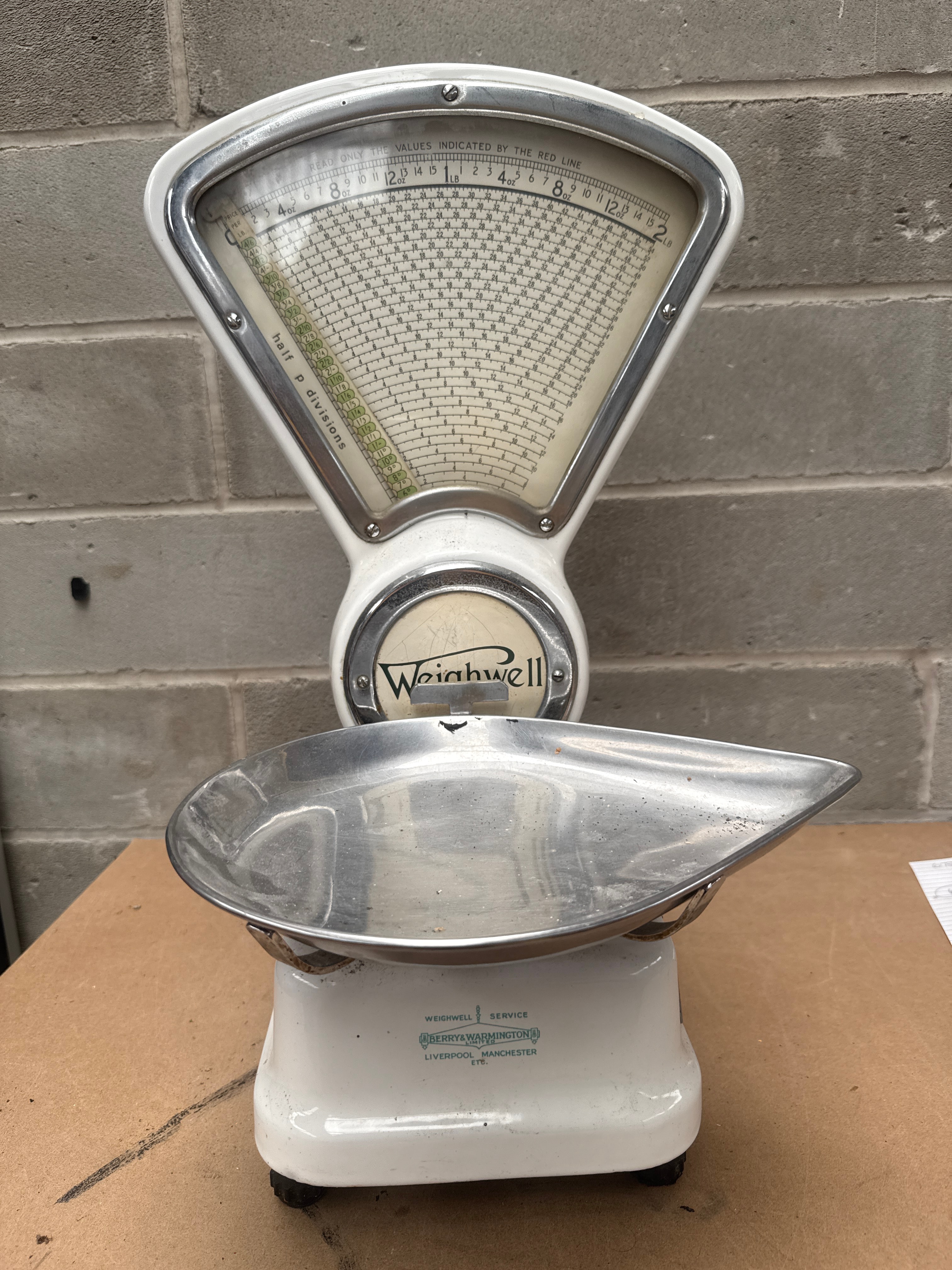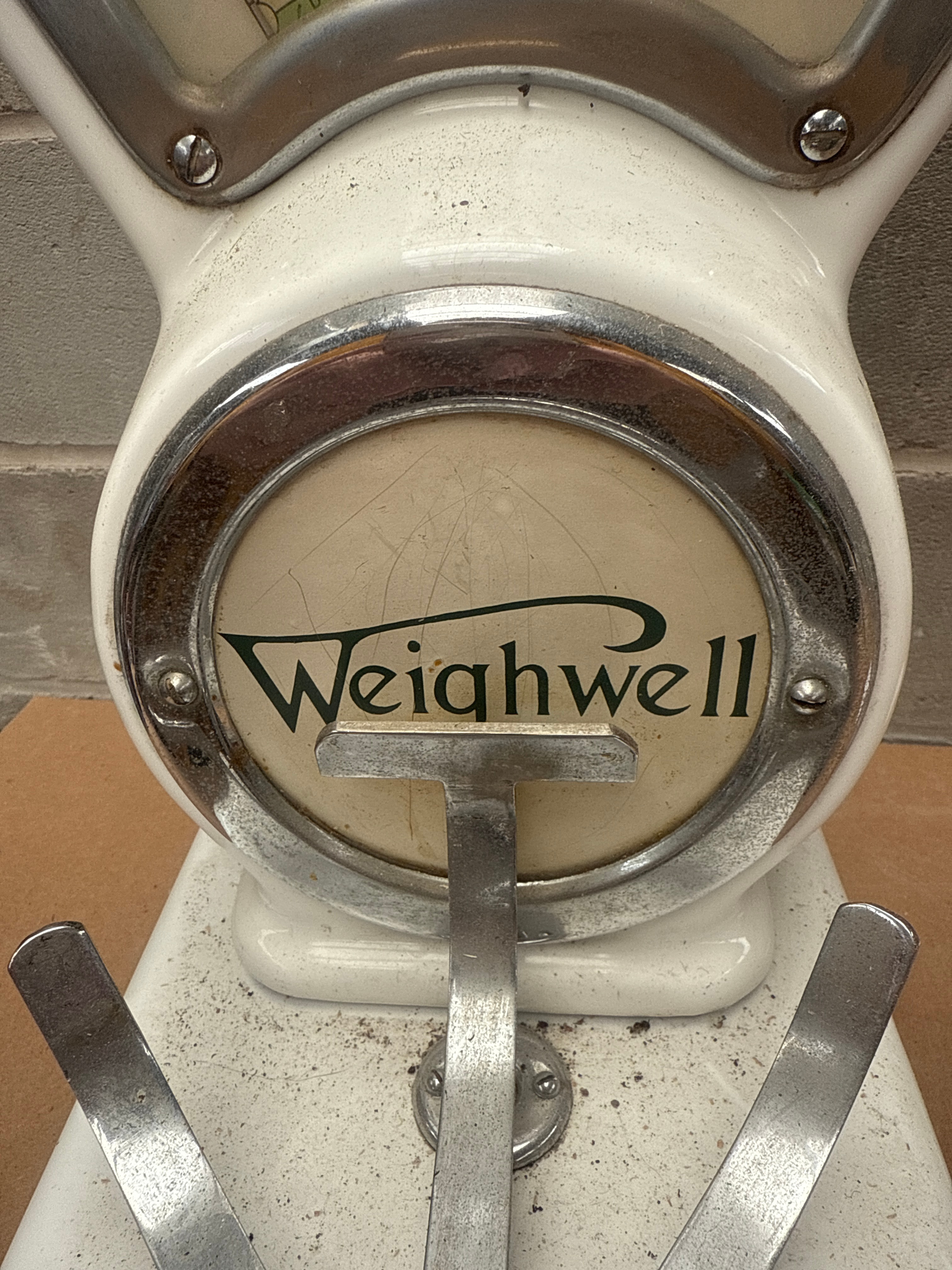 A vintage ‘Weighwell’ brand mechanical computing scale, likely mid-20th century. The scale features a white enameled metal body with polished metal accents and a stainless steel or chrome-plated weighing pan. The primary display, behind a clear cover, indicates weight measurements up to 2 LB in ounces and pounds, alongside a grid for price calculation marked ‘VALUES INDICATED BY THE RED LINE’ and ‘HALF ½ DIVISIONS’. The base is marked ‘WEIGHWELL SERVICE’ and ‘BERRY & WARMINGTON LIMITED, LIVERPOOL MANCHESTER ETC.’.