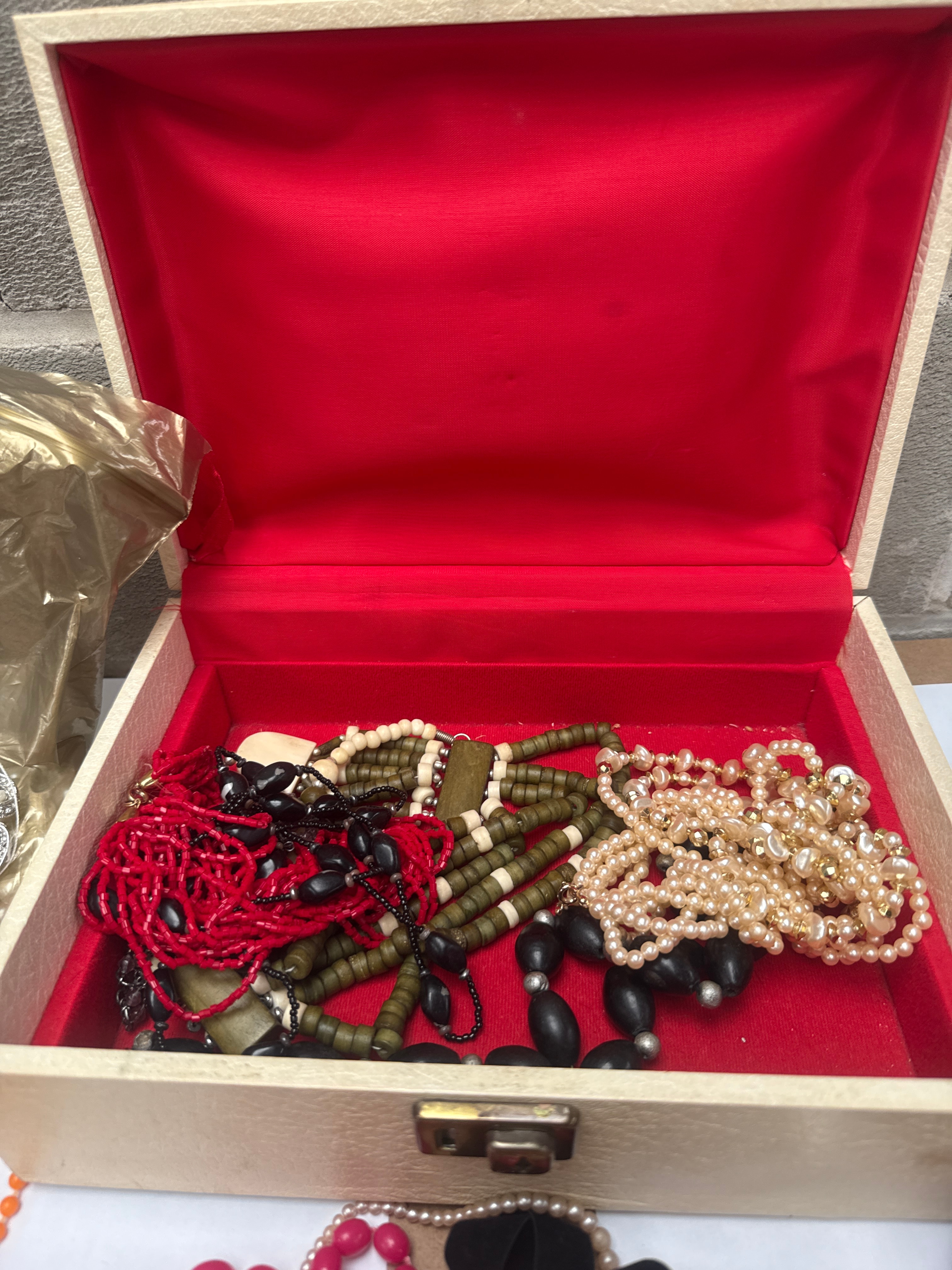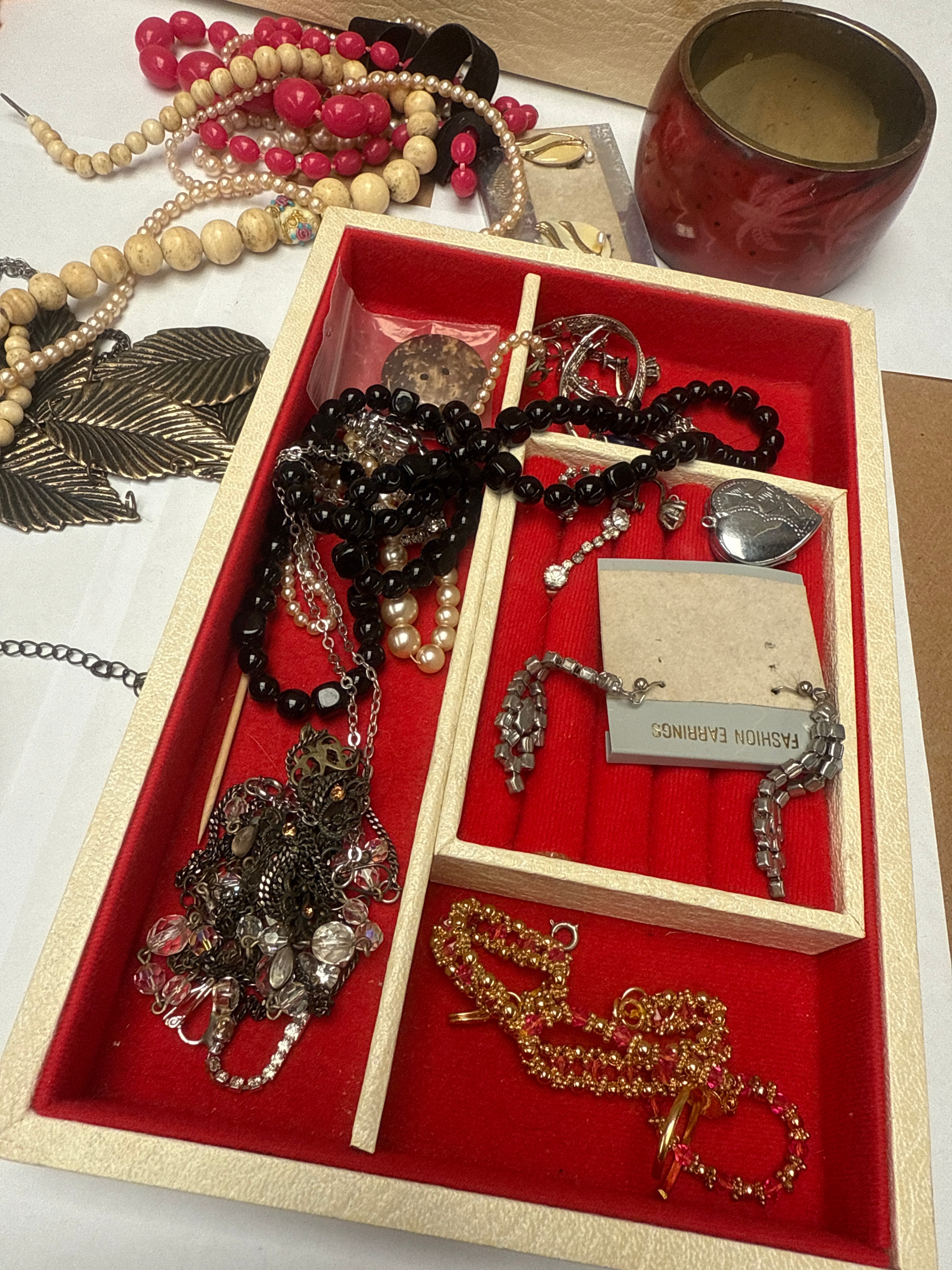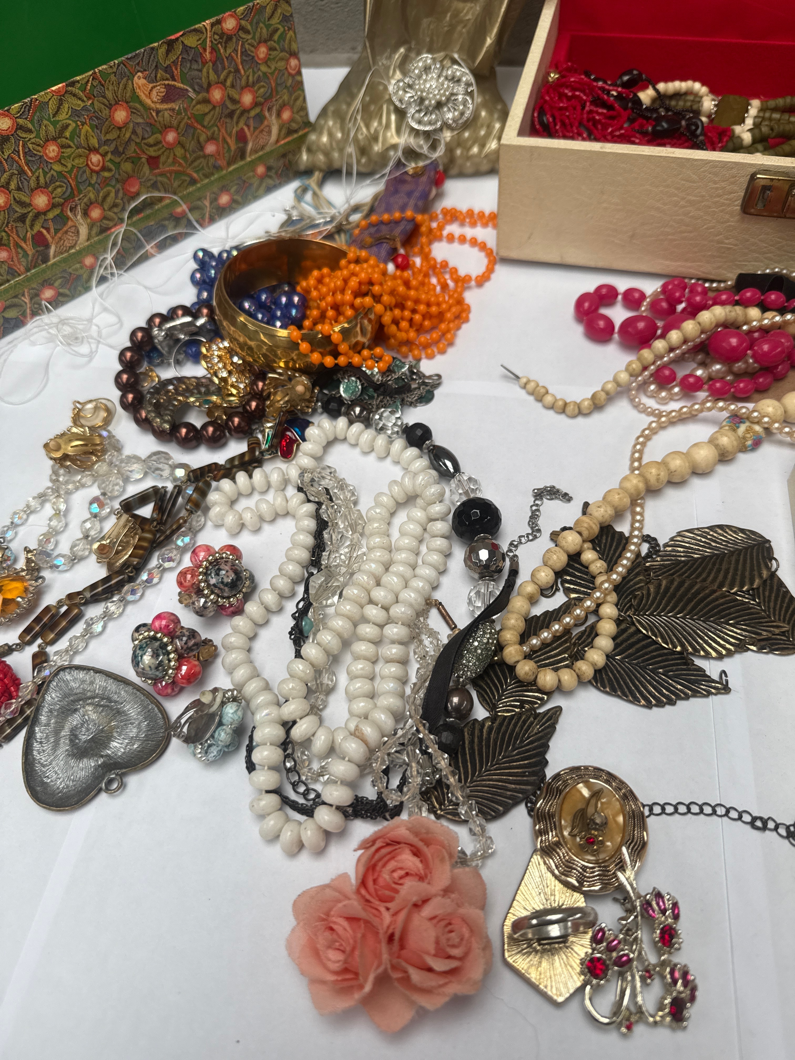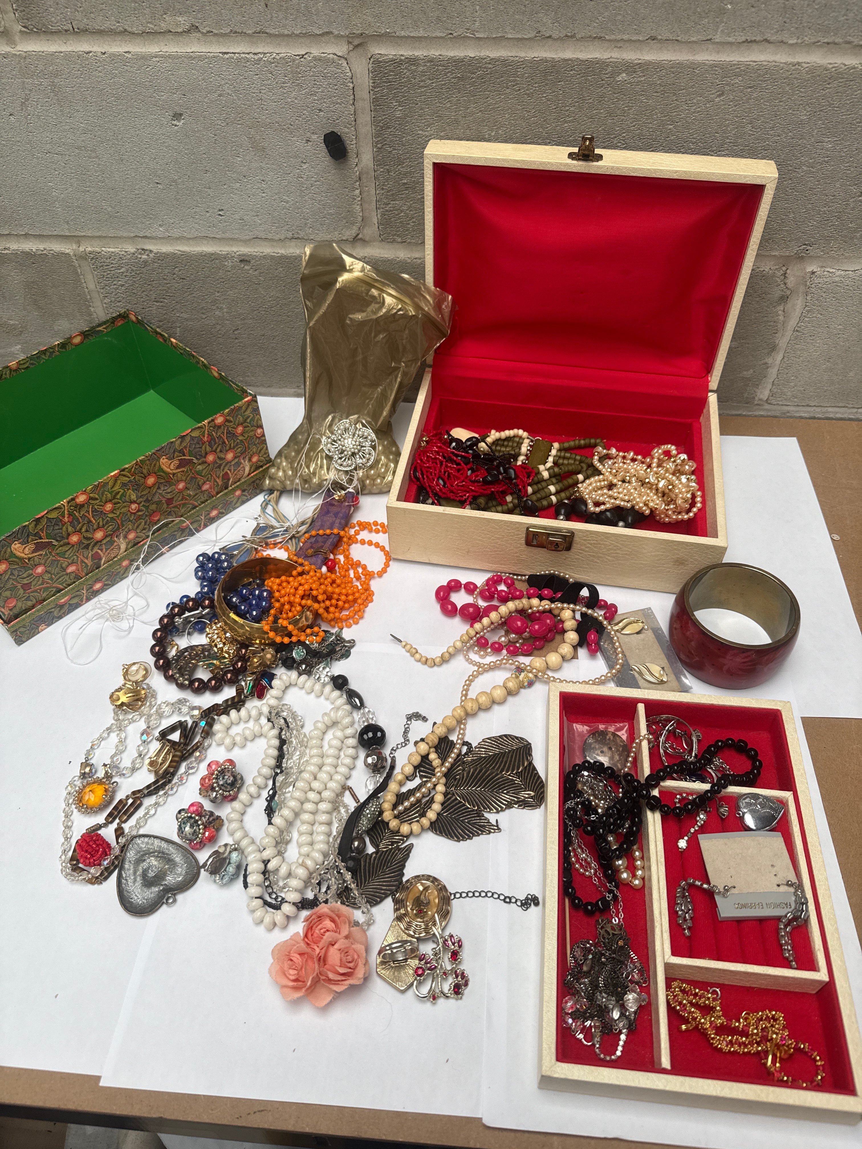 This lot comprises a diverse collection of predominantly costume jewelry, including numerous necklaces, bracelets, earrings, brooches, and rings. The items are crafted from a variety of materials such as faux pearls, glass beads, plastic beads, wooden beads, and non-precious metals with gold-tone, silver-tone, and bronze-tone finishes. Visible pieces include multi-strand beaded necklaces in various colors (red, white, black, orange, olive green, pink), items featuring clear and colored rhinestones, metal leaf pendants, and a pink fabric floral brooch. The collection is presented alongside two red velvet-lined wooden boxes (one partitioned), a green patterned cardboard box, a crumpled gold fabric pouch, and a small red ceramic vessel. An earring card within the collection clearly displays the text “FASHION EARRINGS.”