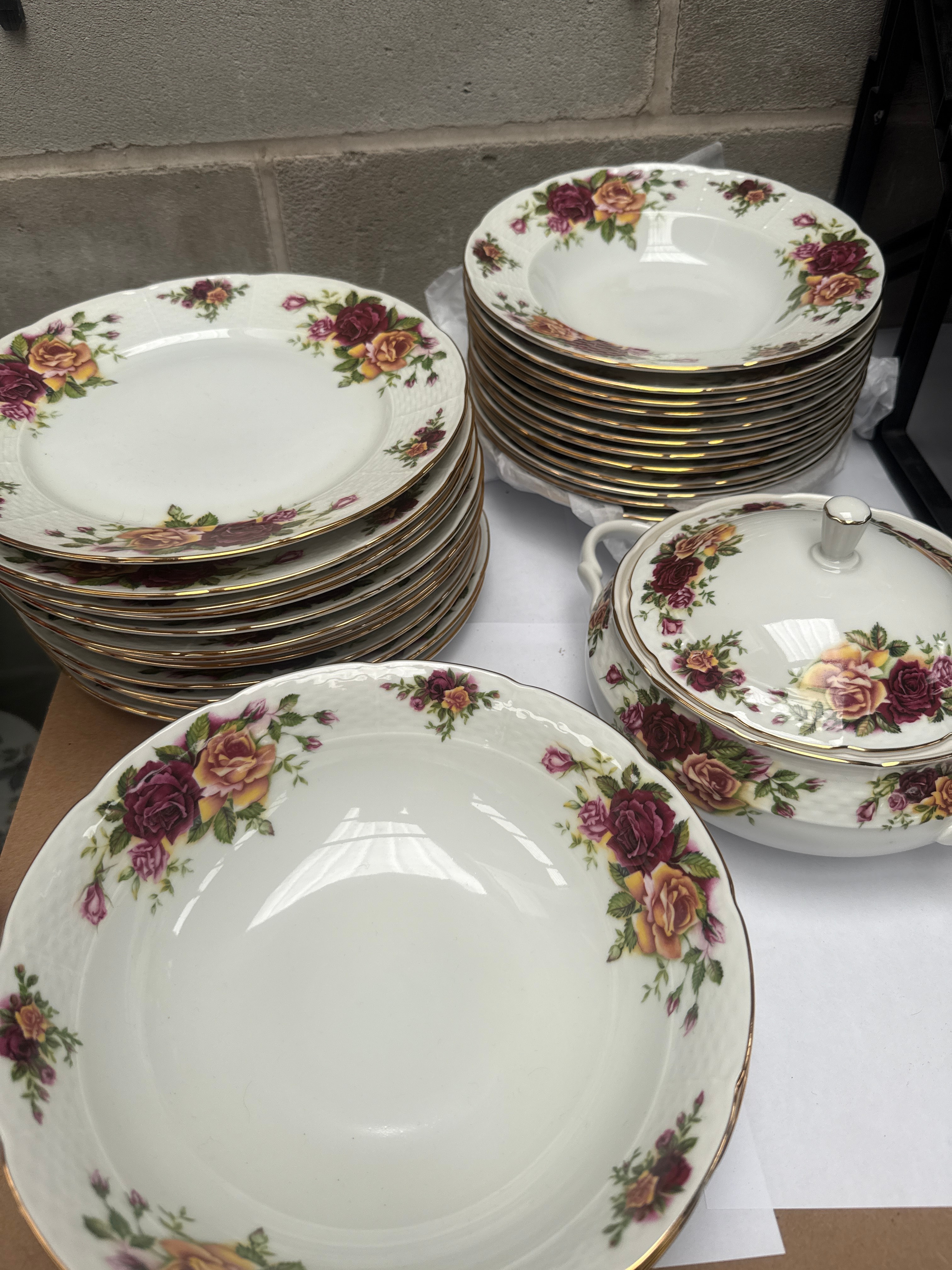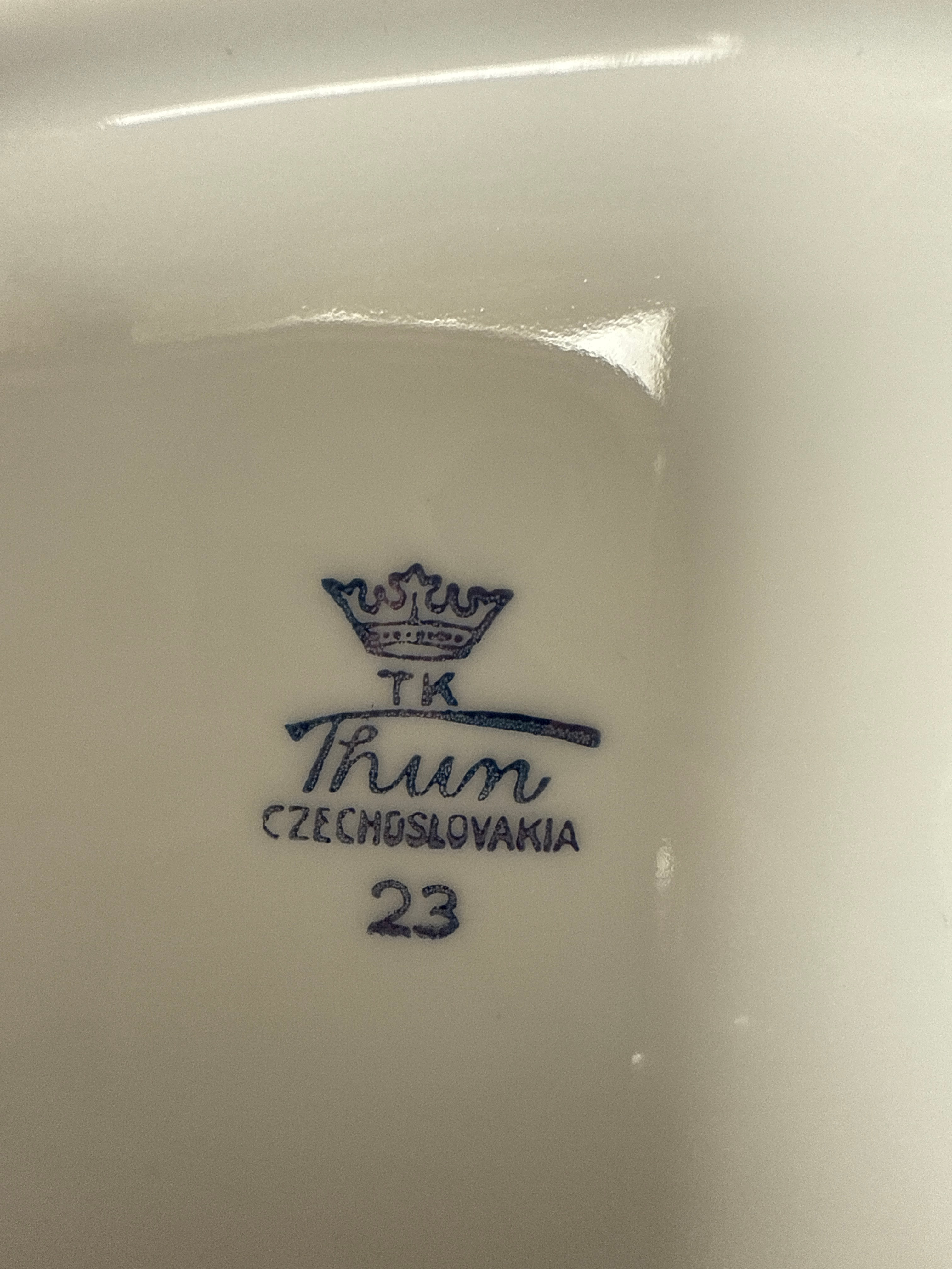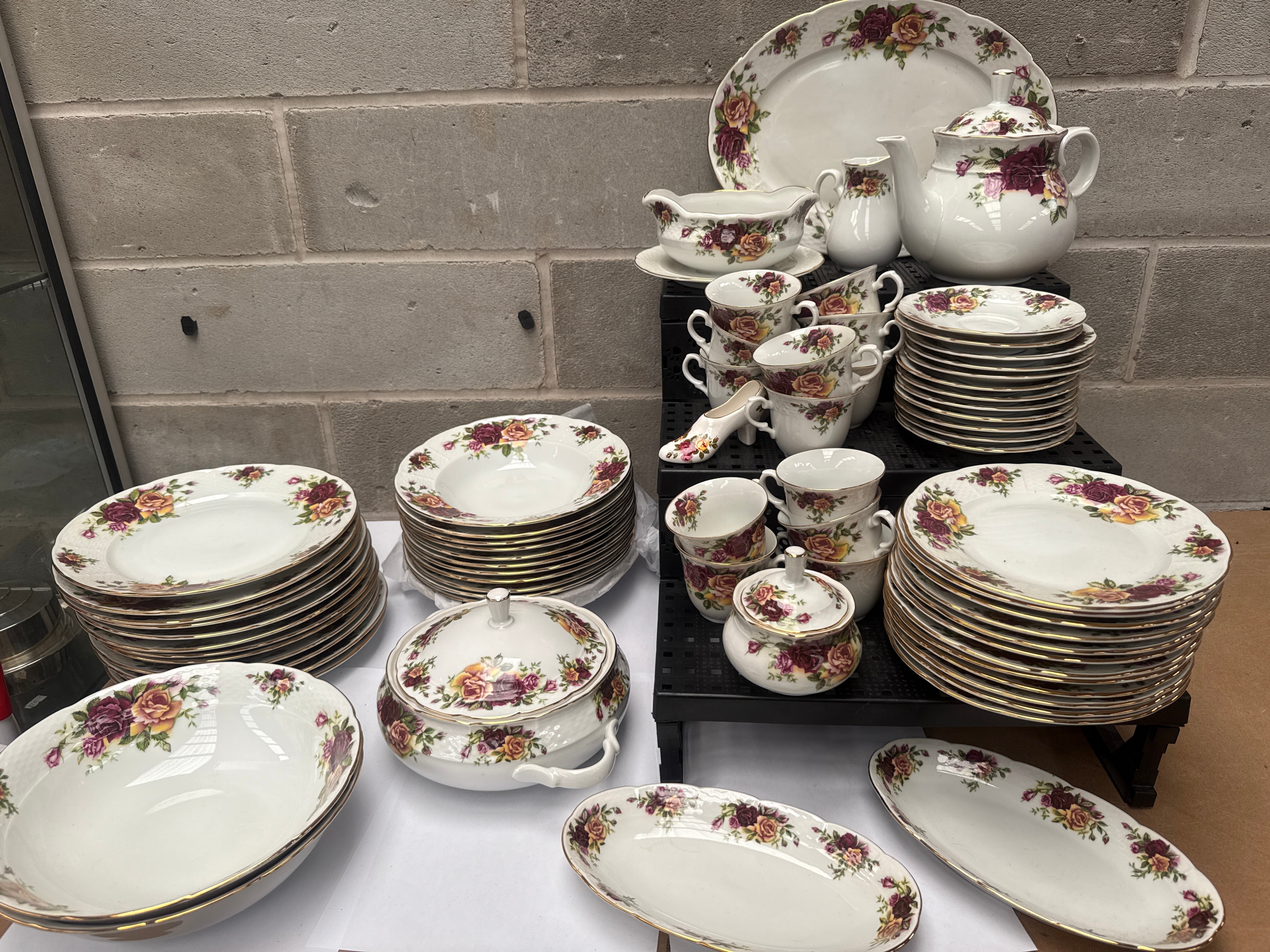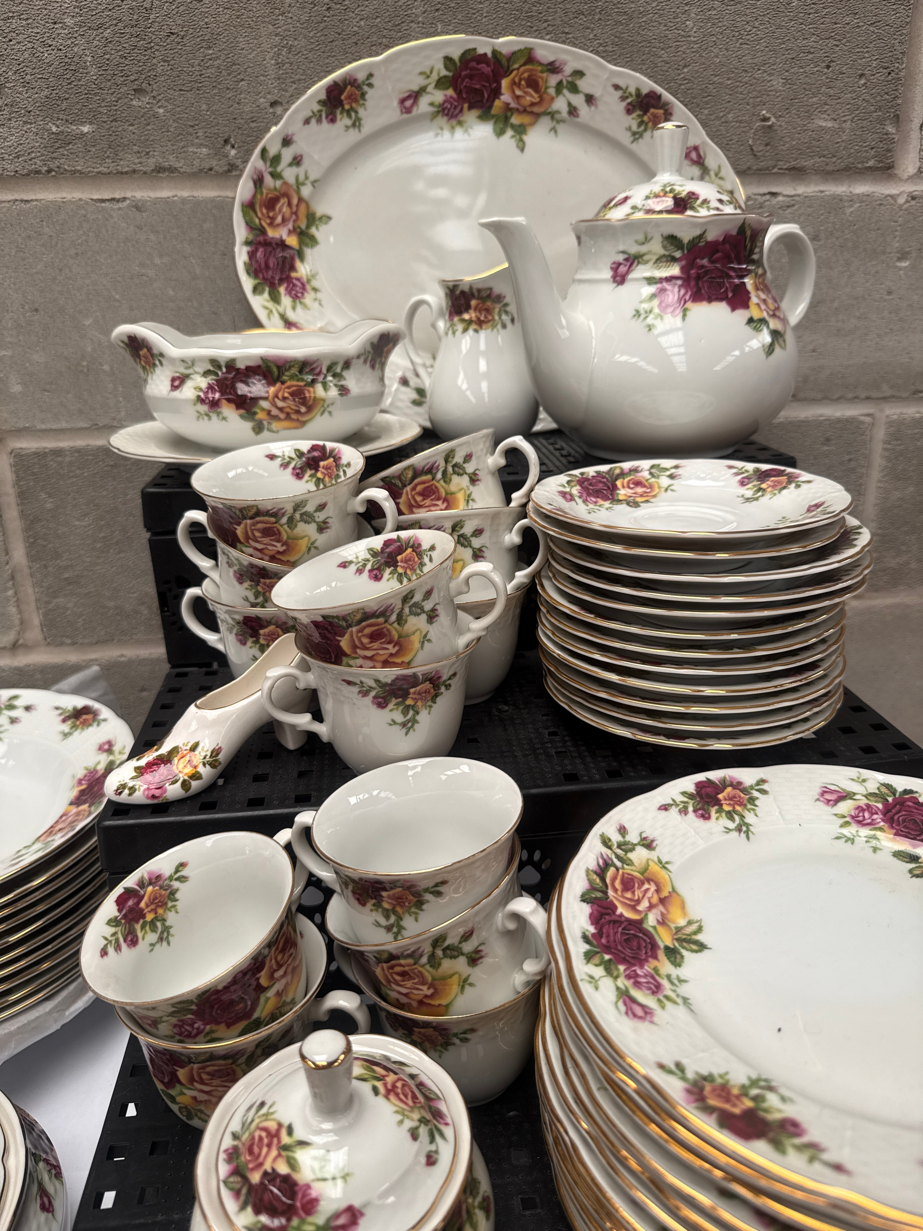 A 72-piece set of Czechoslovakian porcelain dinnerware and teaware by Thun, featuring a traditional style with a prominent floral pattern of red, pink, and yellow roses amidst green foliage, all accented with gilt rims. The pattern is visually consistent with the widely recognized ‘Old Country Roses’ design. The extensive collection includes various plates (dinner, soup, dessert), serving platters, open and lidded serving bowls, a gravy boat with an underplate, a teapot, a creamer, a lidded sugar bowl, numerous teacups with saucers, and a decorative shoe-shaped vessel. One piece bears a visible backstamp for ‘Thun’ with a crown motif above ‘TK’, and the origin ‘CZECHOSLOVAKIA’, along with the number ’23’. This backstamp indicates a production period between 1918 and 1992.