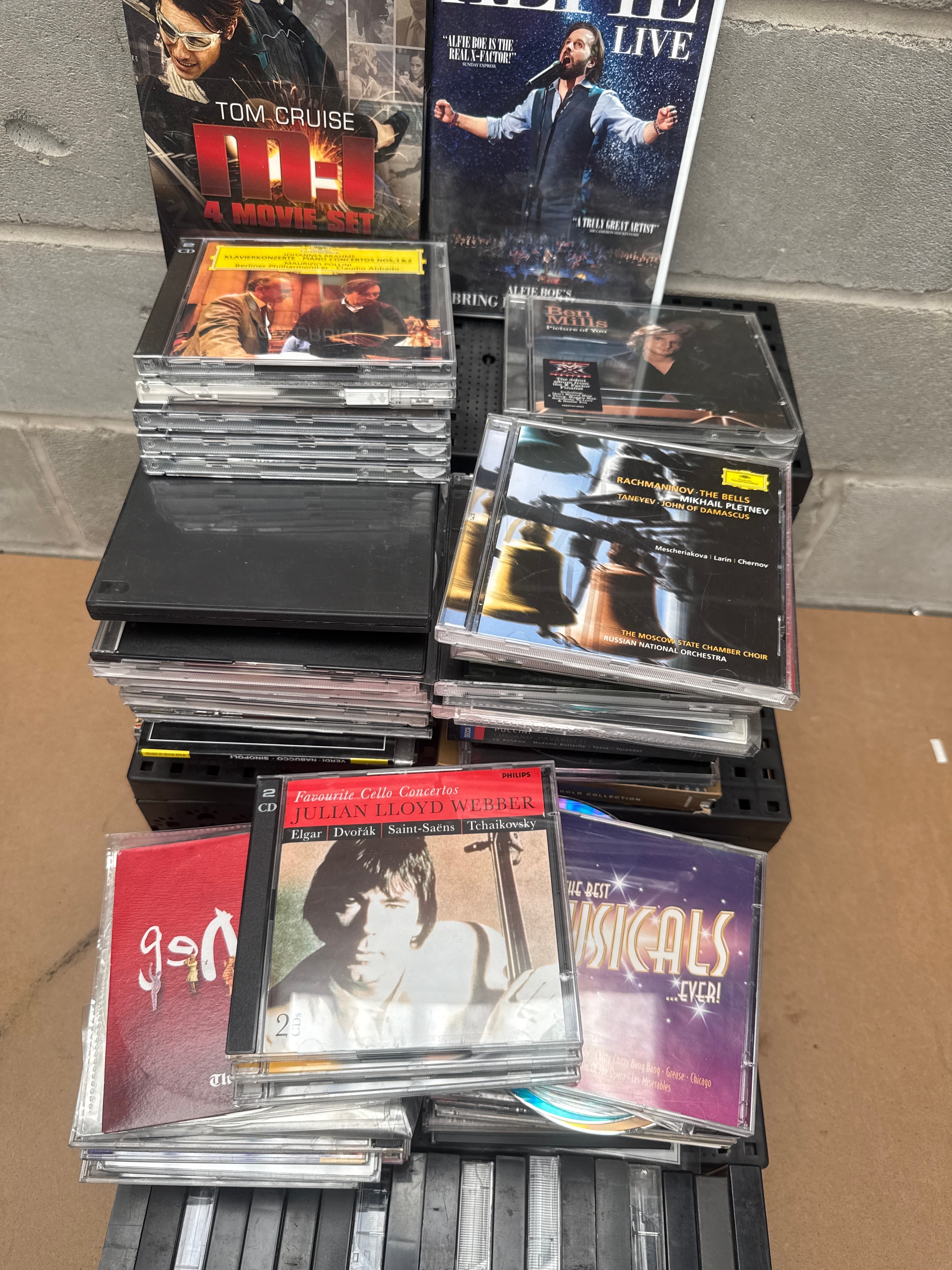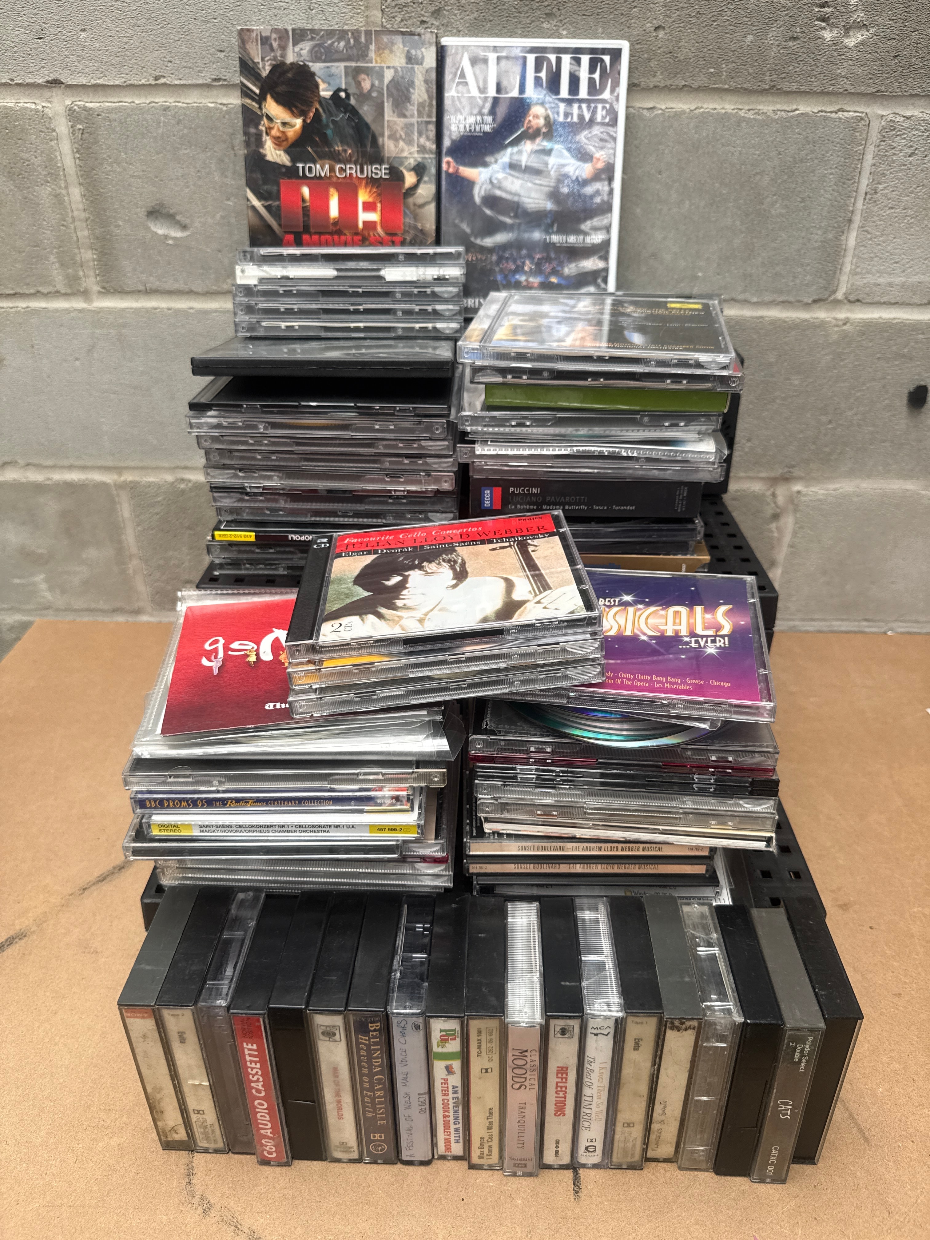 This substantial collection of audio and video media primarily features compact discs (CDs) in clear jewel cases and digipaks, a row of audio cassette tapes, and two upright DVD/Blu-ray cases. All items are organized within black plastic storage trays. Visible titles on the DVDs/Blu-rays include ‘TOM CRUISE 4 MOVIES’ and ‘ALFIE BOE LIVE.’ Prominent CD titles suggest classical music, opera, and musicals, with examples such as Puccini, Rachmaninov, Julian Lloyd Webber’s cello concertos, and ‘THE BEST MUSICALS EVER!’. One cassette tape is visibly labeled ‘CD AUDIO CASSETTE.’ The collection spans various genres from the late 20th to early 21st century.
