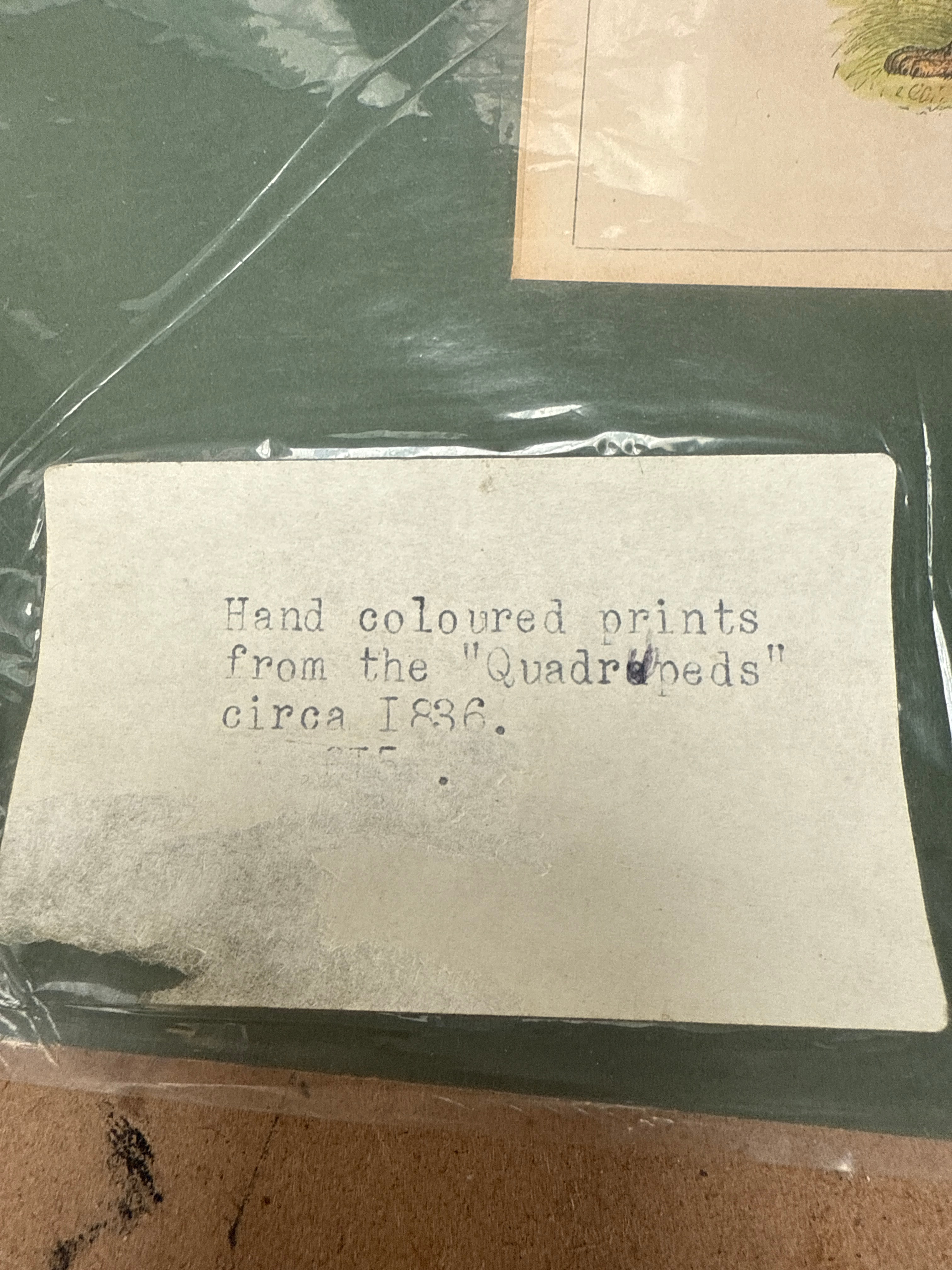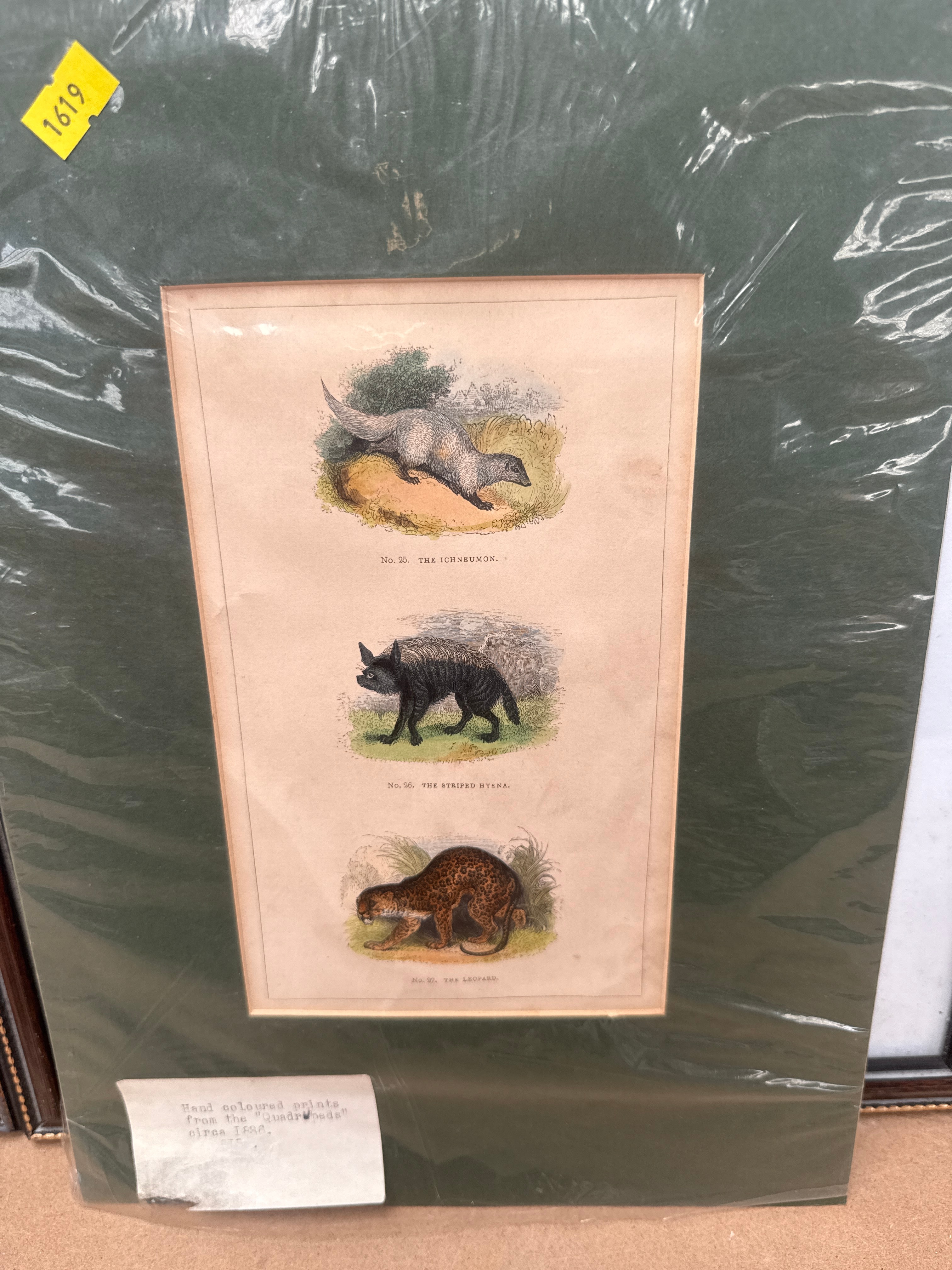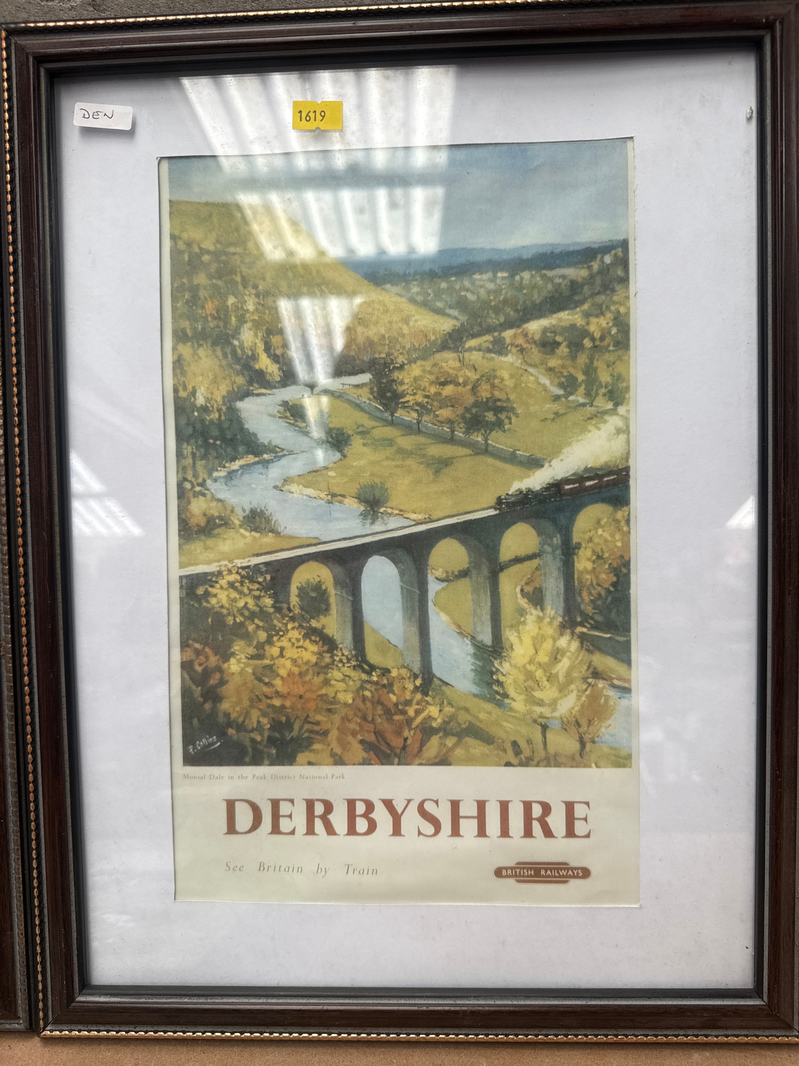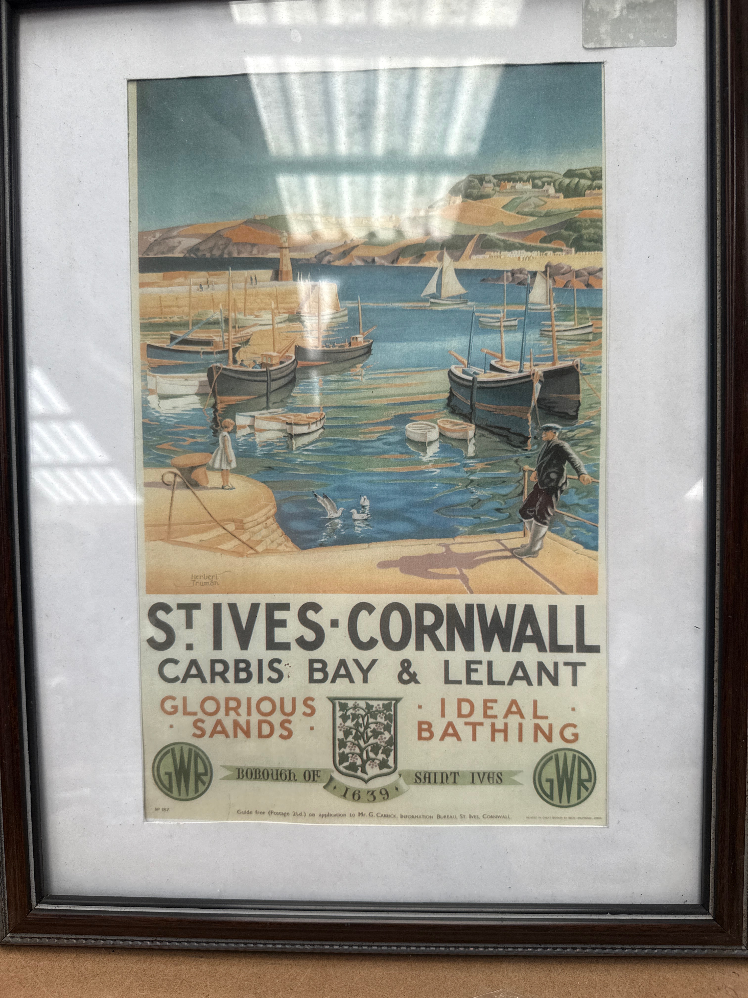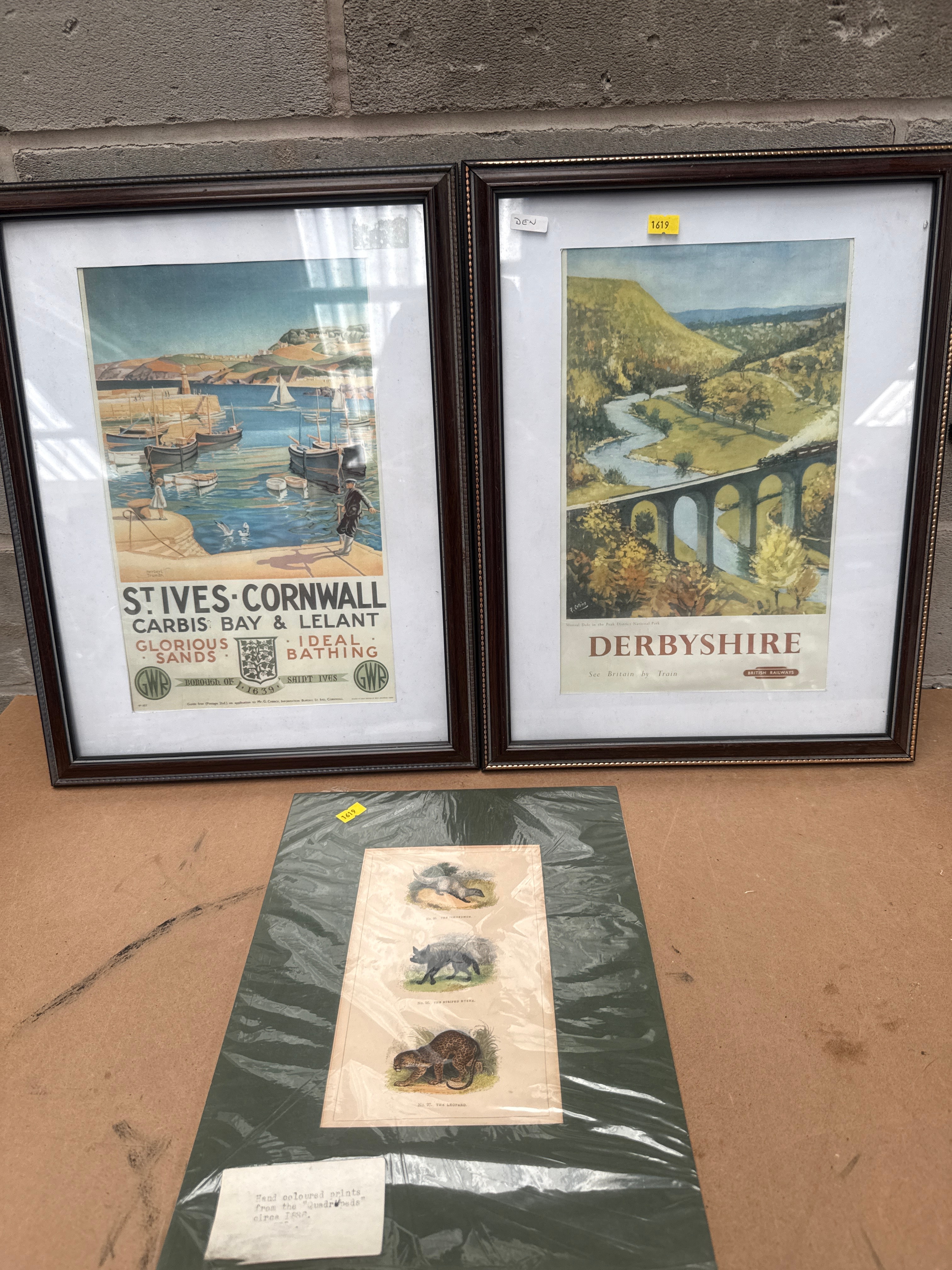 A lot comprising two framed and glazed reproduction railway travel posters and three hand-coloured natural history prints. The left poster, signed “HERBERT TRINGHAM,” depicts a bustling harbour scene and advertises “ST. IVES – CORNWALL” and its surrounds for the “GWR” (Great Western Railway), prominently displaying “1939” and “GLORIOUS SANDS IDEAL BATHING.” The right poster, signed “T. Aftley” (likely T. S. Attlee), illustrates a train on a viaduct in a picturesque valley, promoting “DERBYSHIRE” with the “BRITISH RAILWAYS” logo and the slogan “See Britain by Train,” also mentioning “Mortal Dale in the Peak District National Park.” Both posters are housed in dark wood frames. The third item comprises three individual hand-coloured prints, presented together on a single mount under clear plastic, depicting “THE ICHNEUMON,” “THE STRIPED HYÆNA,” and “THE LEOPARD.” An attached label identifies these as “Hand coloured prints from the ‘Quadrupeds’ circa 1836.”