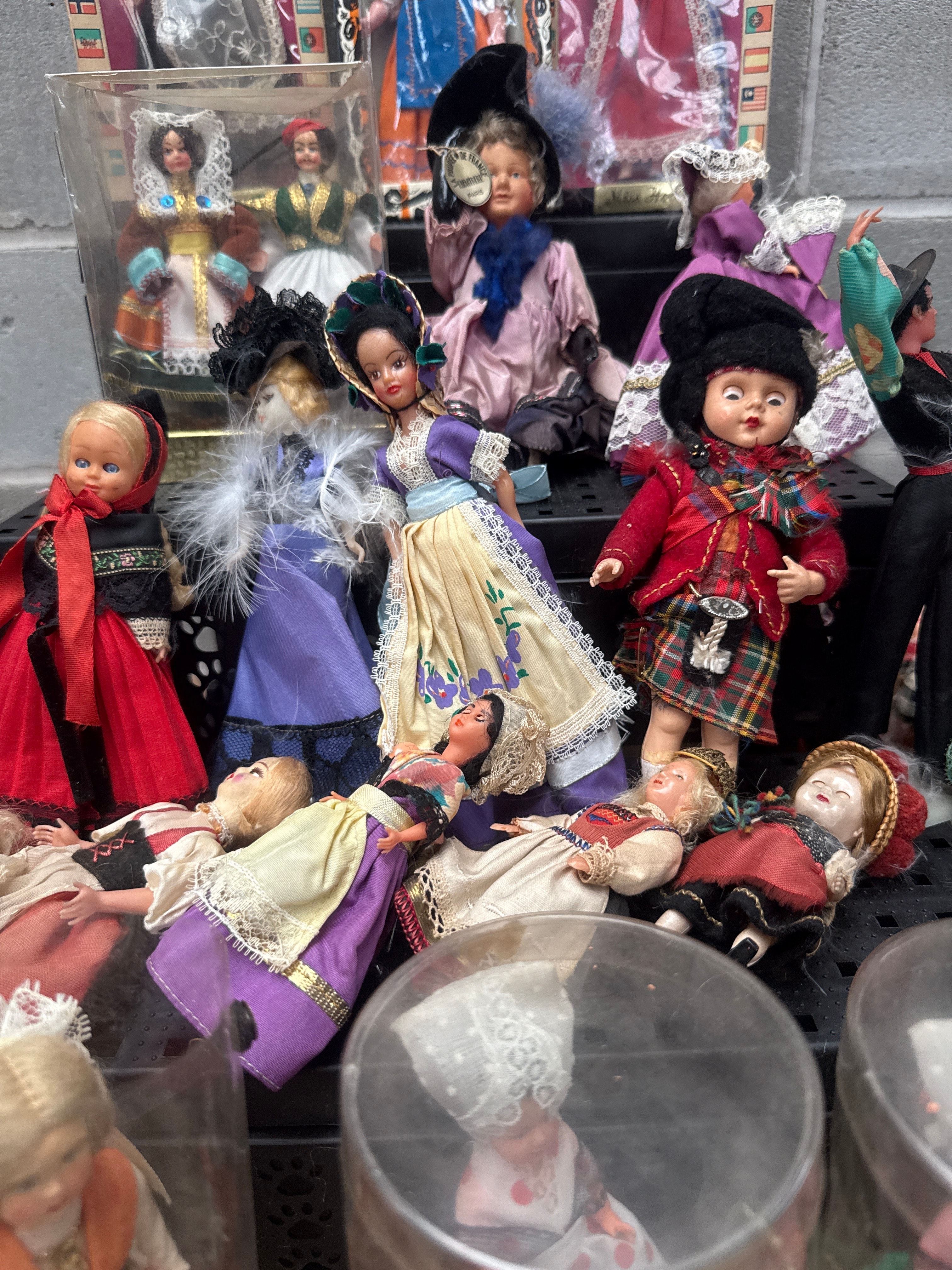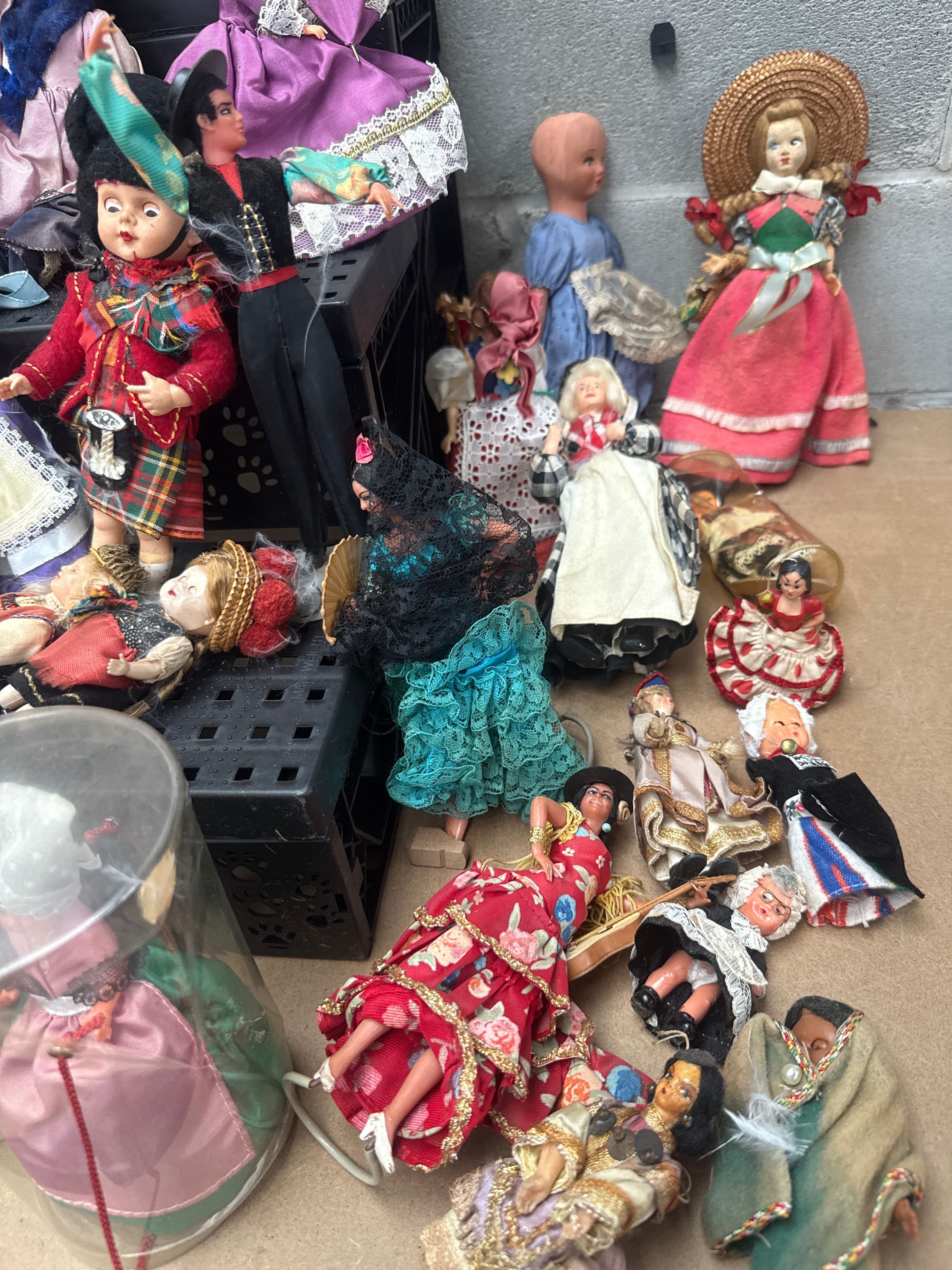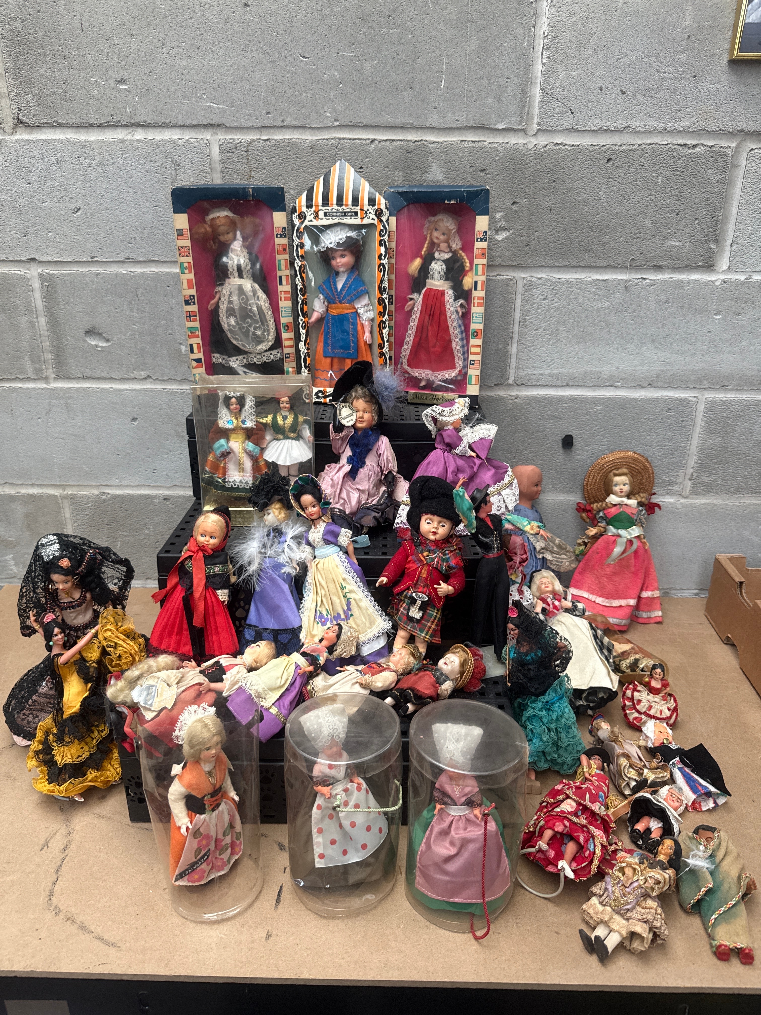 A substantial collection of approximately 40-50 decorative and souvenir dolls, predominantly featuring various national and traditional costumes, consistent with mid to late 20th-century production. Materials include diverse fabrics for clothing such as cotton, lace, satin, and velvet, plastic for bodies and limbs, and what appears to be bisque or porcelain for the heads and hands of some figures. Several dolls are housed in their original cardboard boxes, which display flag motifs and visible text such as “ESPAÑA” (Spain), indicating diverse international representations. Others are presented in clear plastic cylindrical containers or loose.