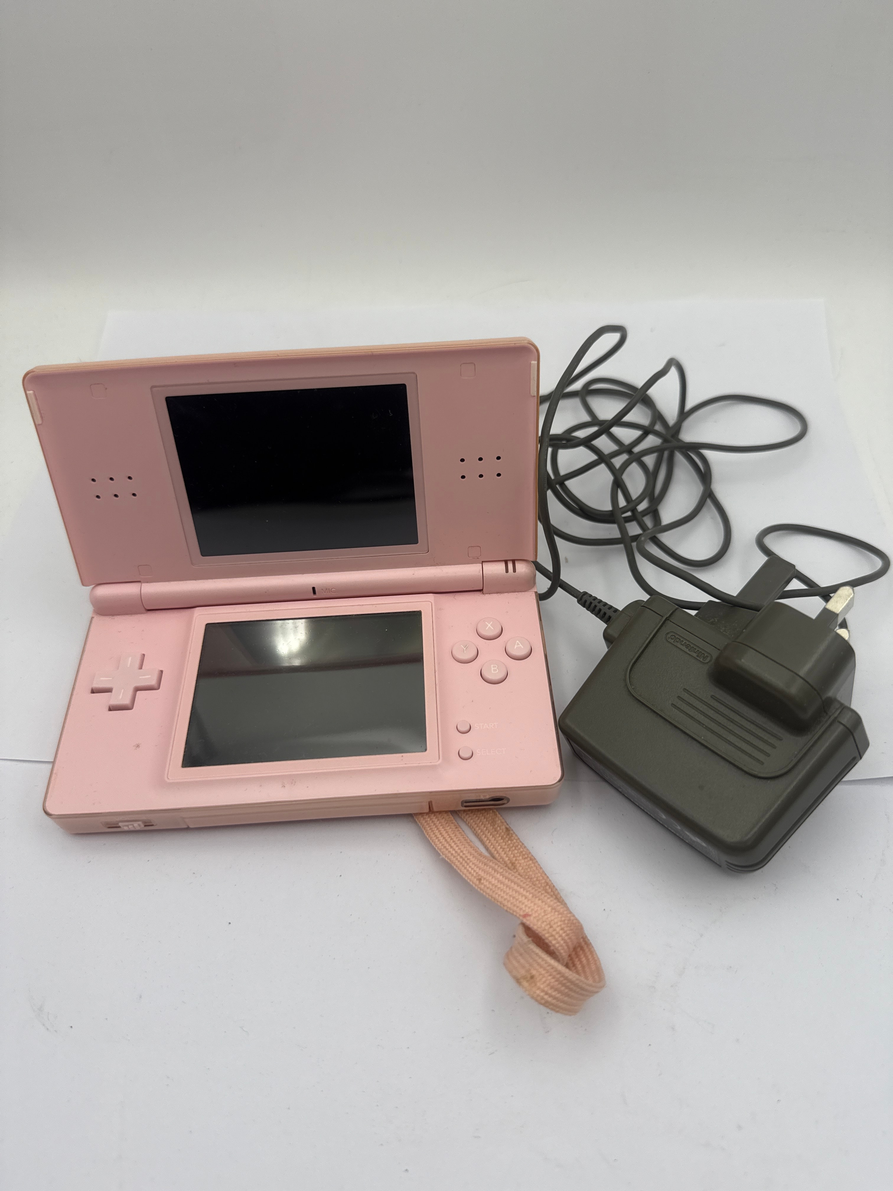 A Nintendo DS Lite Pink Console, a clamshell-style portable gaming console featuring a distinctive dual-screen design, D-pad, A/B/X/Y, Start, and Select button layout. The console includes additional markings such as “MIC” and speaker grilles, and is fitted with a light pink textile wrist strap. Accompanying the console is a dark grey power adapter with visible “Nintendo” branding, a coiled black cable, and a UK-style plug.