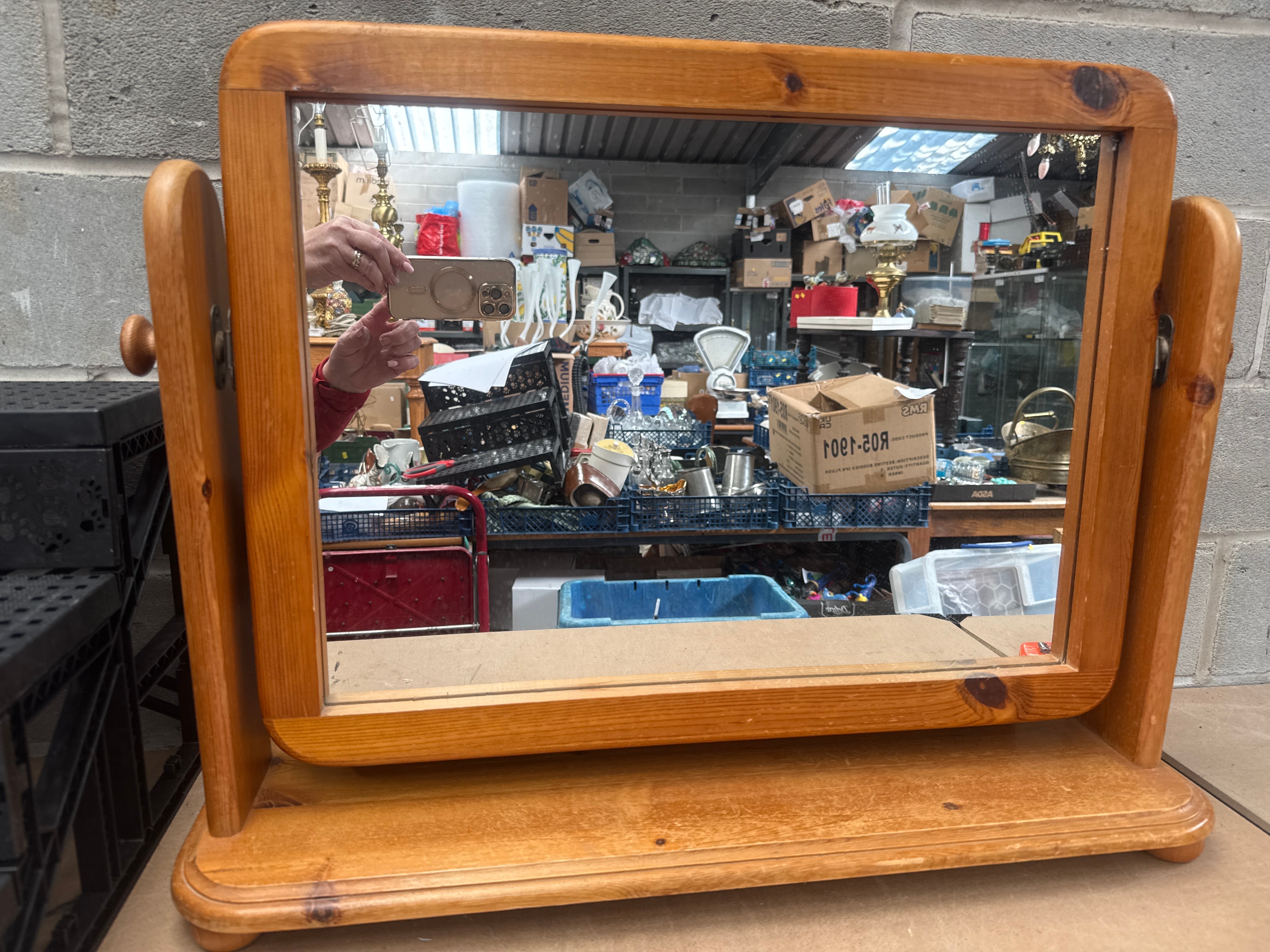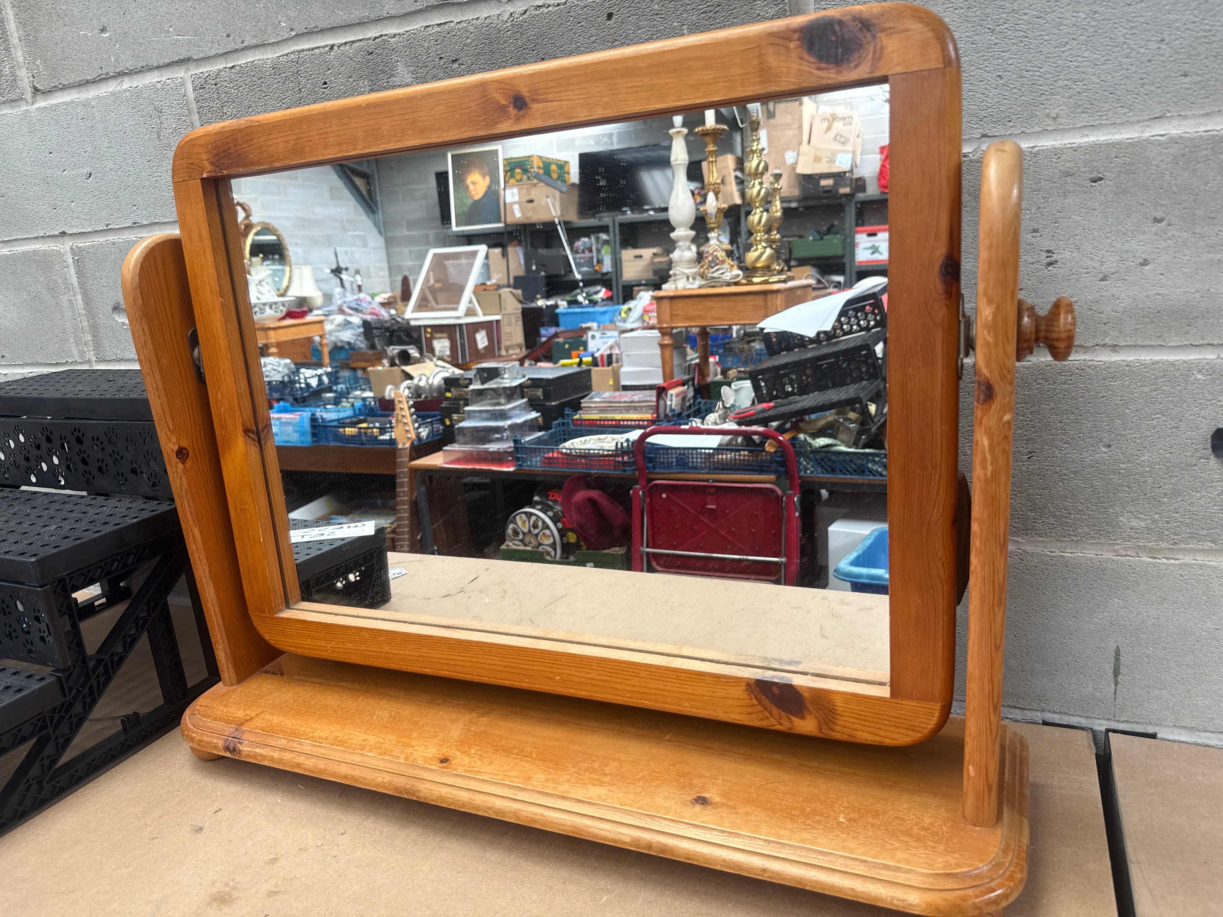 A freestanding wooden vanity or dressing table mirror, featuring a rectangular mirror plate set within a simple, rounded-edge wooden frame. The frame and the broad, shaped rectangular base are crafted from light-colored softwood, likely pine, exhibiting prominent knots and grain, finished with a clear or light stain. The mirror pivots between two upright supports on the base, secured by wooden knobs. The overall style is functional and unfussy, suggesting a mid-to-late 20th-century country, rustic, or possibly Scandinavian aesthetic.