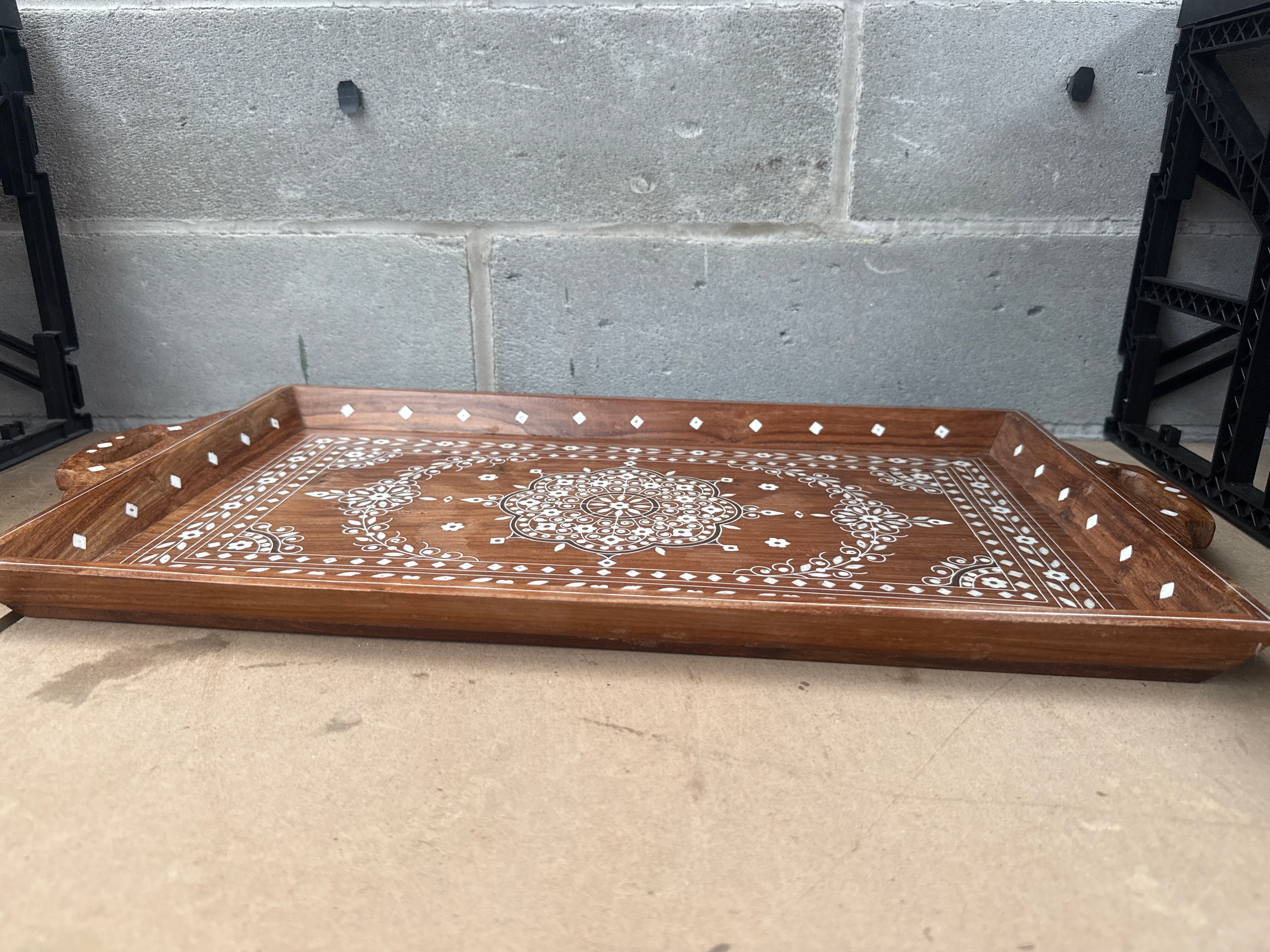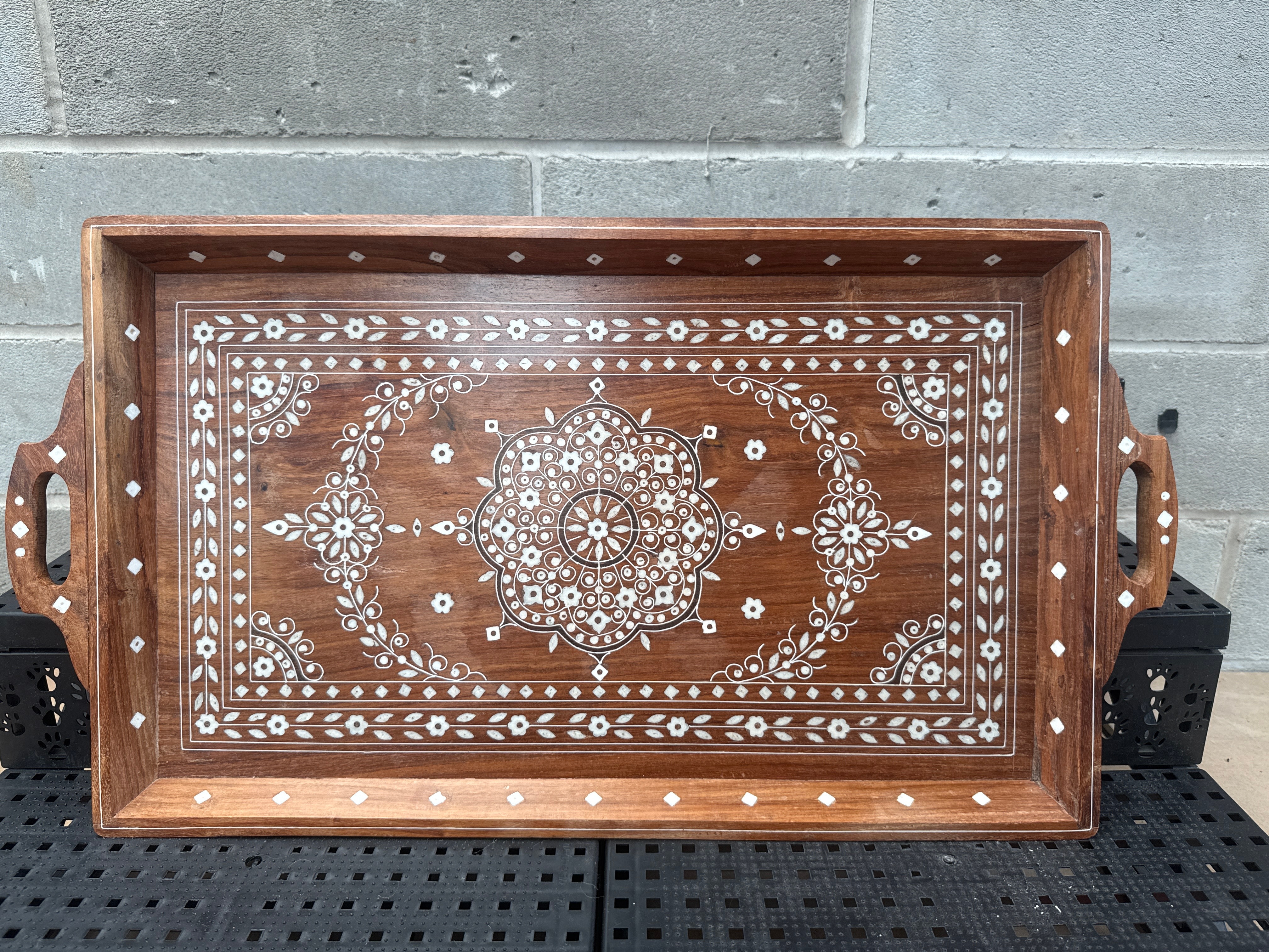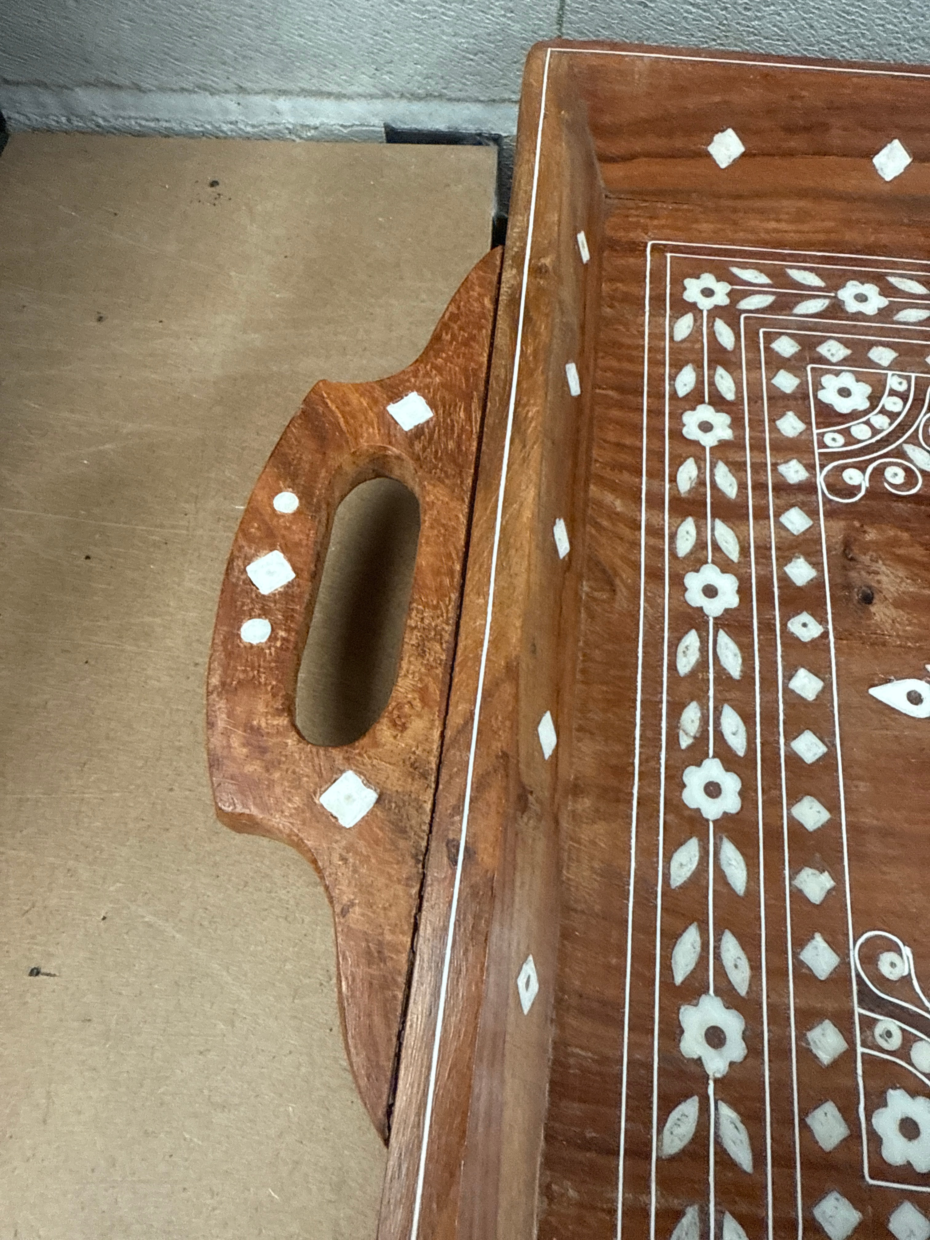 An Indian inlaid wood and bone serving tray. This rectangular serving tray is crafted from a reddish-brown wood, likely teak or rosewood, and features extensive white inlay decoration, consistent with bone or mother-of-pearl. The inlay forms intricate, symmetrical floral and geometric motifs, characteristic of a traditional South Asian or Middle Eastern aesthetic. The tray includes integrated, shaped handles on the short sides, which are also accented with inlay.