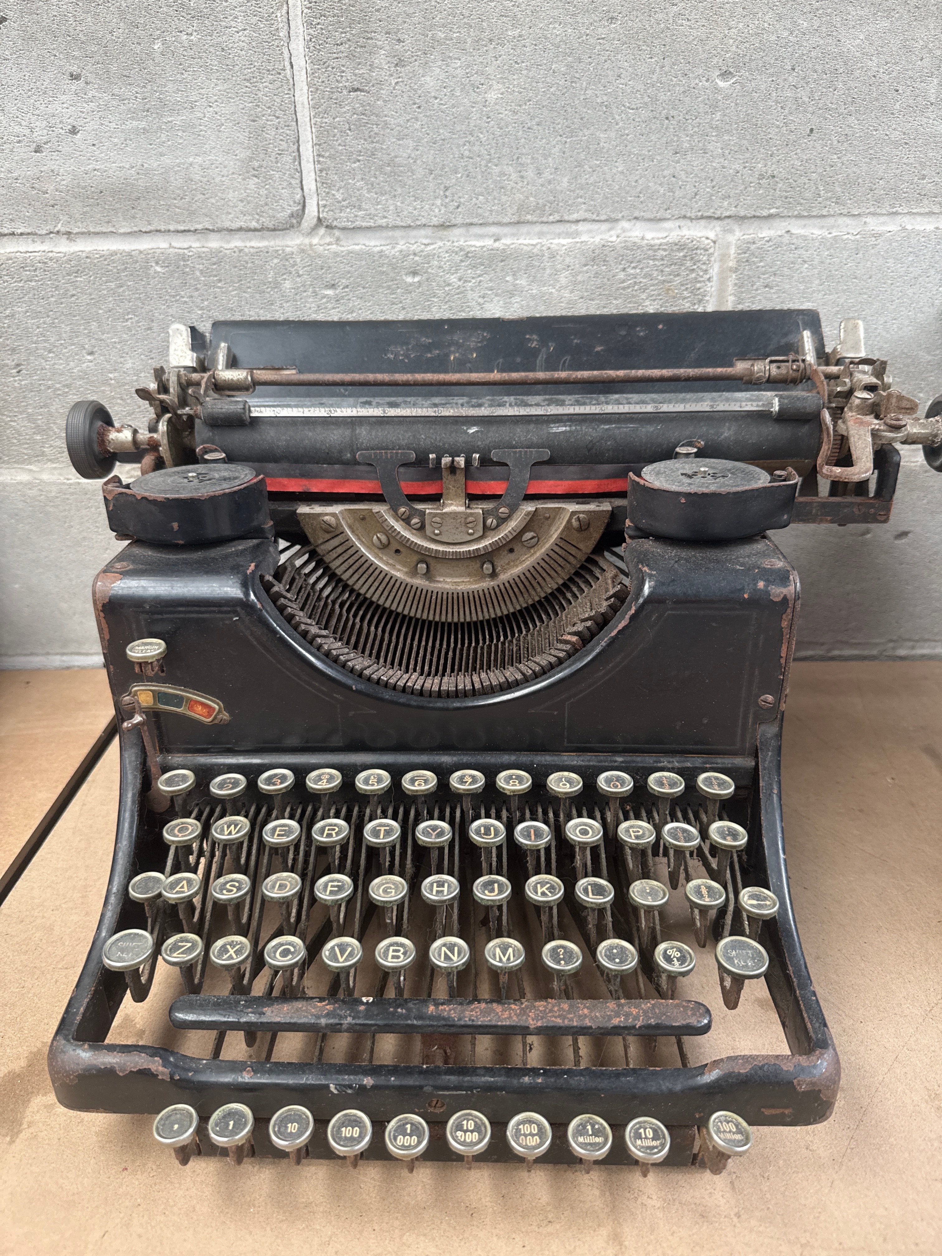 A vintage mechanical typewriter, likely dating to the early to mid-20th century, characterized by its utilitarian, industrial design. Constructed predominantly from black-painted metal, the keyboard features a standard QWERTY layout. A distinct bottom row of keys is marked with numerical values such as “100”, “1 000”, “10 000”, “100 000”, “1 Million”, “10 Million”, and “100 Million,” indicating a specialized accounting or calculating function. Additional features include a “MARGIN CLEAR” button, a three-color indicator (yellow, green, orange) on the upper left side, and a numbered scale on the paper carriage.
