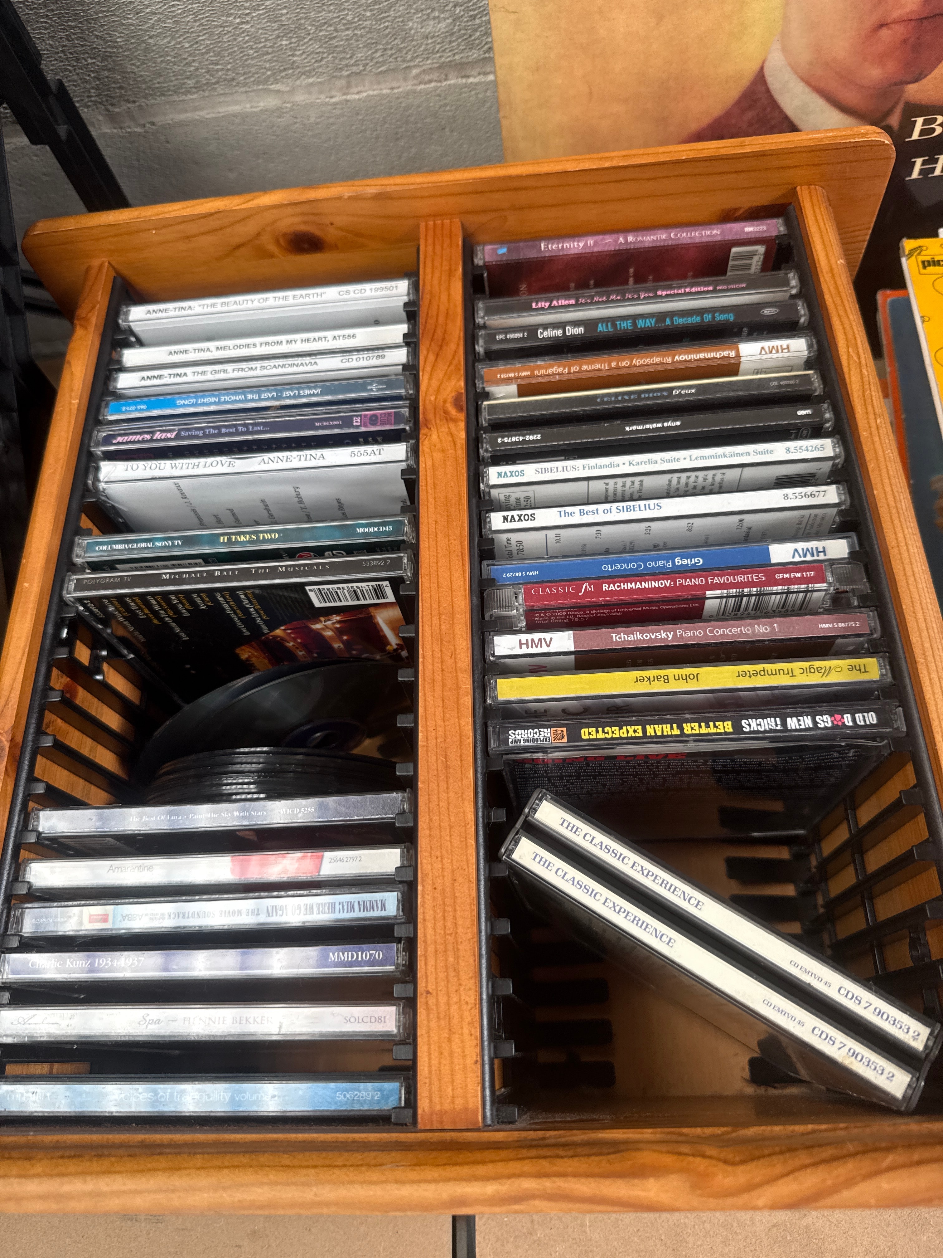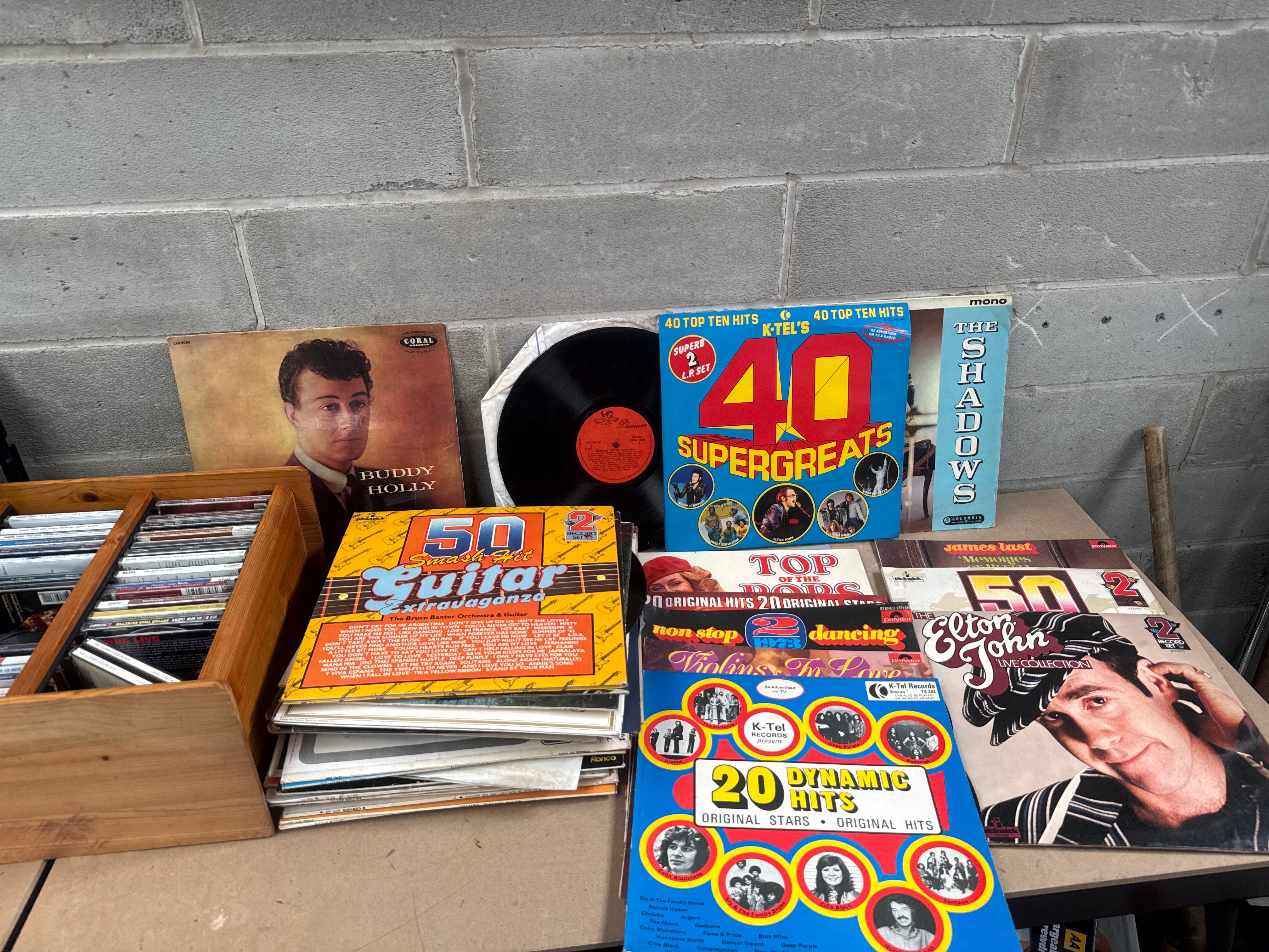 This lot comprises a substantial collection of music media, including numerous vinyl long-playing (LP) records and a significant quantity of compact discs (CDs), presented within two distinct wooden storage crates. The LPs, broadly dating from the mid to late 20th century, feature a diverse range of artists such as Buddy Holly (on Coral label), The Shadows (marked ‘mono’), Elton John, and James Last. Also present are several K-Tel style compilation albums, including “40 Supergreats” (identified in web research as “K-Tel’s 40 Super Greats – 2 x Vinyl (LP, Compilation), 1975”), “50 Guitar Extravaganza,” and “20 Dynamic Hits,” with visible labels including Decca and Contour. The CDs, likely produced from the late 20th to early 21st century, span various genres and artists, with notable examples including Anne-Tina, Celine Dion, and classical works on the Naxos label (featuring Sibelius, Rachmaninov, and Tchaikovsky). Compilation series such as “The Classic Experience” are also included. The materials observed are vinyl for the records, cardboard for the LP sleeves, plastic for the CD jewel cases, and wood for the storage units. A yellow sticker marked “397” is visible on the base of one wooden crate.