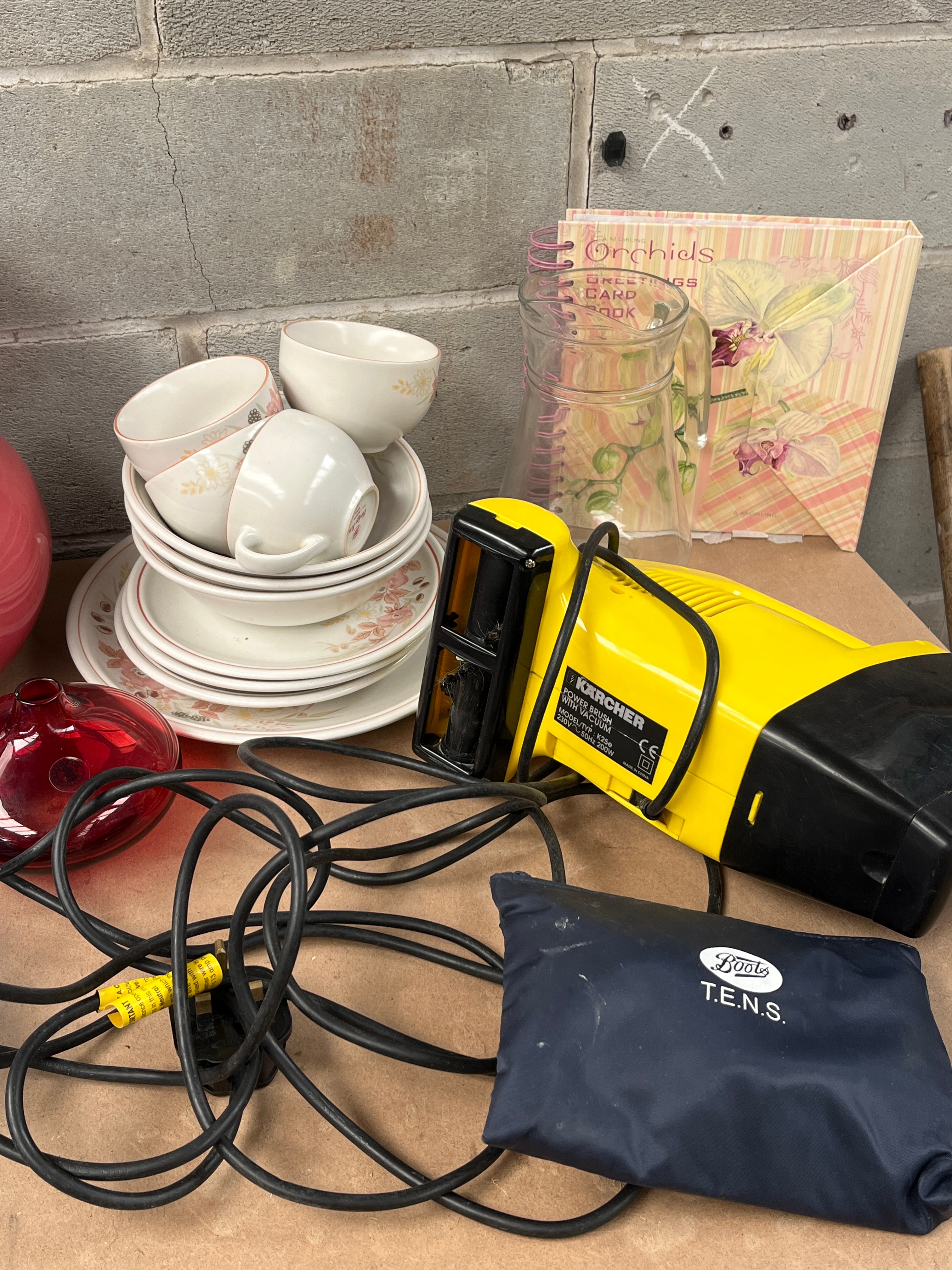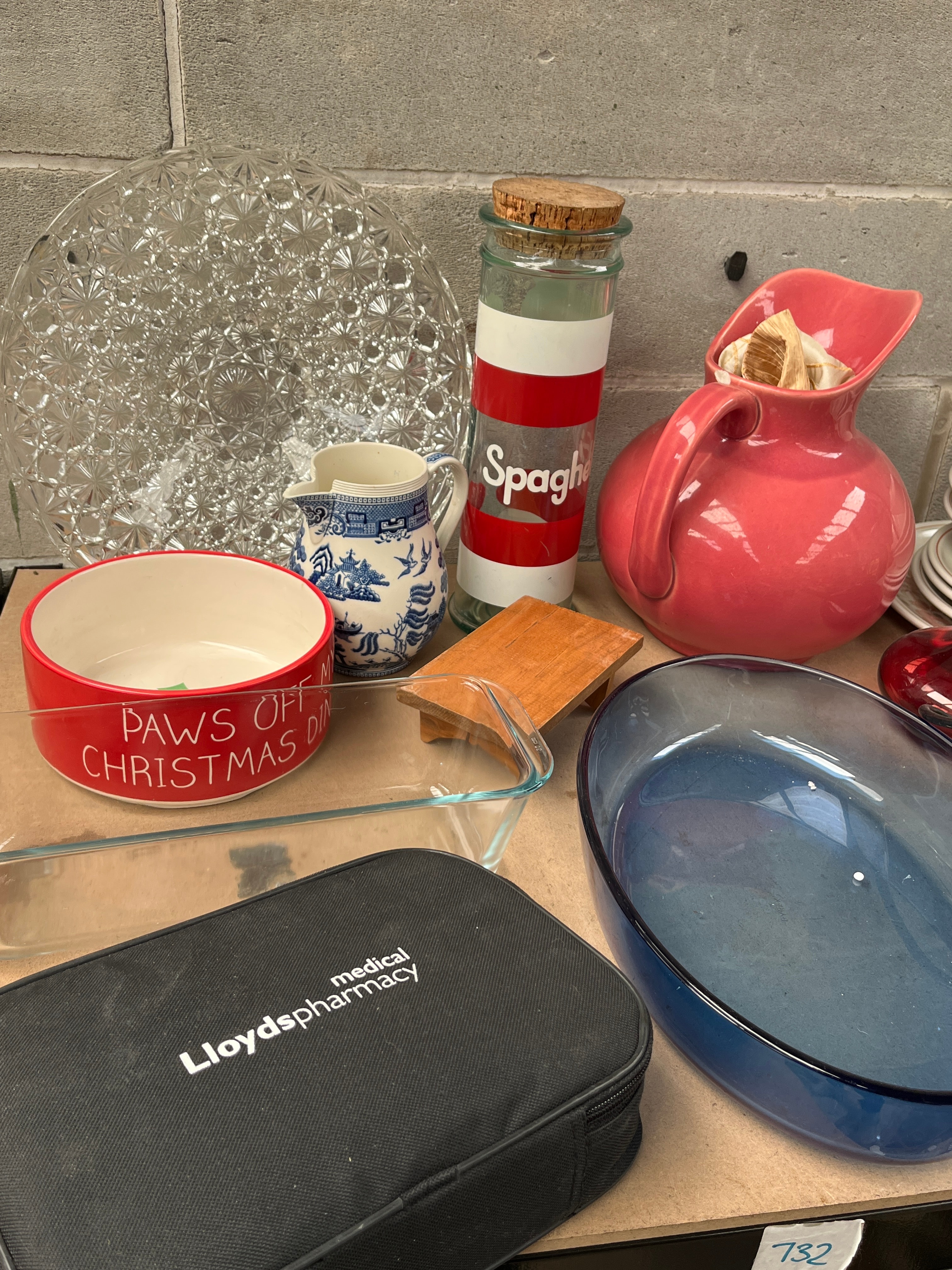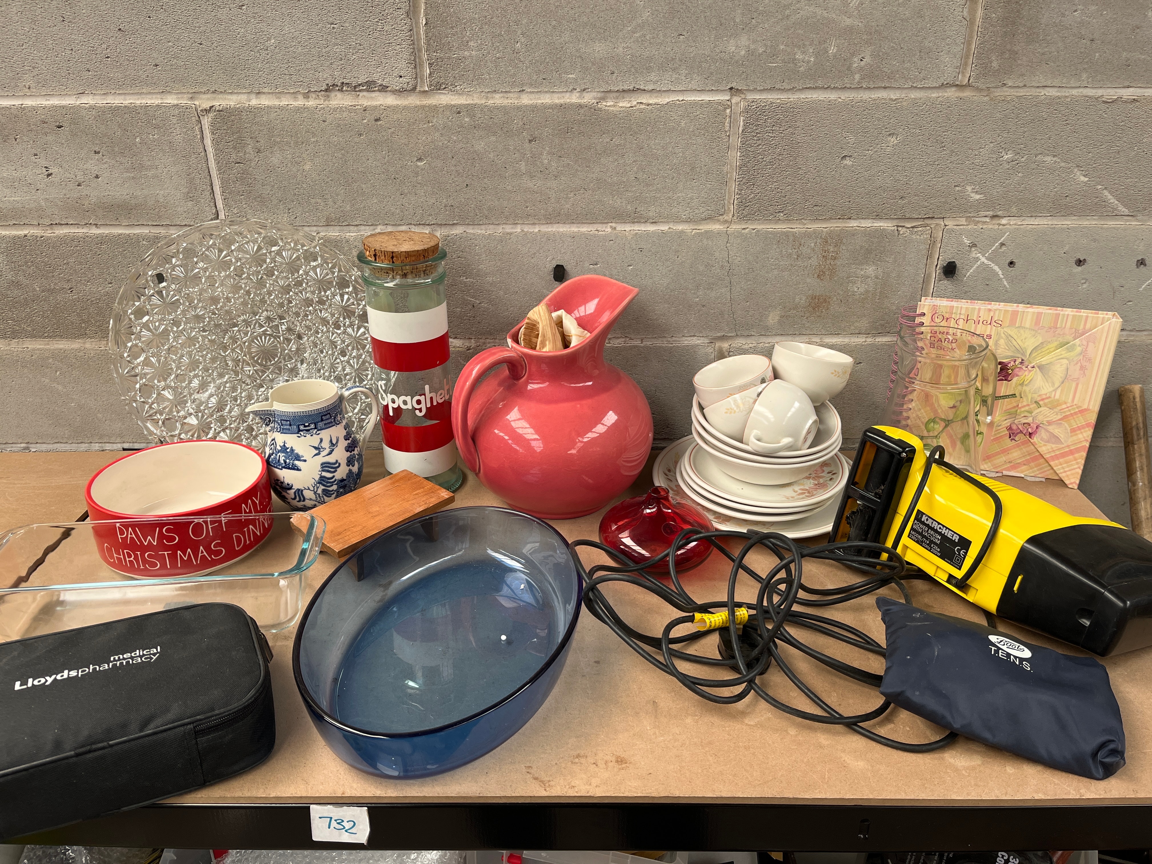 A diverse collection of contemporary household goods, primarily kitchen and dining ware, alongside a power tool and medical accessories. Comprising a large clear patterned glass platter, a red ceramic bowl marked “PAWS OFF MY CHRISTMAS DINNER,” a pink ceramic pitcher, a stack of white and floral-patterned dinnerware, a “Spaghetti” marked glass jar with a cork lid, a small blue and white ceramic jug, a clear glass rectangular baking dish, a blue oval glass dish, a small red glass item, and a clear glass jug. Also included is a “Karcher” branded yellow and black power tool with its cord, two medical-related fabric cases (one branded “Lloyds Pharmacy medical” and another “Boots T.E.N.S.”), a spiral-bound “Orchids GREETINGS CARD & GIFT BOOK,” and a small wooden board.