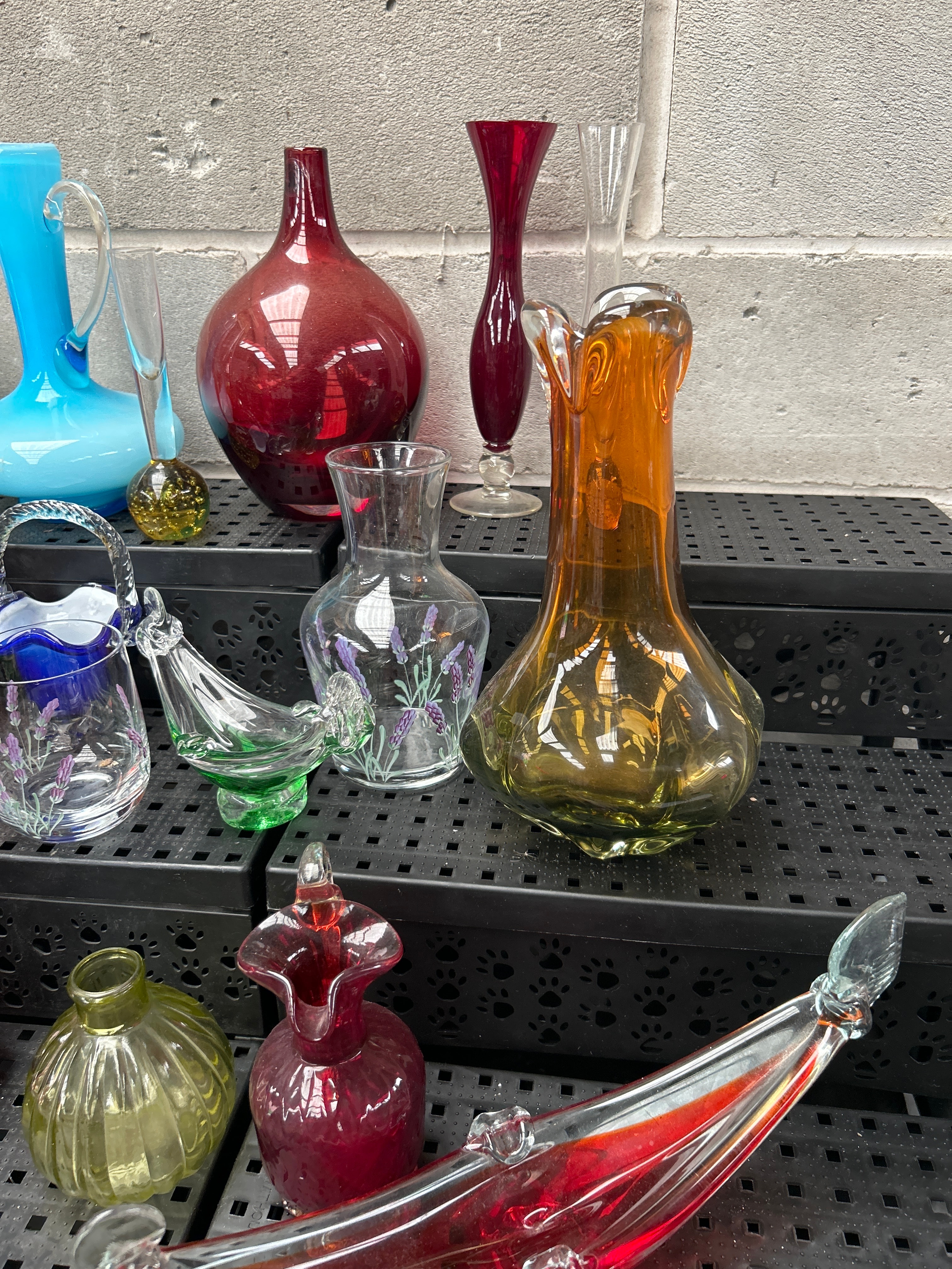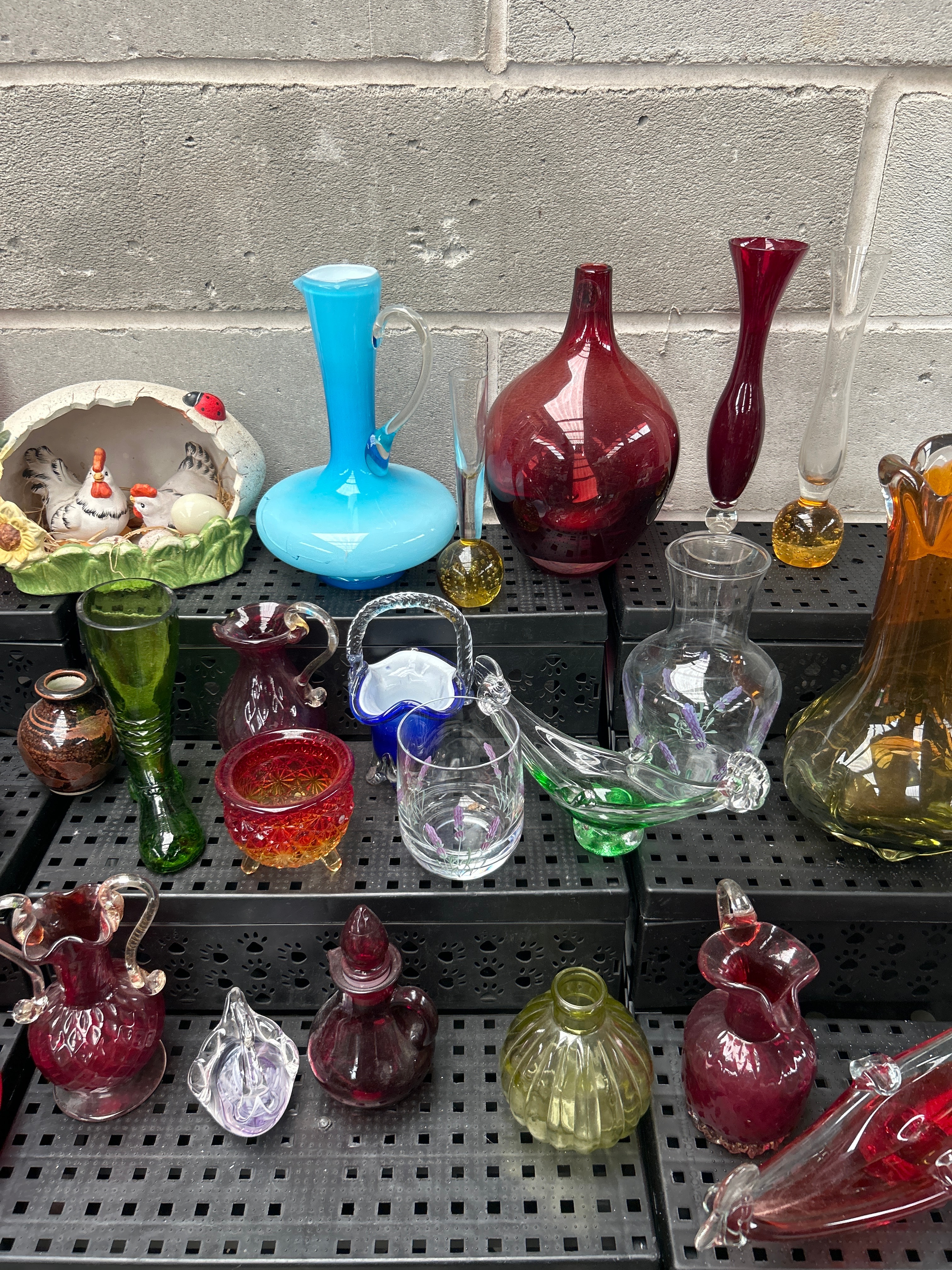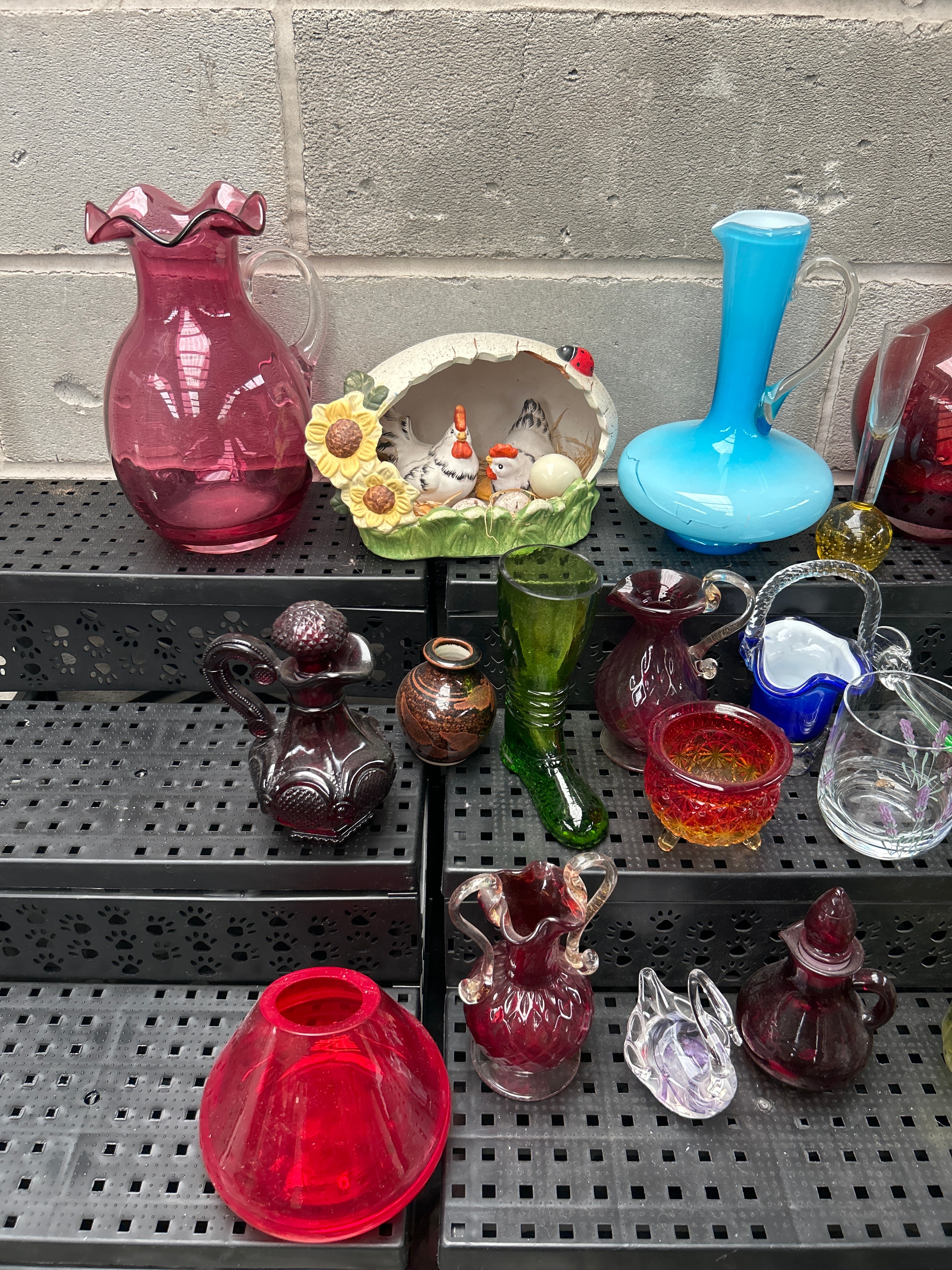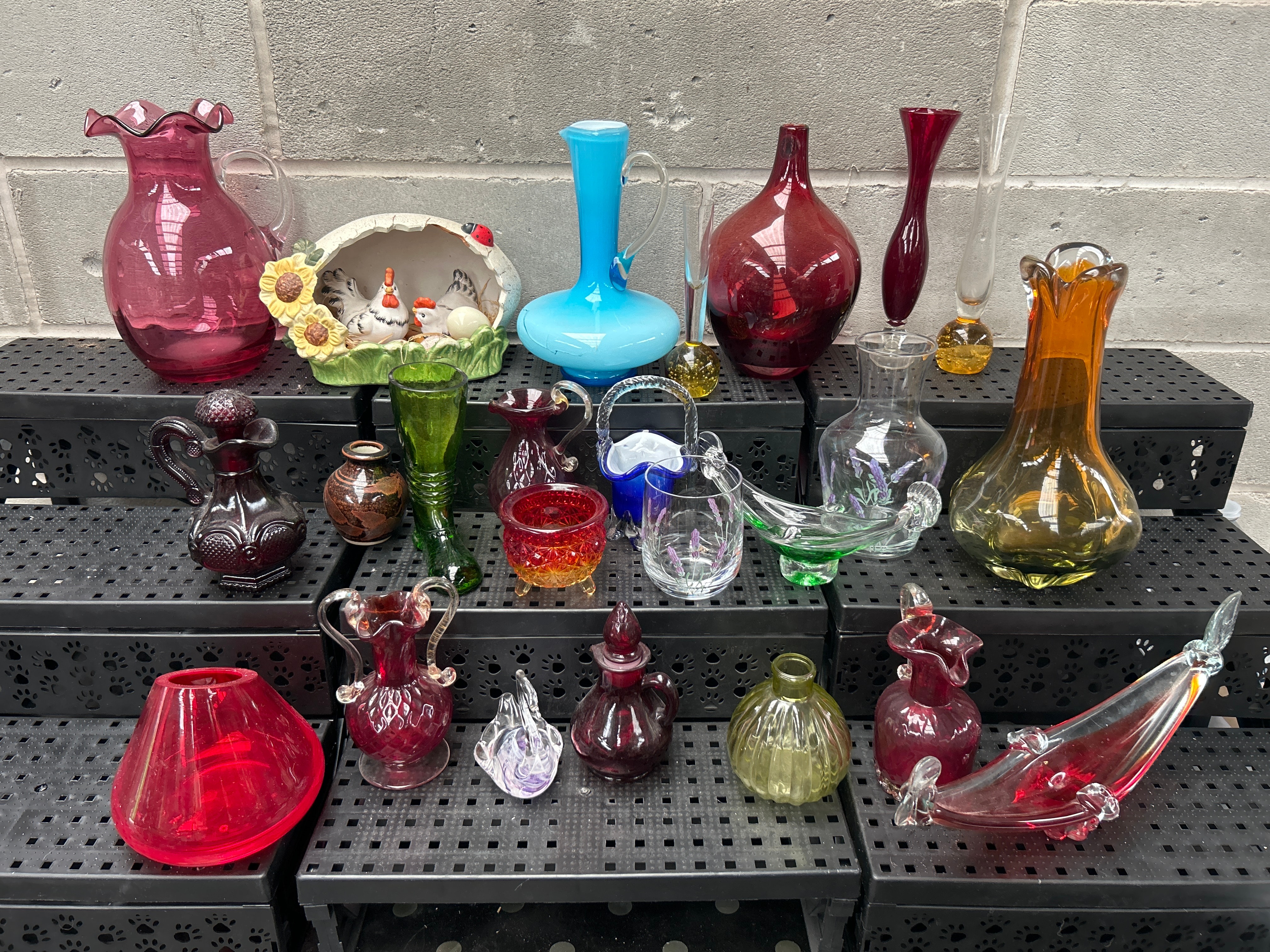 This varied lot comprises approximately 28-30 decorative and functional items, predominantly glass, along with one ceramic piece. The extensive glassware collection features a range of forms including pitchers, vases of varying sizes and styles (some with ruffled rims, others smooth-necked or bulbous), small bottles, miniature baskets, and unique figurative pieces such as a glass swan and an elongated red glass fish or boat-like object. Colors include cranberry, various greens, amber, light blue opaque, dark blue clear, purple, and clear glass, with one clear piece exhibiting painted lavender sprigs. No discernible text or maker’s marks are visible on the glass items. The single ceramic piece is a decorative half-shell housing three chickens and two eggs, adorned with sunflowers and a ladybug.