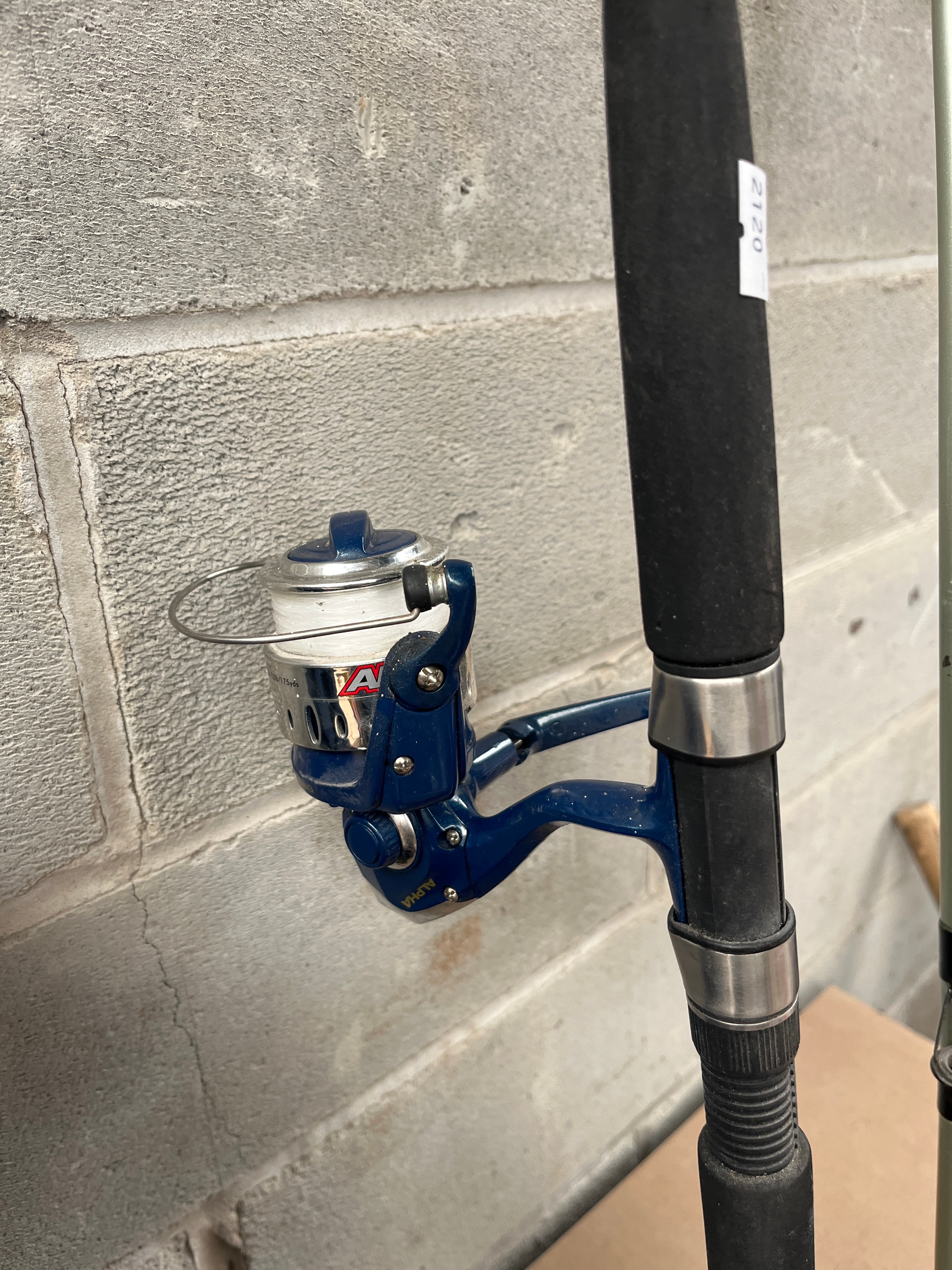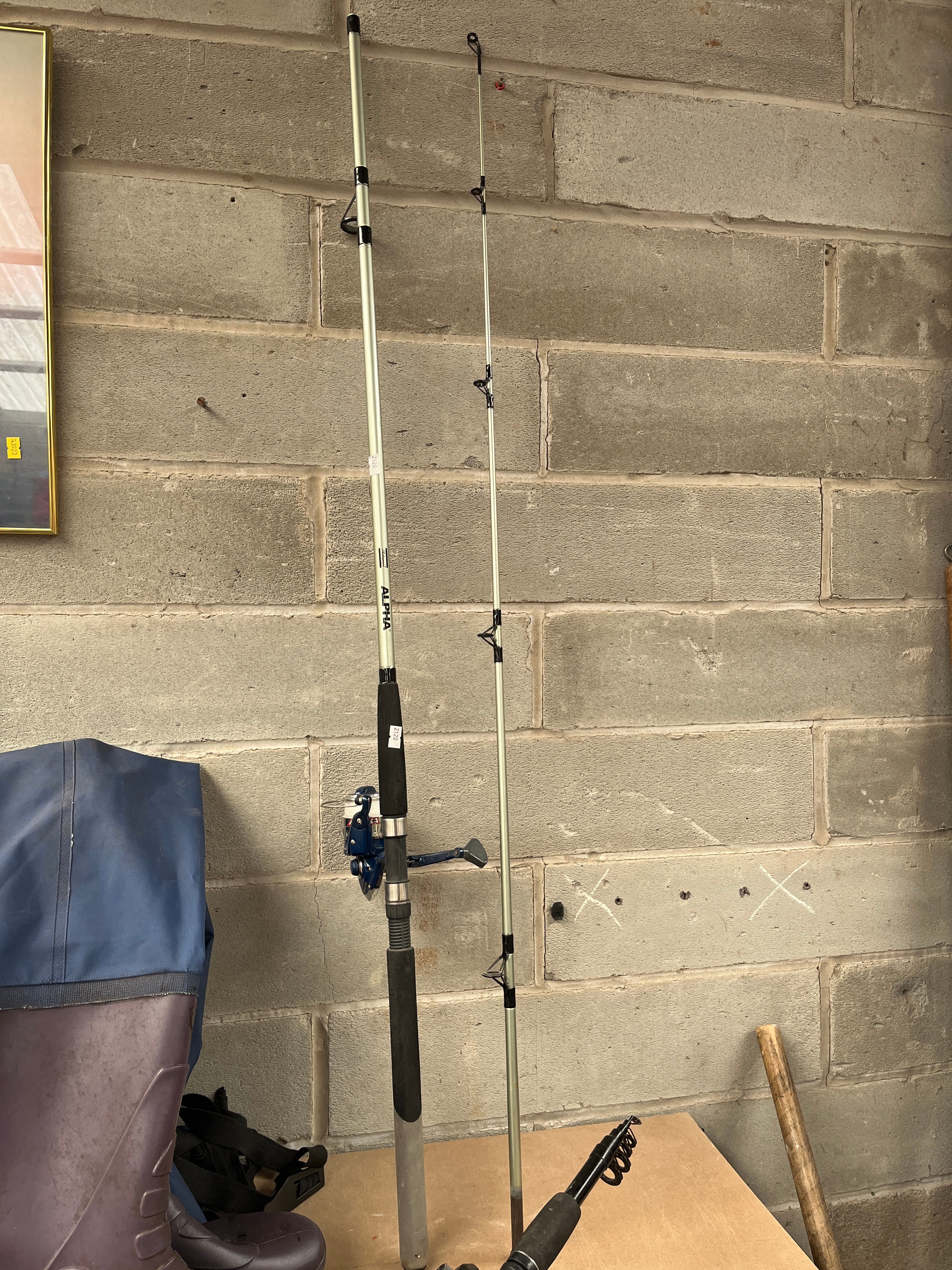 A collection of modern fishing and outdoor leisure equipment. The lot includes a pair of blue PVC waterproof hip waders with integrated dark brown rubber boots and cleated soles, consistent with examples identified as ‘Hip Waders for Men Waterproof Hip Boot PVC Material’ in web intelligence reports. Also featured is a blue synthetic ‘Beach Shelter’ marked “Sun Protection” and “UPF 50+”, and a camouflage pattern shoulder bag. Fishing equipment comprises three rods; two are light-colored, multi-sectioned rods, one explicitly marked “ALPHA” and fitted with an “ALPHA” branded blue spinning reel noting “FRONT DRAG.” A third, shorter rod is equipped with a yellow spinning reel. A clear plastic tackle box containing various lures and tackle is labeled “SEA FISHING CLASSIC COLLECTION.” A white sticker marked “2120” is present on one rod.