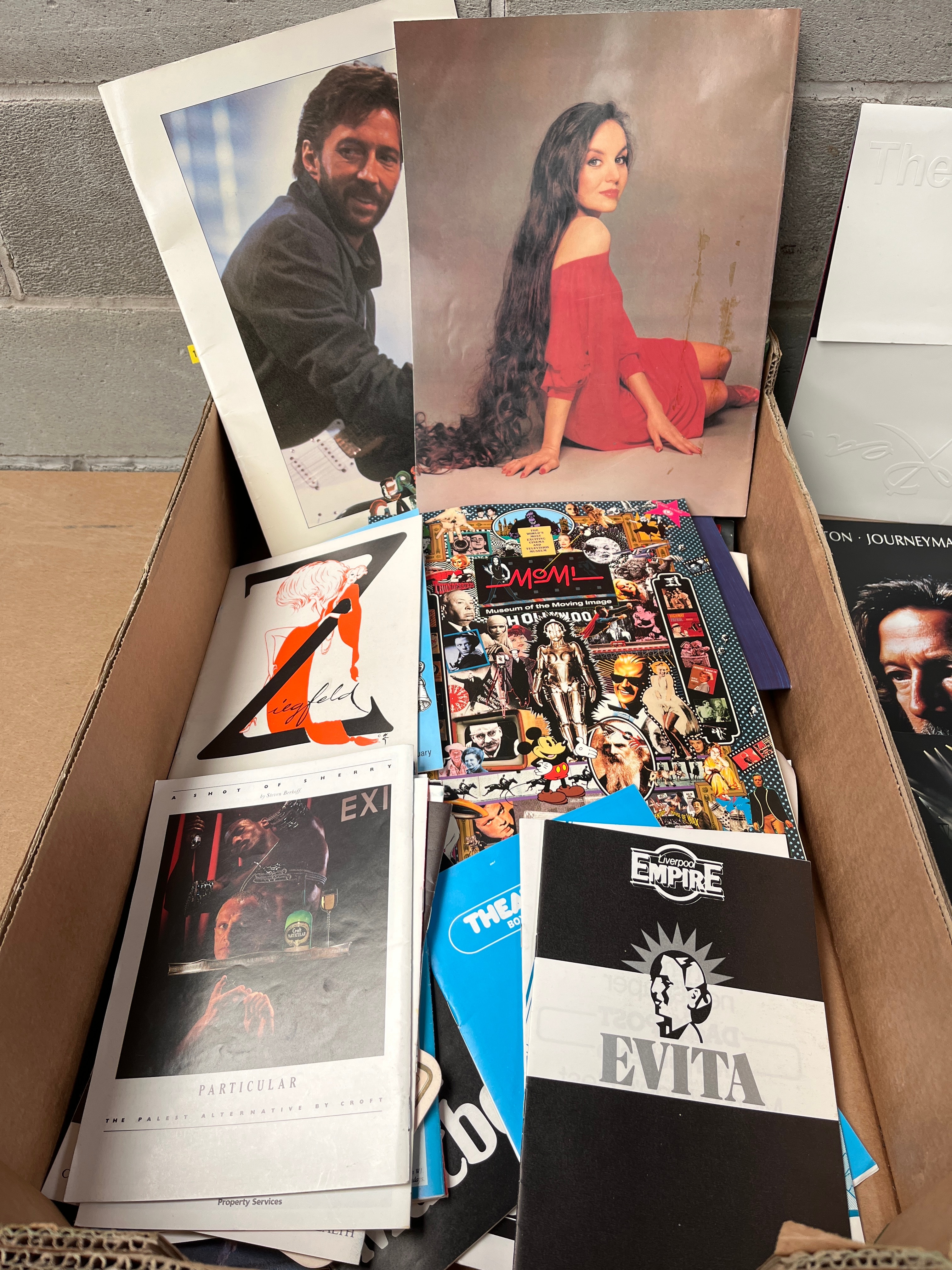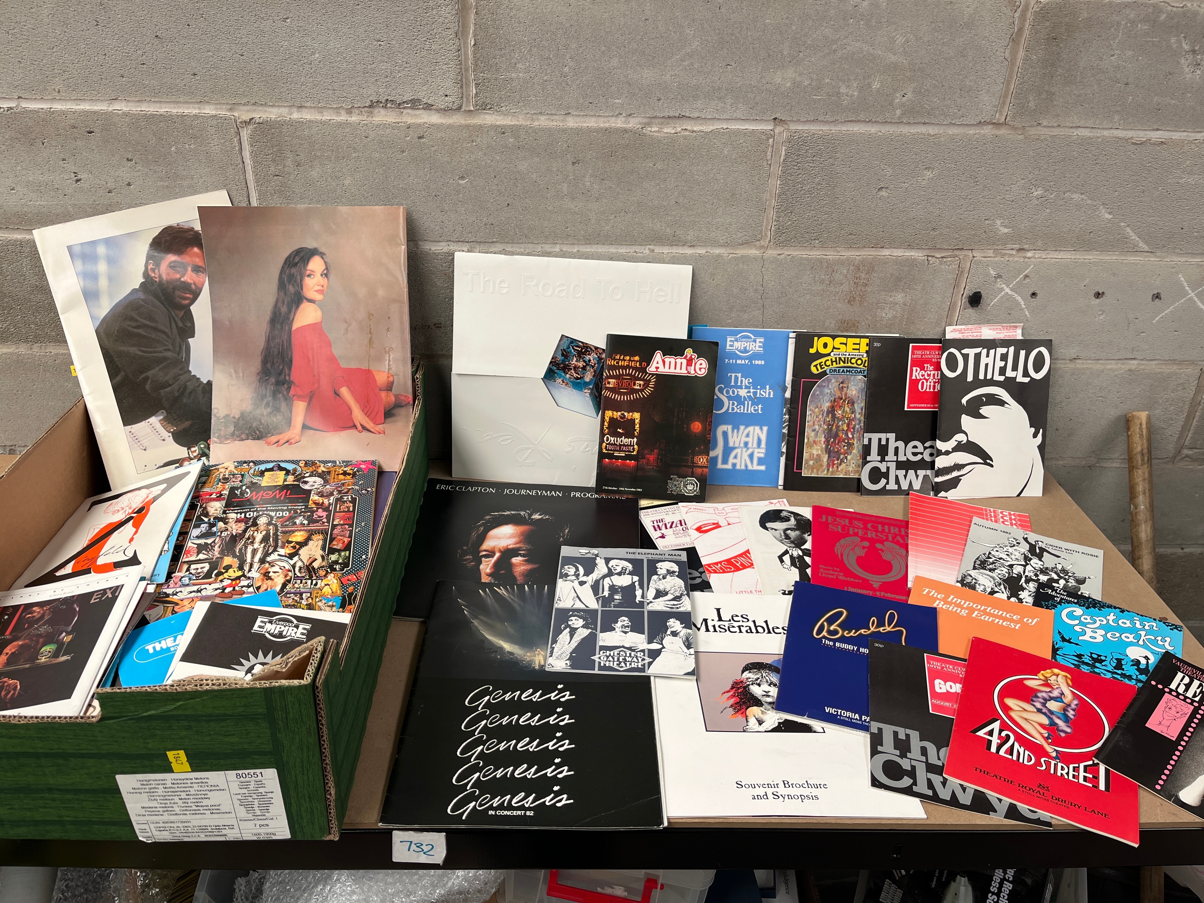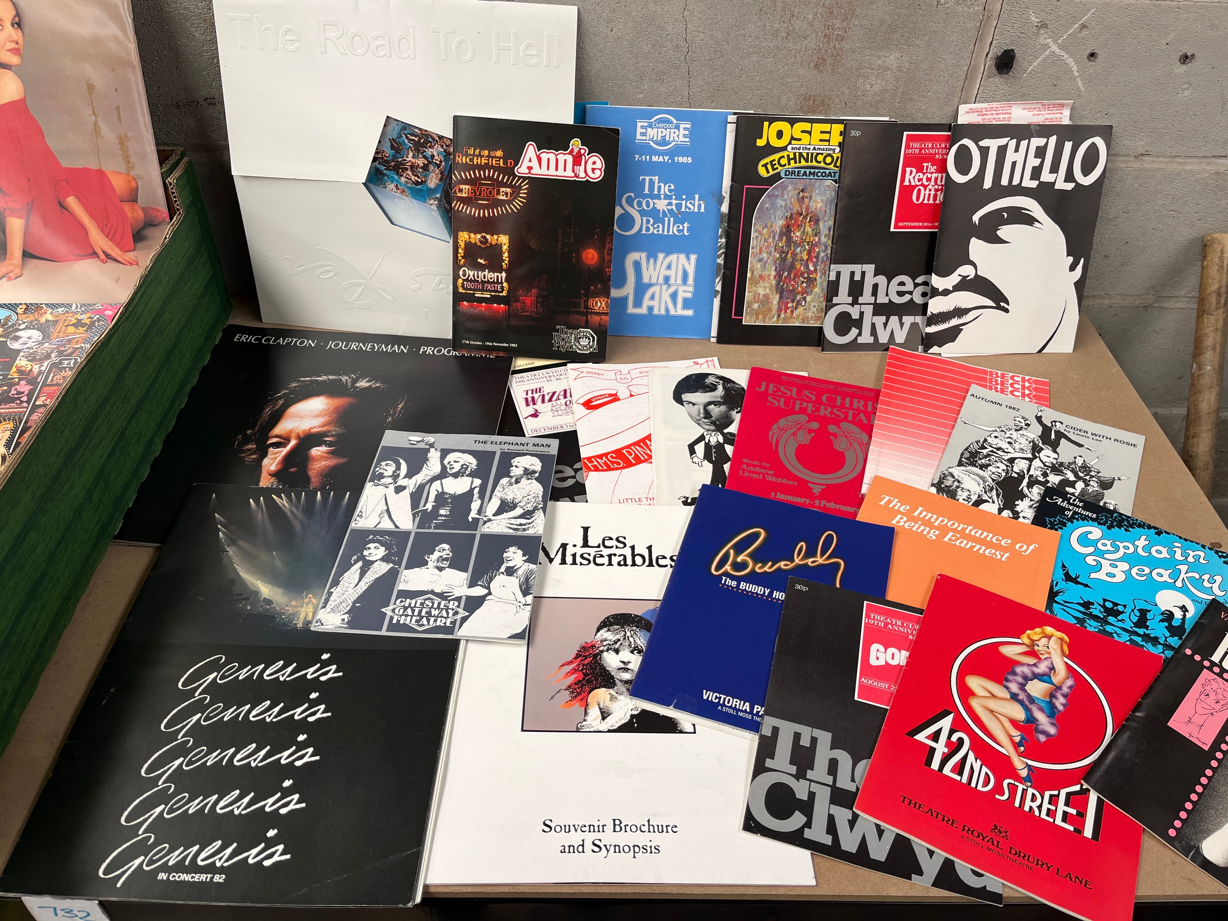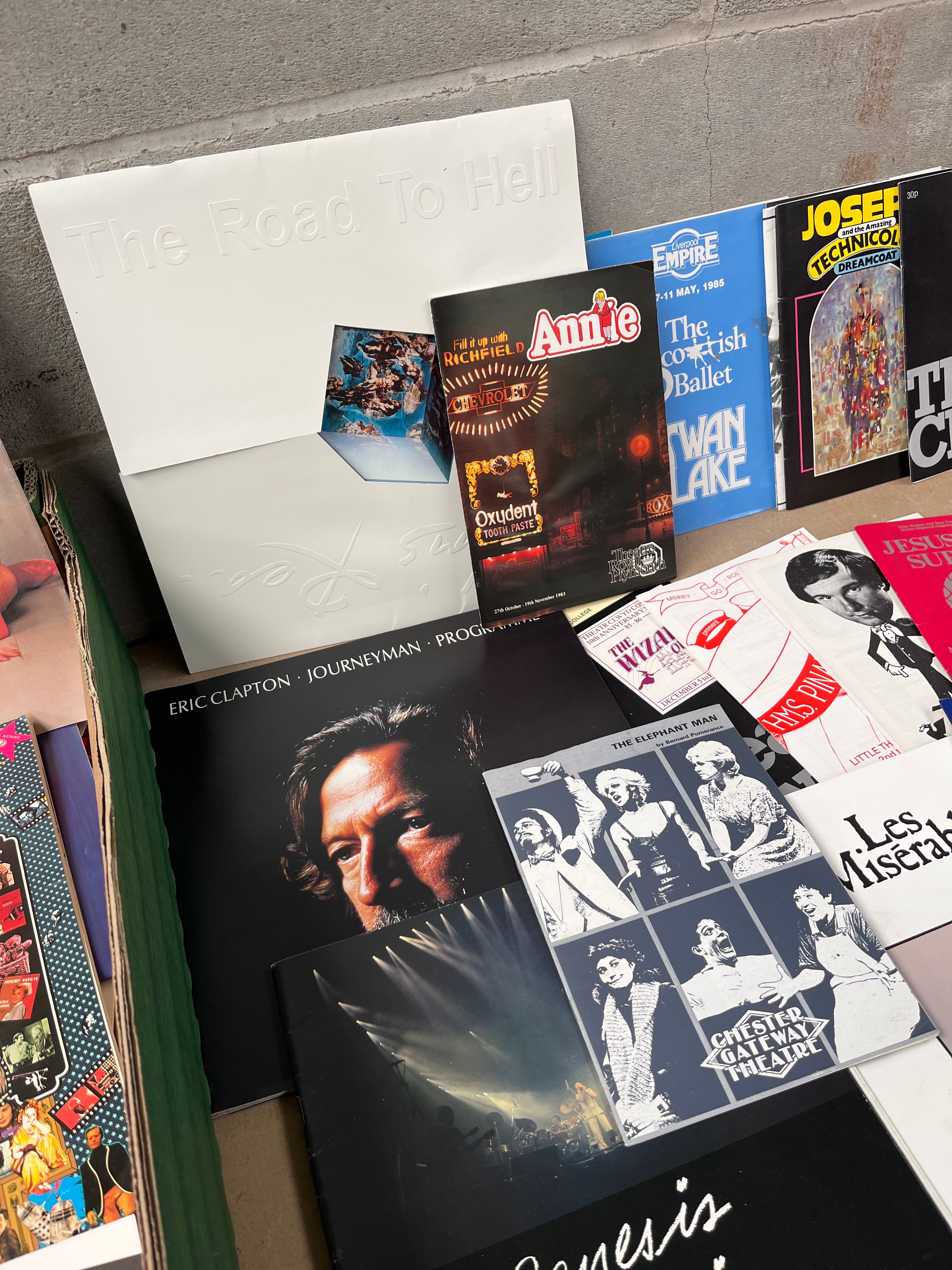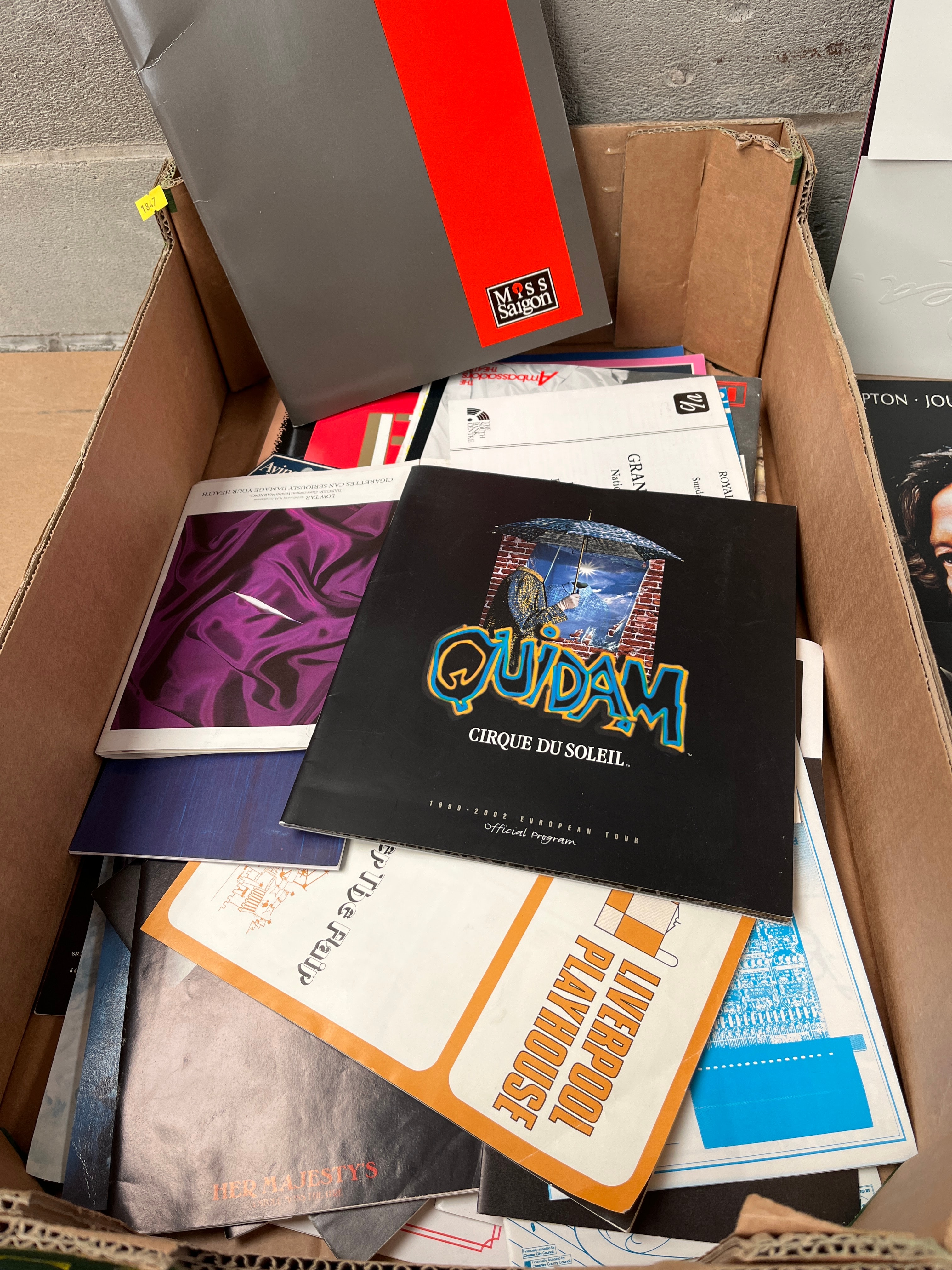 A collection of performing arts ephemera, predominantly dating from the late 20th century to the early 21st century. This substantial group comprises souvenir programs, brochures, and promotional materials for a variety of musicals, plays, ballets, and concerts. Specific examples include ‘Genesis In Concert ’92,’ ‘Swan Lake 7-11 MAY, 1988,’ and ‘Qoudam Cirque du Soleil 1994-2005 European Tour.’ Prominent titles and artists featured are ‘Othello,’ ‘Annie,’ ‘Les Misérables,’ ‘Eric Clapton Journeyman,’ ‘The Road To Hell,’ ‘Miss Saigon,’ ‘Jesus Christ Superstar,’ ‘The Elephant Man,’ ’42nd Street,’ and ‘Evita.’ Various theatre names such as ‘Liverpool Empire’ and ‘Theatre Royal Drury Lane’ are also present. The items are constructed primarily from paper and cardstock, often with glossy finishes.