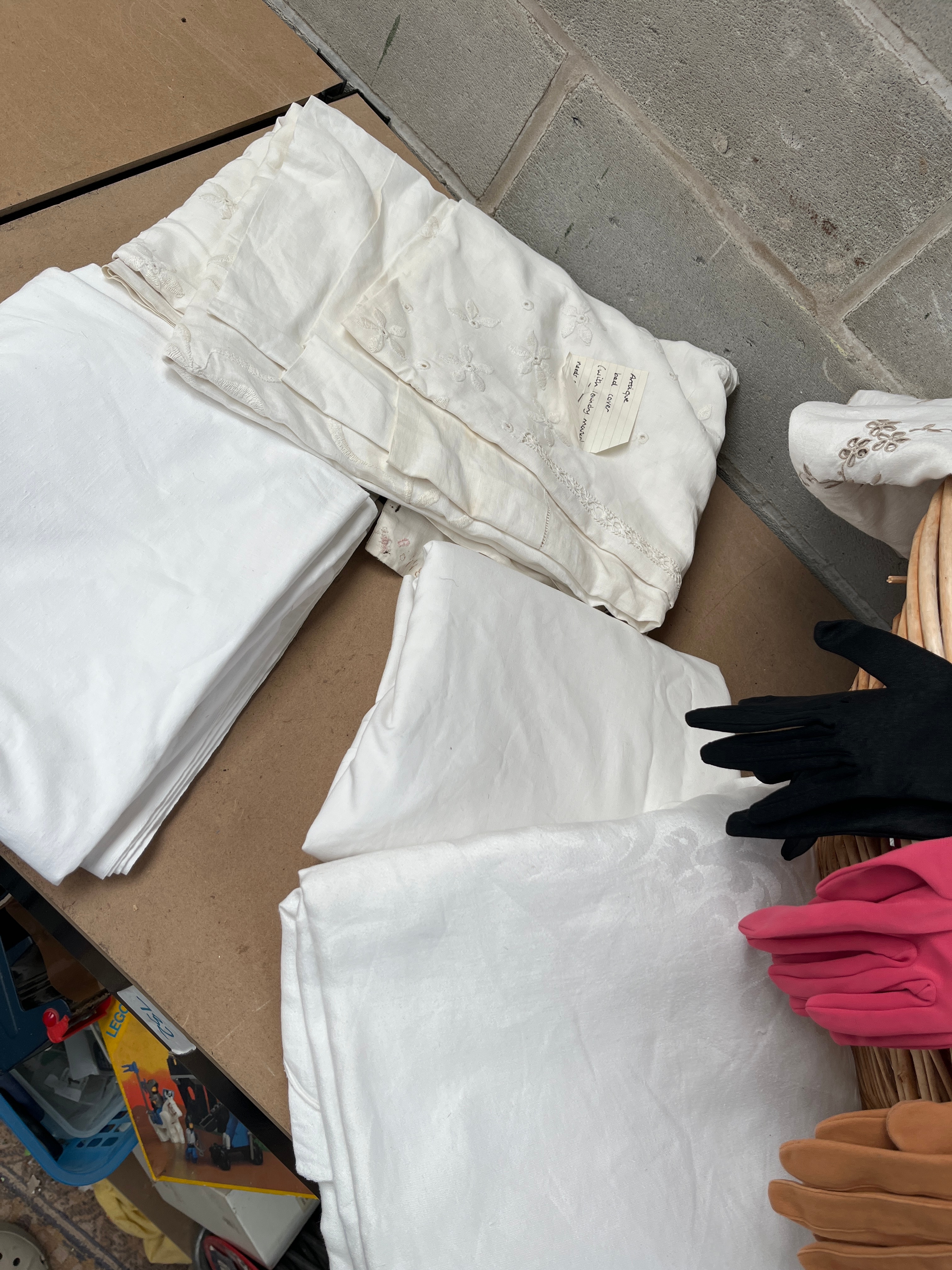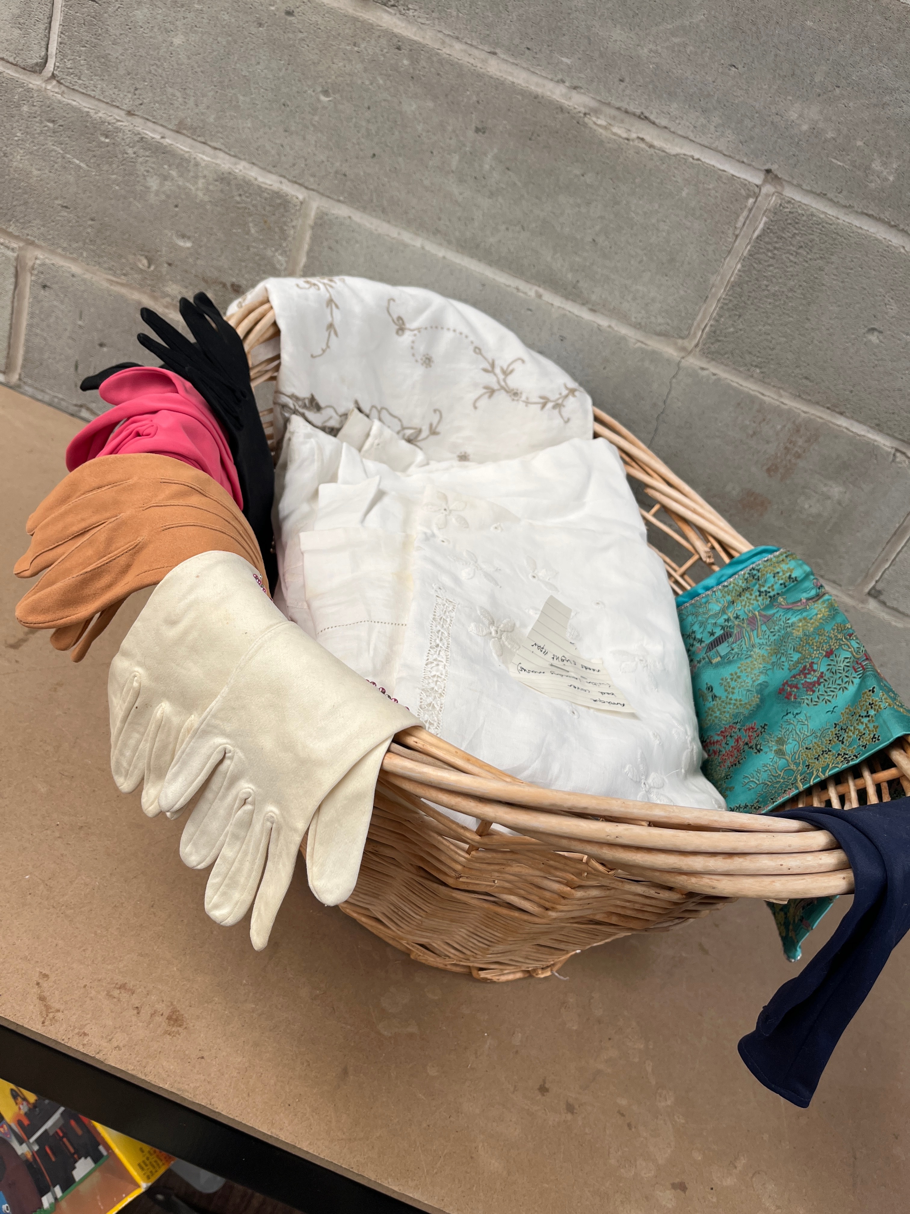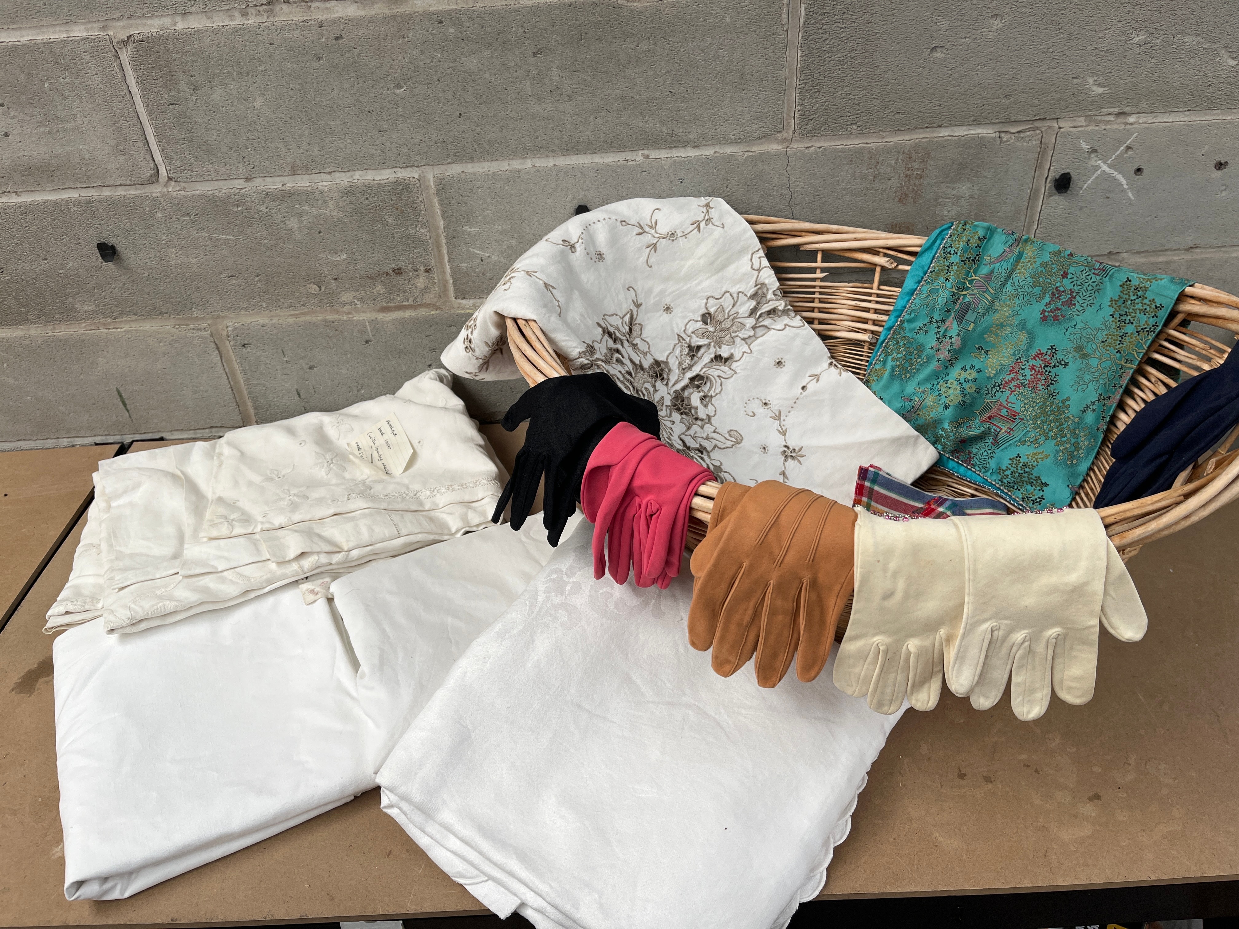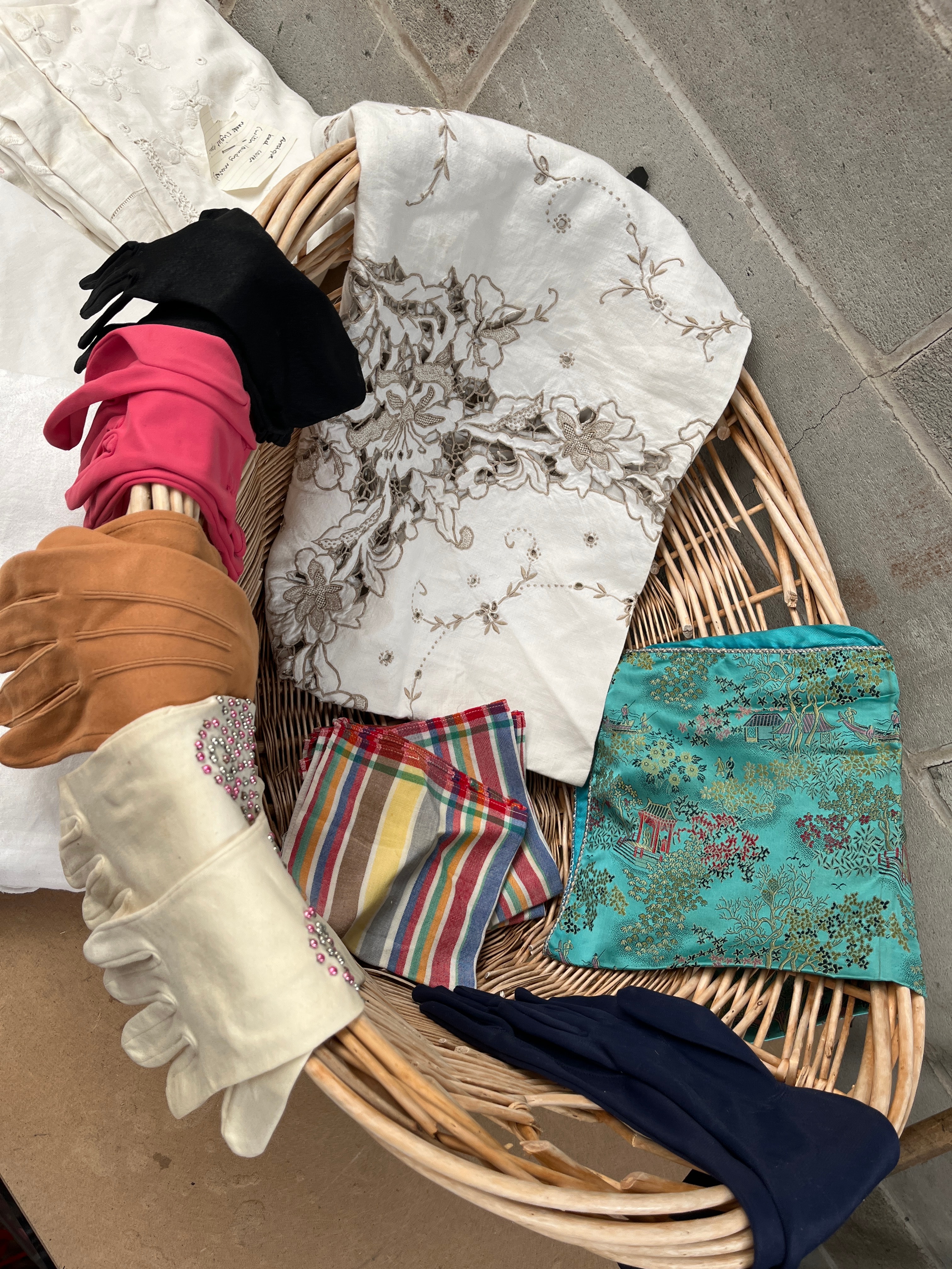 A collection of vintage textiles and gloves, contained within a woven wicker basket. The textiles include a substantial white piece featuring intricate floral embroidery in contrasting brown/grey thread, several folded plain white linens—some exhibiting subtle damask patterns or eyelet lace trim—and a smaller embroidered white textile with a tag bearing the text “Special,” “Embroidery cotton,” “Cutwork lace,” and a size indication of “17×12” for “2 pcs.” Additional textiles comprise a vibrant turquoise/teal fabric patterned with an Asian-inspired landscape motif of pagodas and trees, and a multi-colored striped piece. The glove assortment includes four pairs and one single glove, varying in material from leather/suede (tan) to various fabrics (black, bright pink, off-white with ruffled trim, and navy blue).
