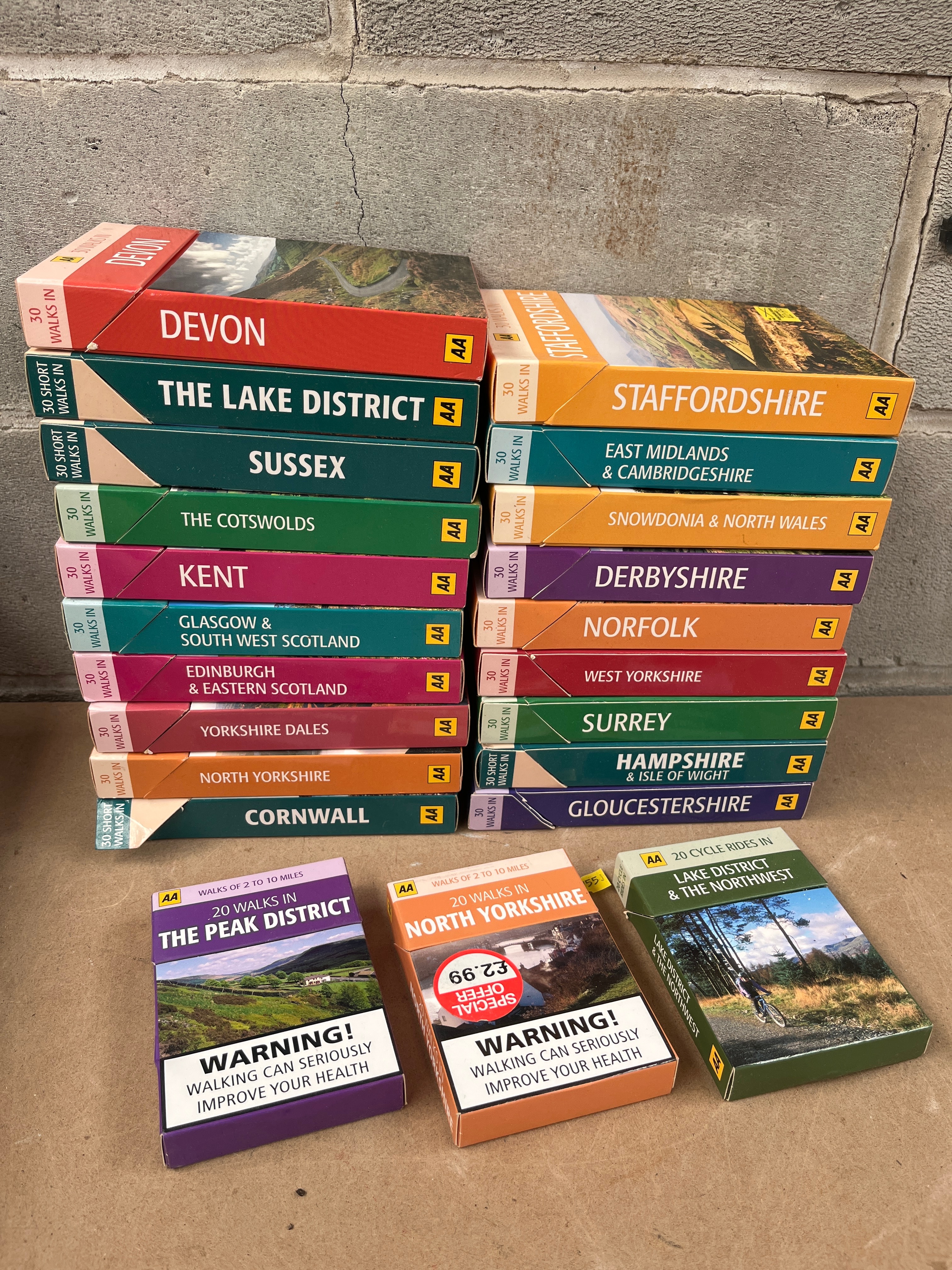 A collection of approximately 25 contemporary regional guidebooks, primarily published by AA. The lot includes two vertical stacks and three individual items. Each guide features a photographic landscape image on its paper or card cover, with titles distinctly color-coded by region, such as ‘Devon’ (red), ‘The Lake District’ (dark green), and ‘Staffordshire’ (orange). The majority are designated as ’30 Short Walks In’ or ’30 Walks In’ for various UK locations, including Cornwall, Yorkshire Dales, and Snowdonia, with some specifying ‘Walks of 2 to 10 Miles.’ Also present are ’20 Walks In’ guides for ‘The Peak District’ and ‘North Yorkshire,’ and one ’20 Cycle Rides In’ guide for ‘Lake District & The Northwest.’ Three guides in the foreground are marked with a ‘WARNING! WALKING CAN SERIOUSLY IMPROVE YOUR HEALTH’ label, with one also displaying a red circular ‘SPECIAL OFFER £2.99’ sticker.