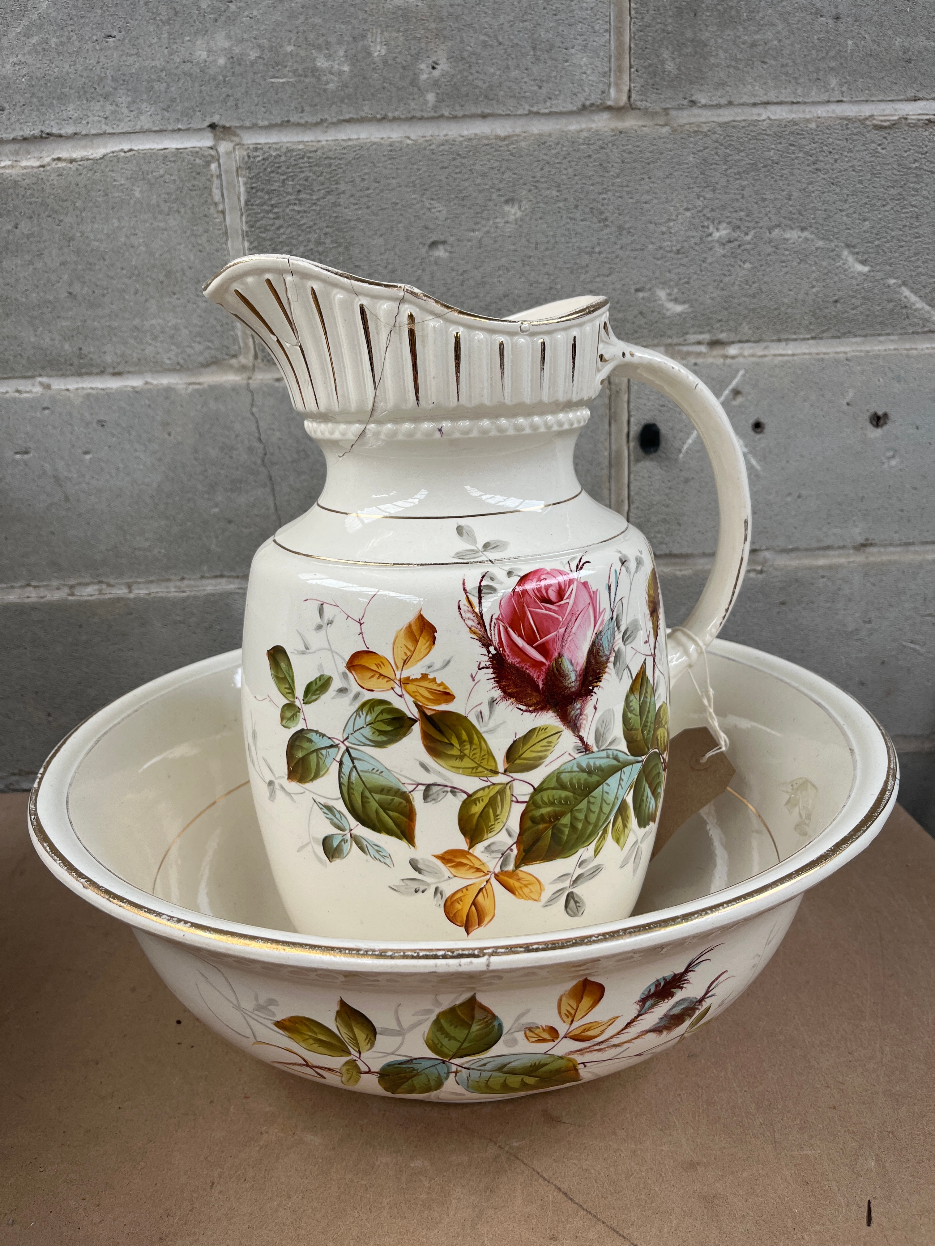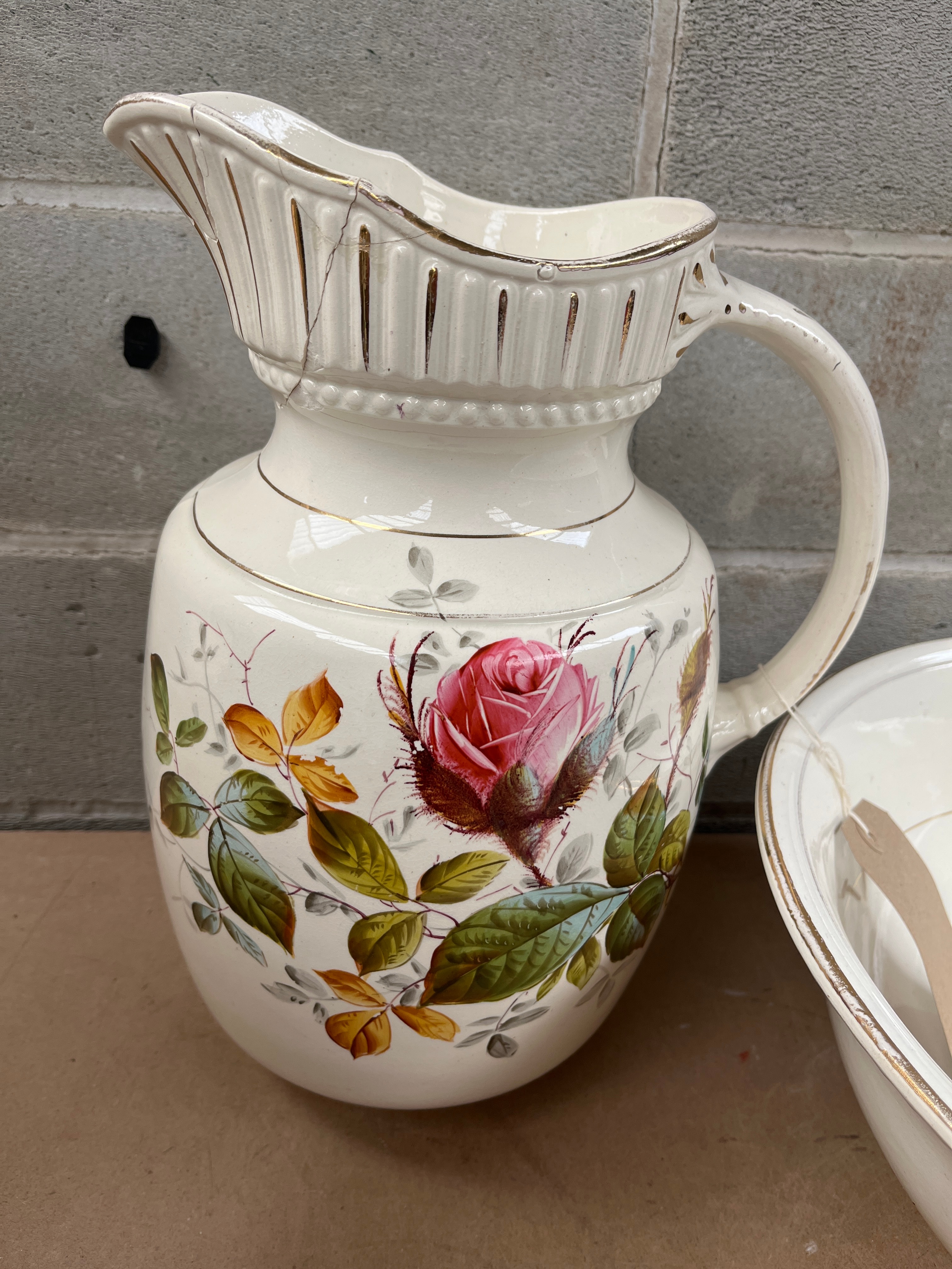 A two-piece McCoy Pottery Roses Floral Water Pitcher & Basin Set, #7529, made in USA. This ceramic wash set comprises a large pitcher and a matching basin, characteristic of the late Victorian or early Edwardian period. Both pieces are crafted from white-glazed earthenware, decorated with a prominent transfer-printed floral pattern featuring a central pink rose surrounded by green and autumnal-toned leaves. The design is accented with gold gilt trim on the rims, the pitcher’s handle, and its fluted neck details.